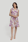 Vestido corto. Tejido de algodón. Estampado tropical. Diseño vuelo. Escote pico. Cuello solapas. Cierre de botones. Talla modelo: S. Altura modelo 1,67 m.