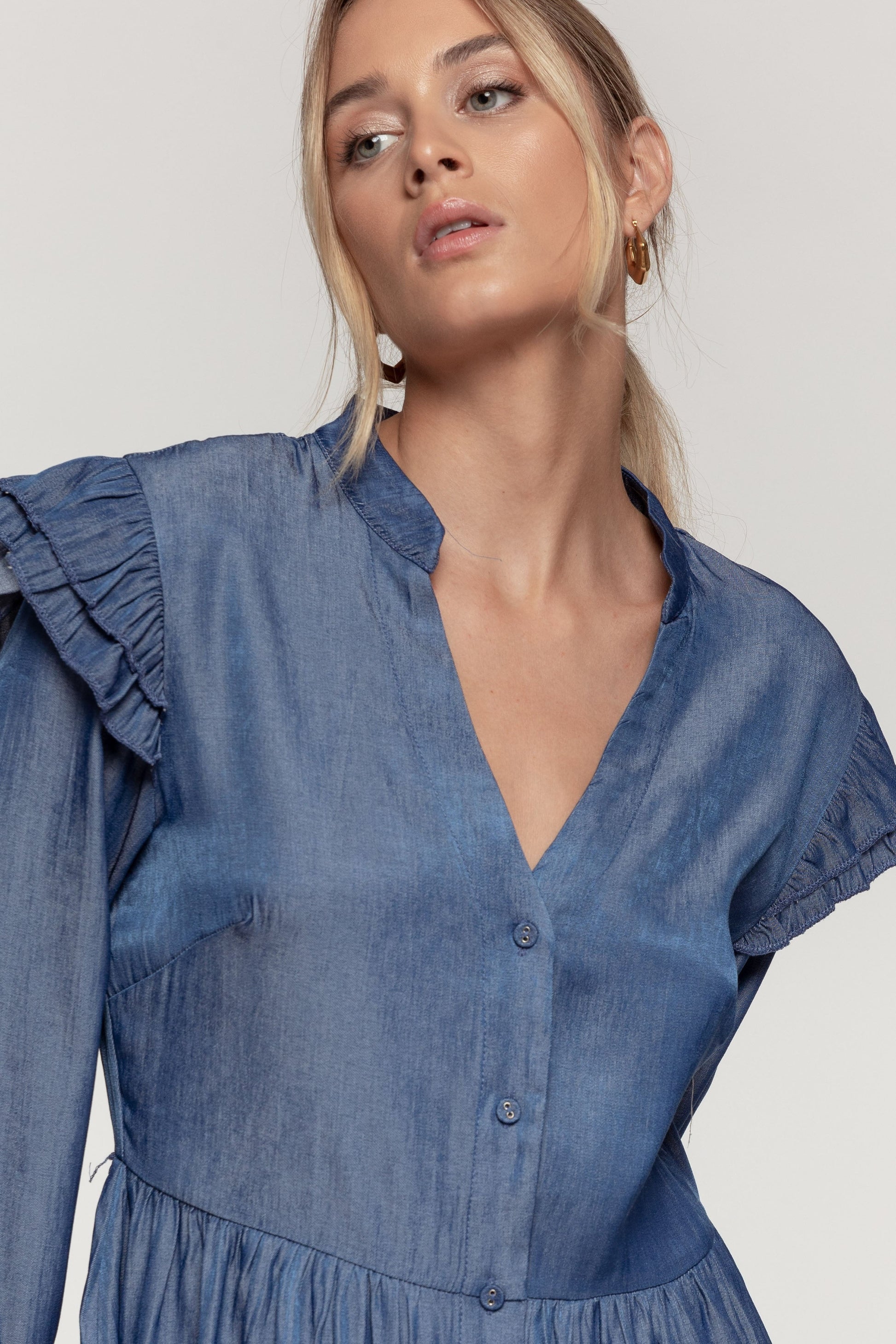 Tejido efecto denim. Diseño corto. Diseño fluido. Diseño oversize. Cuello pico. Manga larga. manga larga con puño frunce. Cierre de botones. Detalle volantes. Talla modelo: S. Altura modelo: 1.66 m.