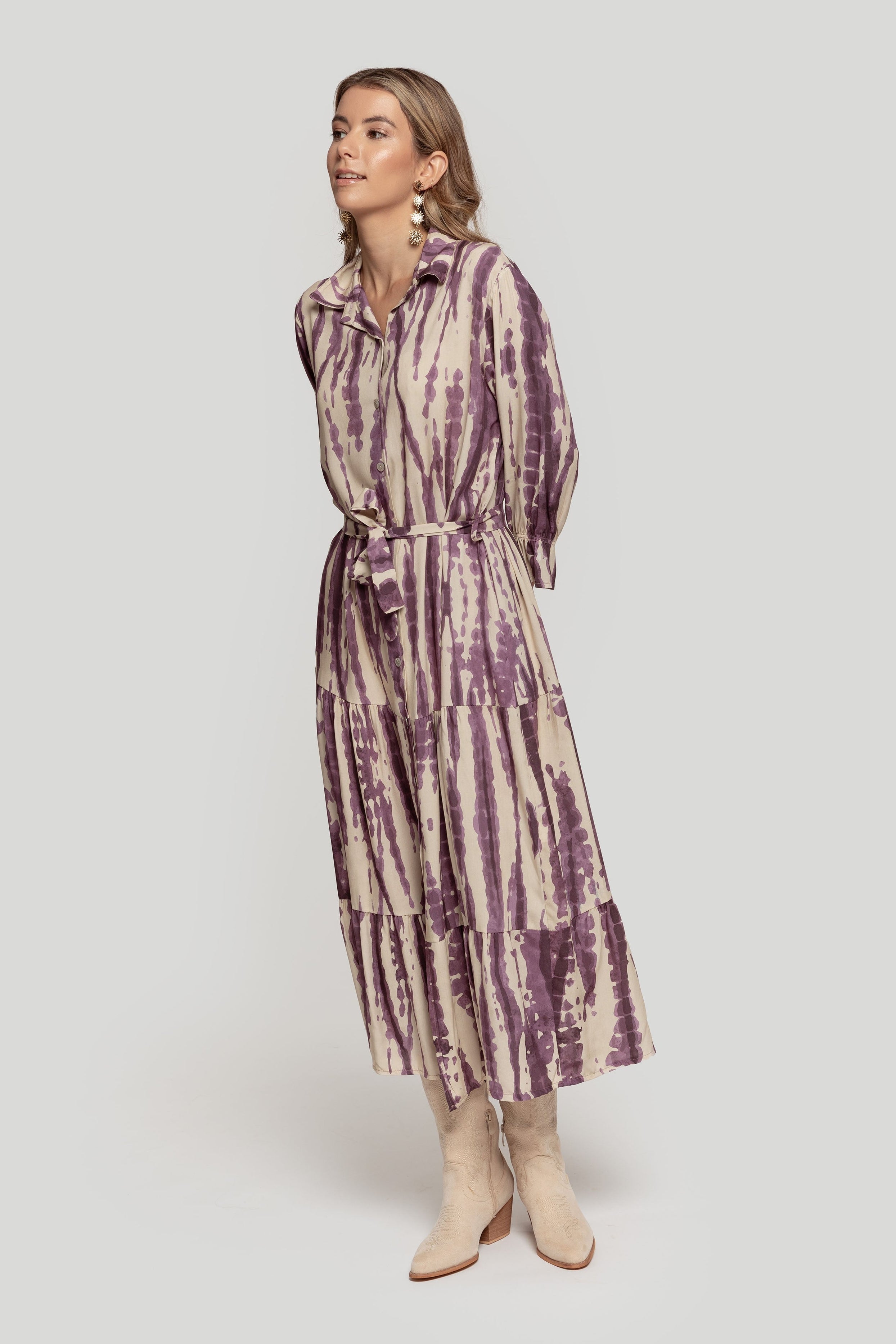 Tejido fluido. Diseño estampado. Diseño largo. Diseño evasé. Estilo camisero. Cuello solapa. Manga tres cuartos con acabado elástico. Cierre de botón. Cinturón a contraste. Bajo volante. Talla modelo: S. Altura modelo 1,70 m.