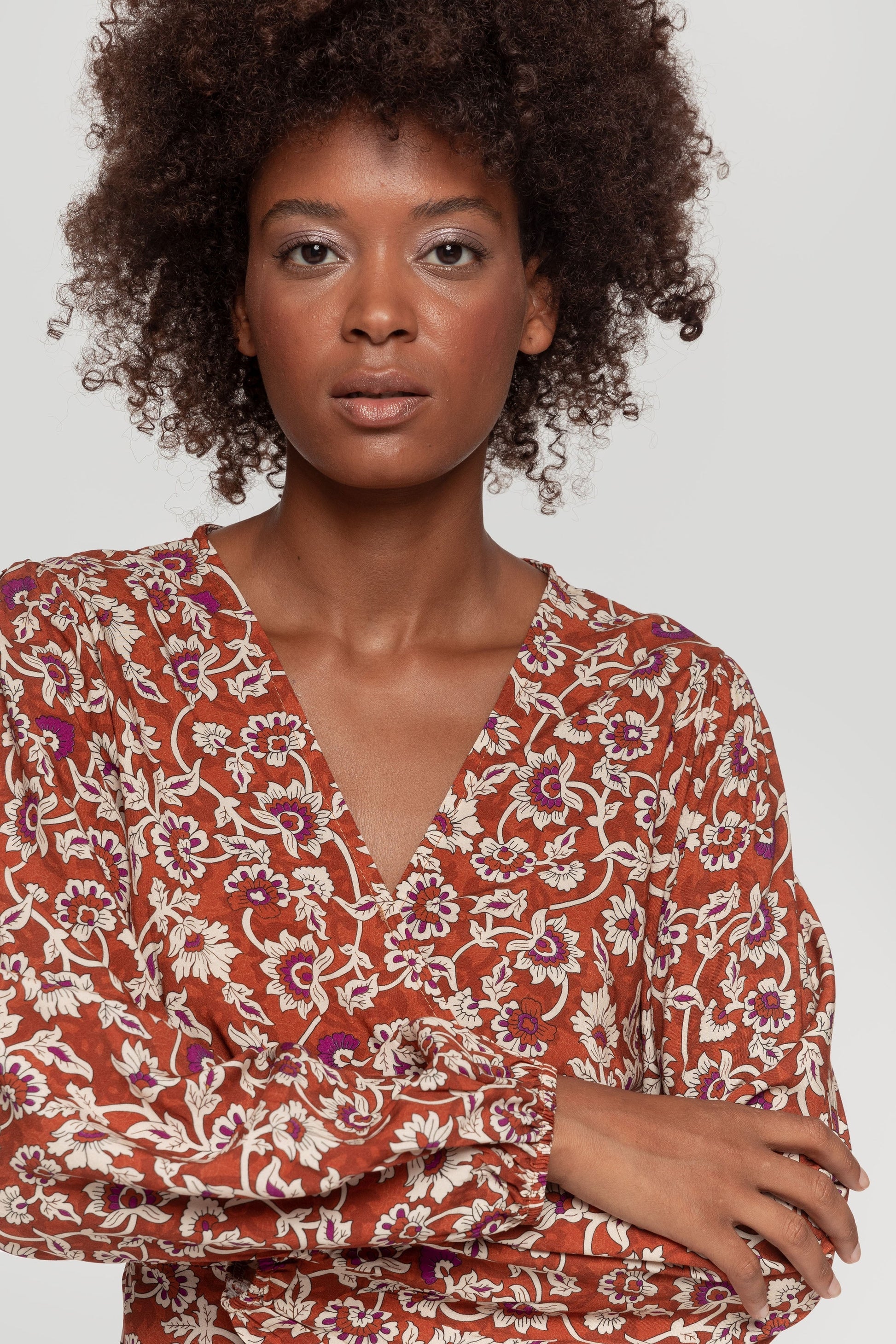 Tejido ligero. Diseño largo. Diseño recto. Diseño estampado. Diseño cruzado. Cuello pico. Manga tres cuarto. Puño elástico. Amplia abertura lateral. Talla modelo: S. Altura modelo 1,70 m.
