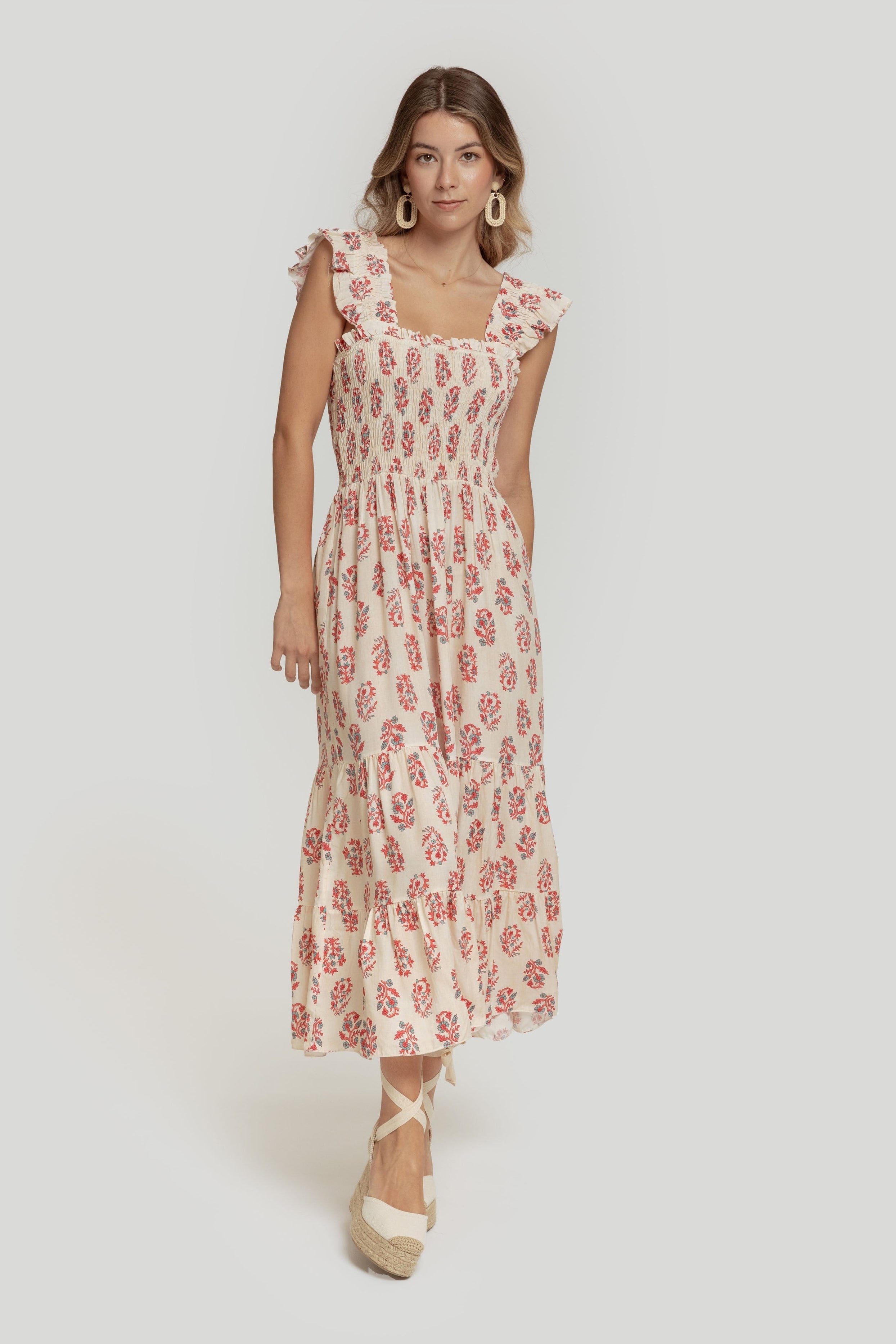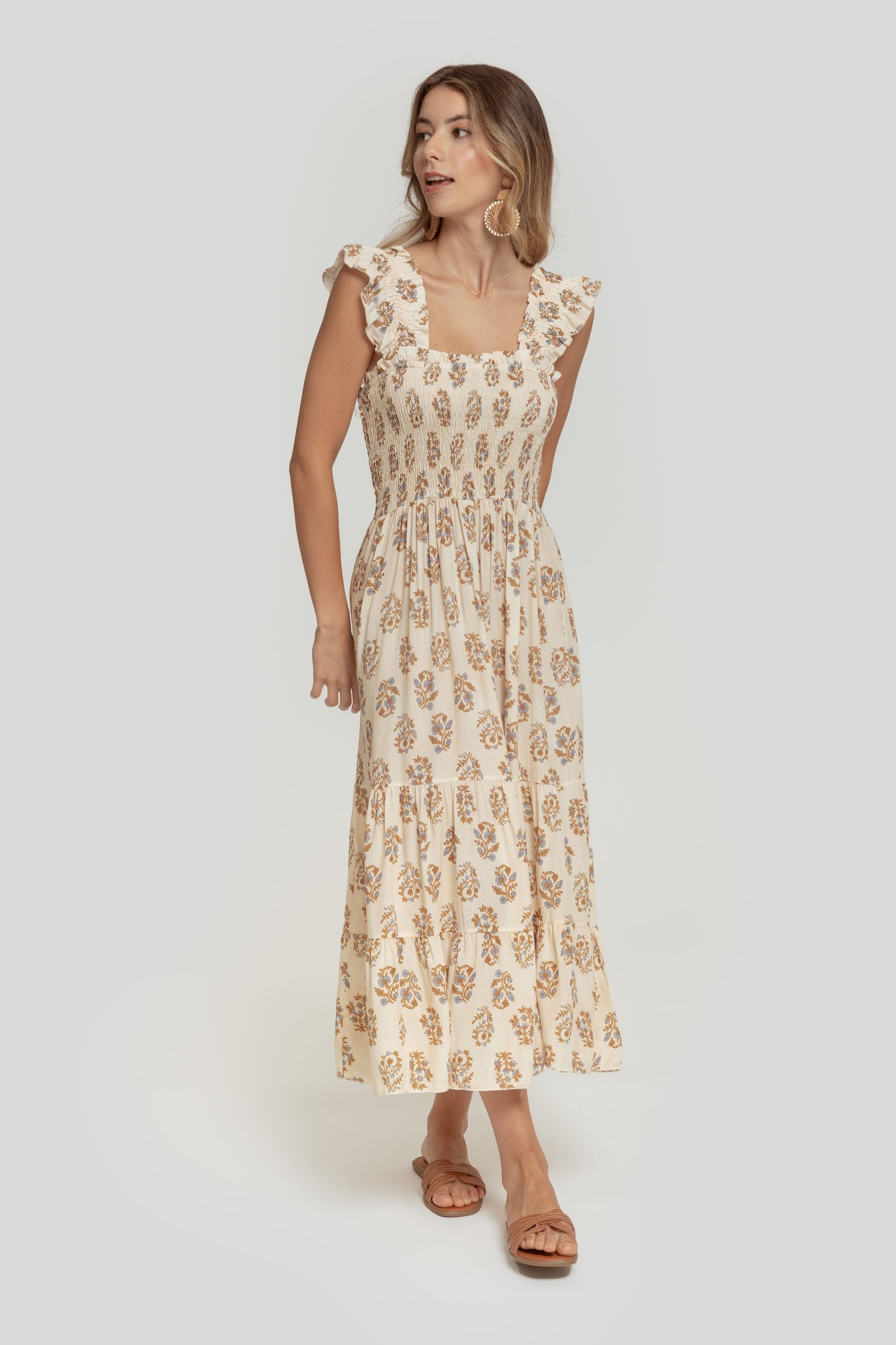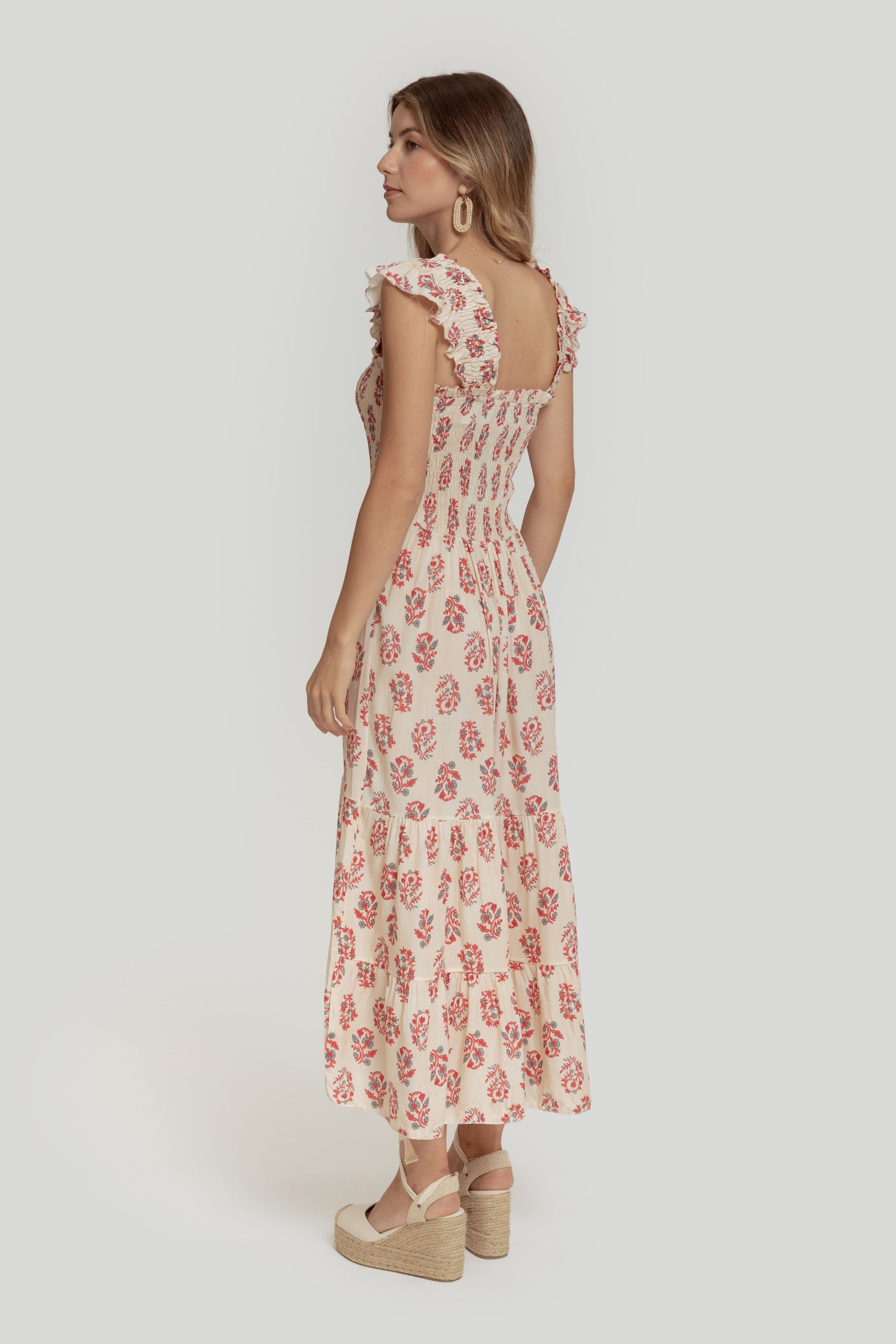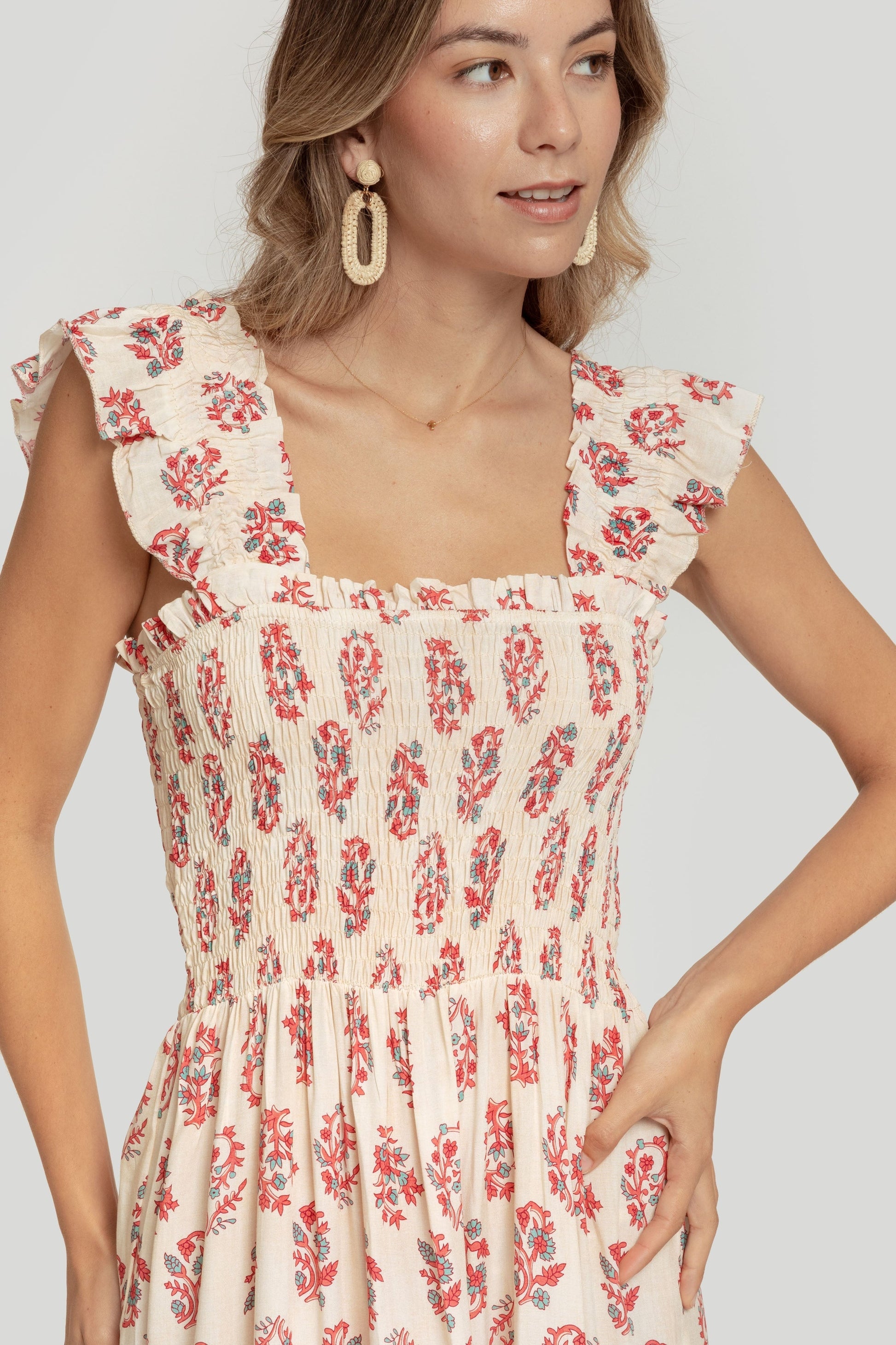 Tejido fluido. Diseño estampado. Diseño midi. Escote cuadrado. Tirantes anchos. Panel elástico. Bajo volante. Talla modelo: S. Altura modelo 1,70 m.