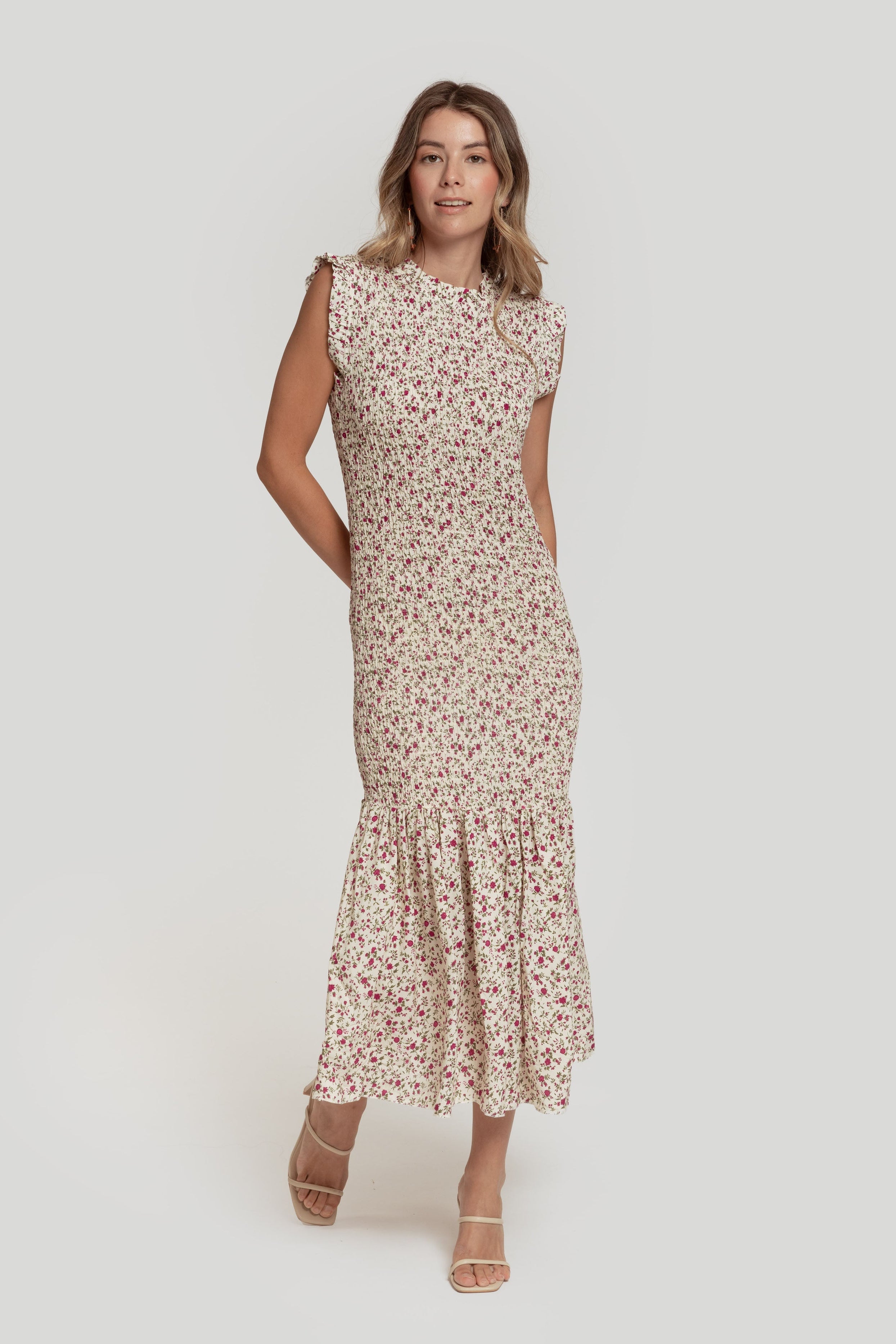 Tejido elástico. Diseño combinado. Diseño estampado. Diseño midi. Diseño ajustado. Cuello alto. Manga corta. Botón en la nuca. Bajo volante. Talla modelo: S. Altura modelo 1,70 m.