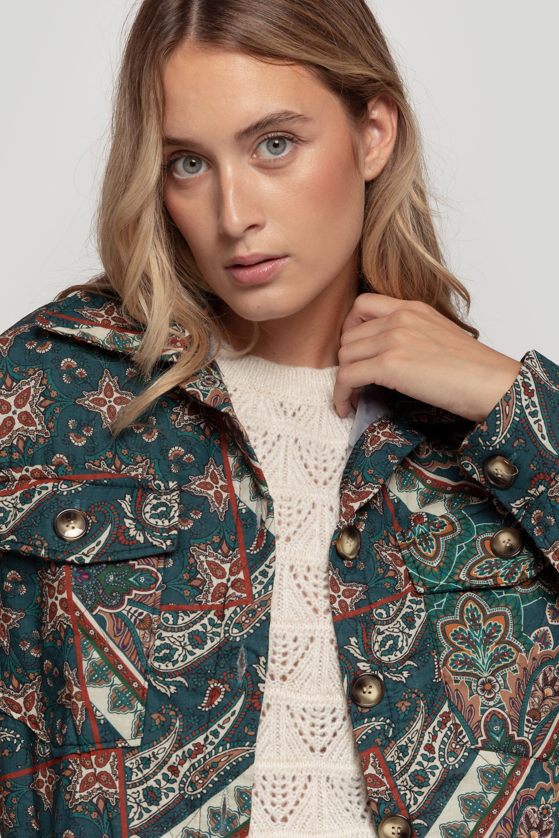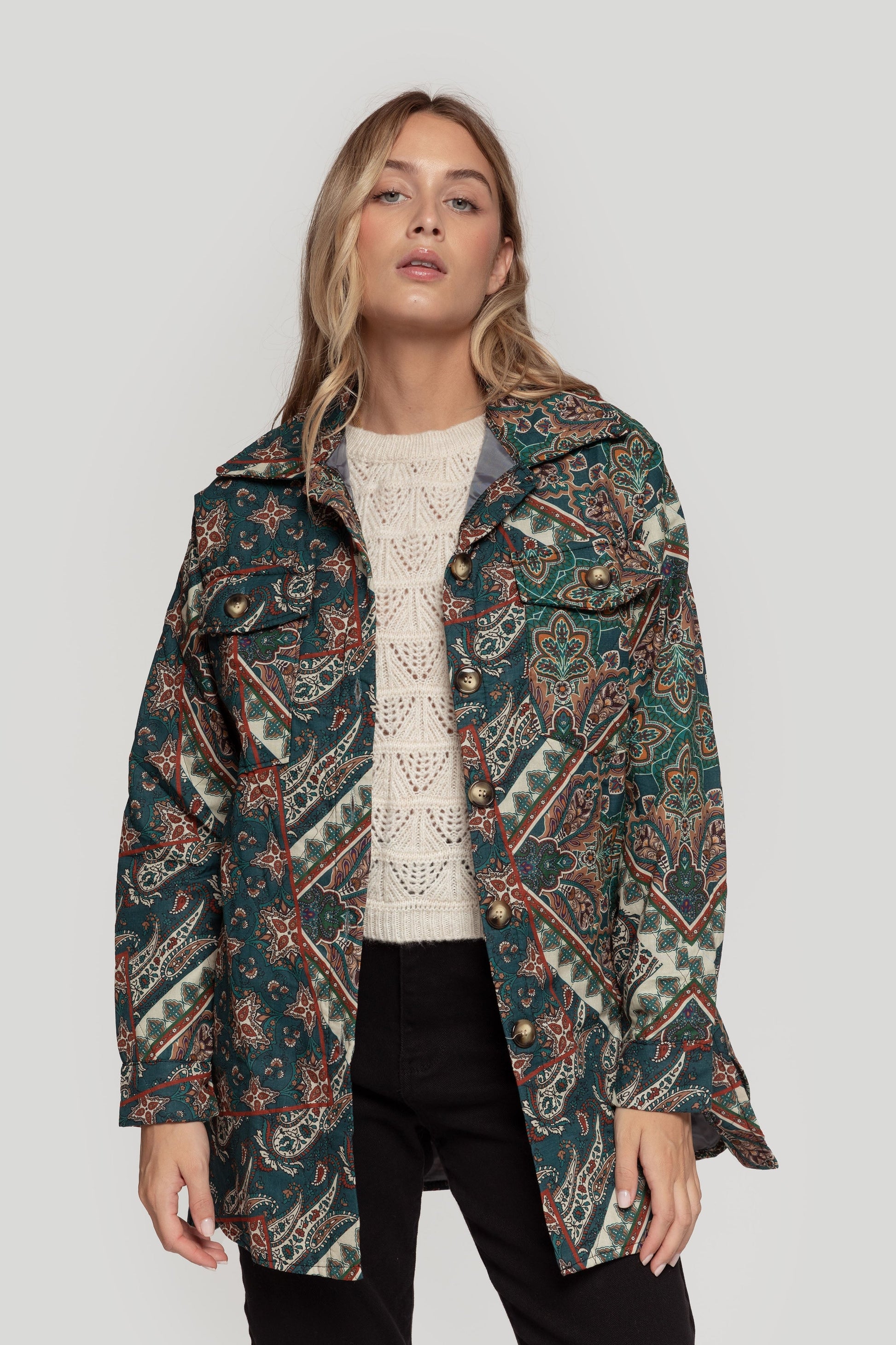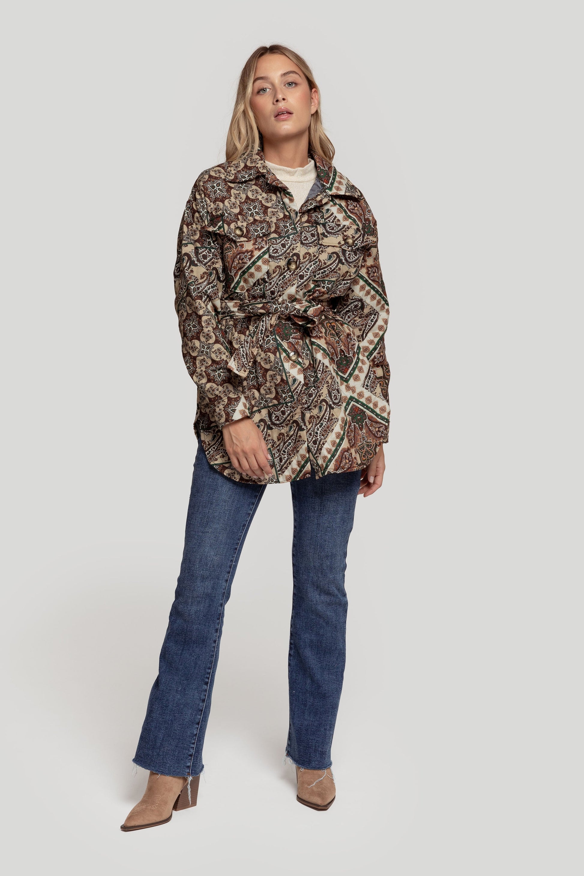 Diseño estampado. Diseño recto. Cuello solapa. Manga larga. Cinturón lazada de mismo tejido. Cierre frontal con botones. Talla modelo: S. Altura modelo: 1,73 m.
