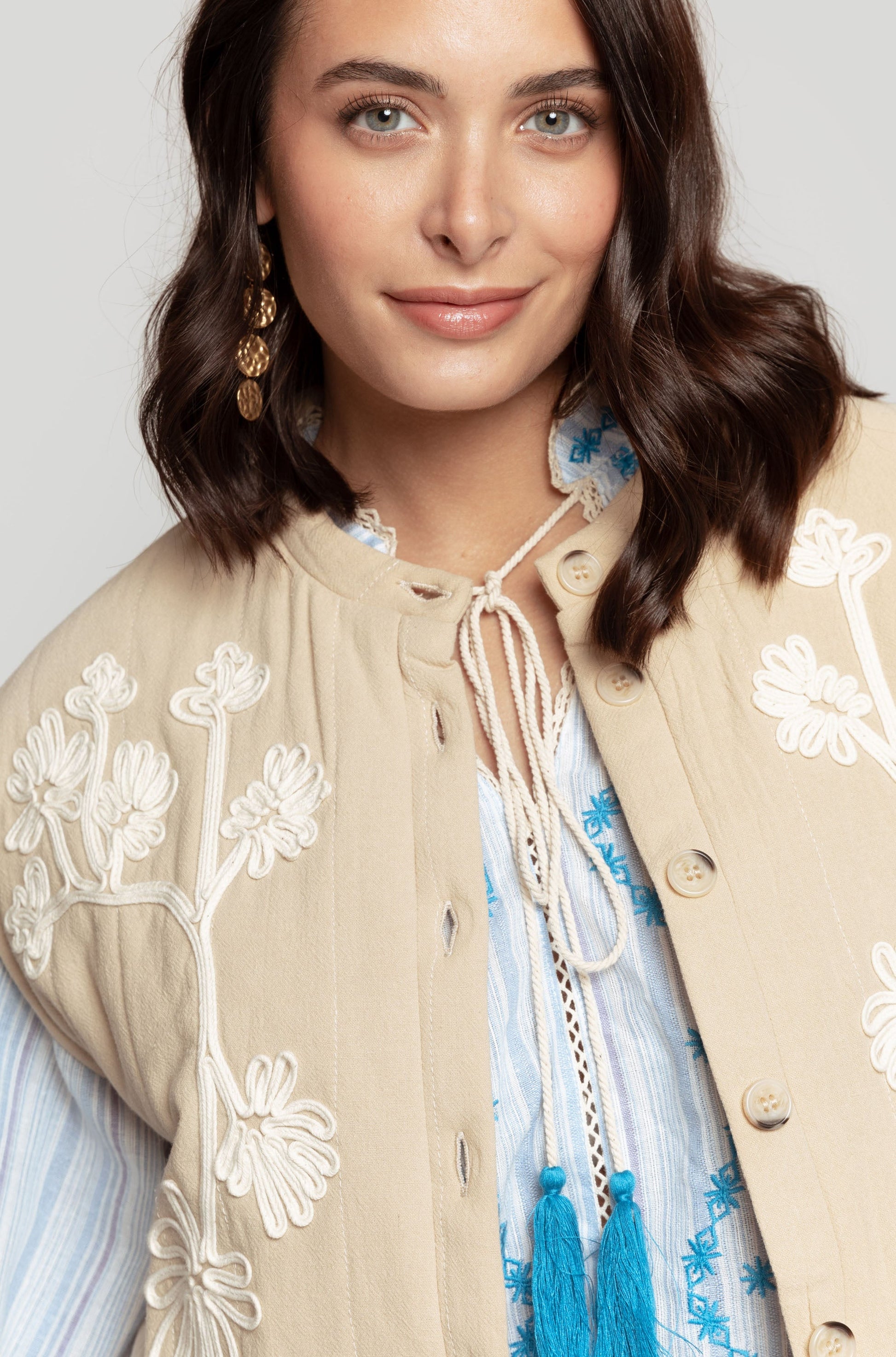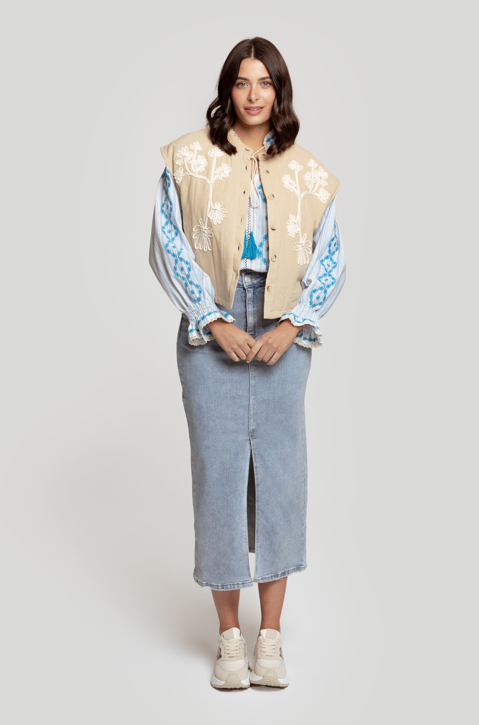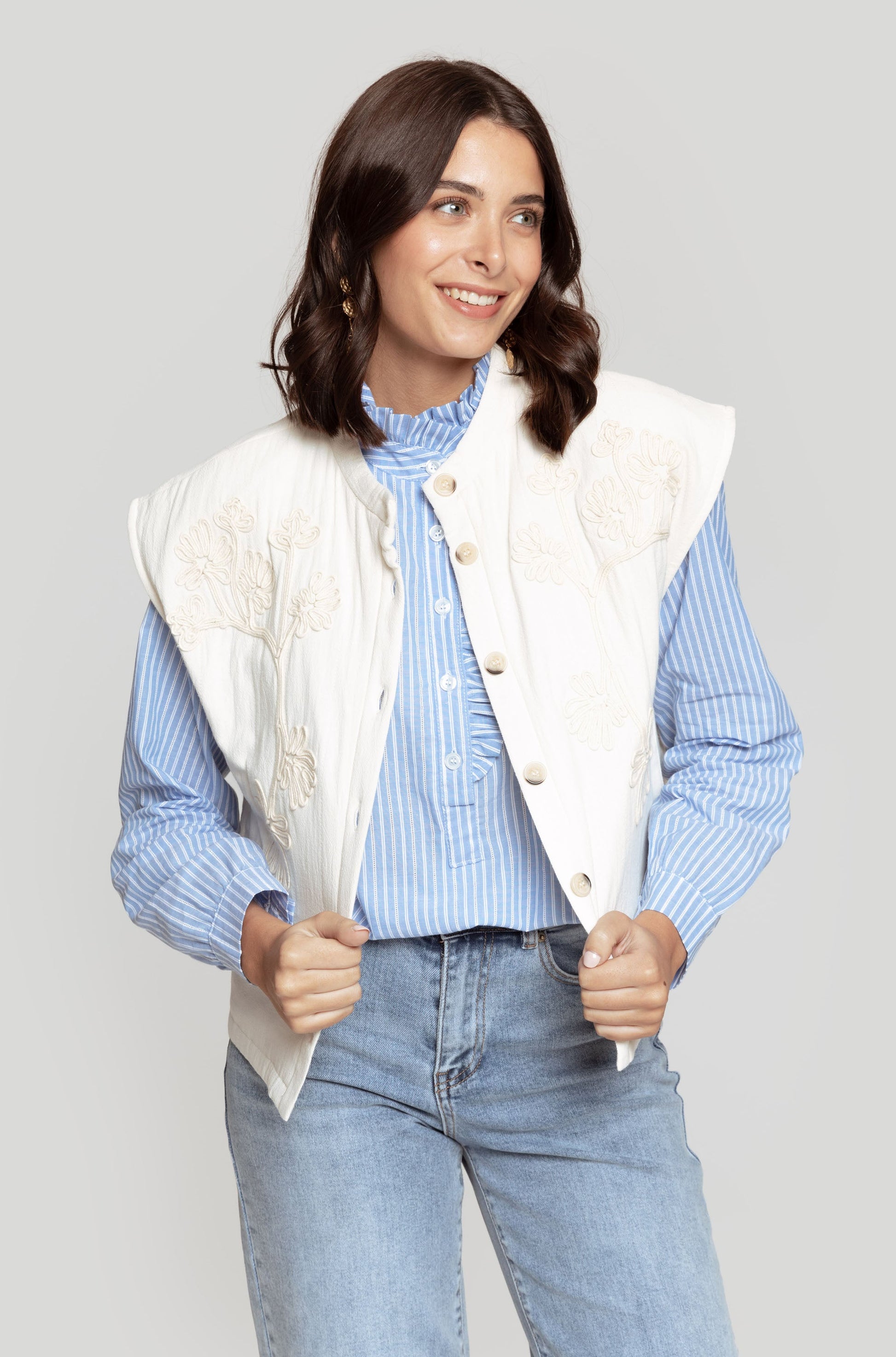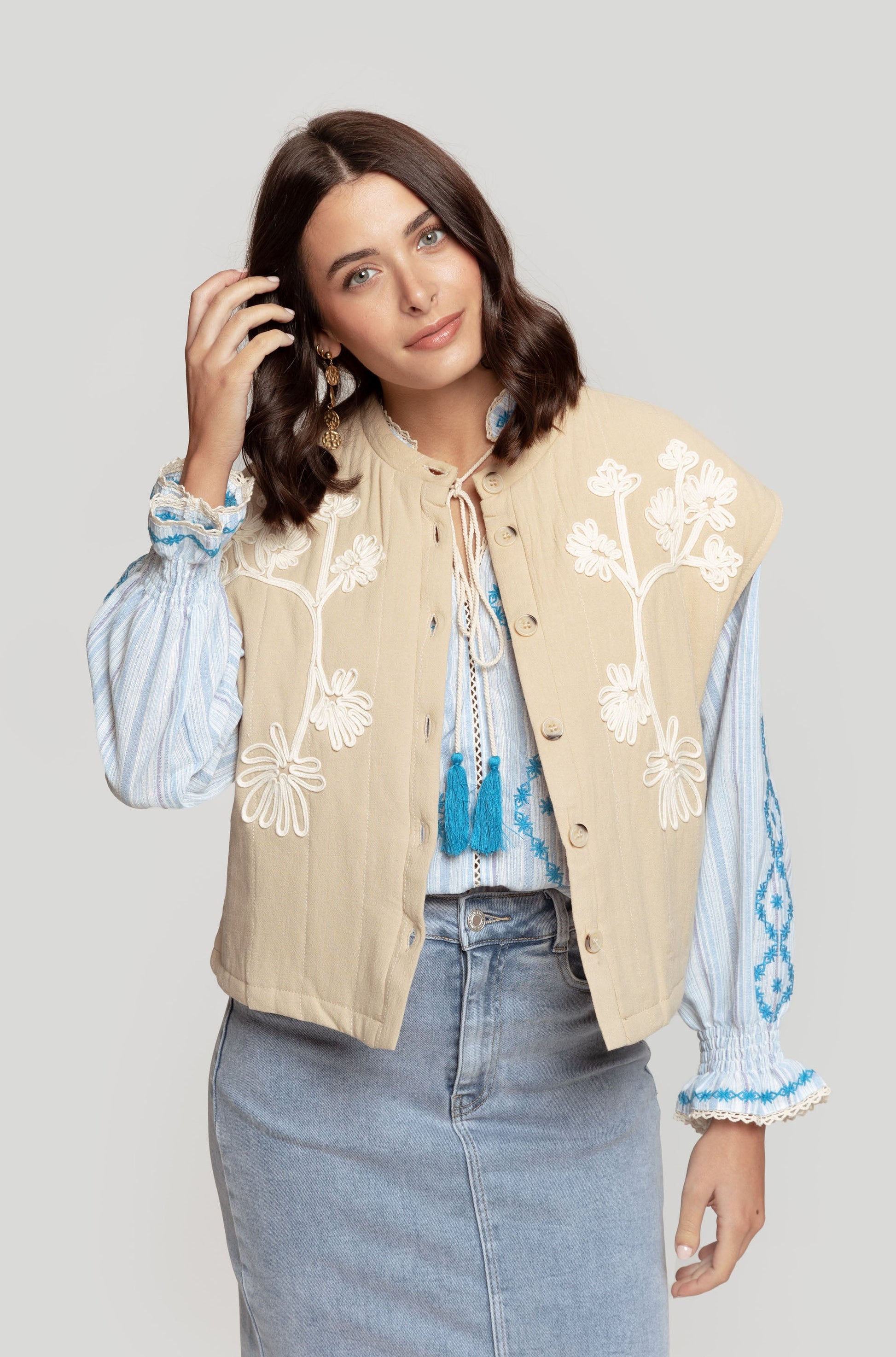 Tejido de algodón. Diseño con bordados. Diseño oversize. Diseño recto. Cuello redondo. Manga sisa. Cierre de botones. Forrado. Talla modelo: S/M. Altura modelo: 1.75 m.