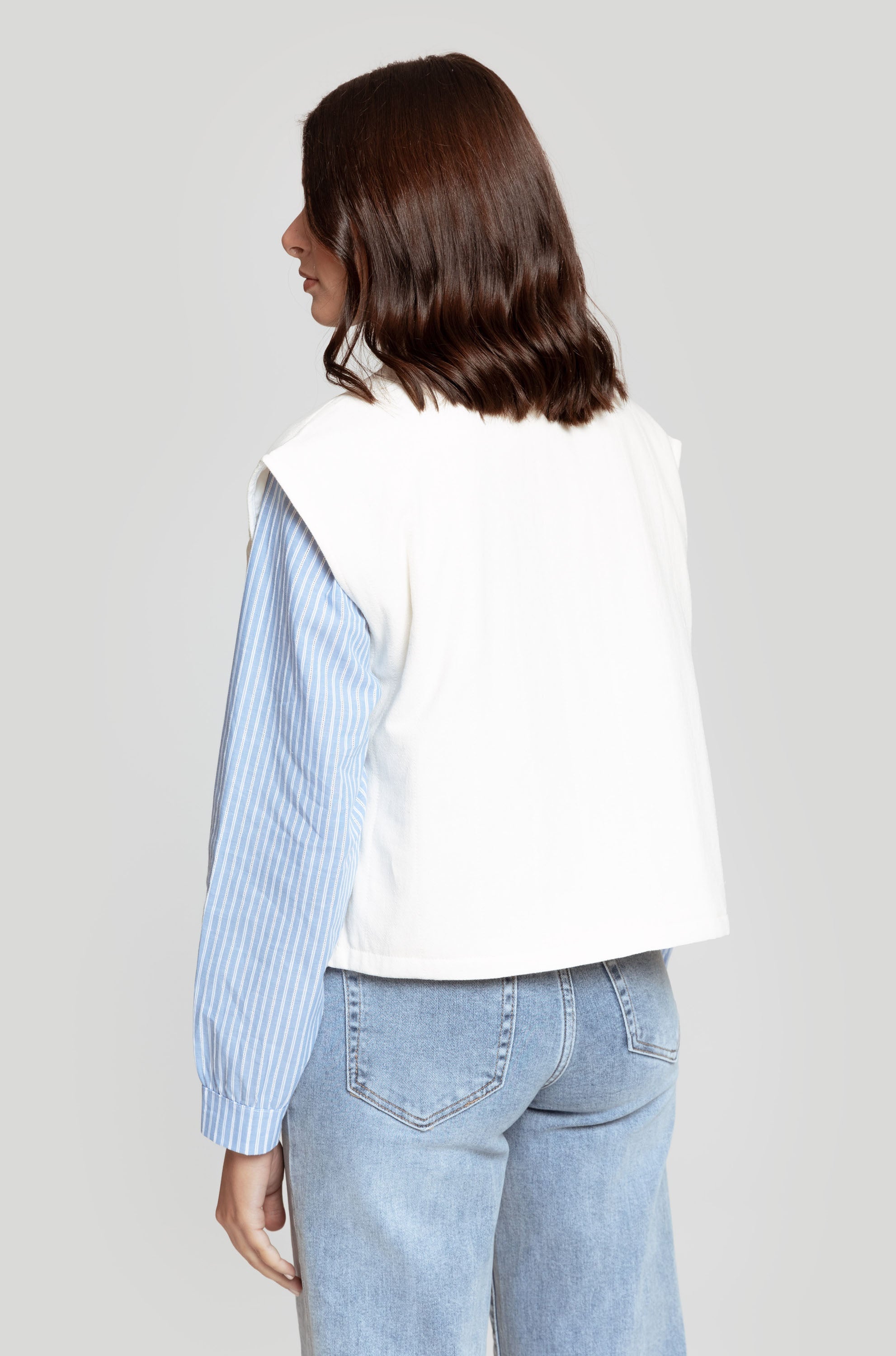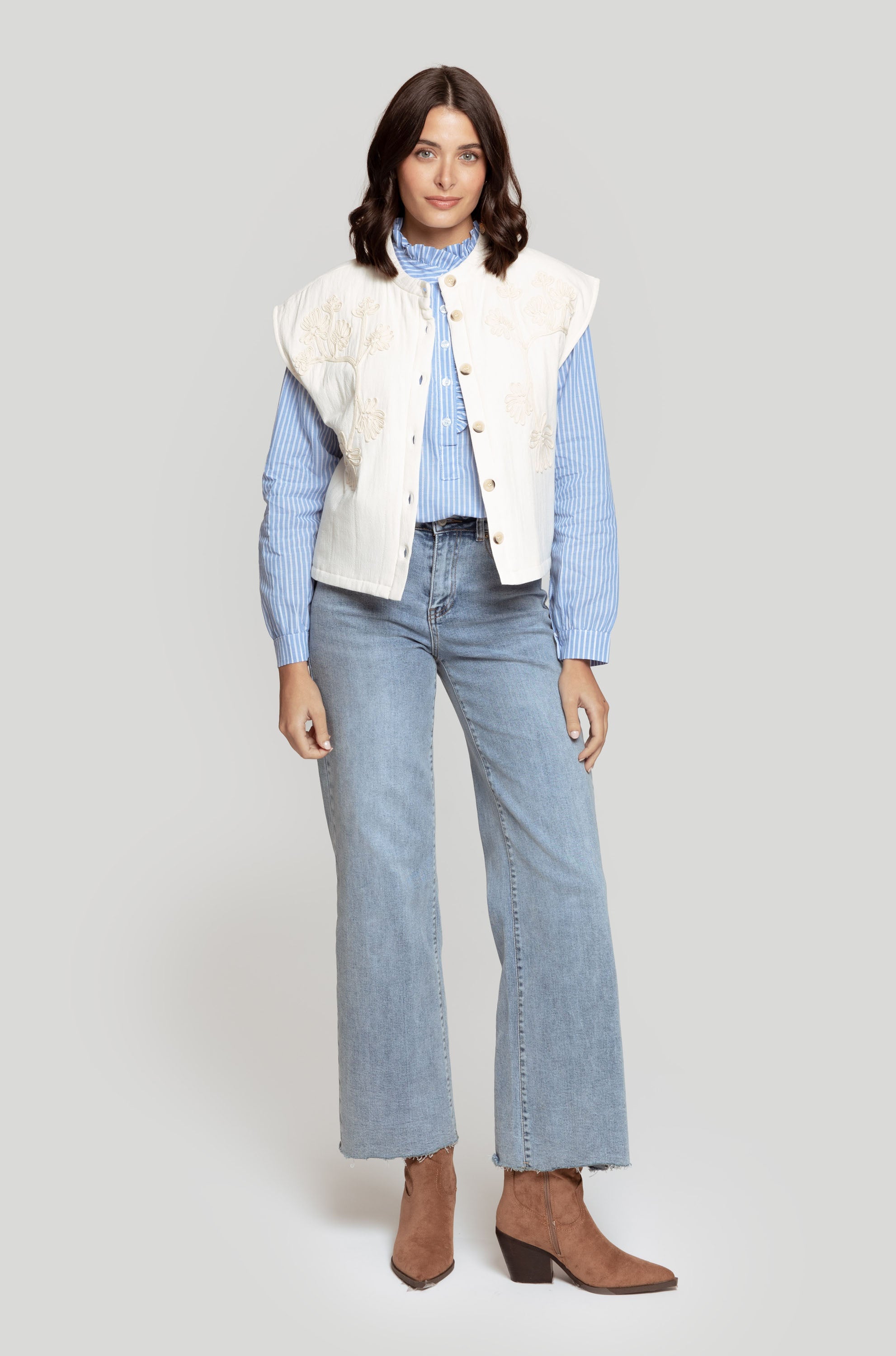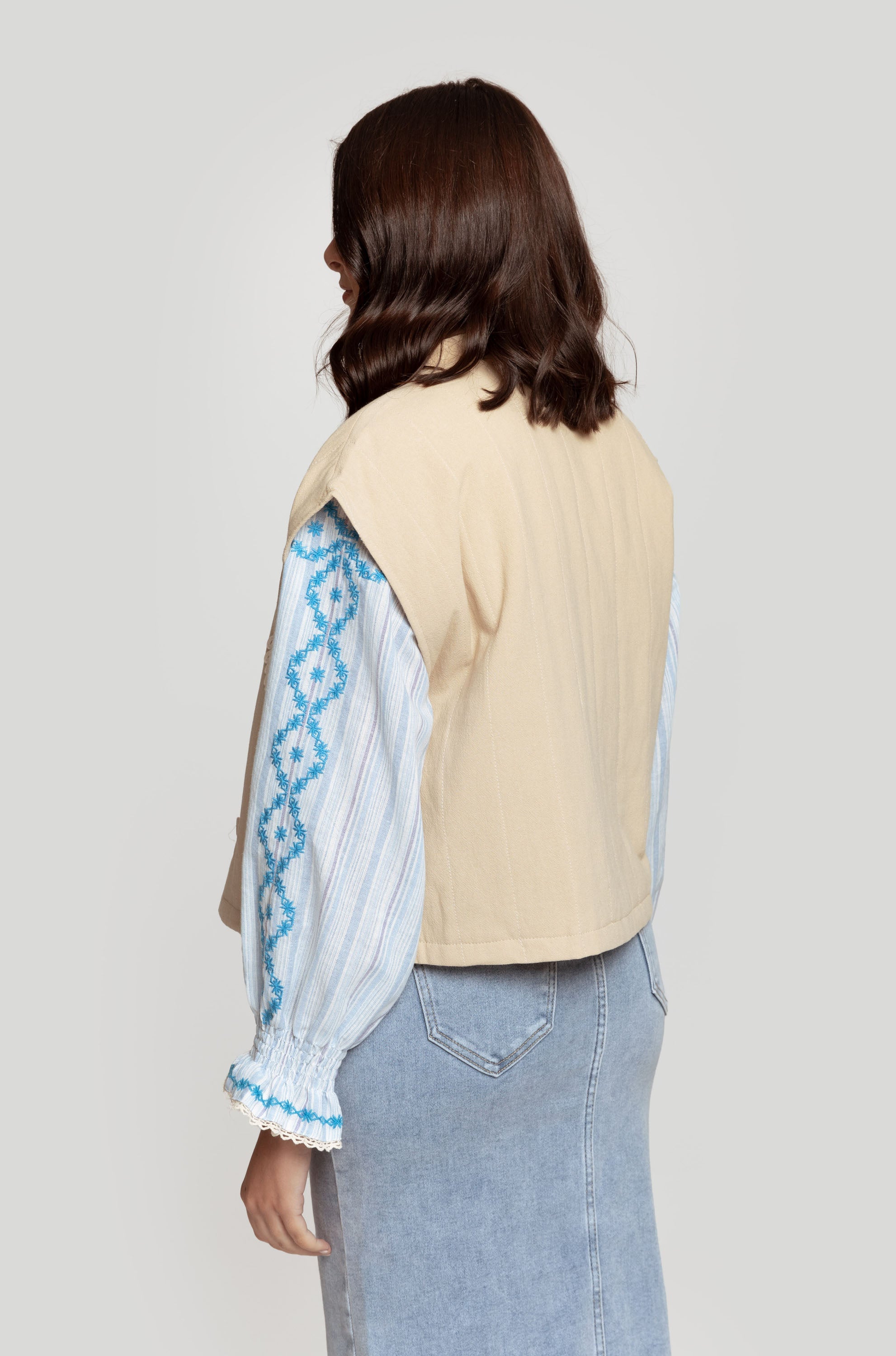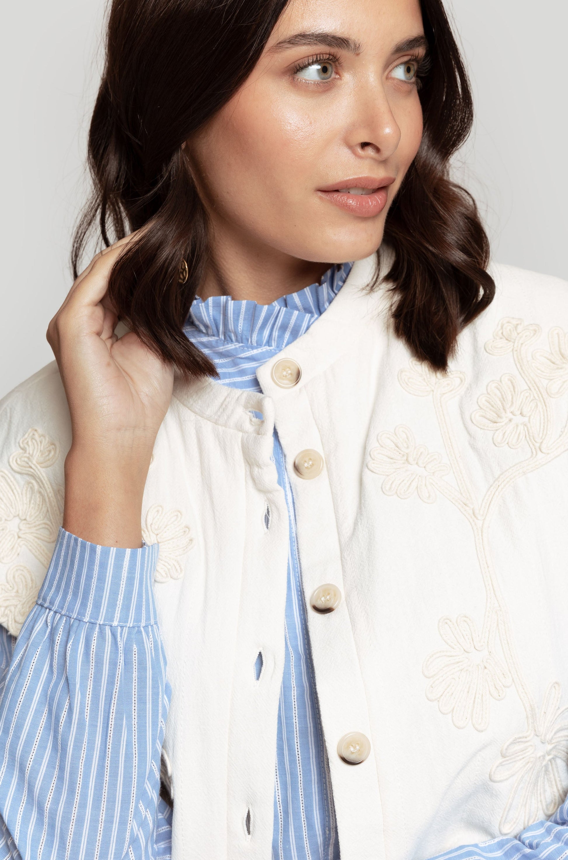 Tejido de algodón. Diseño con bordados. Diseño oversize. Diseño recto. Cuello redondo. Manga sisa. Cierre de botones. Forrado. Talla modelo: S/M. Altura modelo: 1.75 m.