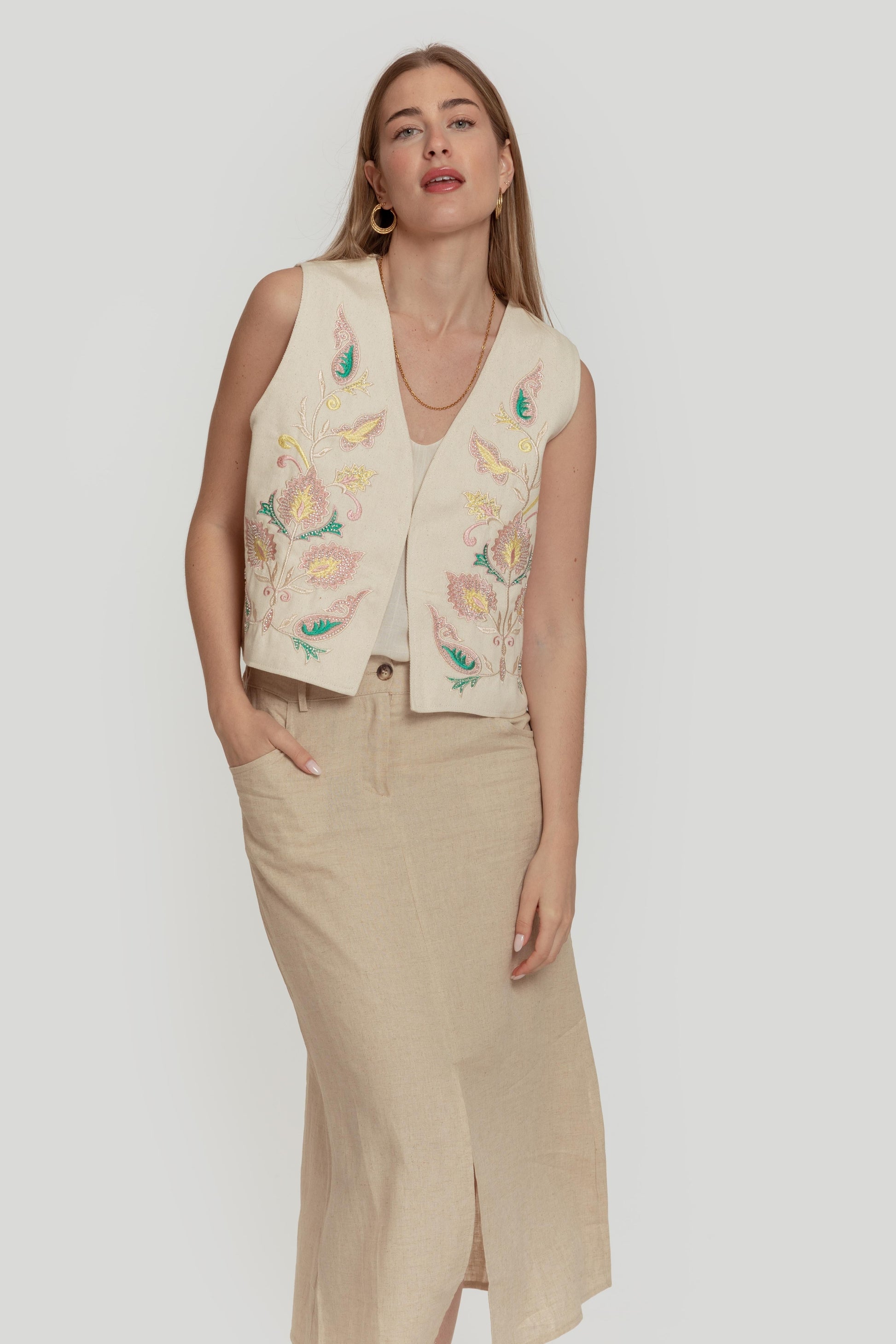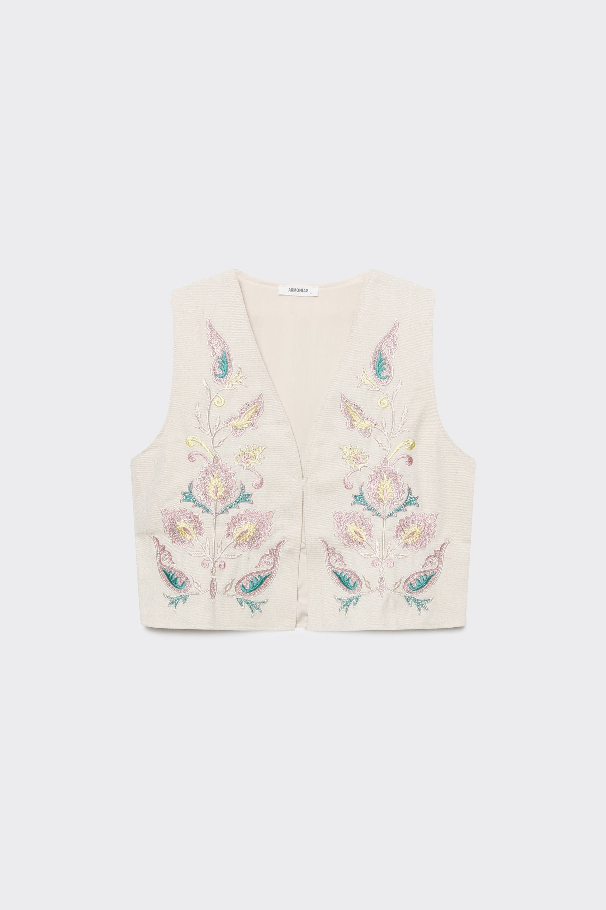 Tejido de algodón. Diseño bordado. Detalles abalorios. Diseño corto. Diseño recto. Manga sisa. Sin cierre. Forrado. Talla única. Altura modelo: 1,70 m.