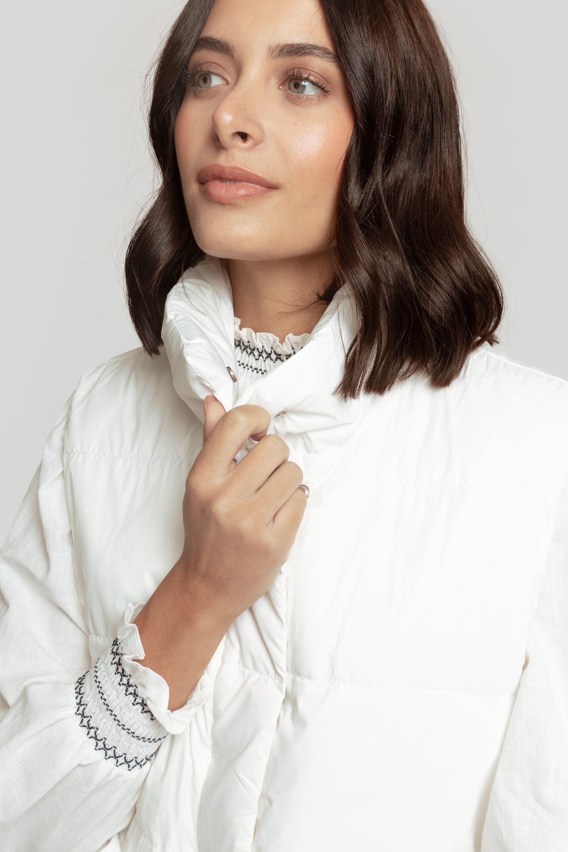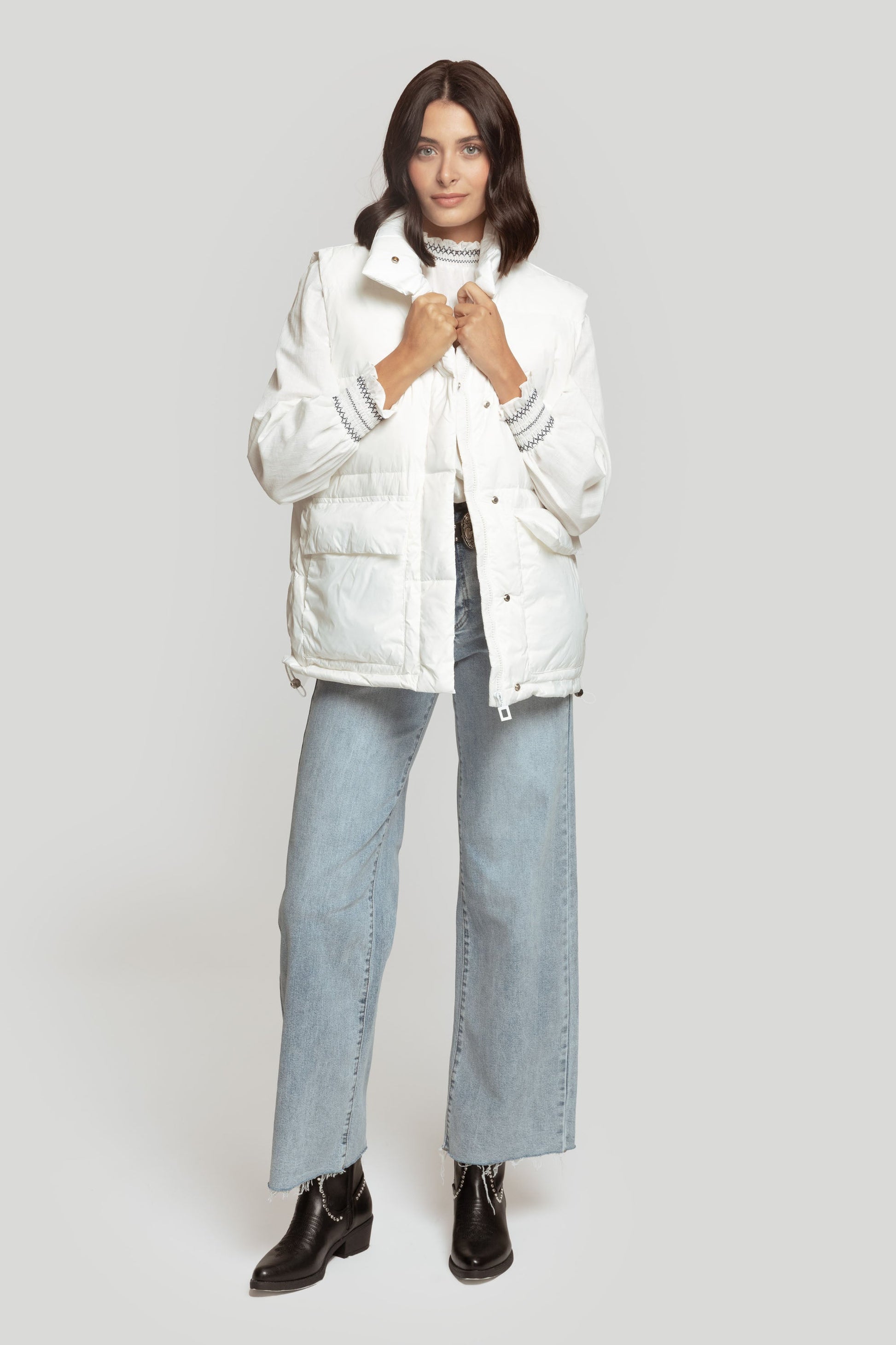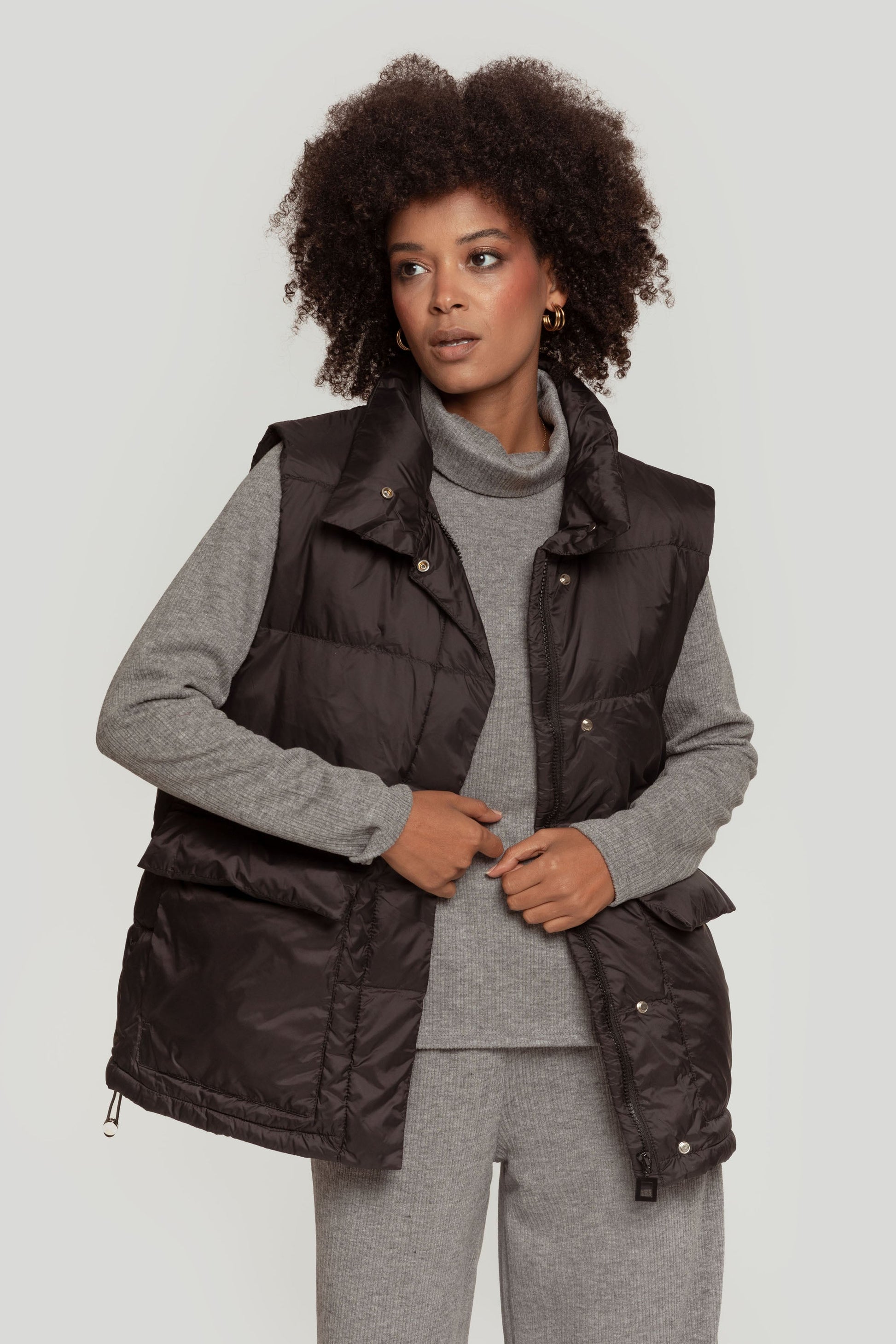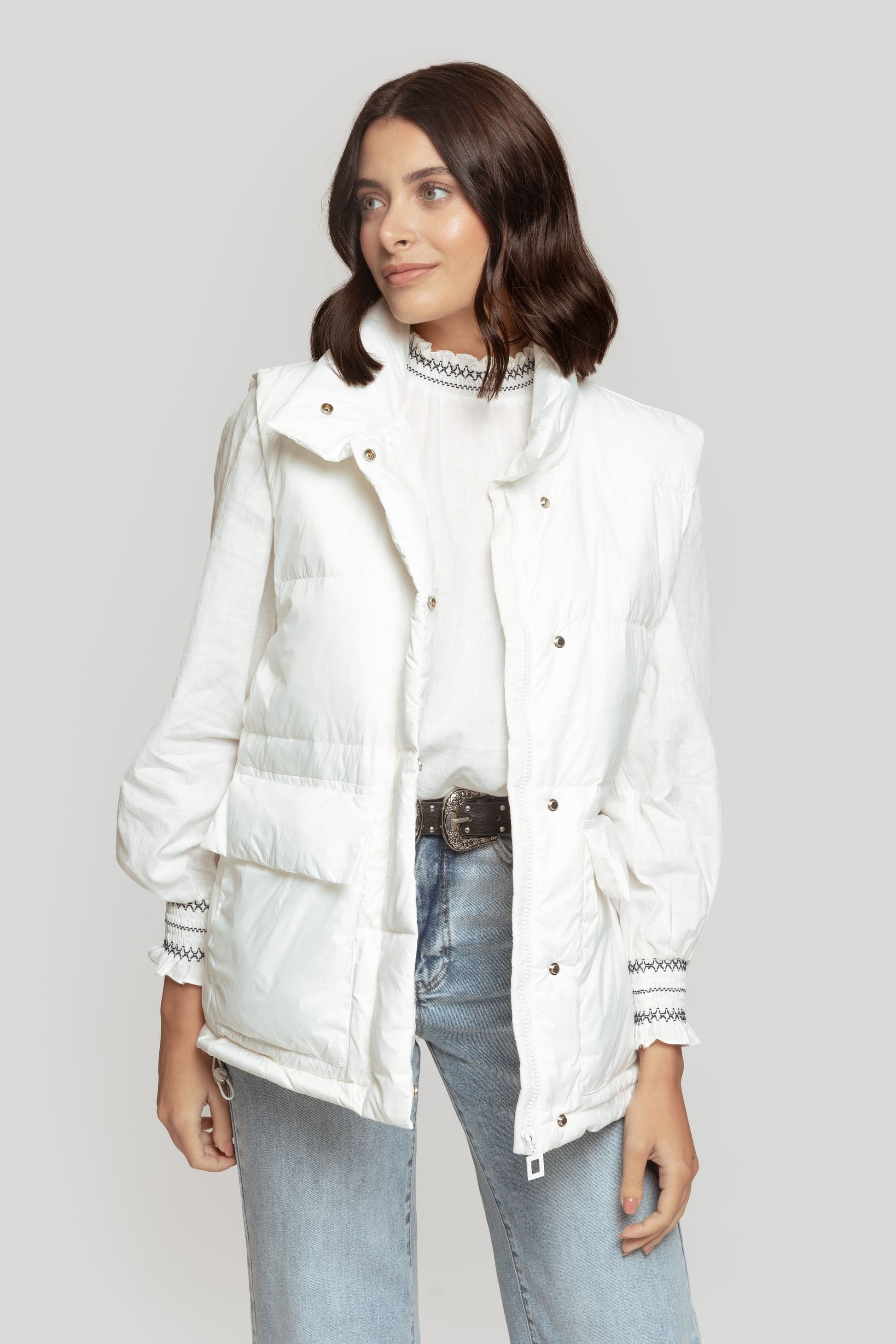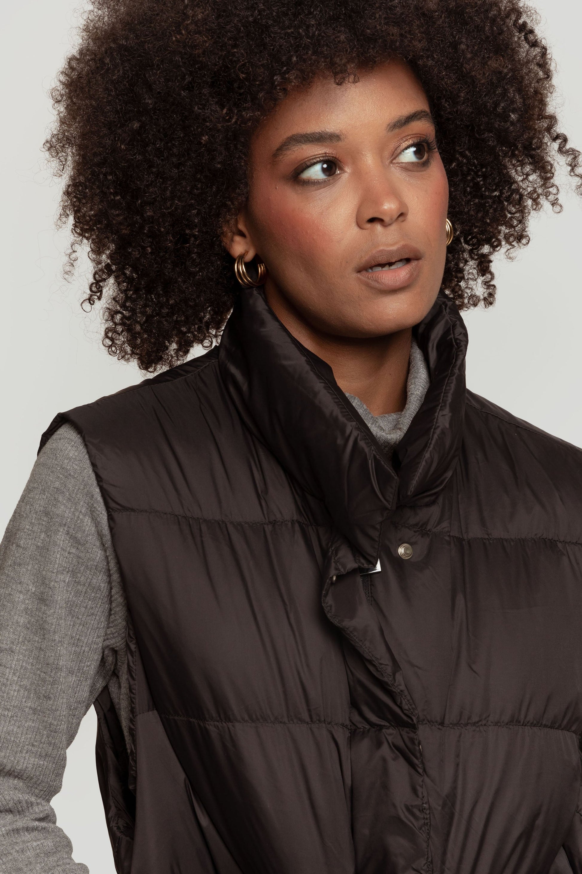 Chaleco ultra ligero. Tejido acolchado. Tejido técnico repelente al agua. Cuello alto. Sin mangas. Bolsillos frontales con solapa. Cierre de cremallera y botones. Talla modelo: S. Altura modelo: 1,66 m.