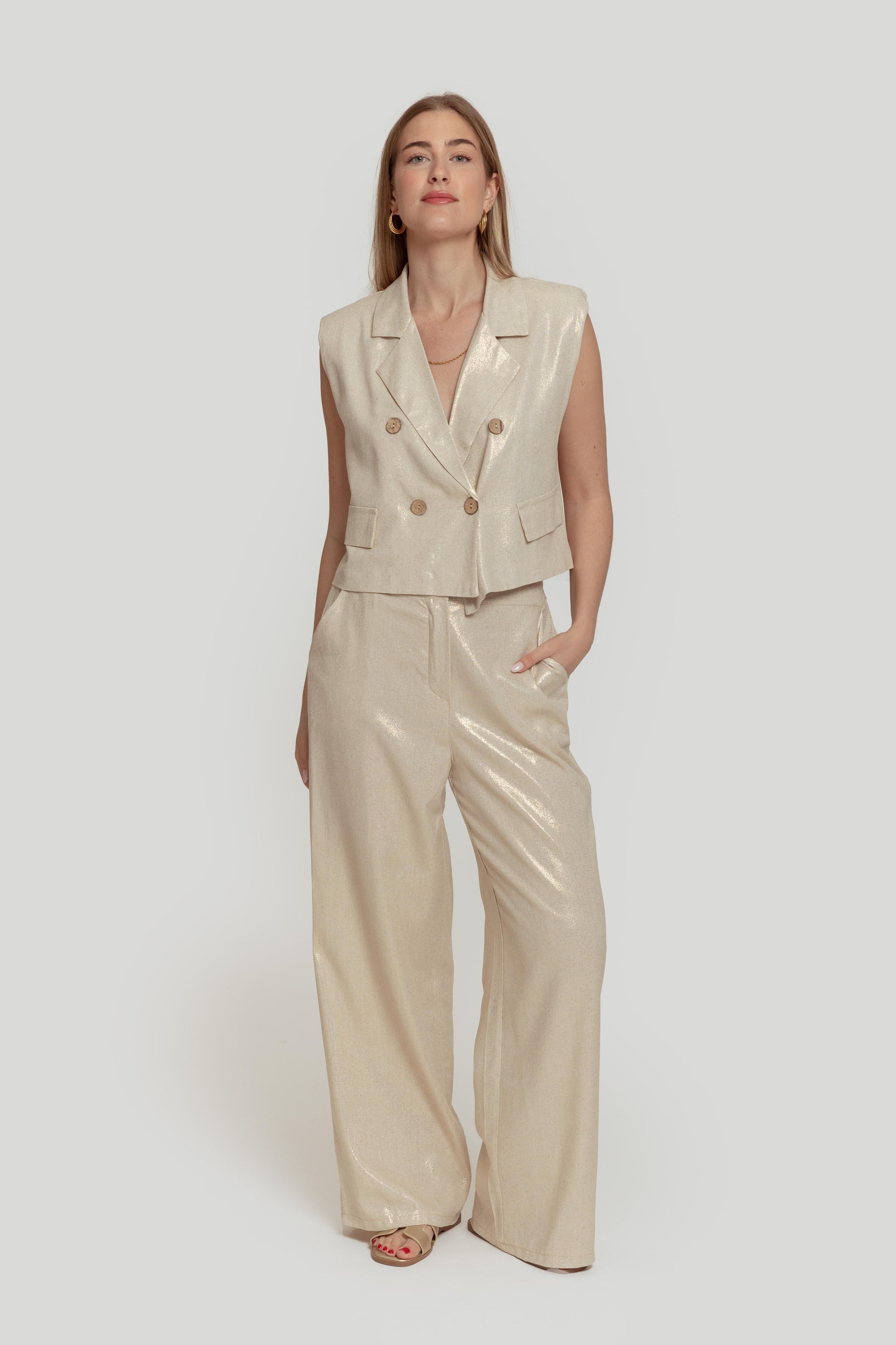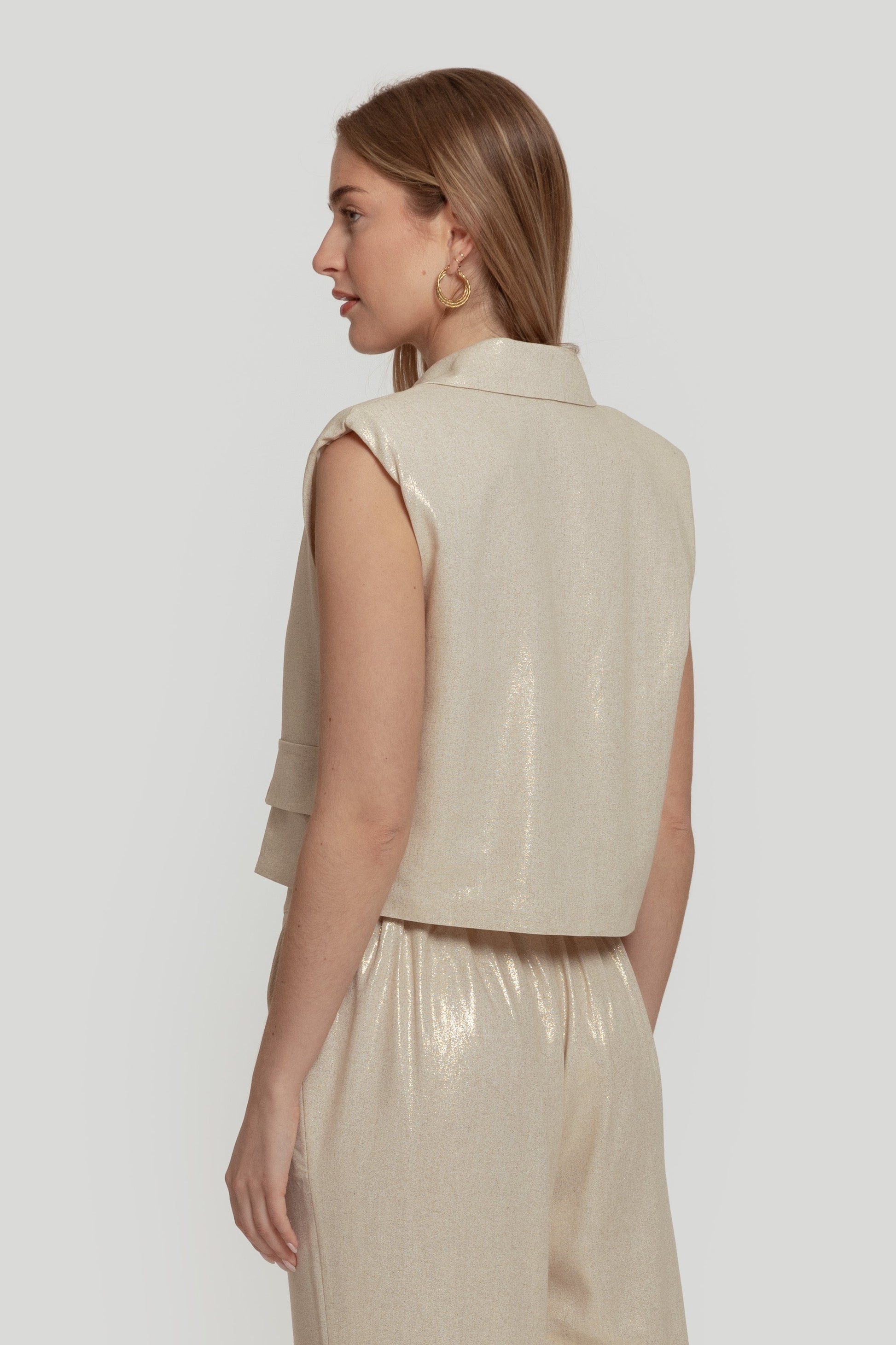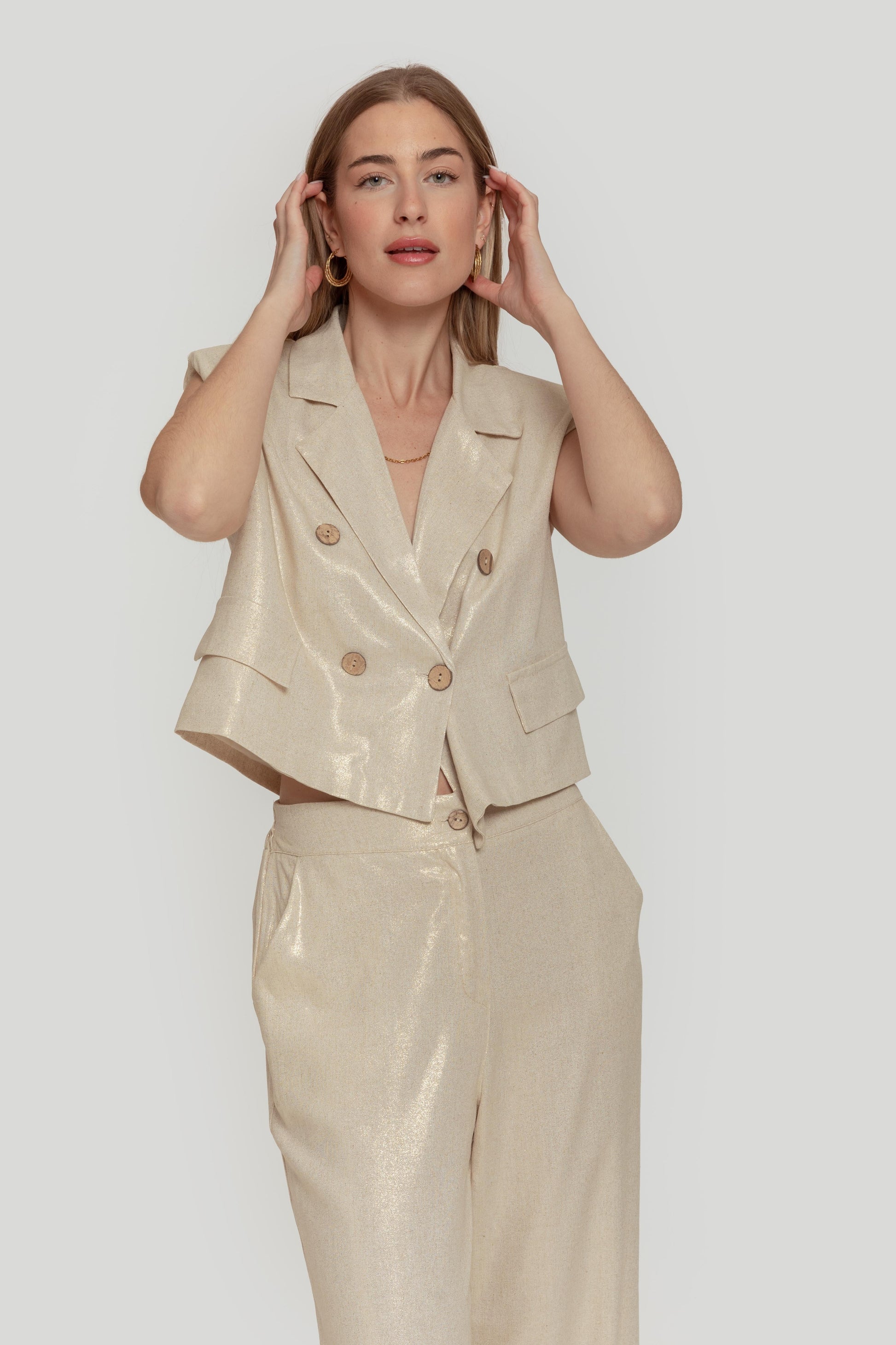 Tejido mezcla lino. Tejido brillo. Diseño amplio. Diseño corto. Diseño recto. Diseño cruzado. Estilo traje. Cuello pico. Cuello solapa. Manga sisa. Cierre de botones. Forrado. Talla modelo: S. Altura modelo: 1,70 m.