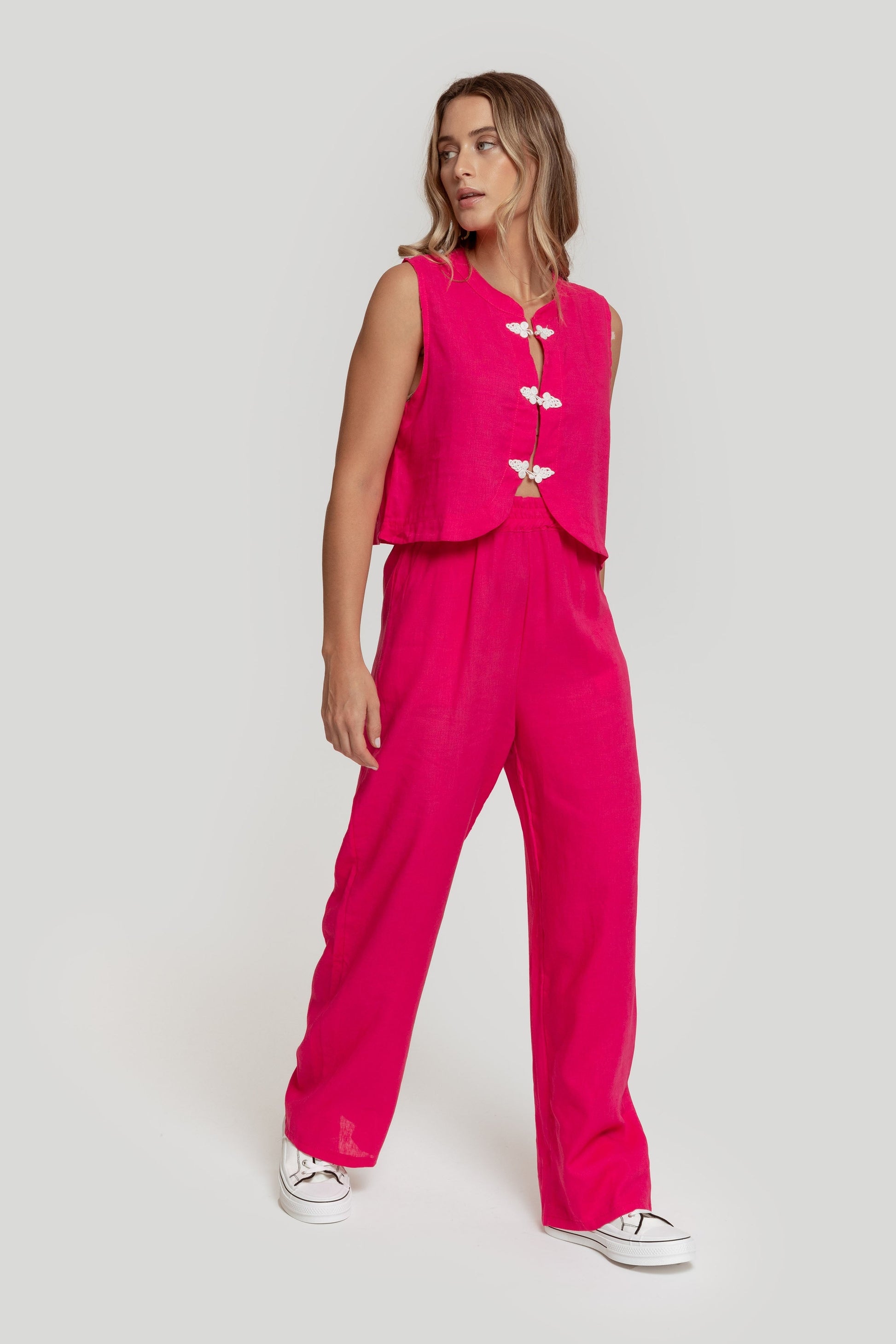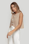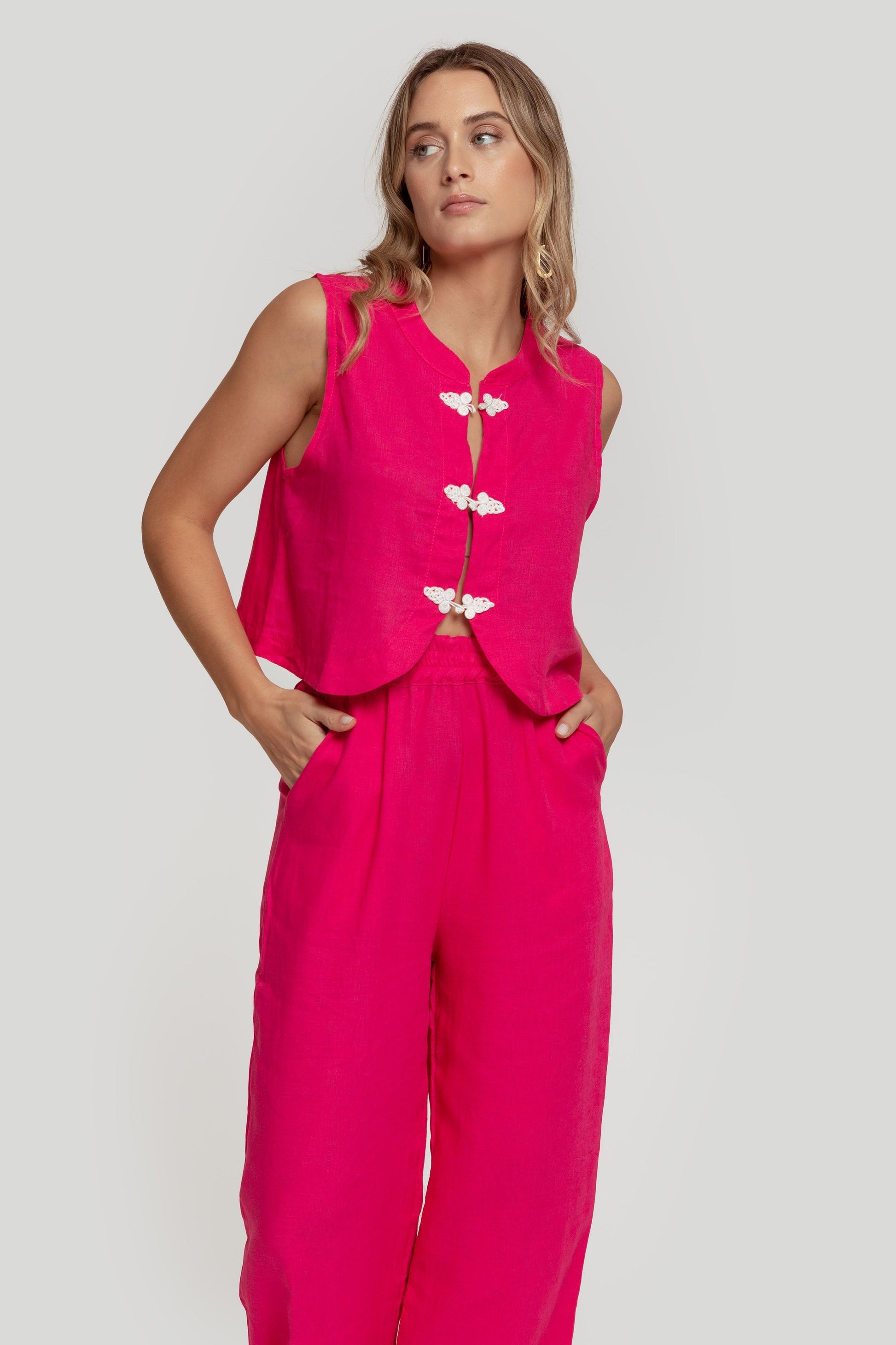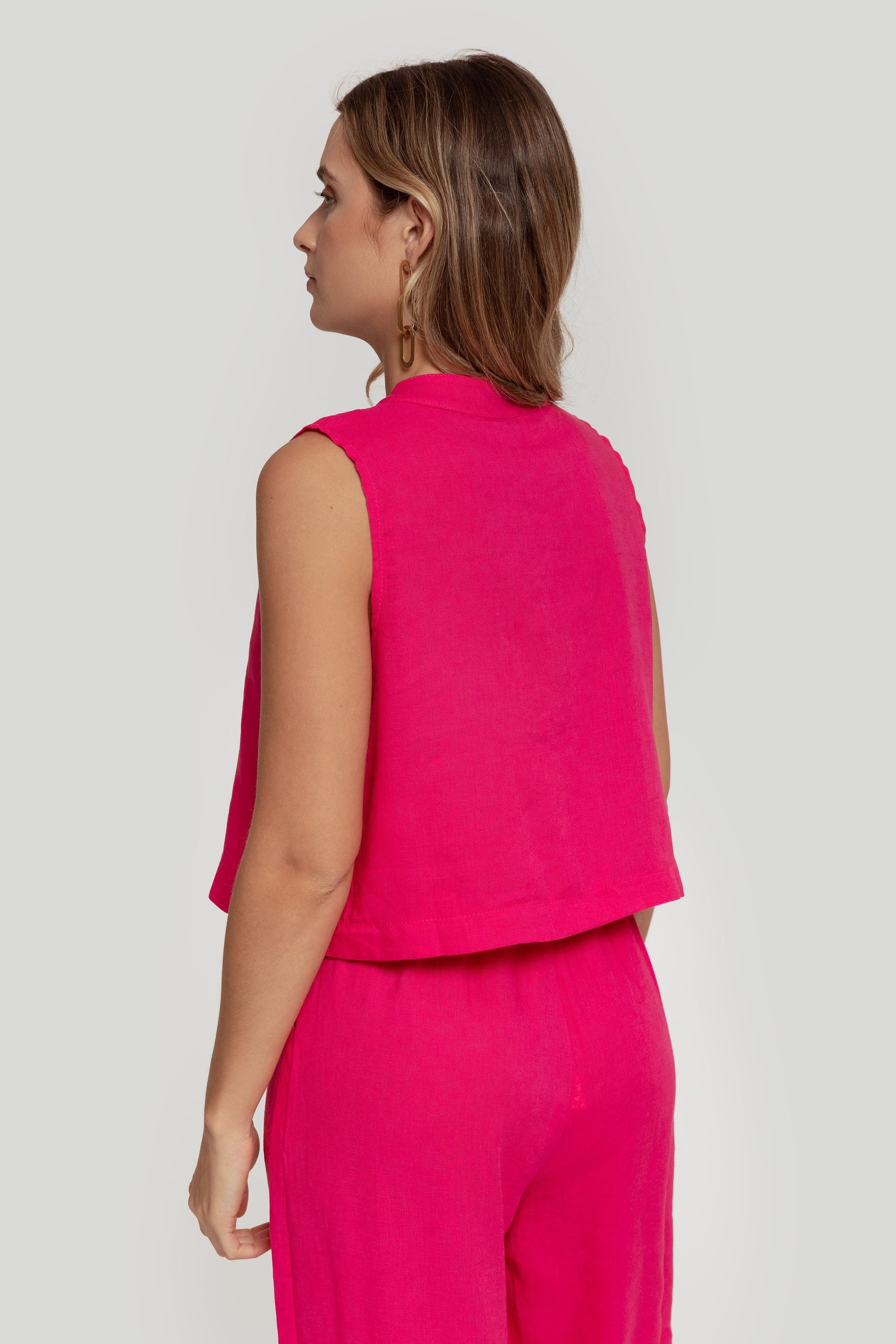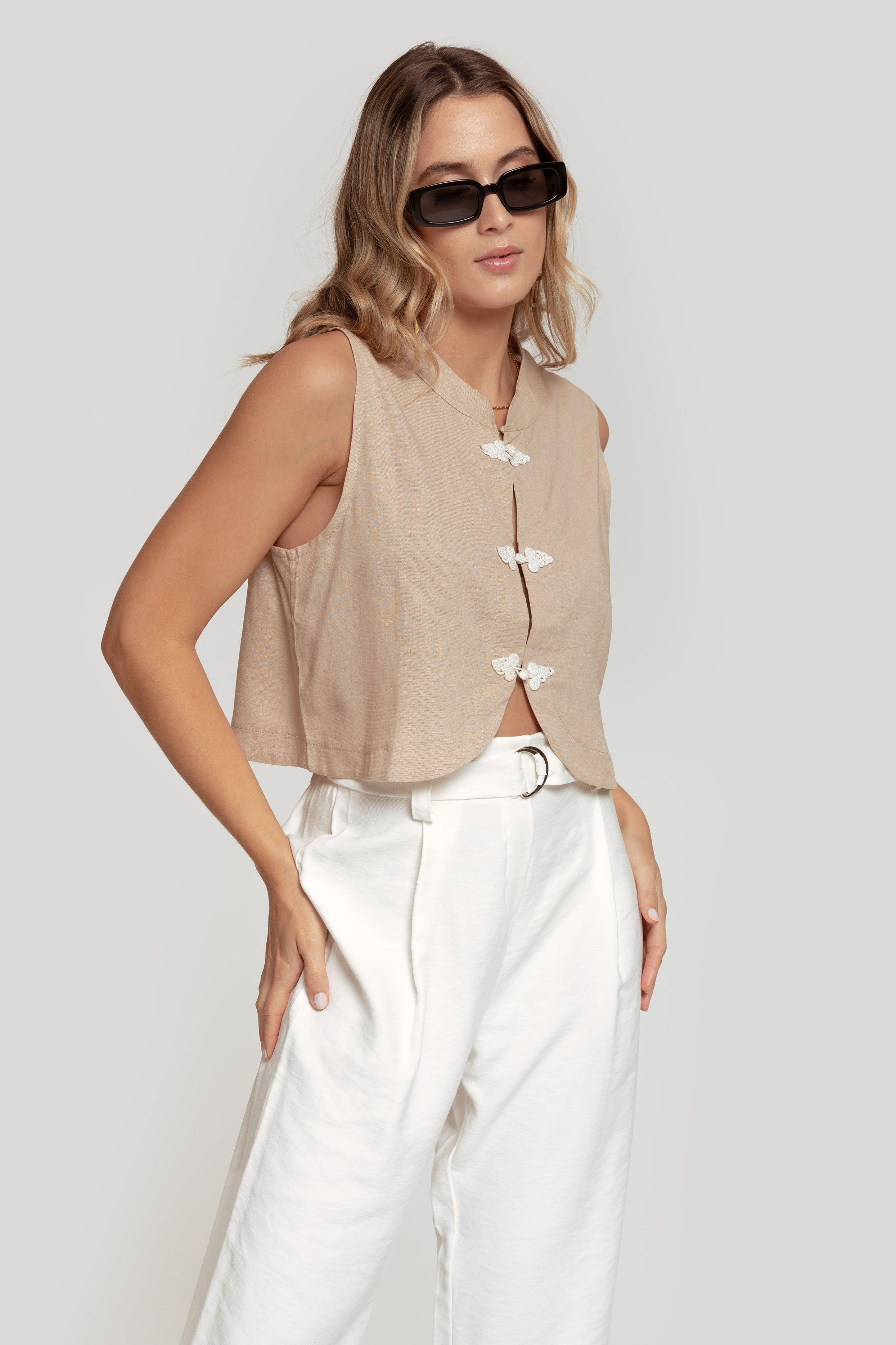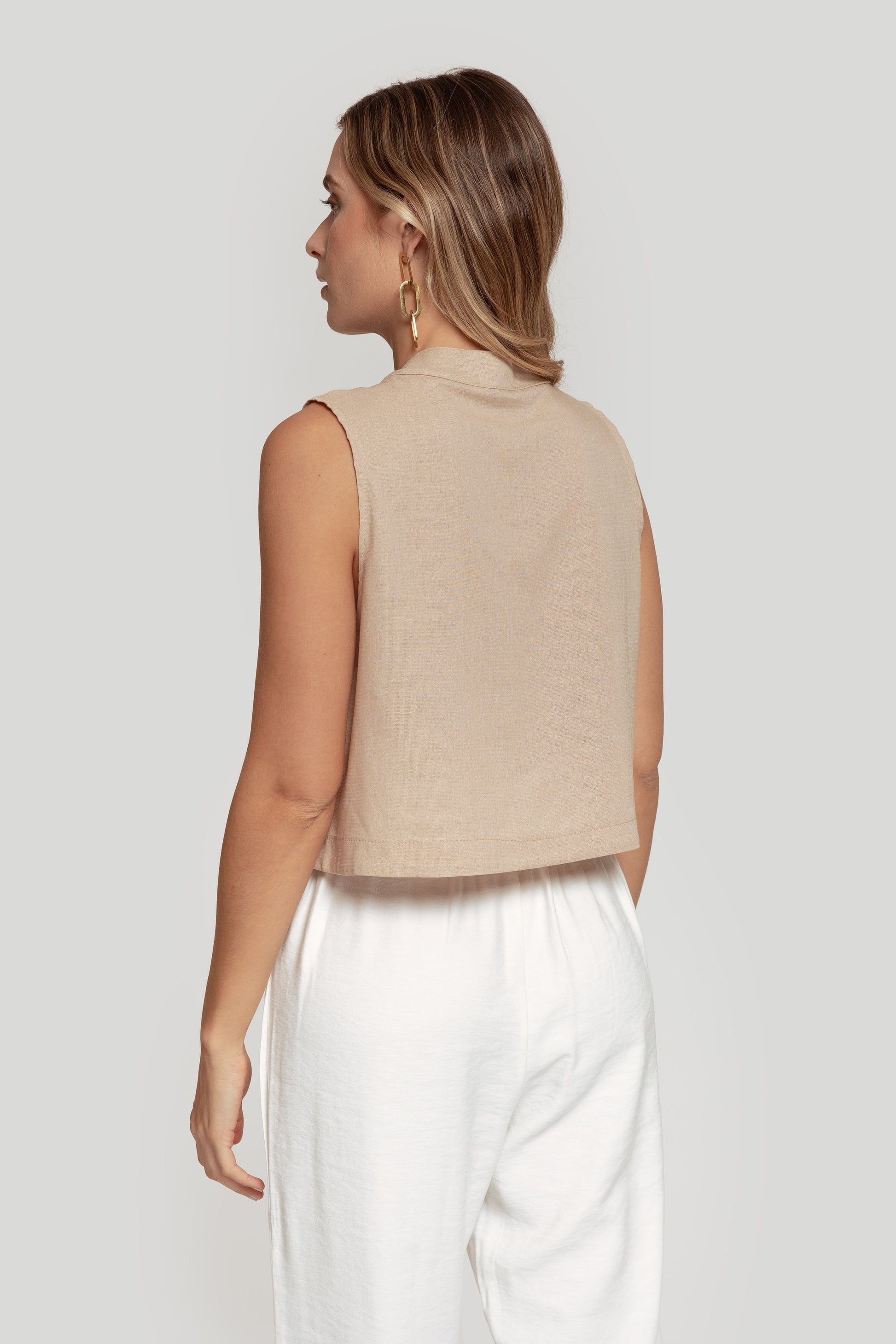 Tejido mezcla lino. Diseño amplio. Diseño recto. Diseño corto. Cuello redondo. Manga sisa. Cierre de lazos con gancho. Talla modelo: S. Altura modelo 1,65 m.