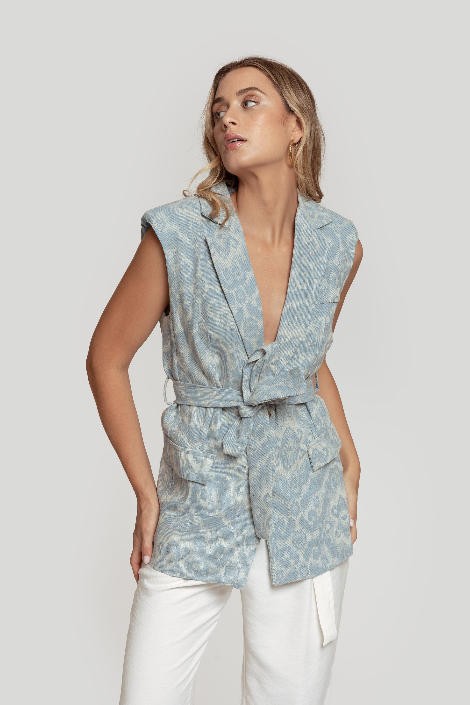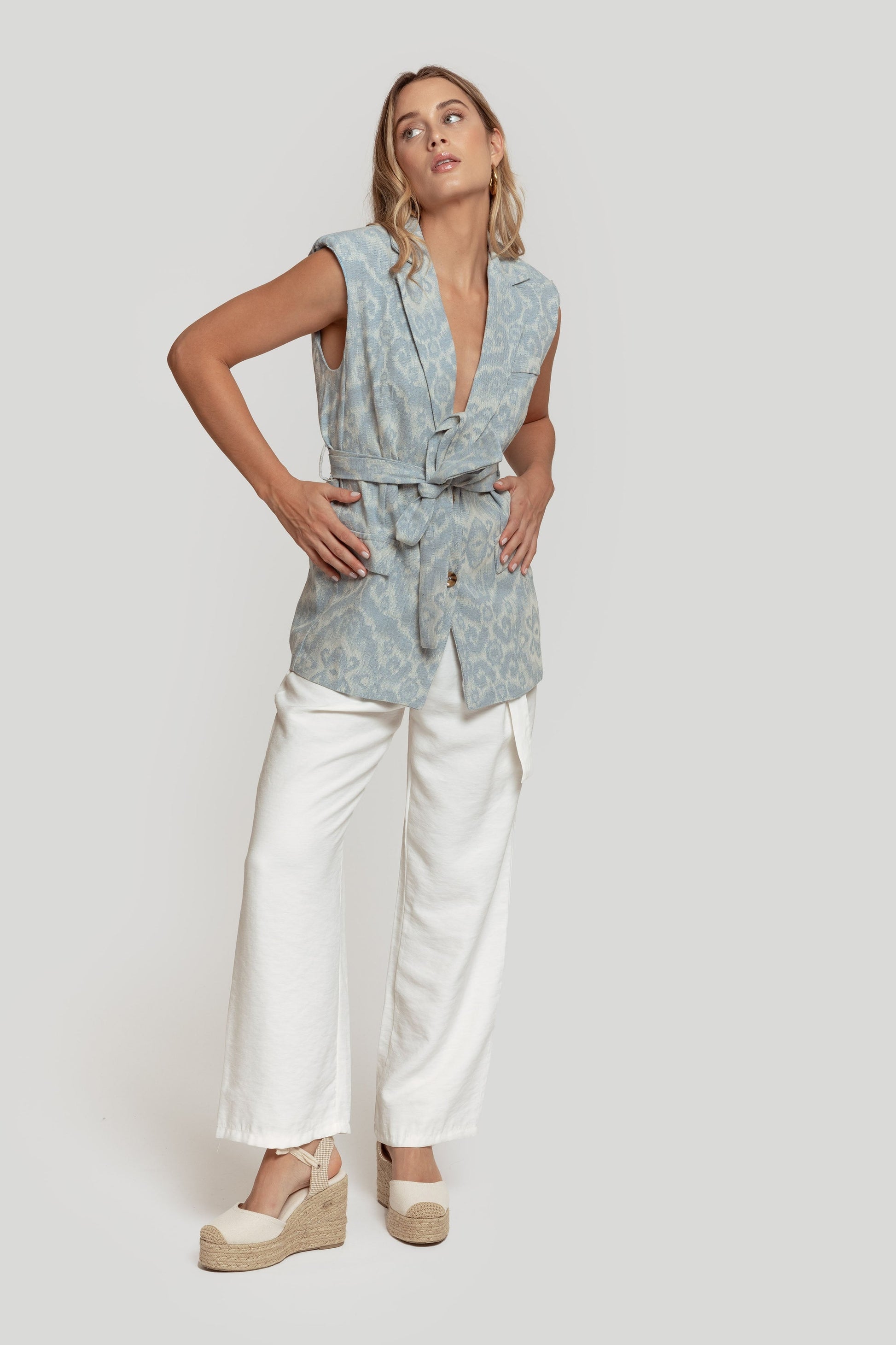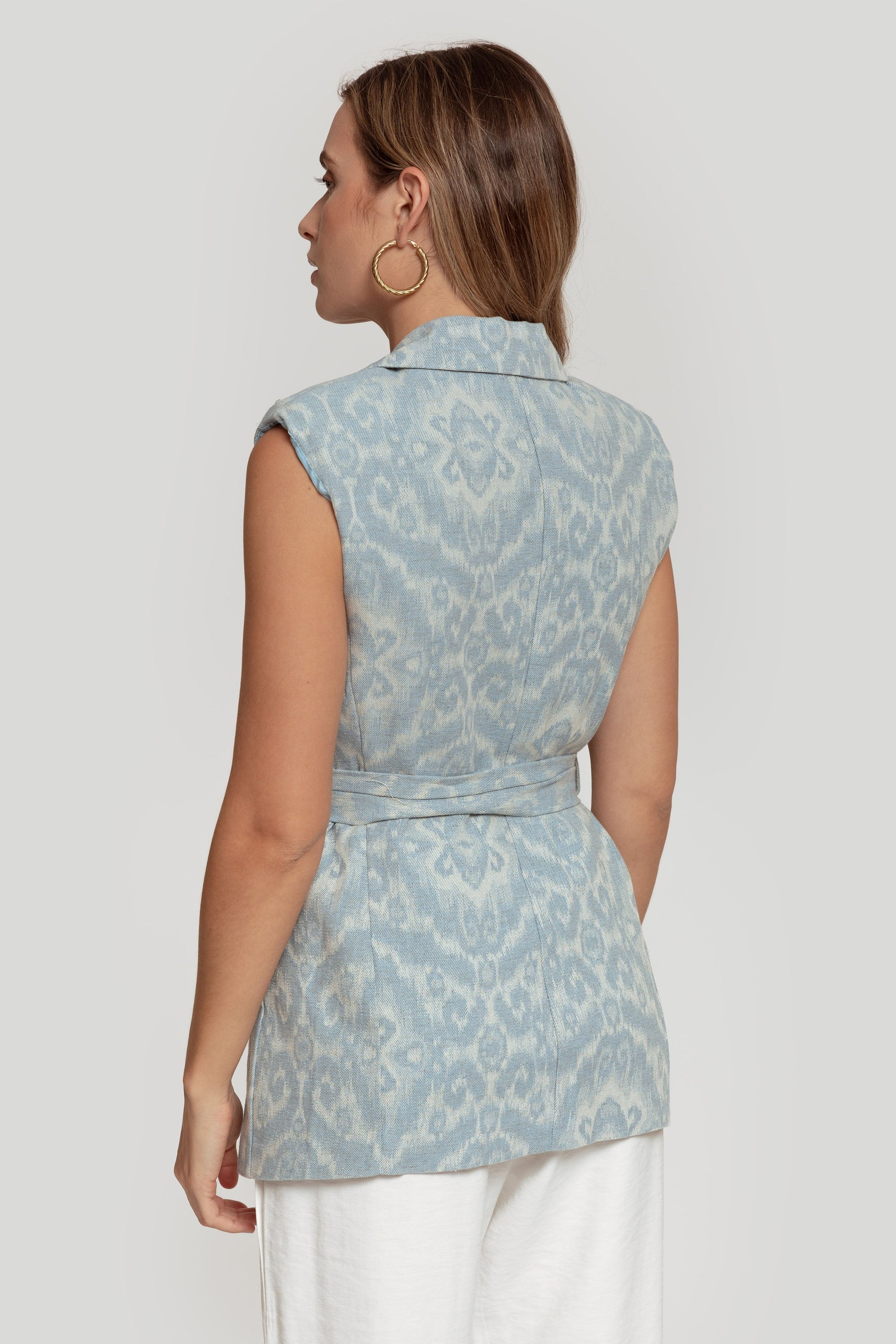 Chaleco estructurado. Tejido mezcla de algodón. Diseño estampado. Diseño recto. Diseño cruzado. Cuello solapa. Sin mangas. Hombreras. Cierre de botones. Solapas decorativas. Forrado. Cinturón a contraste. Talla modelo: S. Altura modelo 1,66 m.