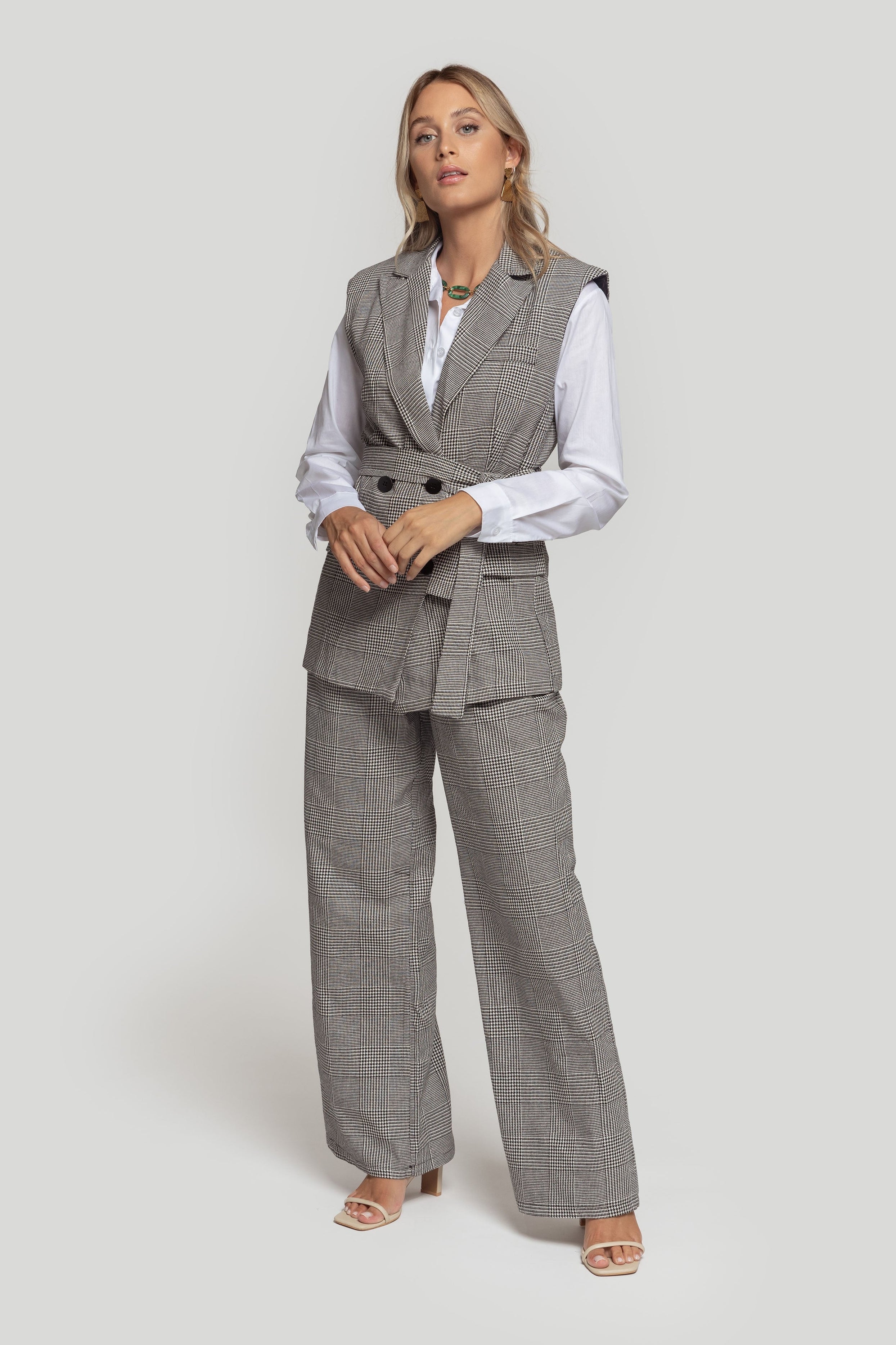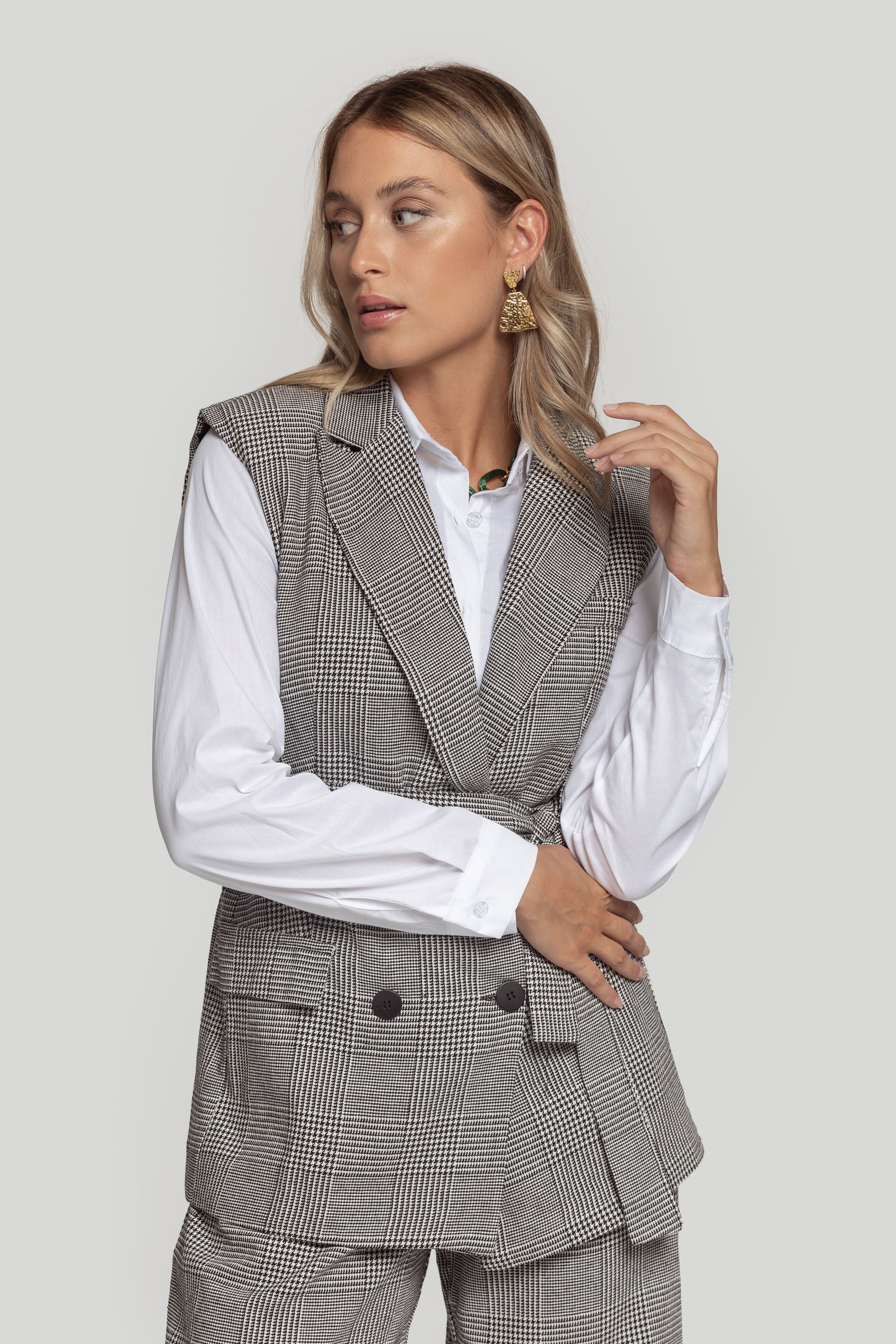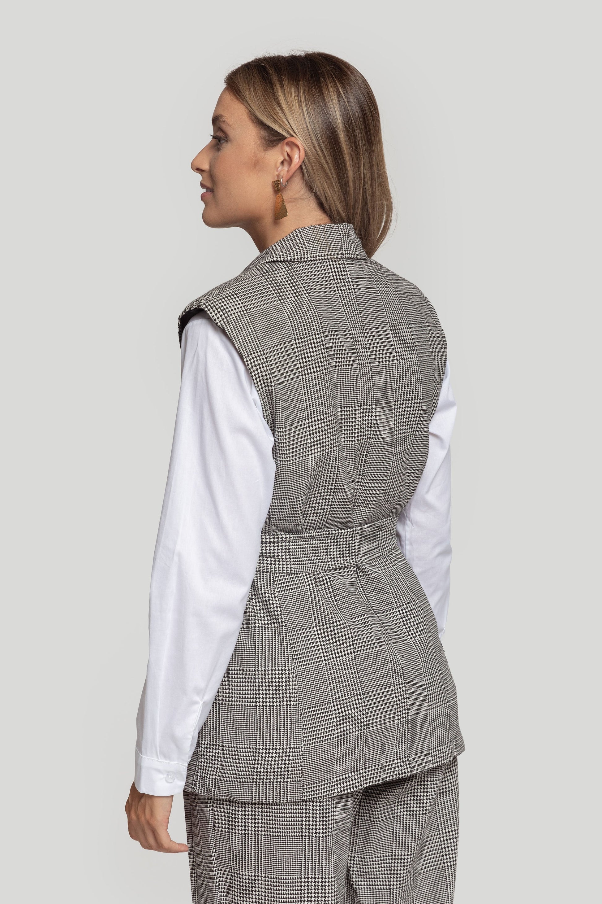 Chaleco de cuello solapa y manga sisa. Cierre frontal cruzado con botones y cinturón a tono. Talla modelo: S. Altura modelo 1,66 m.