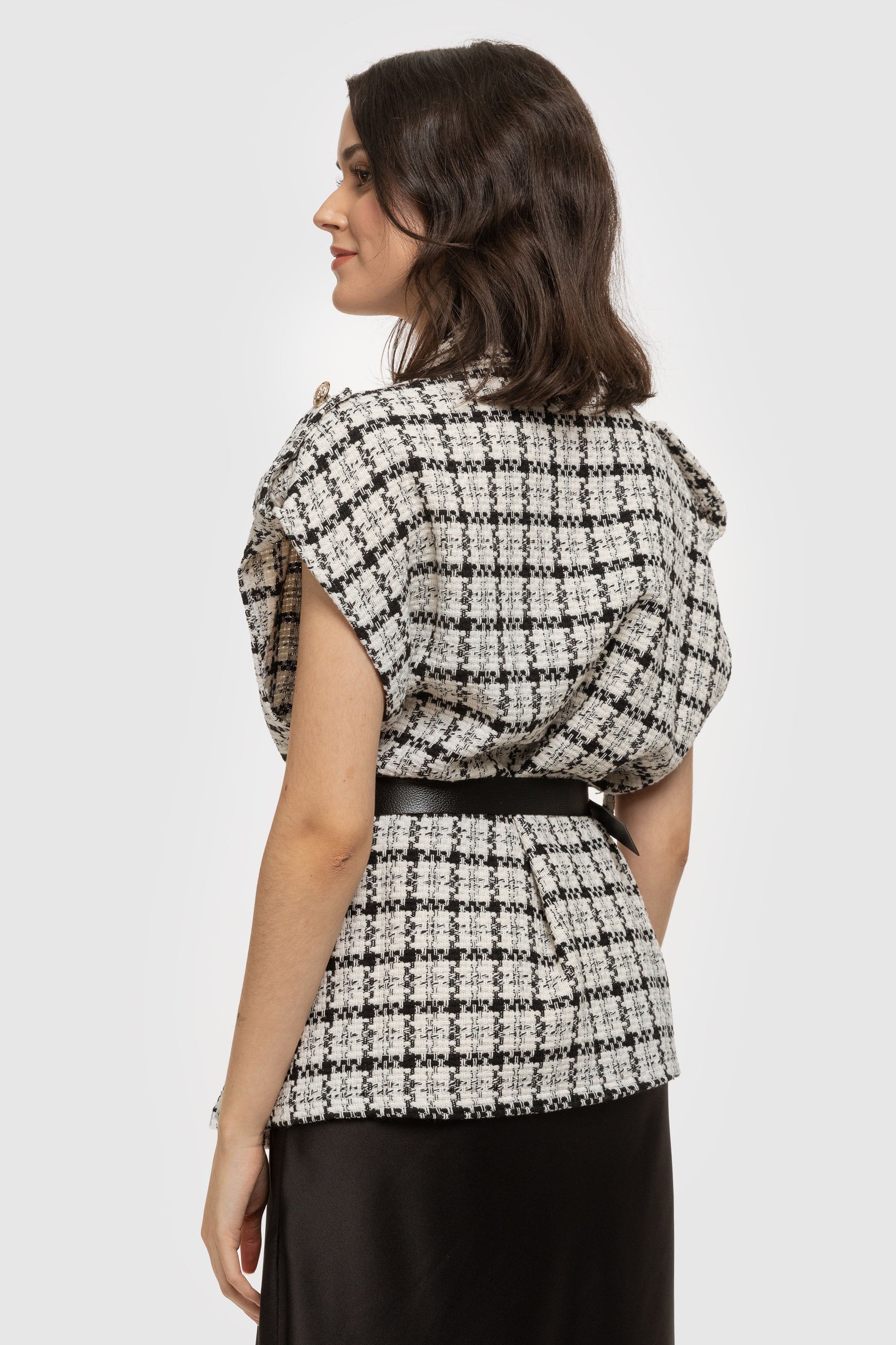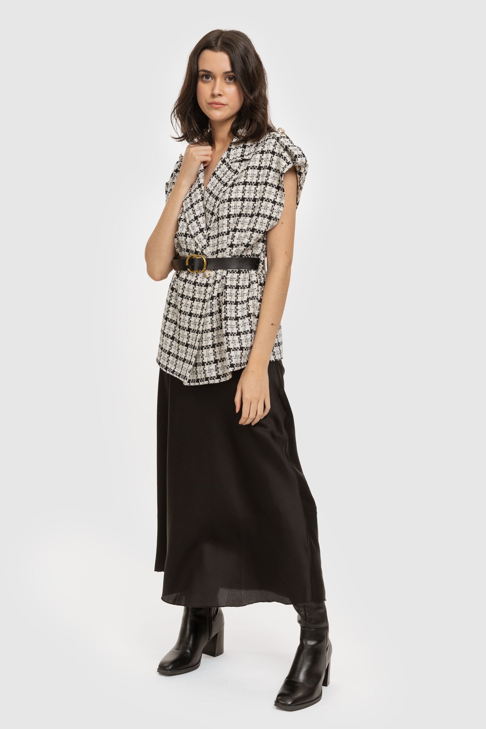 Chaleco estampado. Cuello solapa. Manga sisa. Cinturón combinado. Cierre frontal de botón. Talla modelo: S. Altura modelo: 1,67 m.