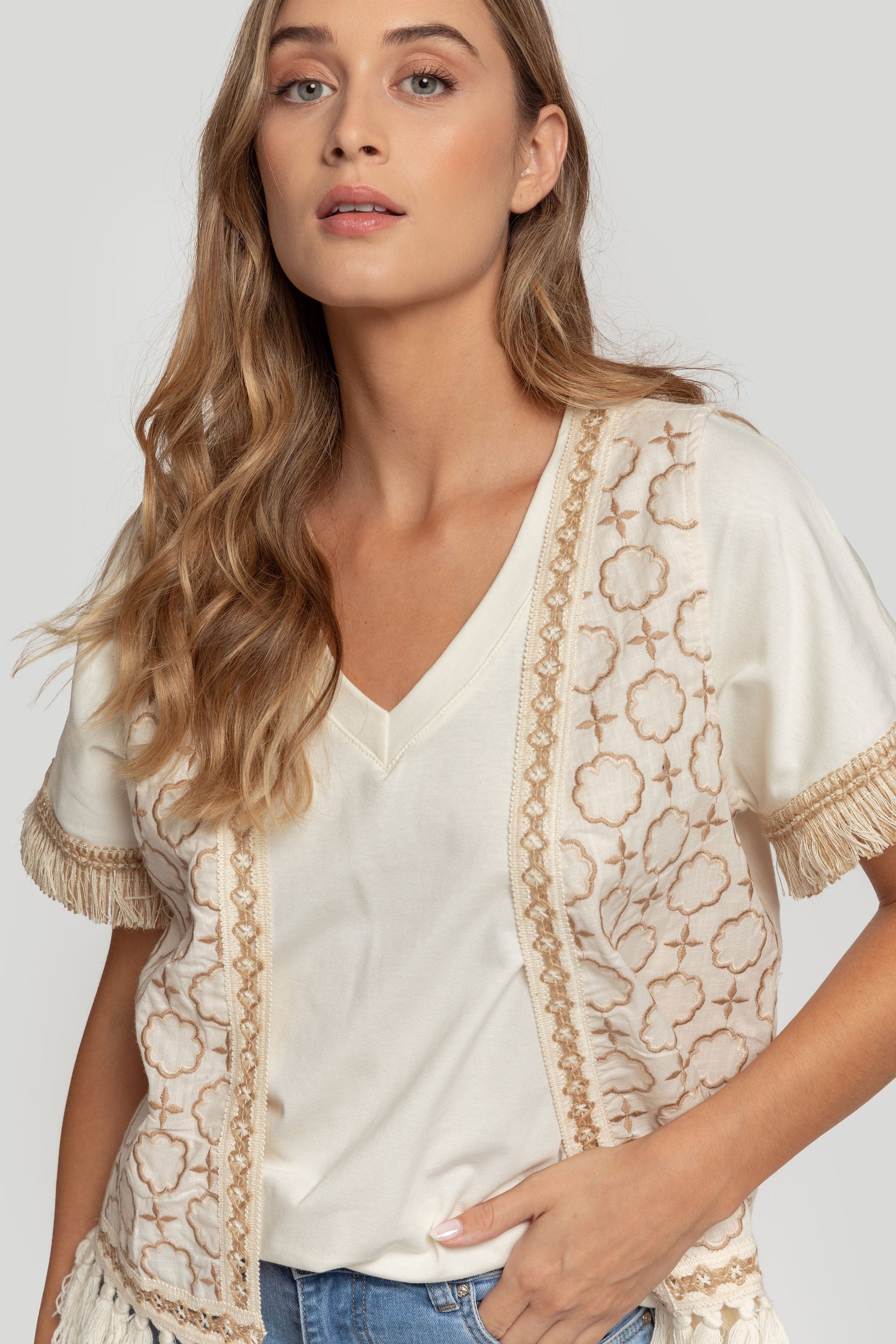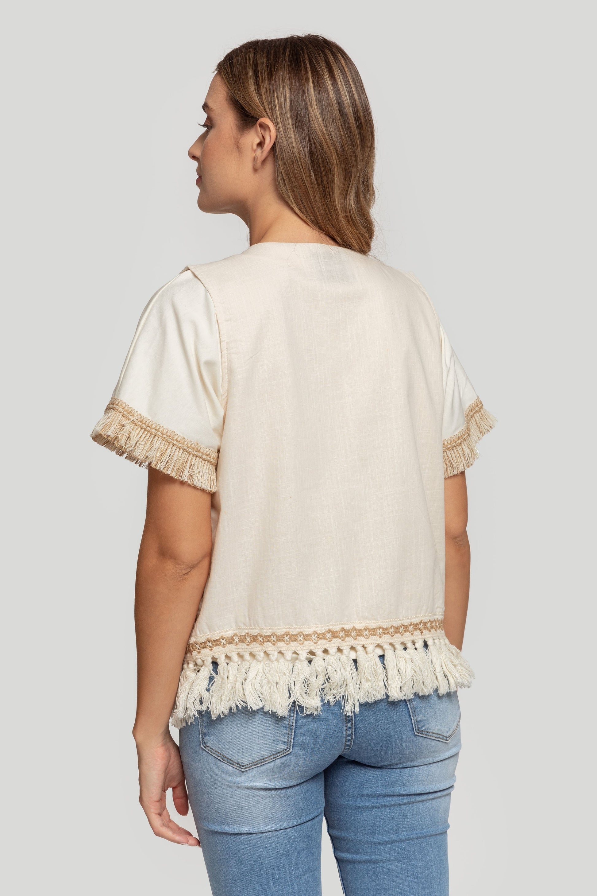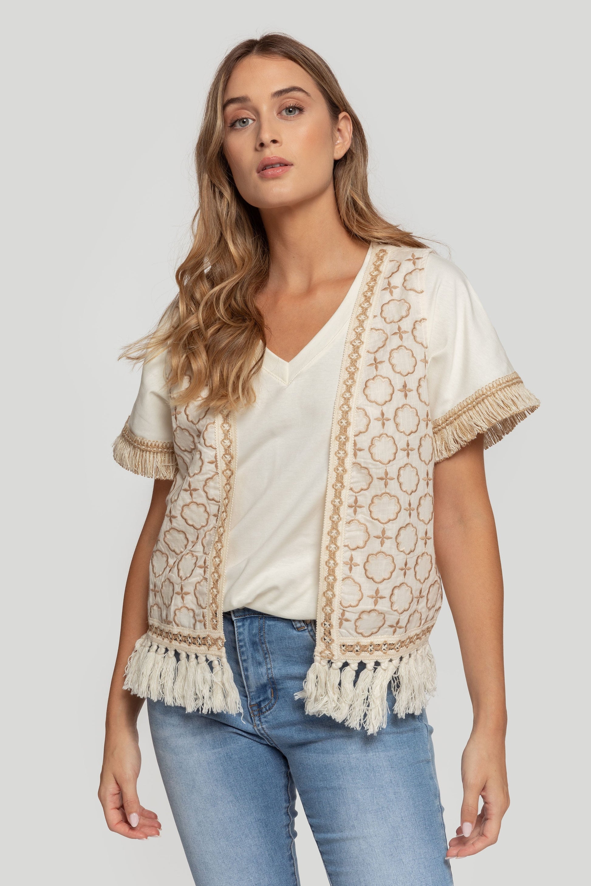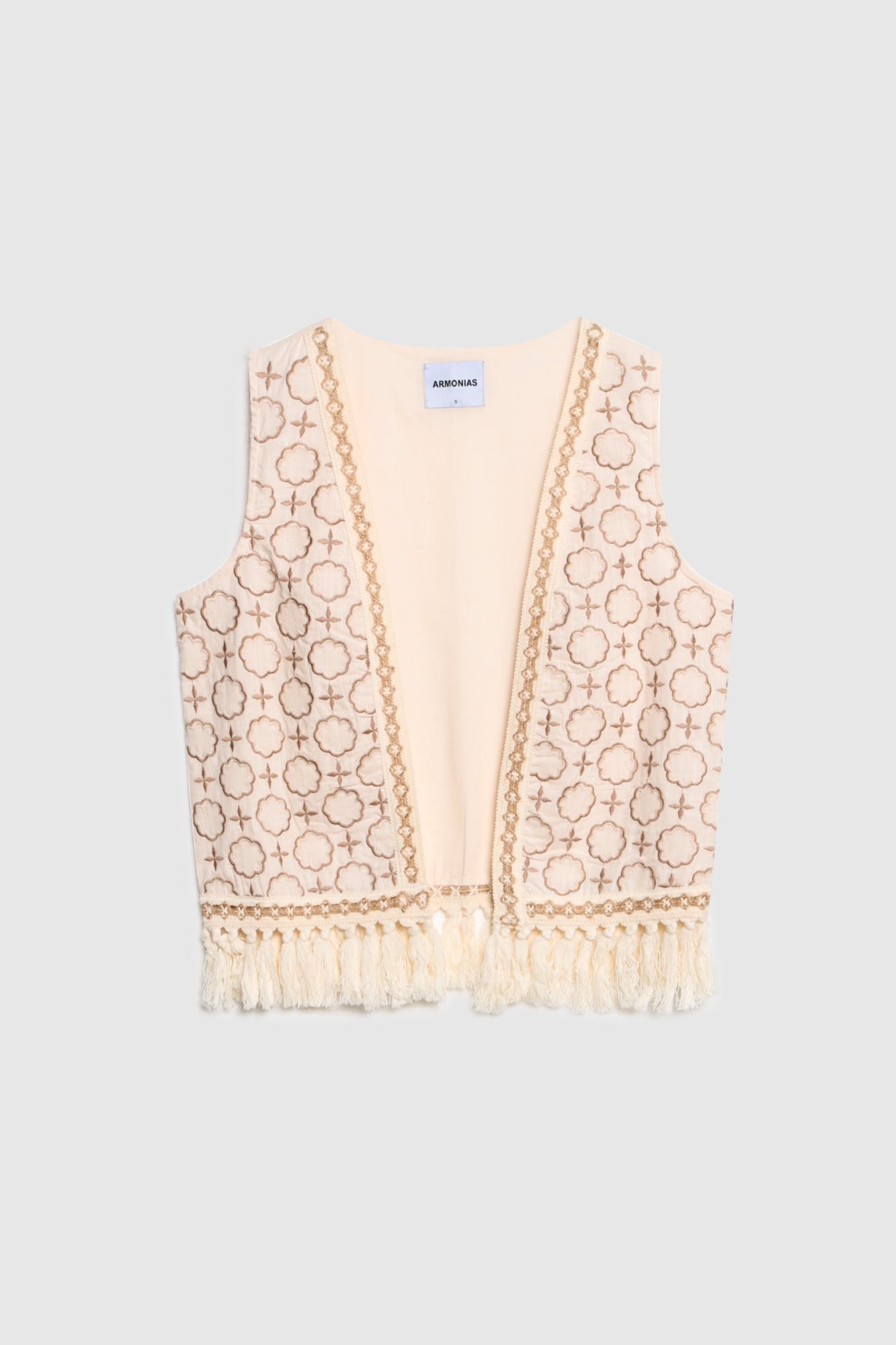 Chaleco de algodón. Diseño bordado. Diseño recto. Diseño corto. Manga sisa. Bajo redondeado. Talla única. Altura modelo: 1,66 m.
