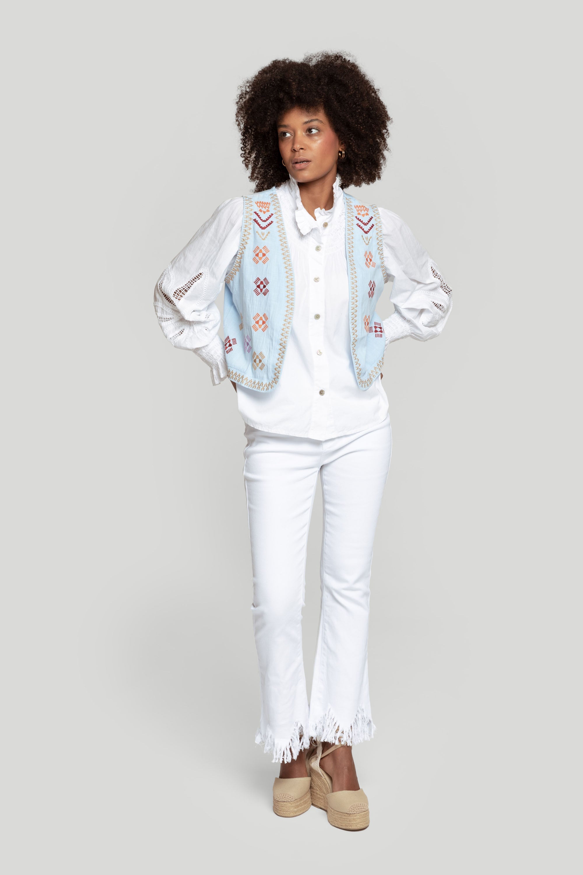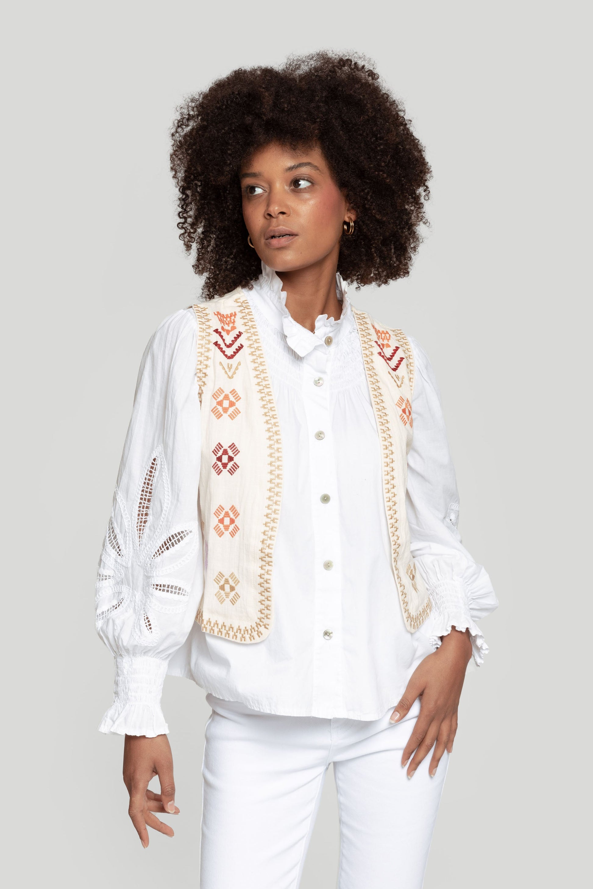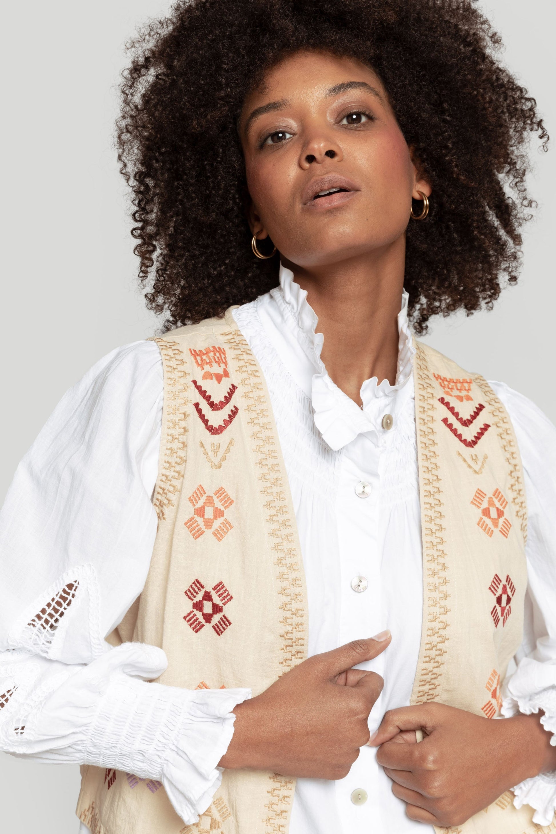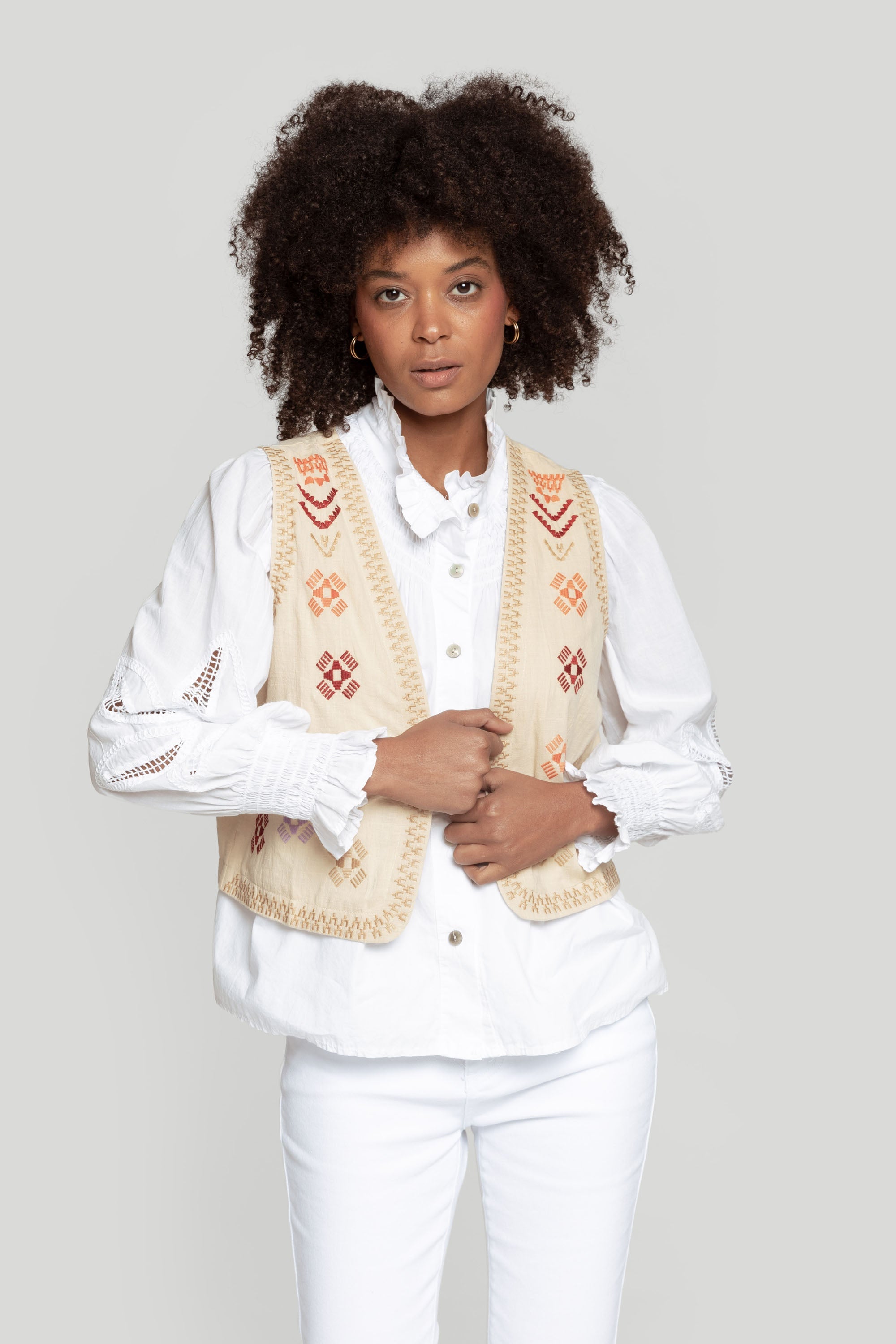 Tejido de algodón. Diseño recto. Manga sisa. Abierto. Detalles bordados. Talla modelo: S. Altura modelo: 1,66 m.