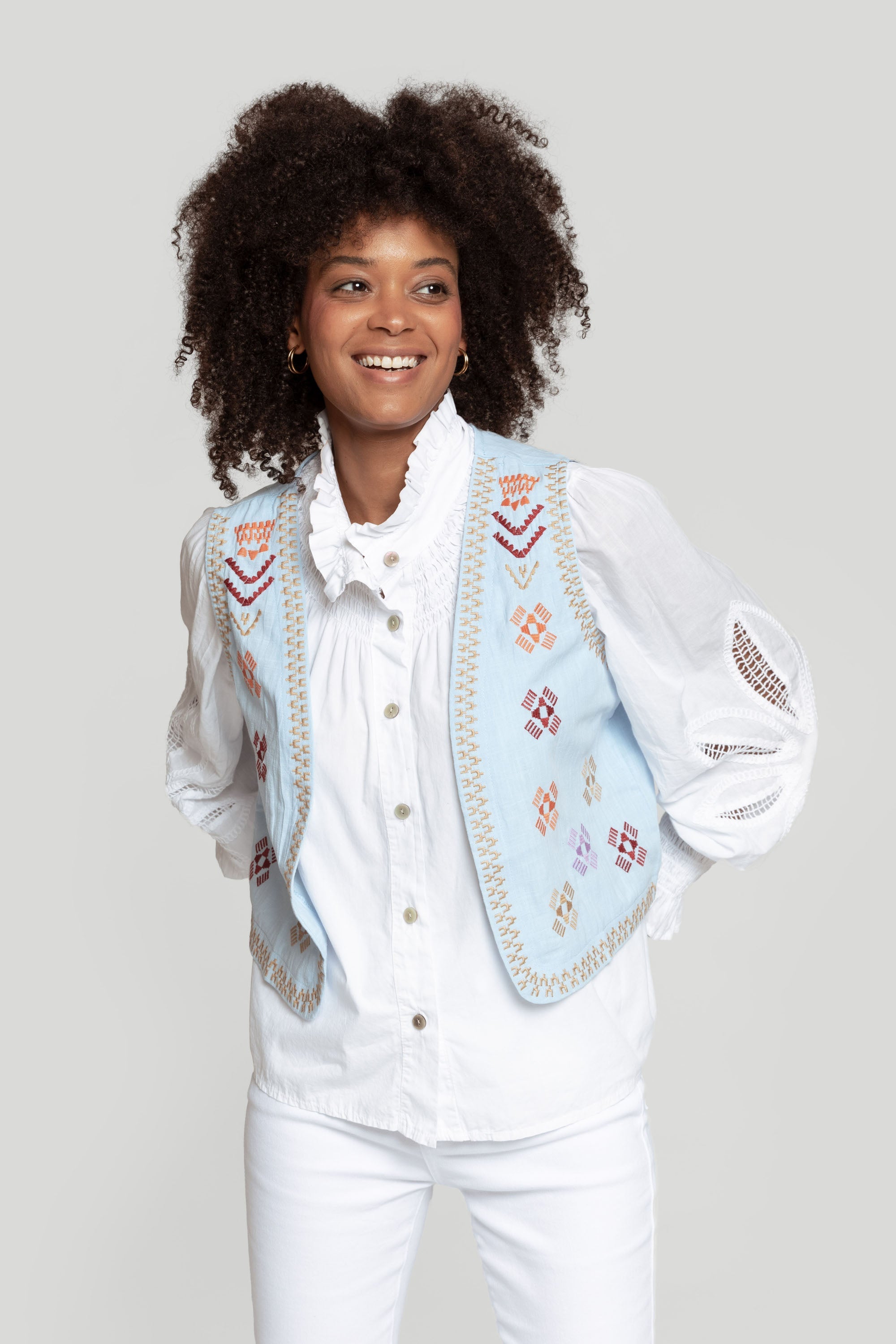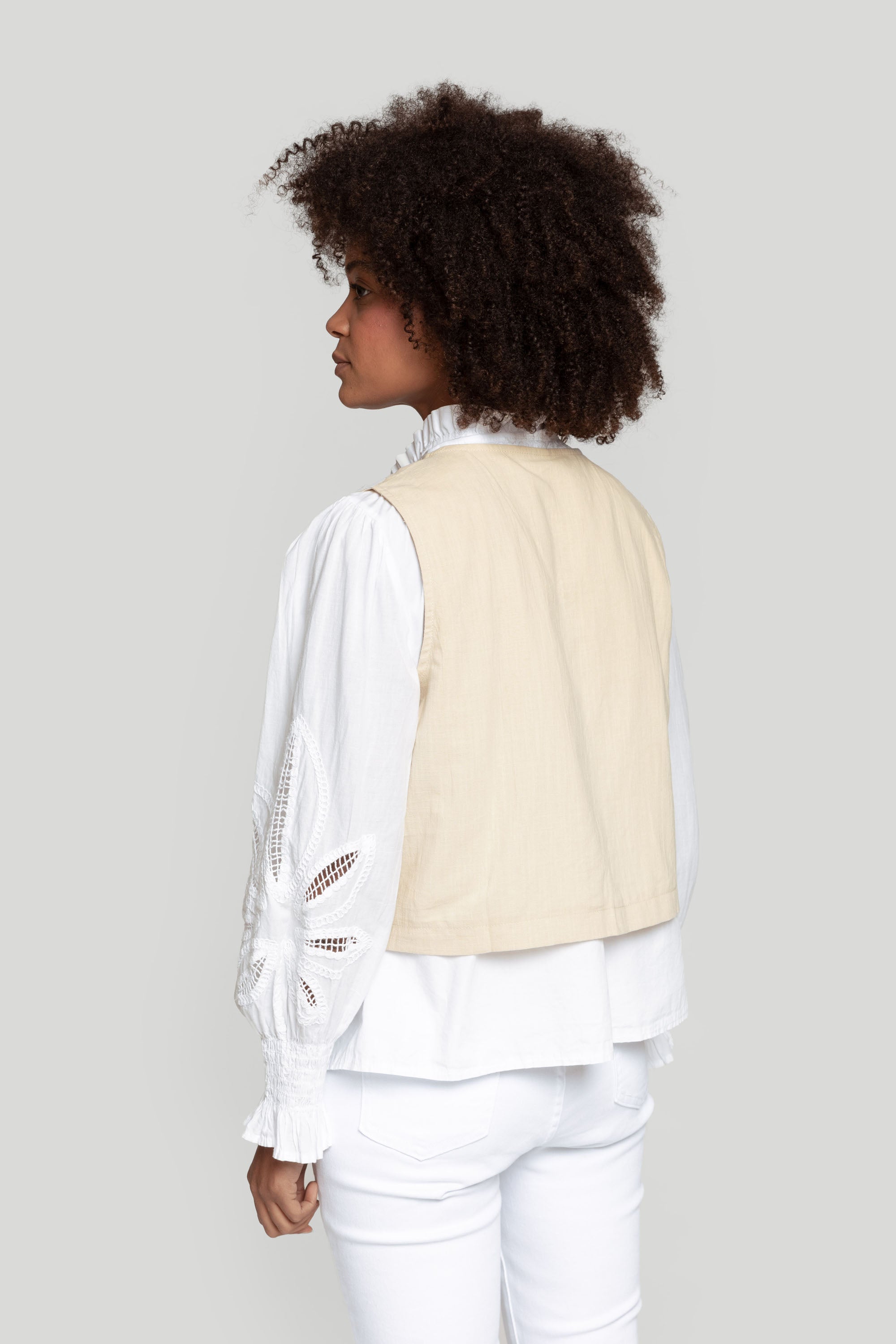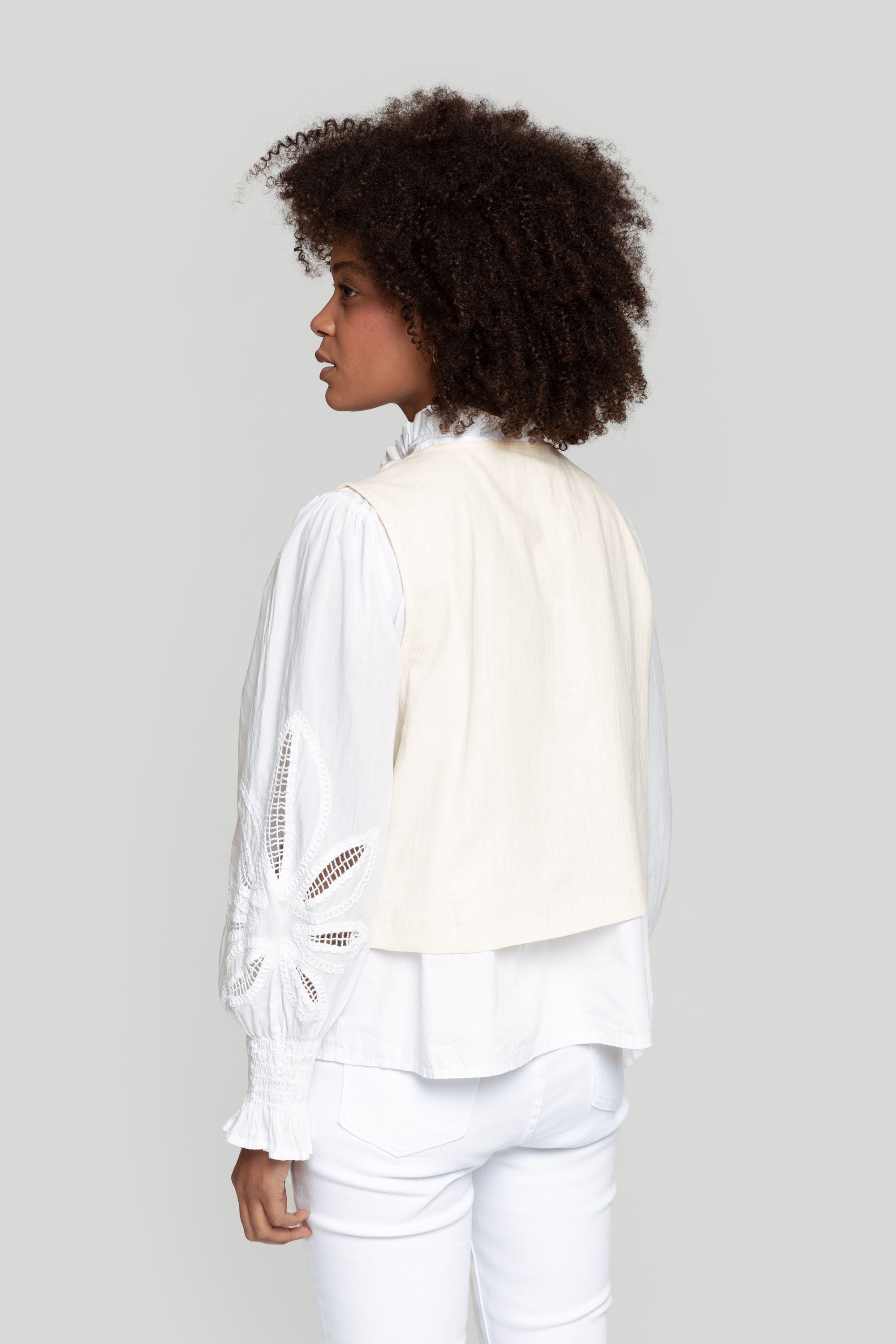 Tejido de algodón. Diseño recto. Manga sisa. Abierto. Detalles bordados. Talla modelo: S. Altura modelo: 1,66 m.