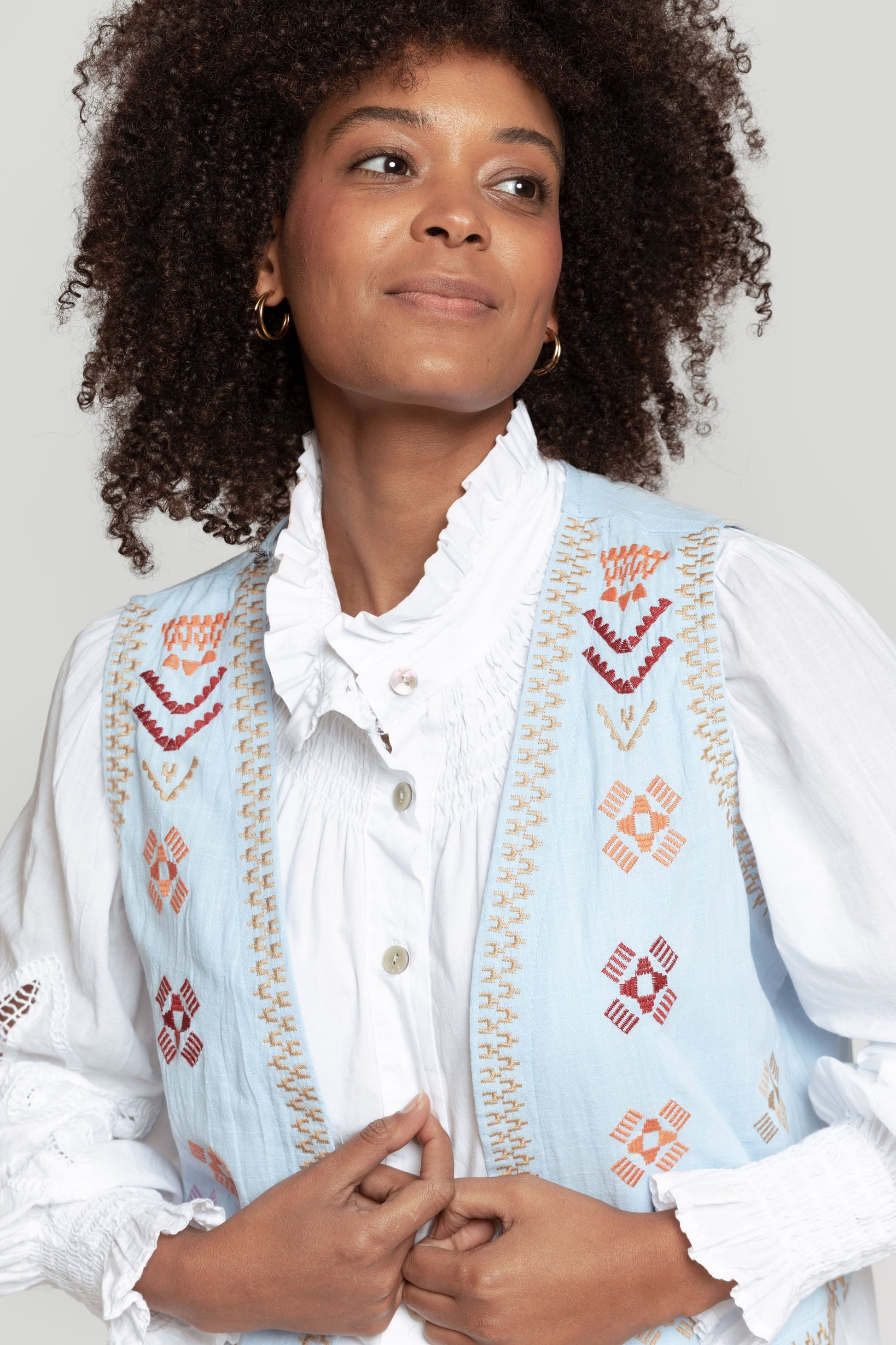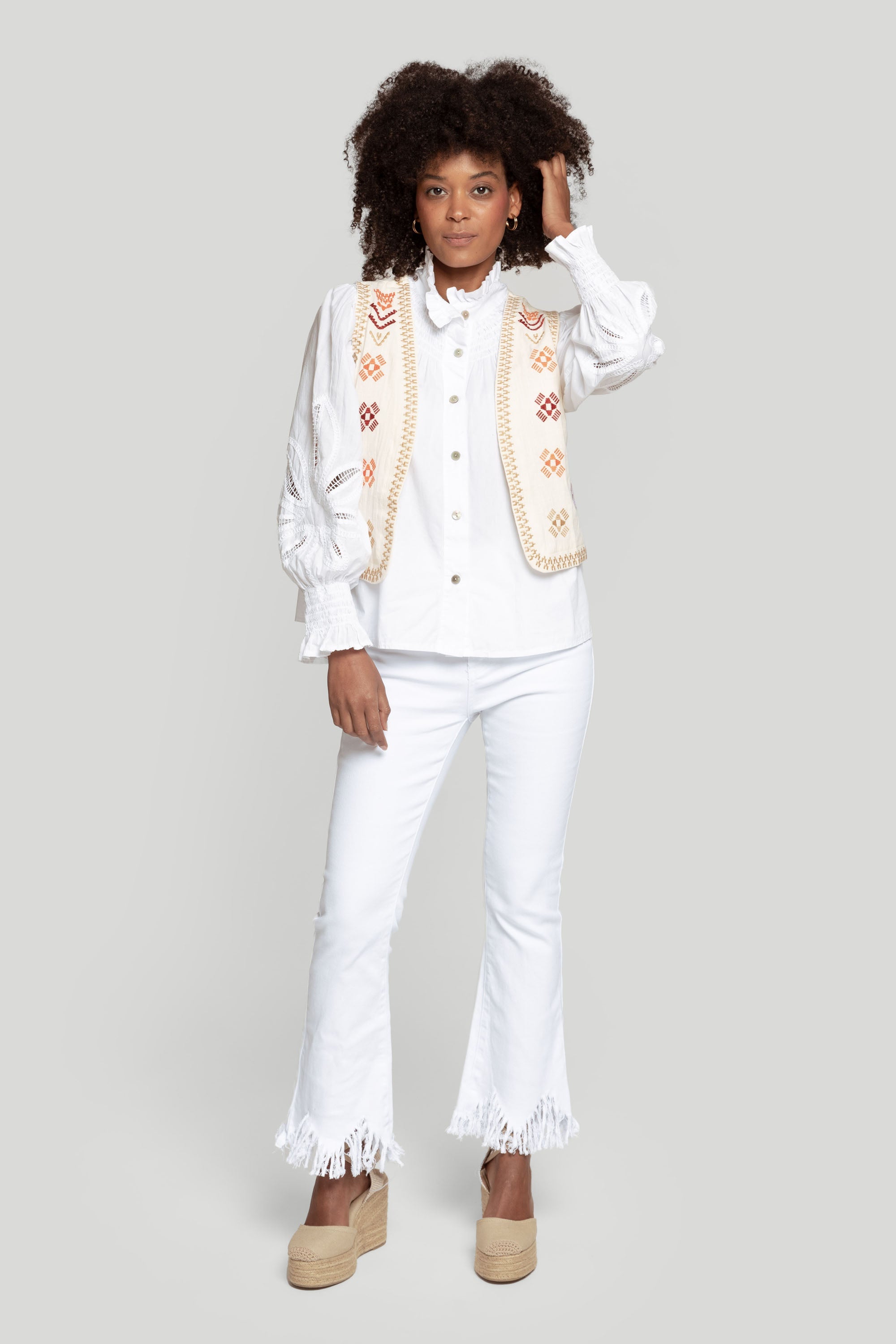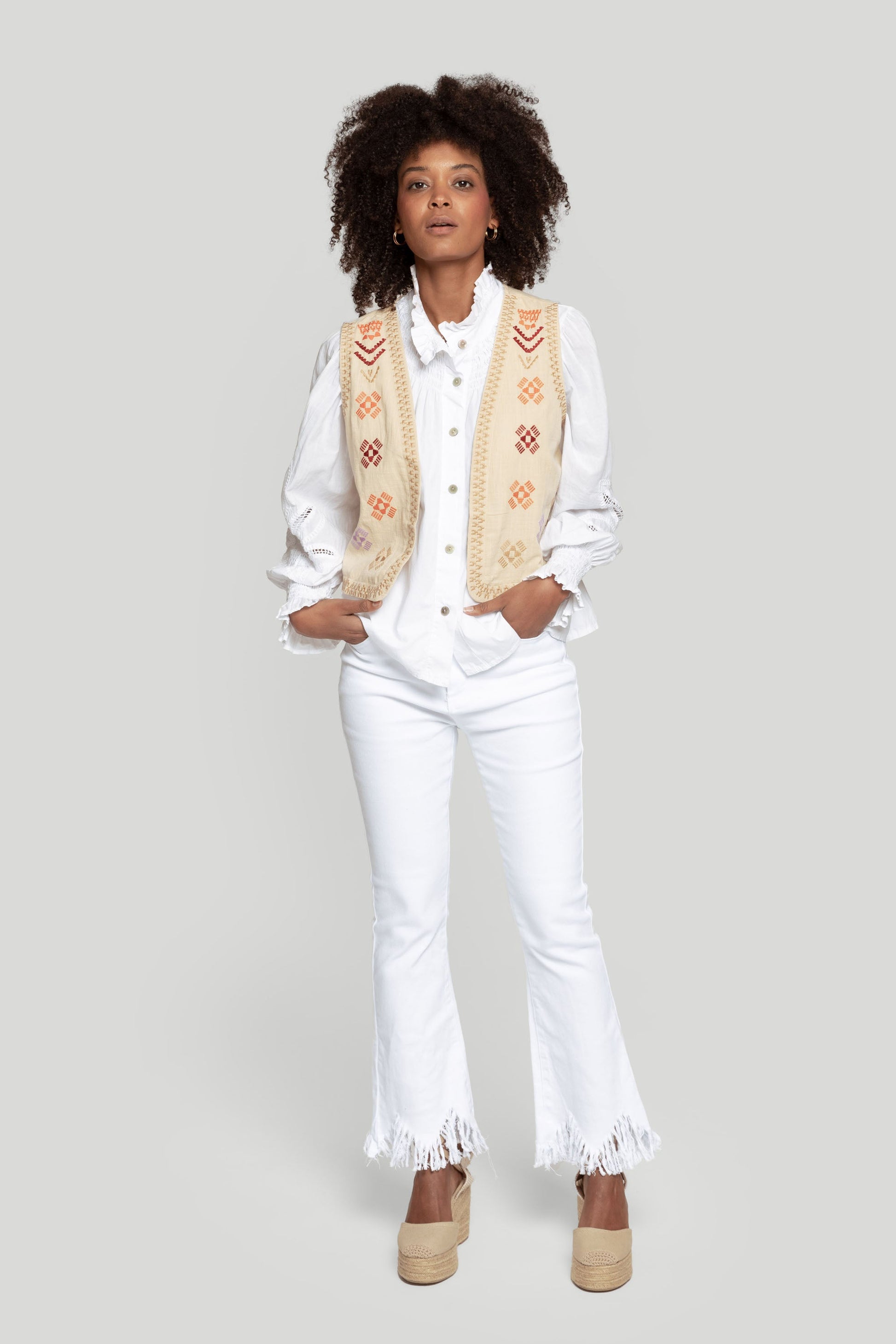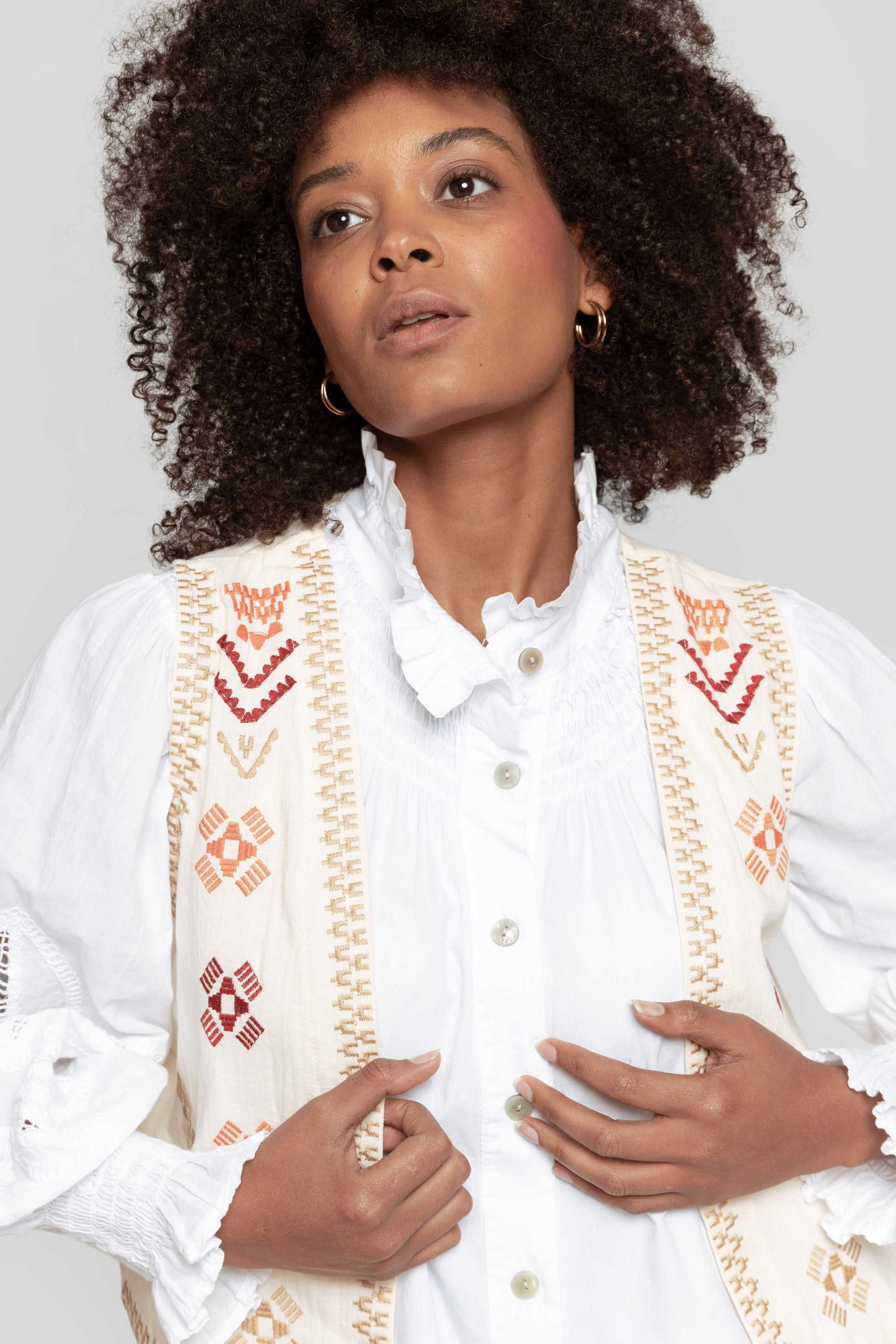 Tejido de algodón. Diseño recto. Manga sisa. Abierto. Detalles bordados. Talla modelo: S. Altura modelo: 1,66 m.