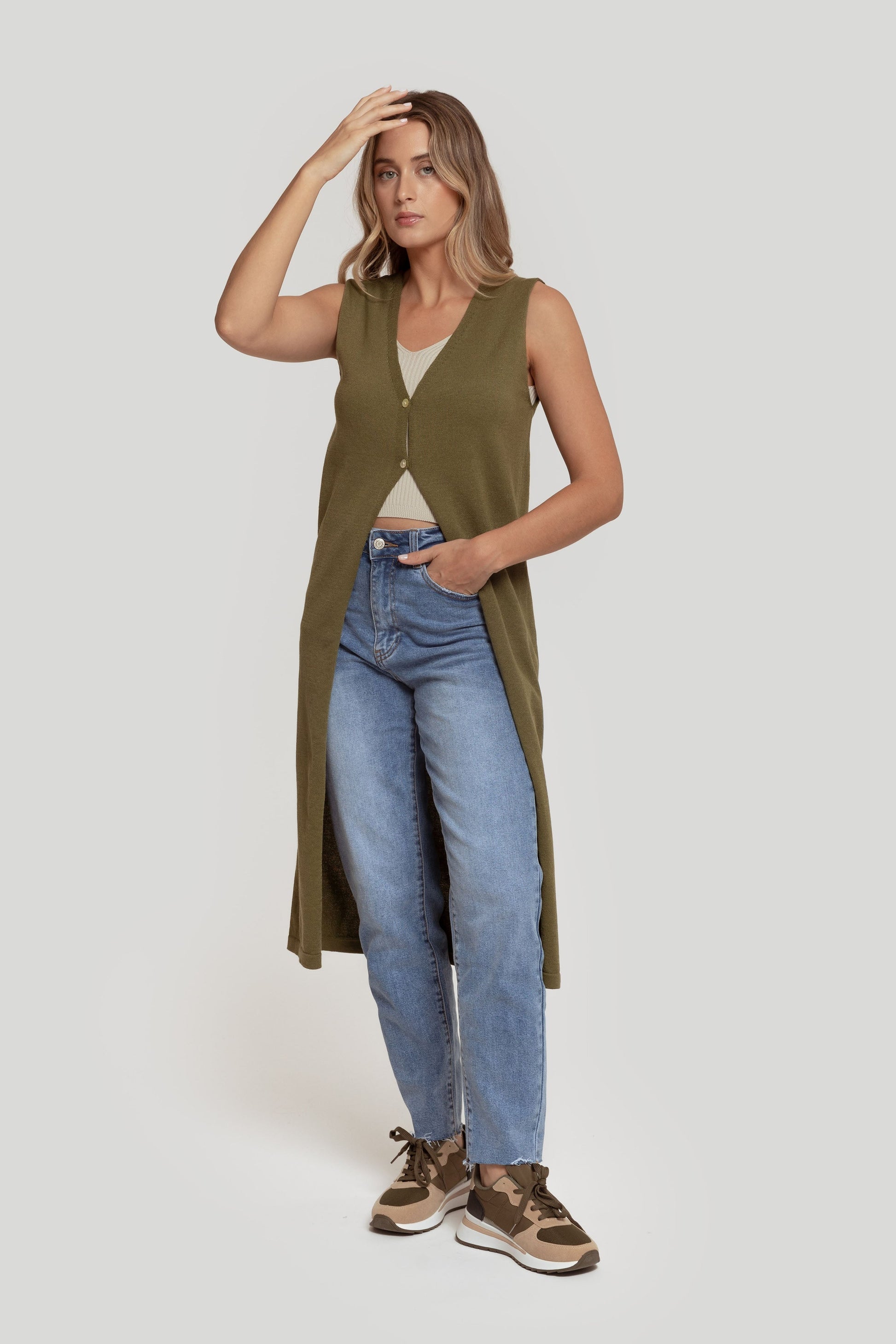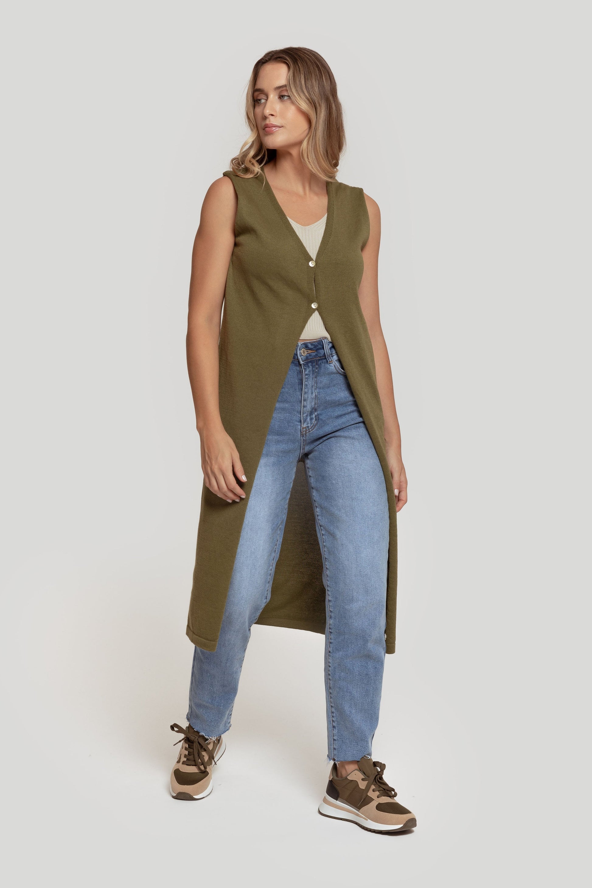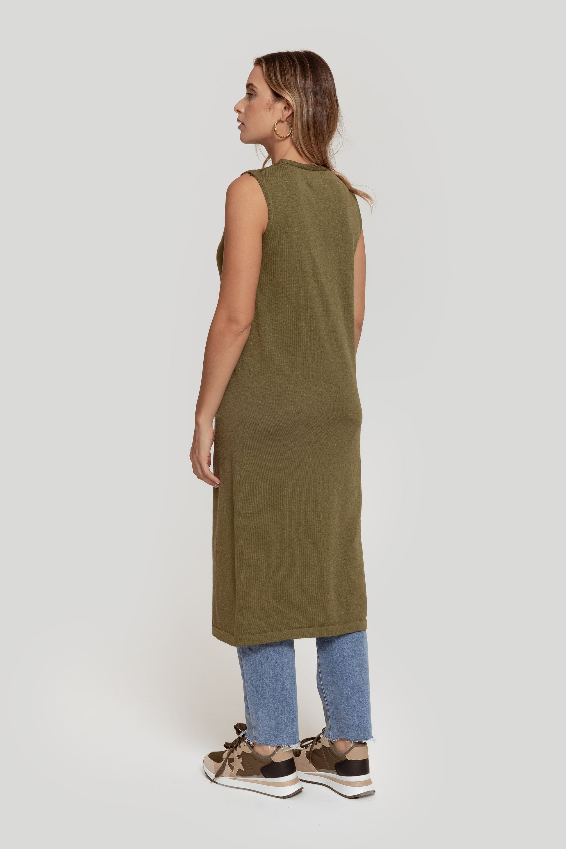 Tejido de punto fino. Diseño midi. Diseño largo. Diseño recto. Cuello pico. Manga sisa. Cierre de botones. Frontal con abertura. Talla modelo: S. Altura modelo 1,67 m.