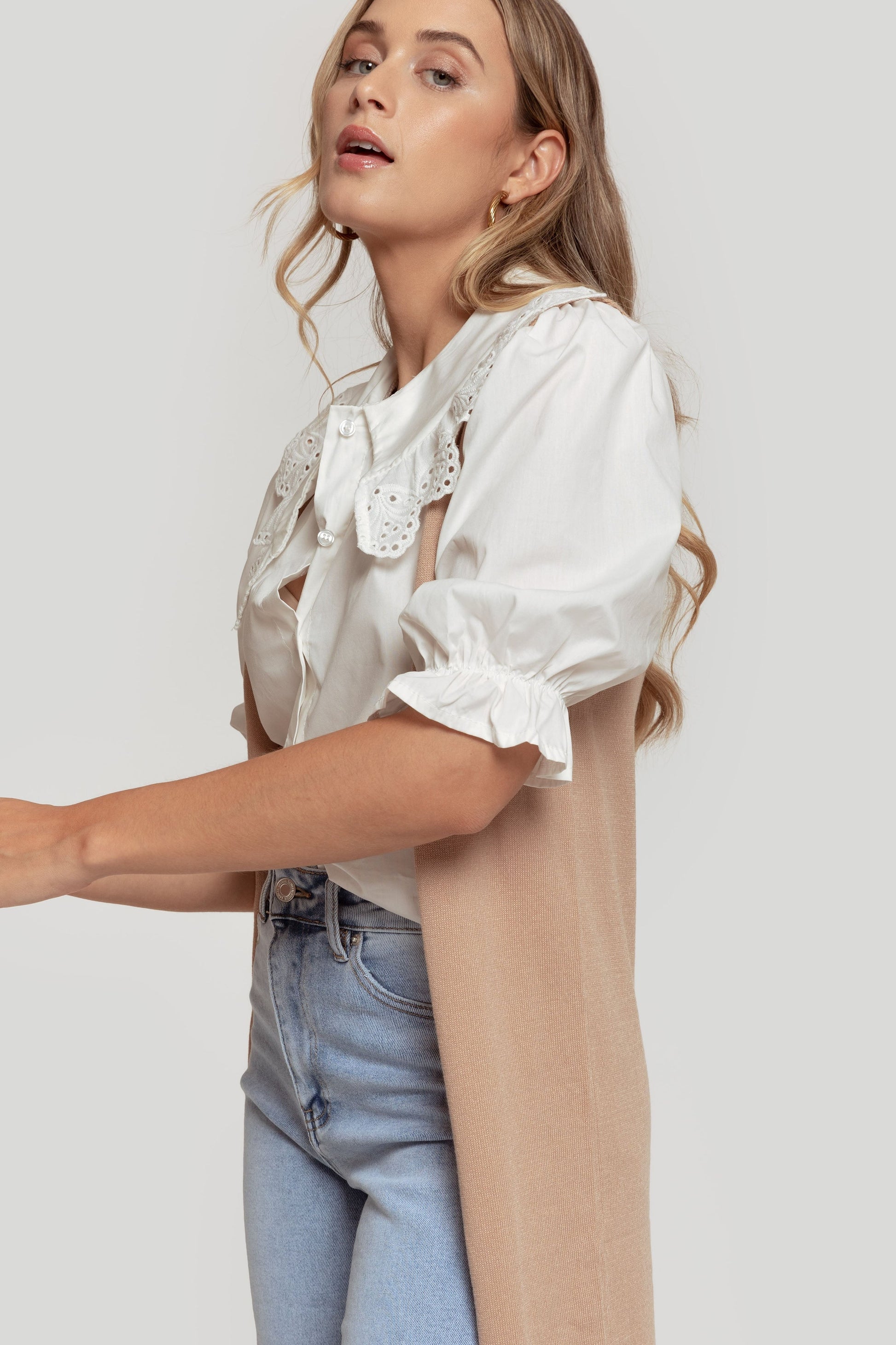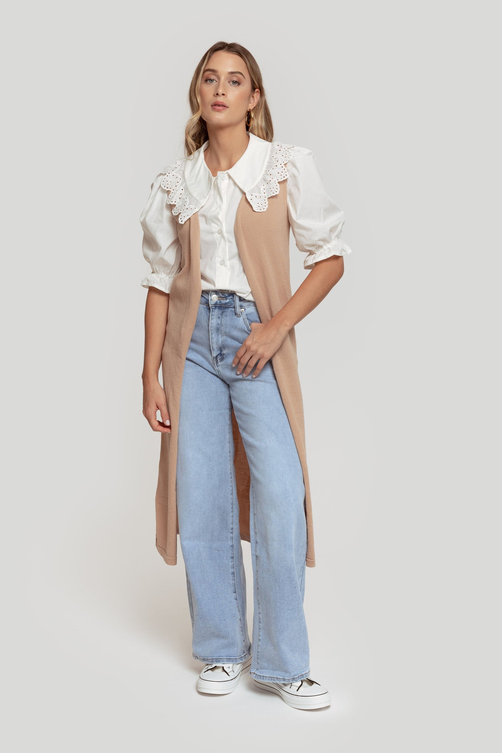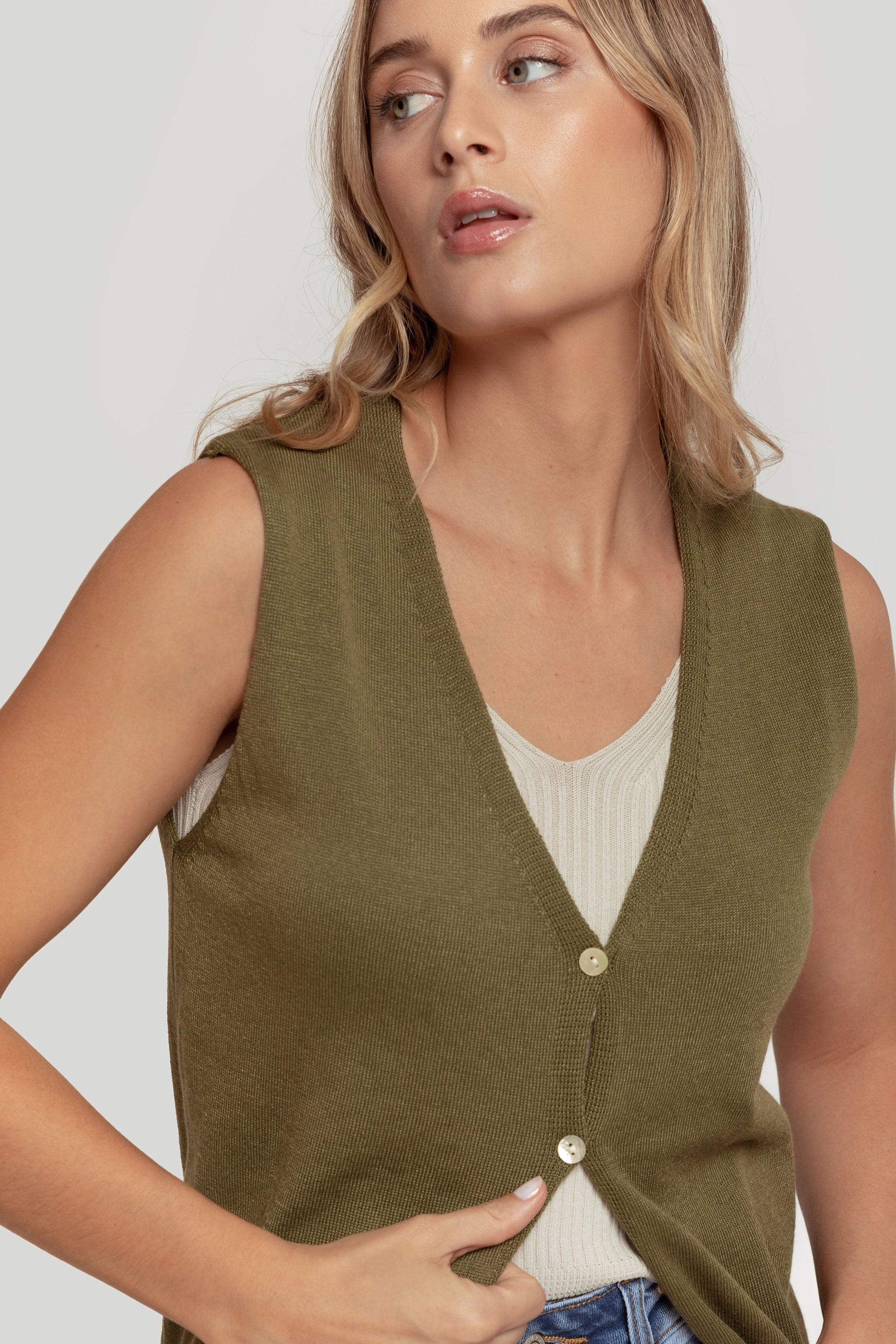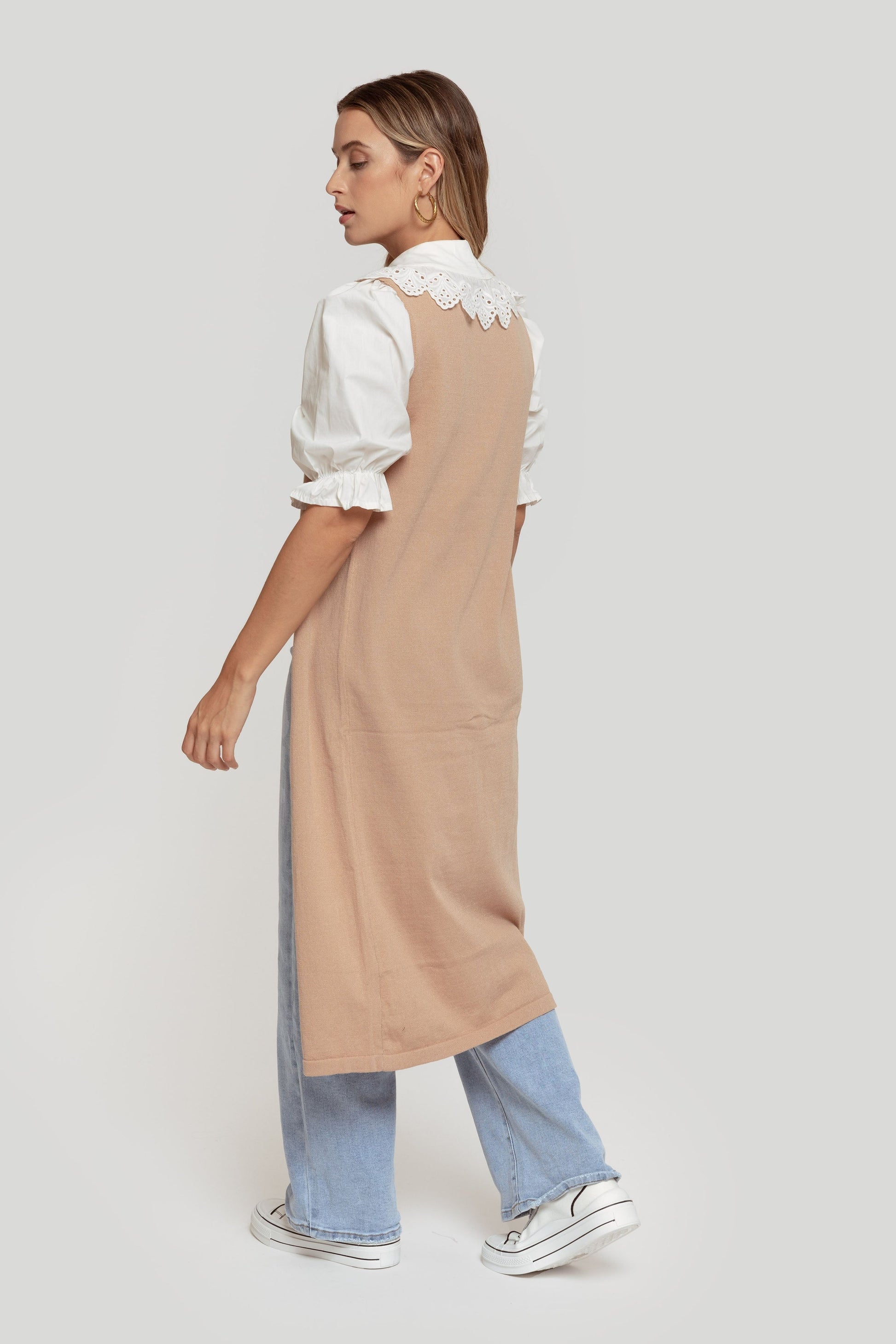 Tejido de punto fino. Diseño midi. Diseño largo. Diseño recto. Cuello pico. Manga sisa. Cierre de botones. Frontal con abertura. Talla modelo: S. Altura modelo 1,67 m.