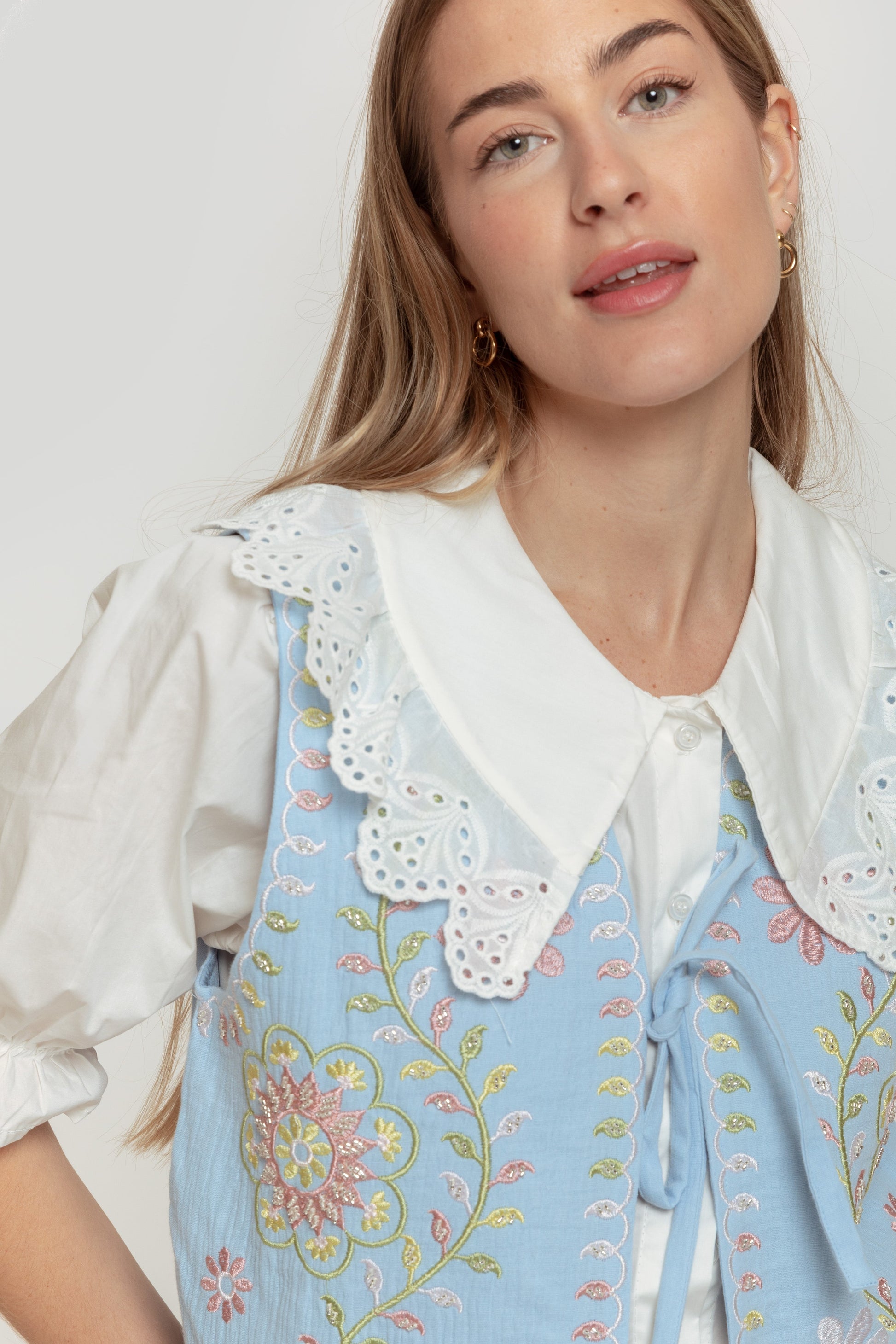 Tejido de algodón. Tejido ligero. Diseño estampado. Detalles abalorios. Diseño corto. Diseño recto. Manga sisa. Cierre de tira. Forrado. Talla única. Altura modelo: 1,70 m.