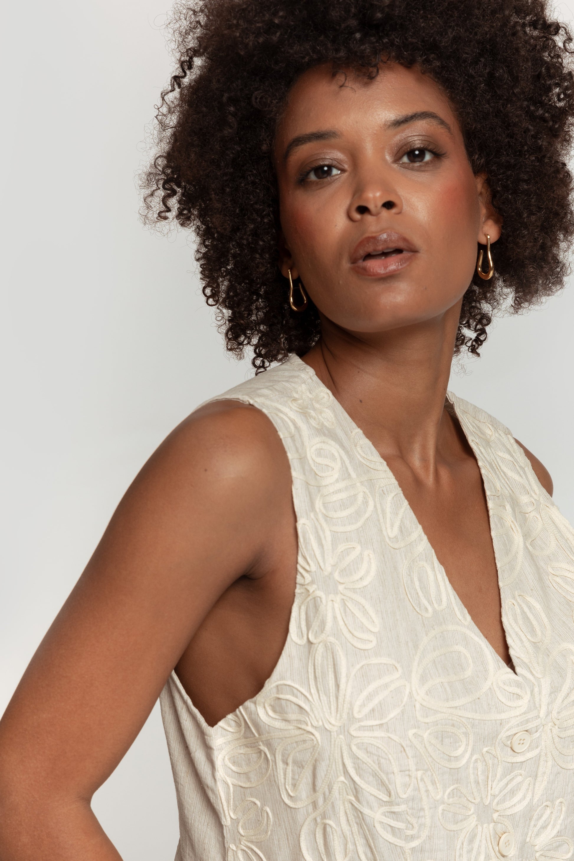 Tejido mezcla de algodón. Diseño entallado. Diseño corto. Estilo traje. Cuello pico. Sin mangas. Cierre de botones. Detalles bordados. Talla modelo: S/M. Altura modelo: 1,65 m.