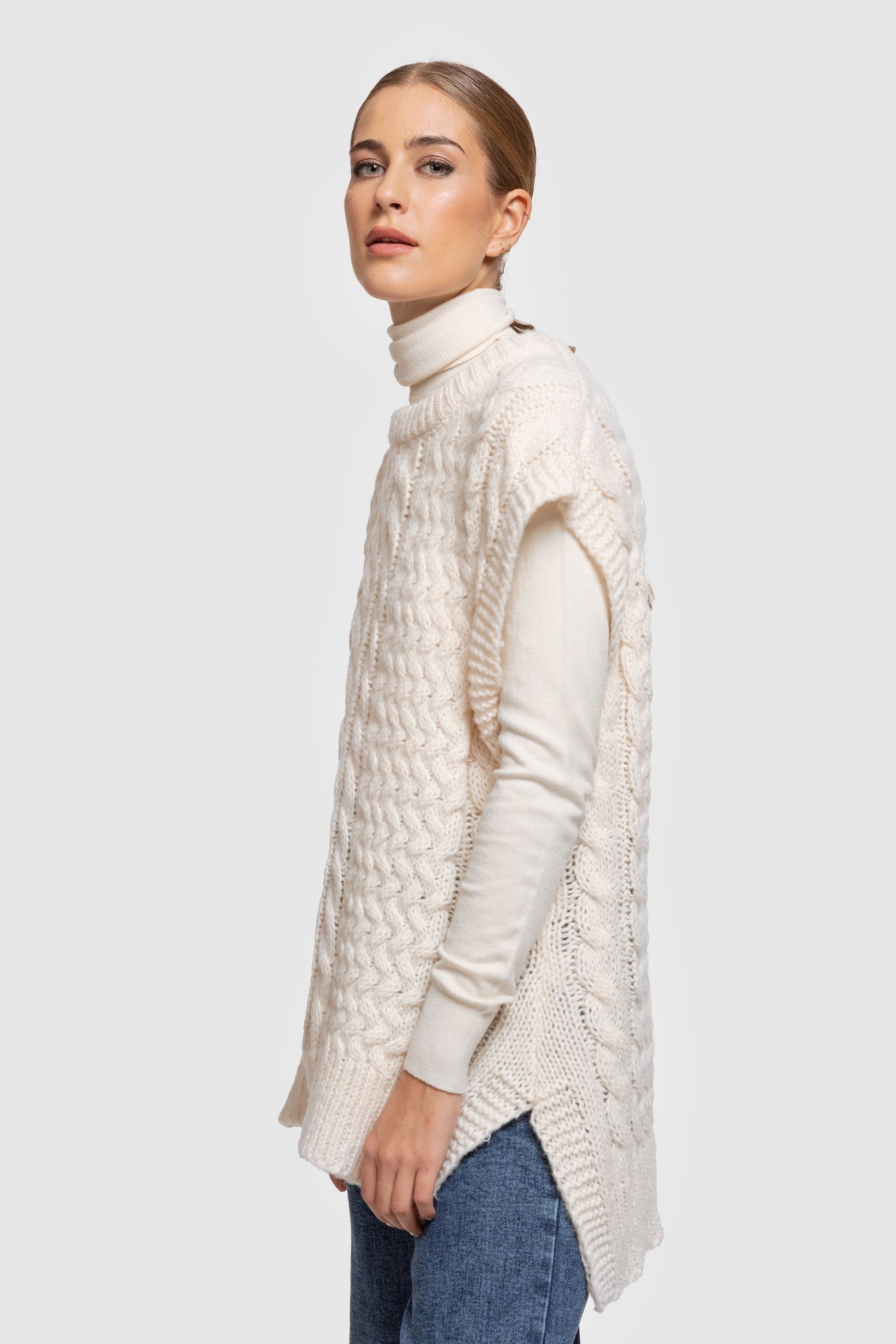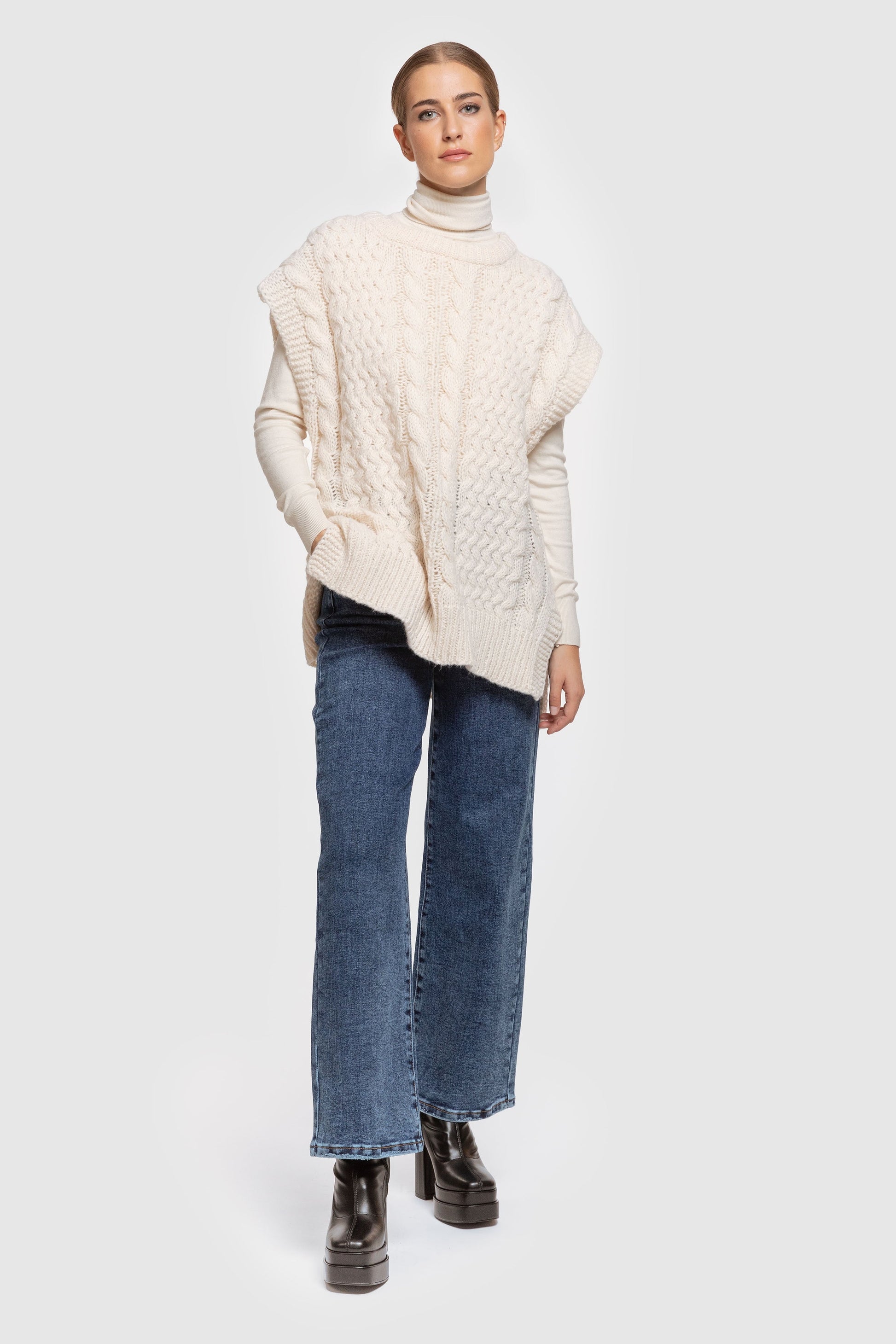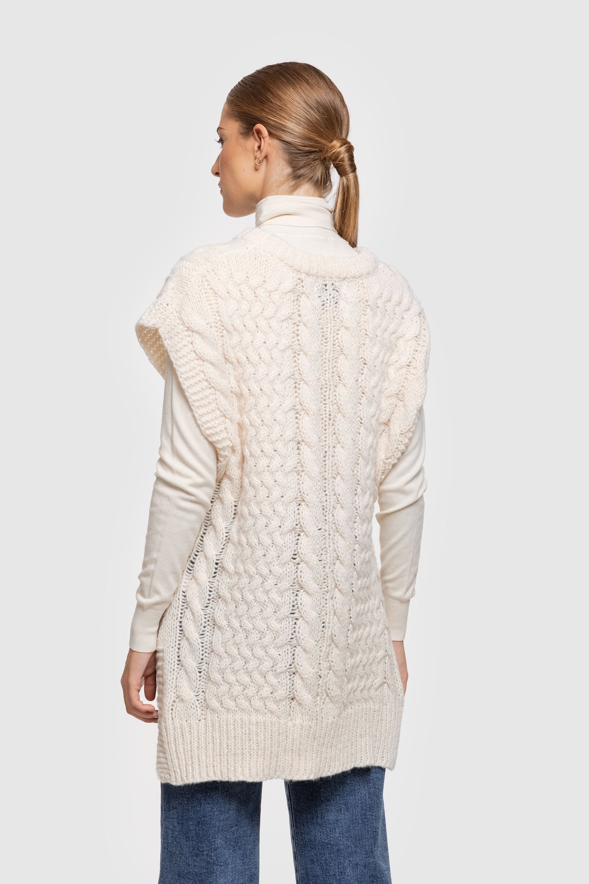 Chaleco de punto ochos. Diseño oversize. Cuello redondo y manga sisa. Bajo acabado asimétrico y con aberturas. Talla modelo: S. Altura modelo: 1,70 m.