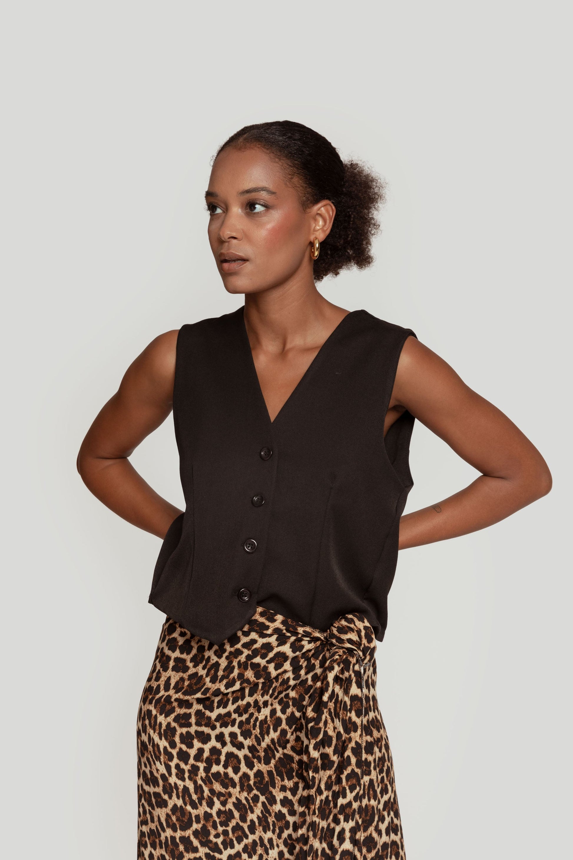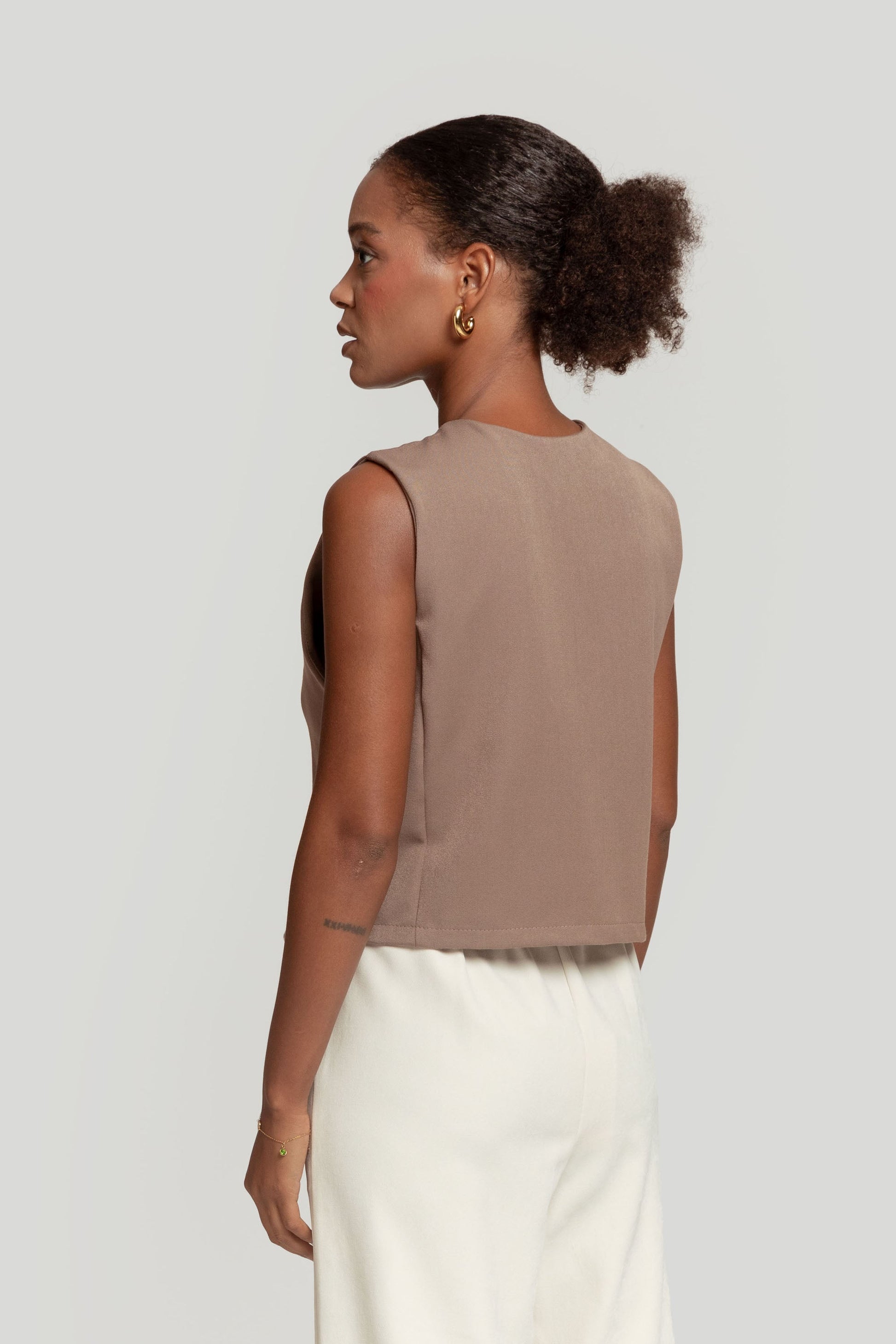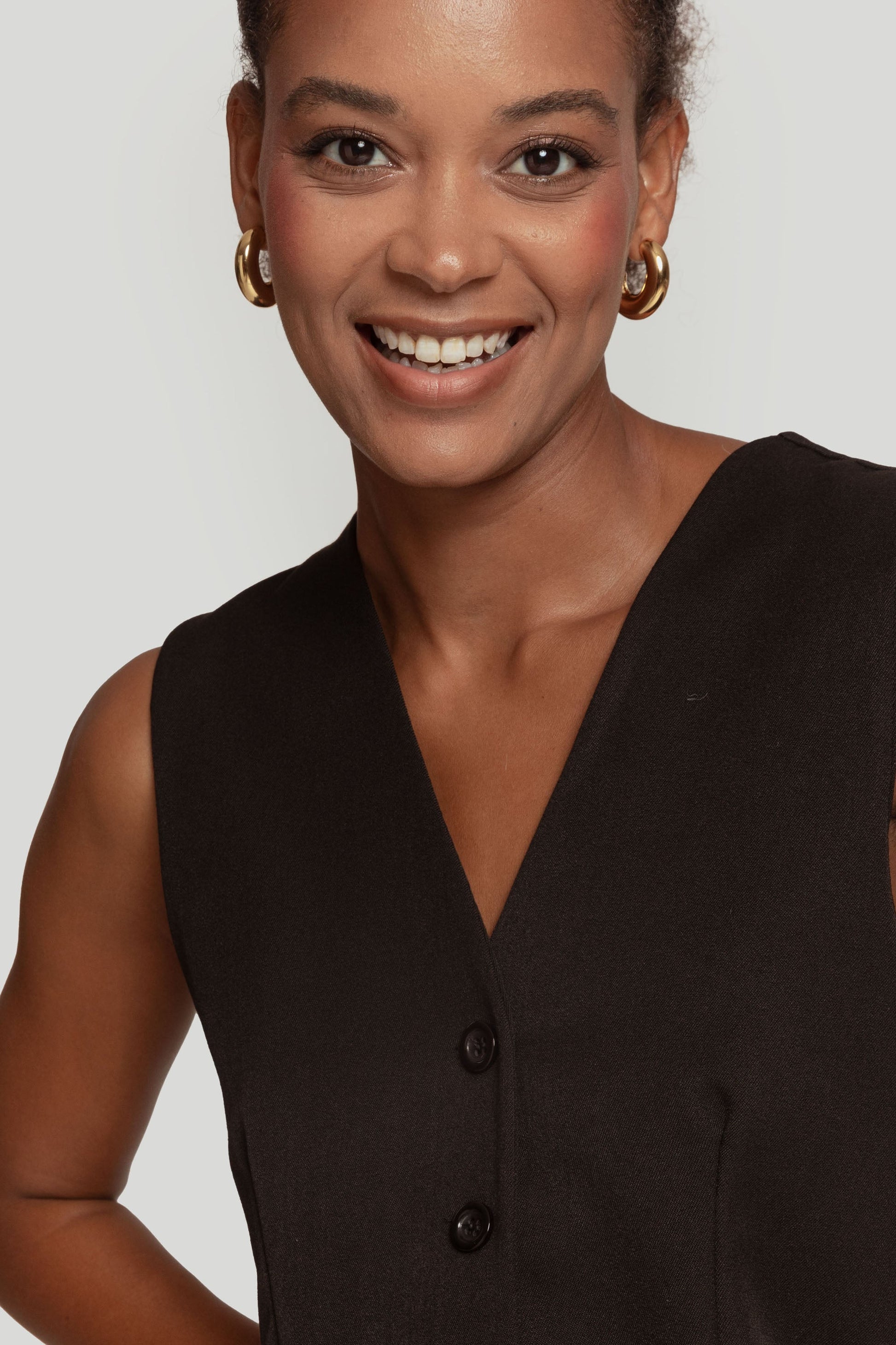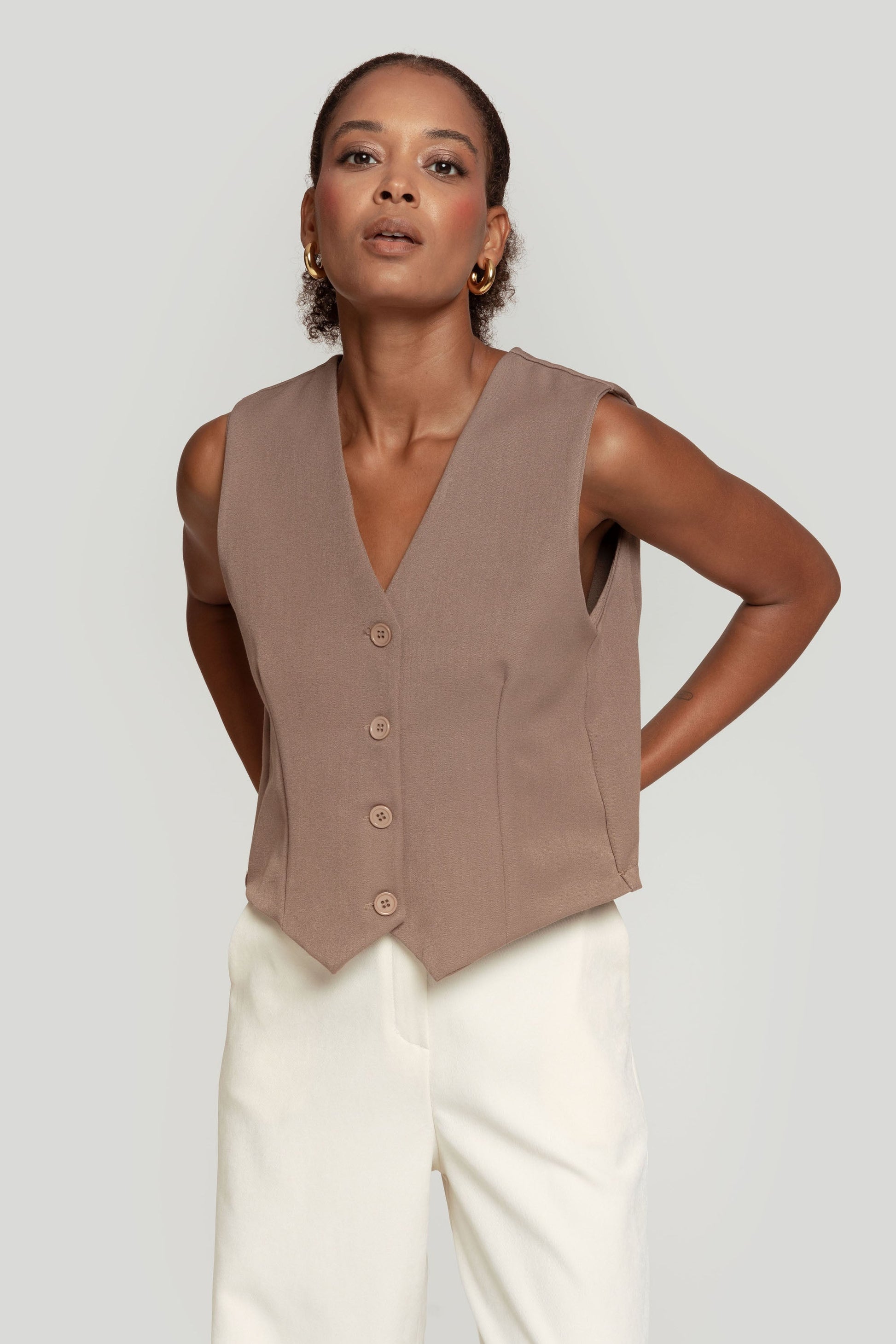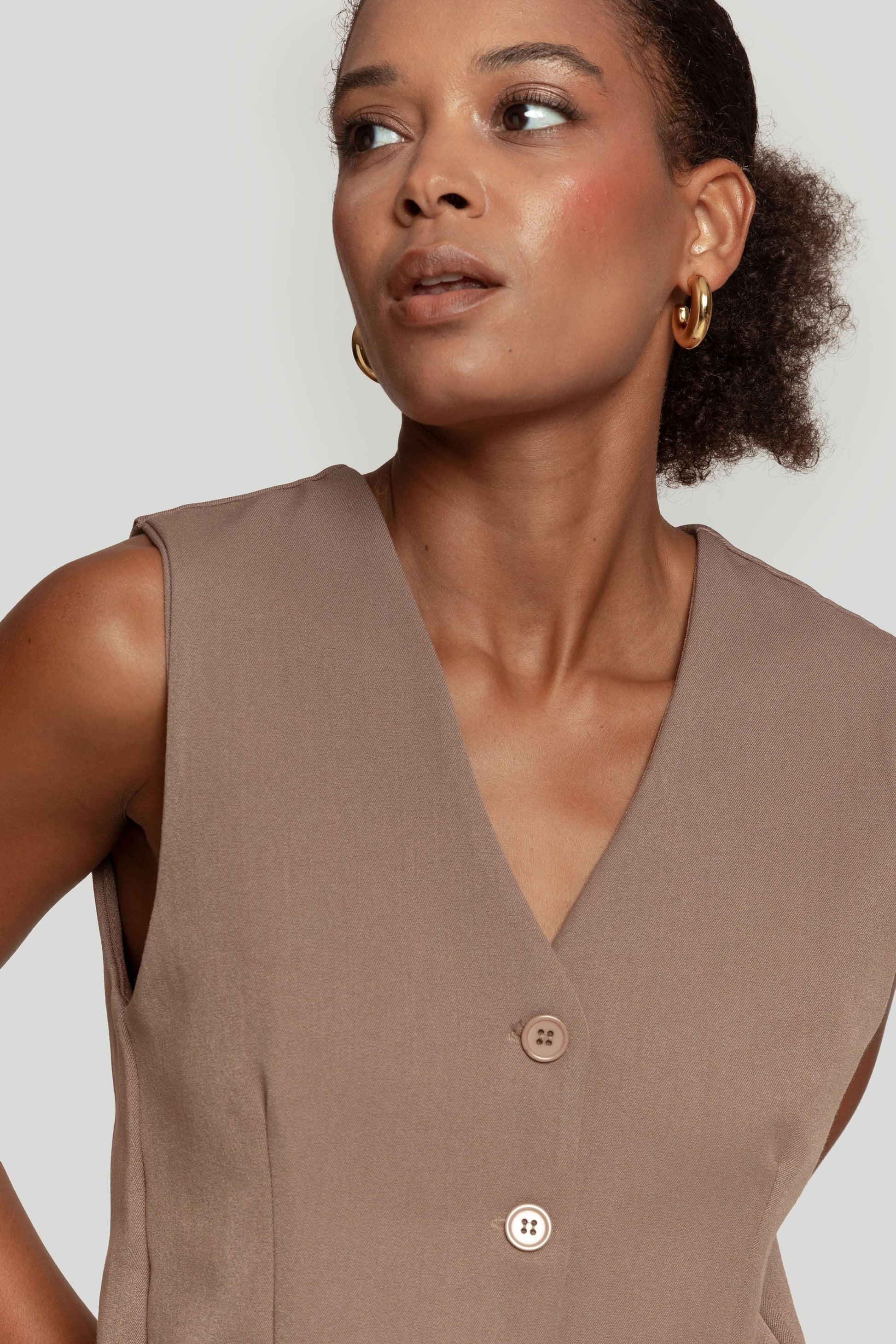 Tejido de acabado suave. Estilo traje. Diseño entallado. Diseño recto. Cuello pico. Cierre de botones. Detalle pinzas. Talla modelo: S. Altura modelo 1,66 m.