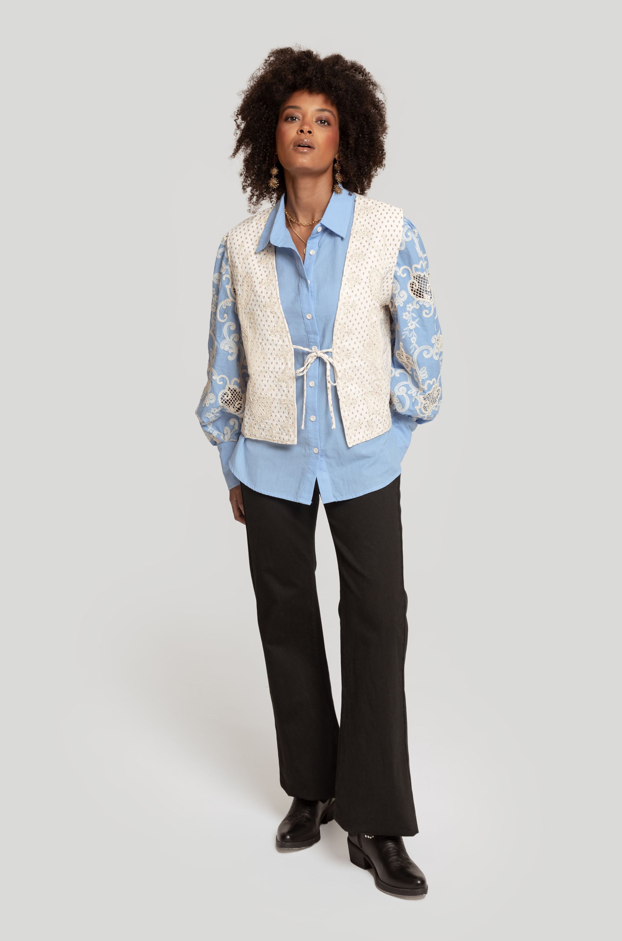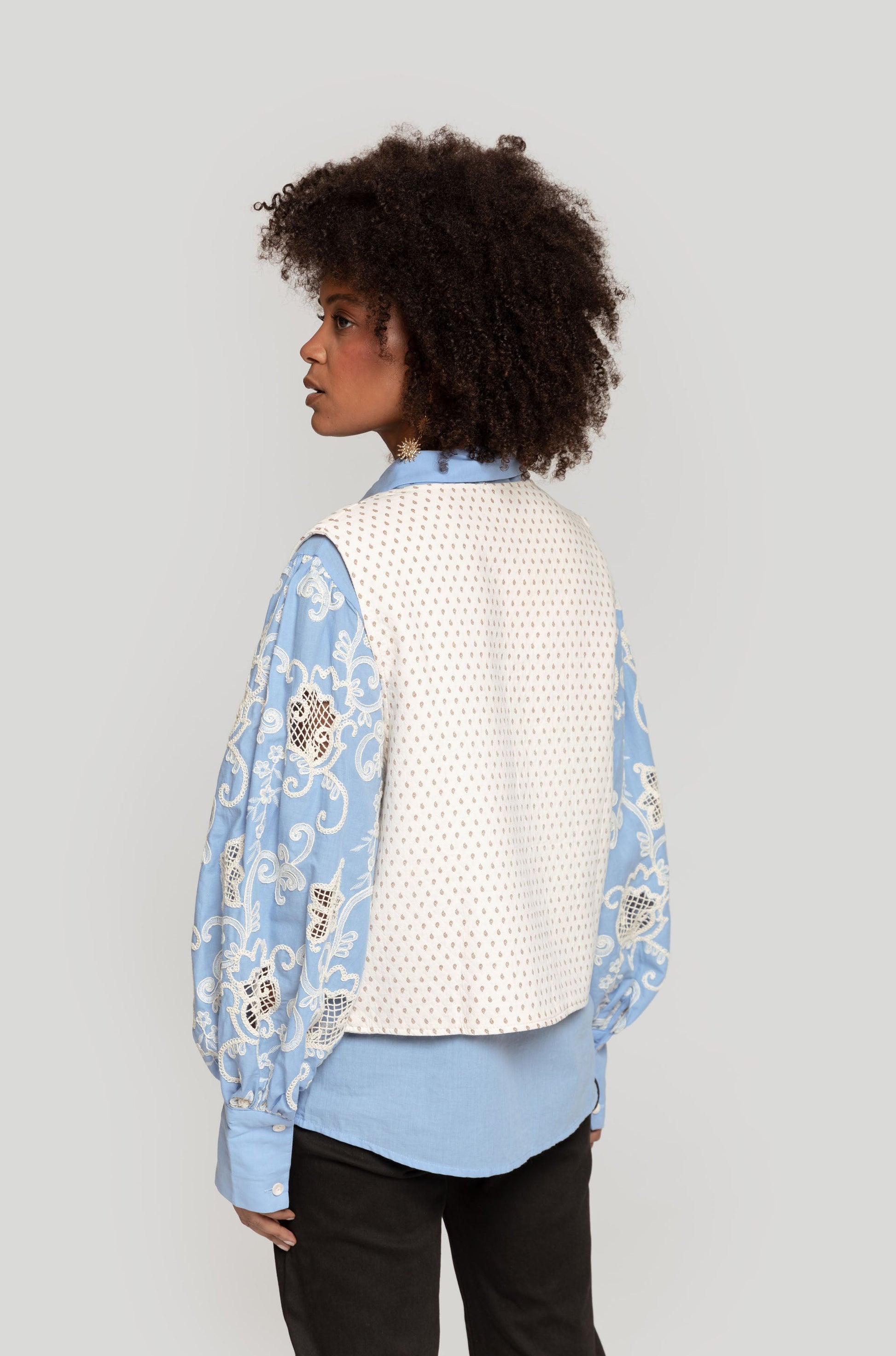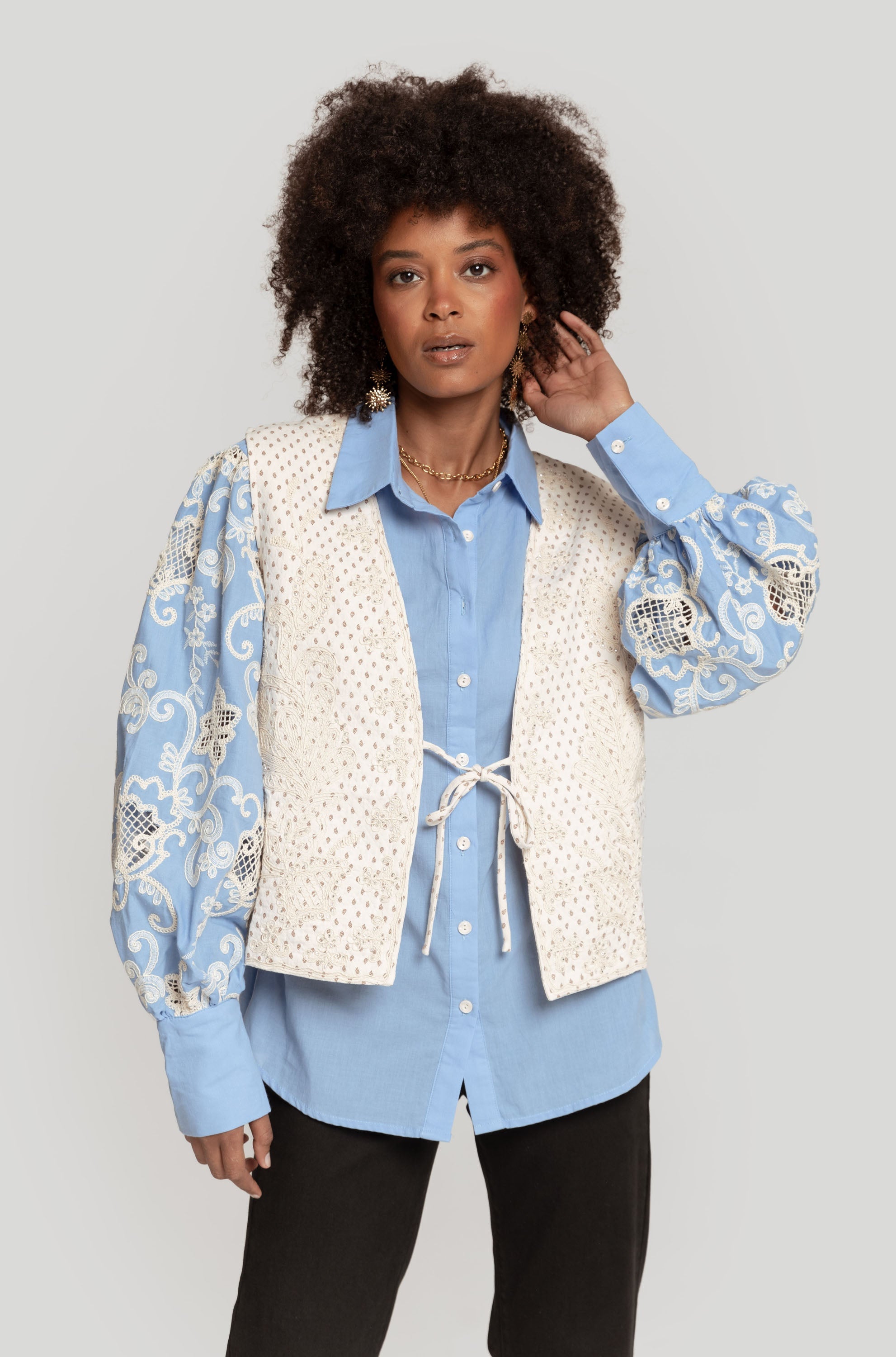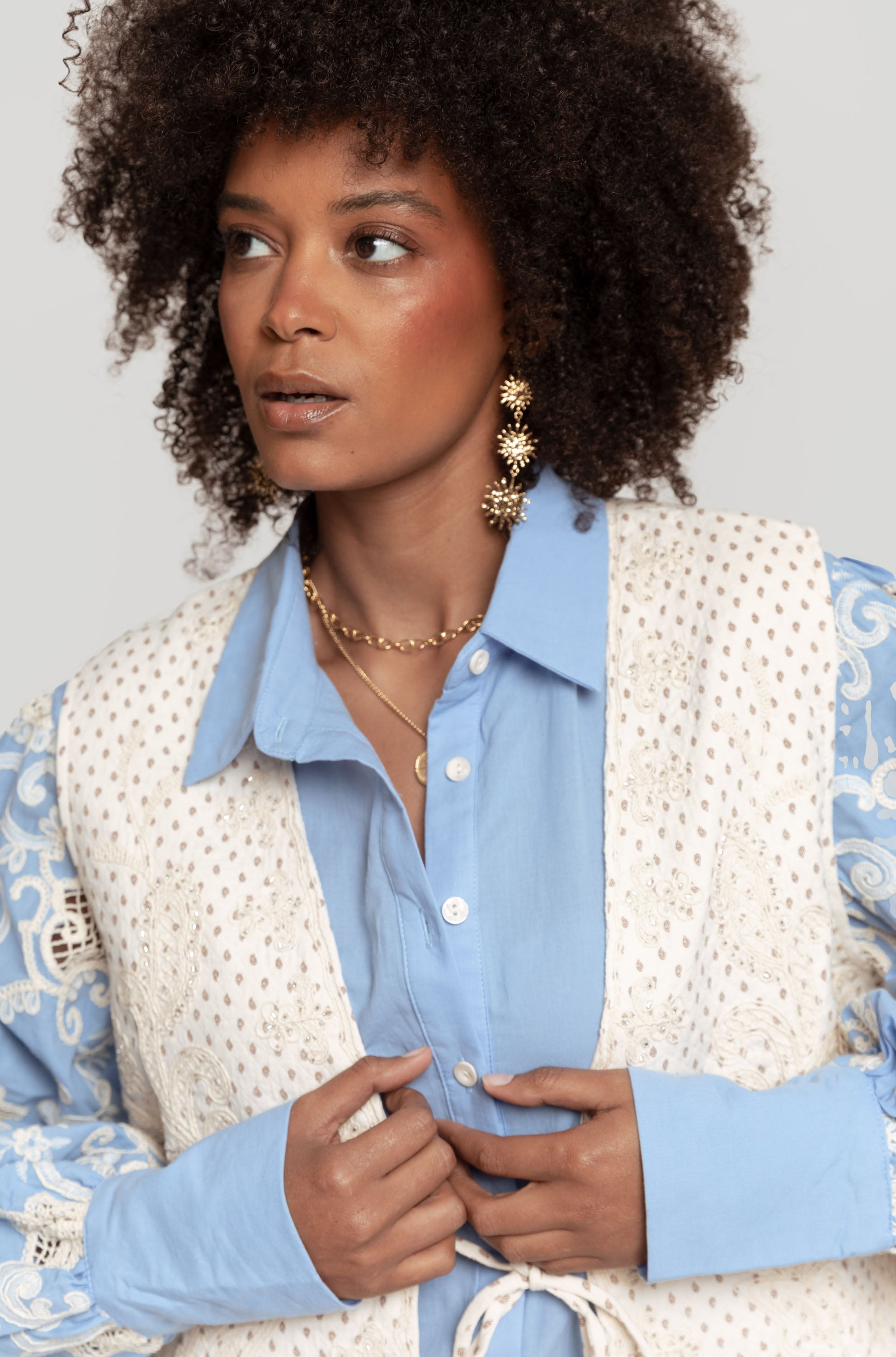 Tejido de algodón. Diseño estampado. Diseño flores de hilos con abalorios. Diseño entallado. Diseño corto. Manga sisa. Cierre de tira. Forrado. Talla única. Altura modelo: 1,70 m.