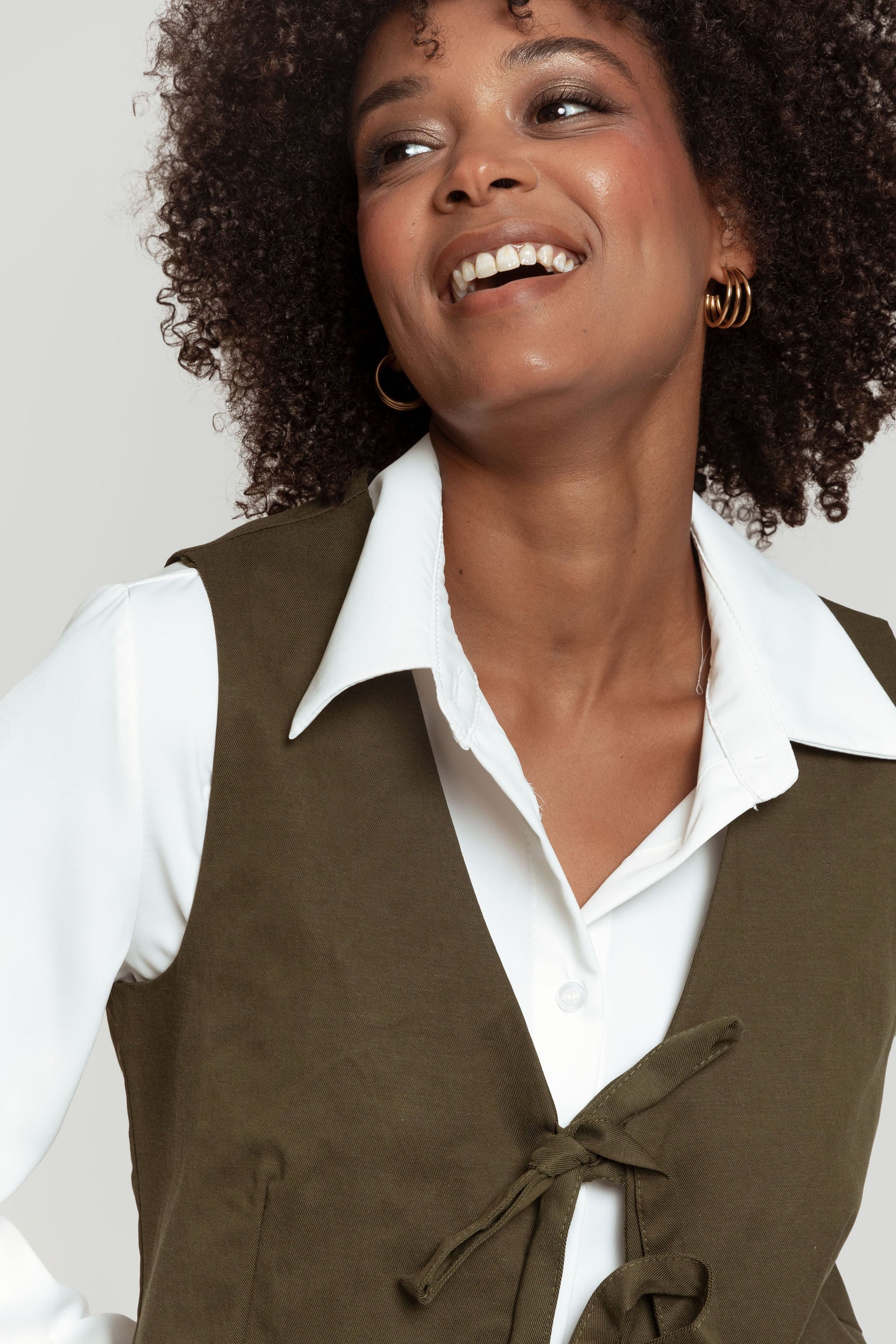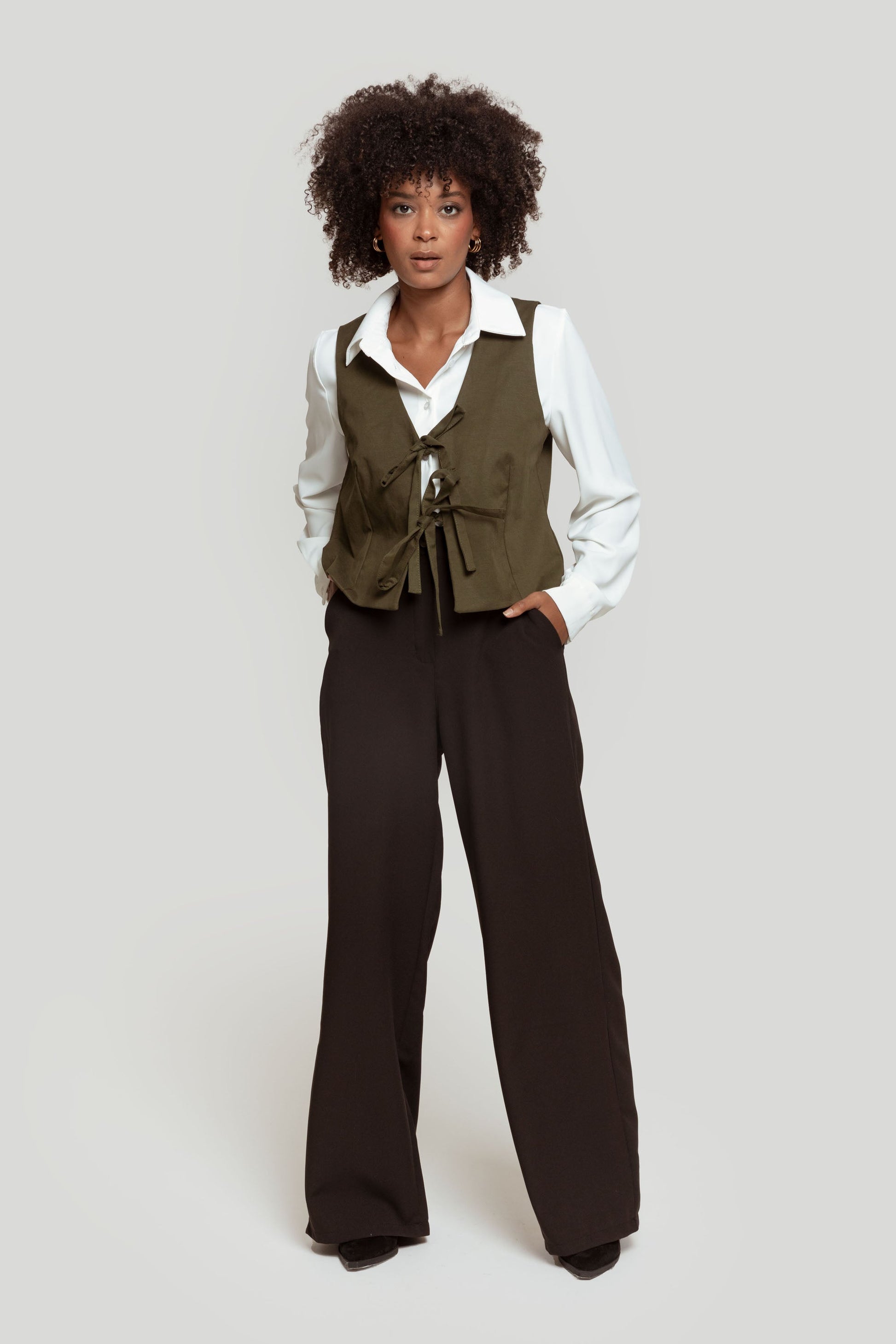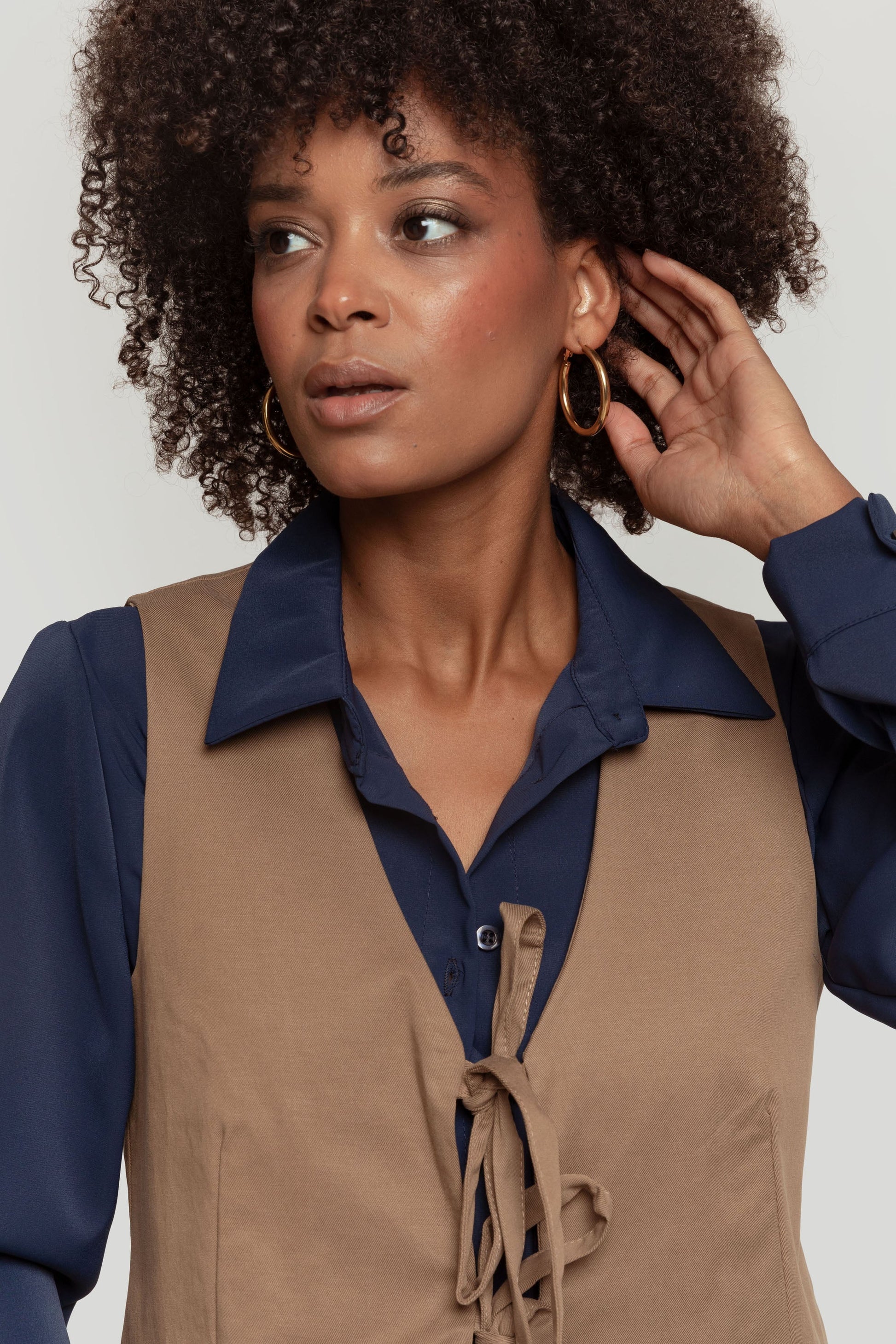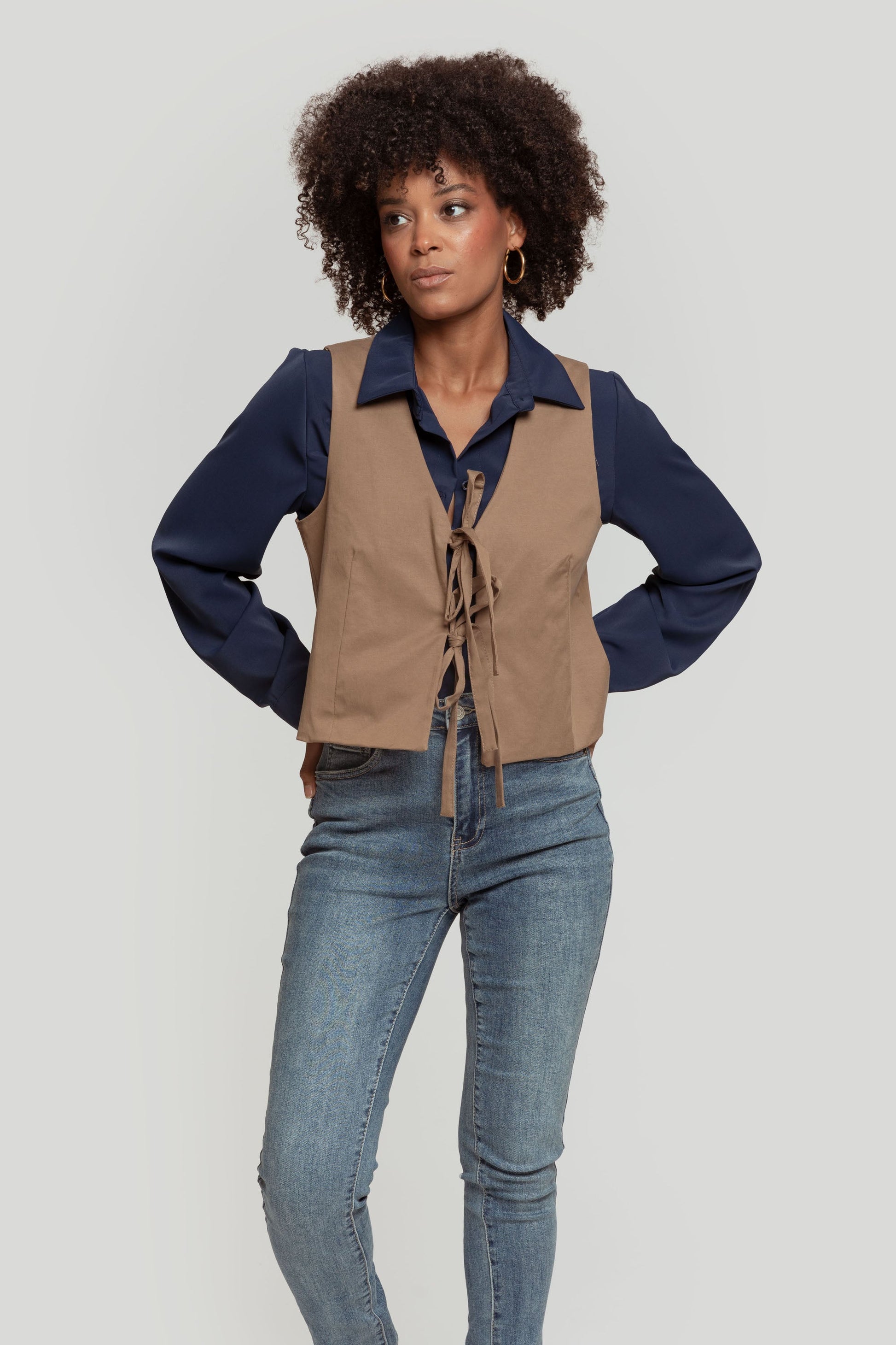 Tejido mezcla tencel y algodón. Diseño recto. Diseño entallado. Diseño corto. Estilo traje. Sin mangas. Cierre de lazos. Forrado. Talla modelo: S. Altura modelo: 1,66 m.