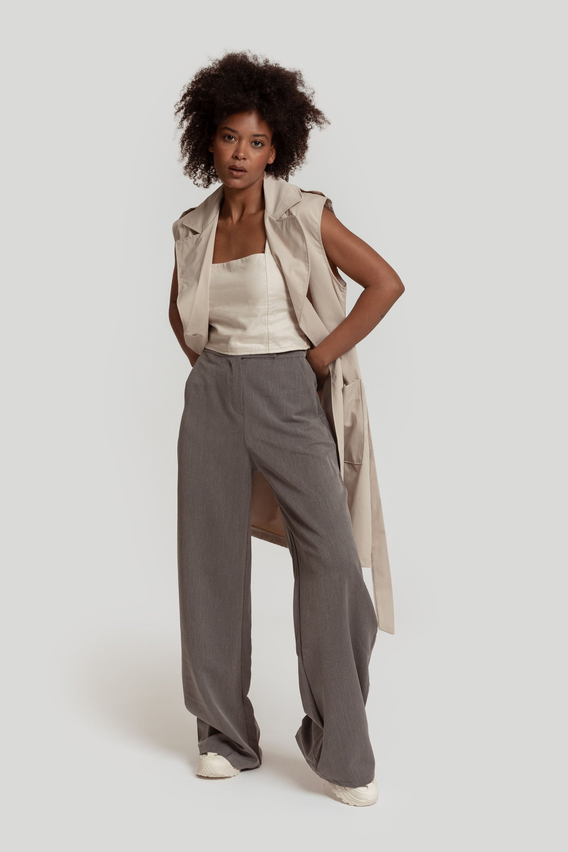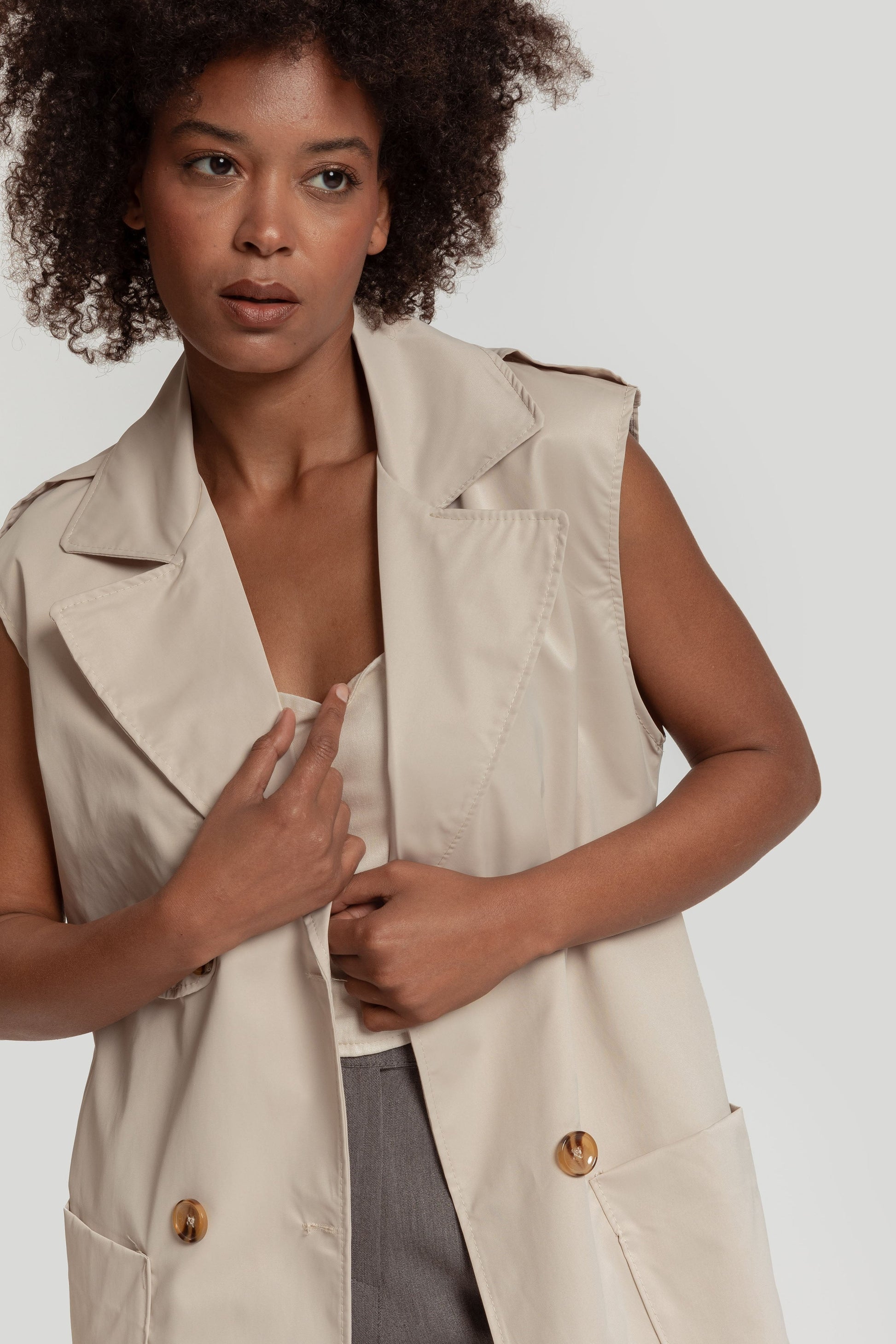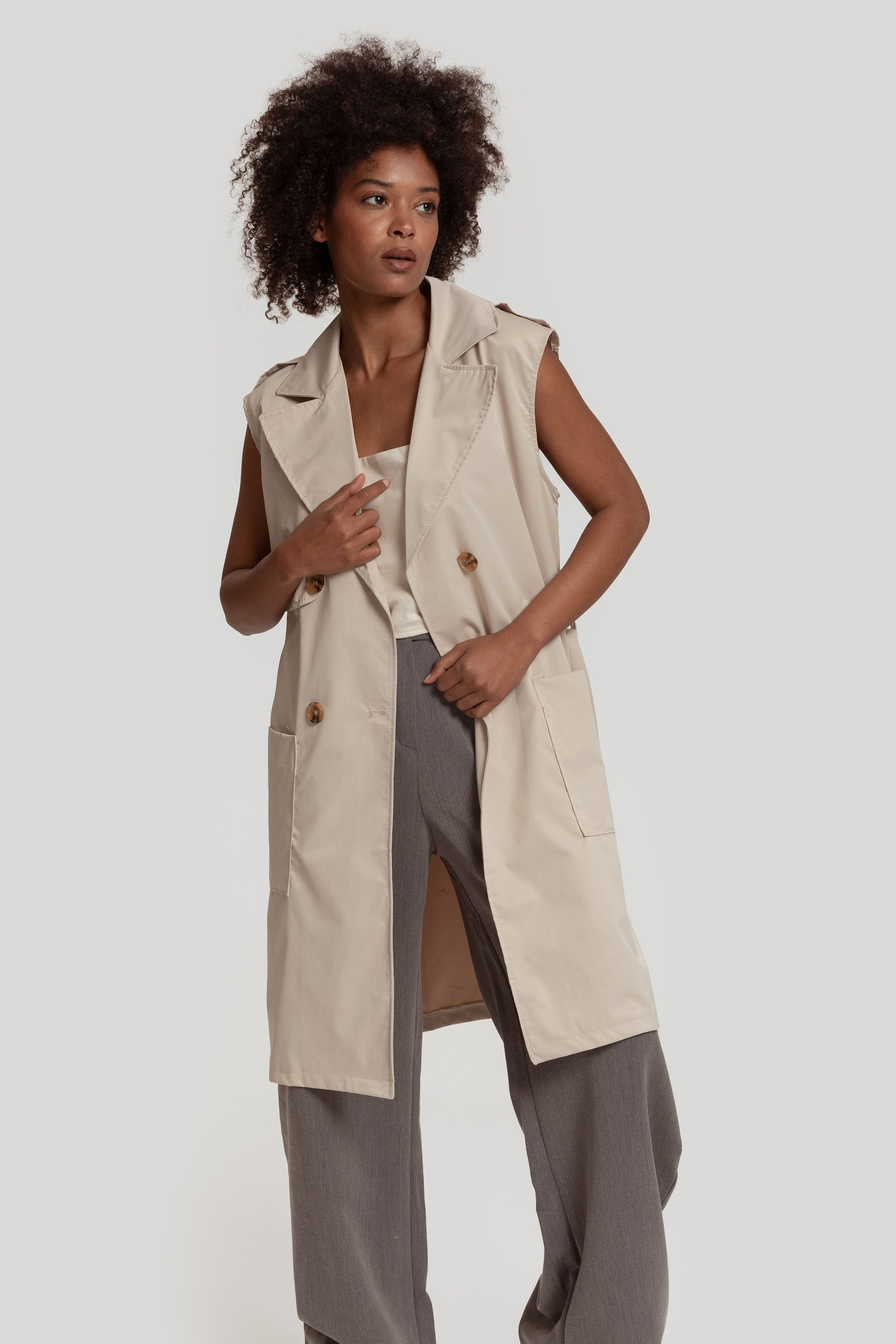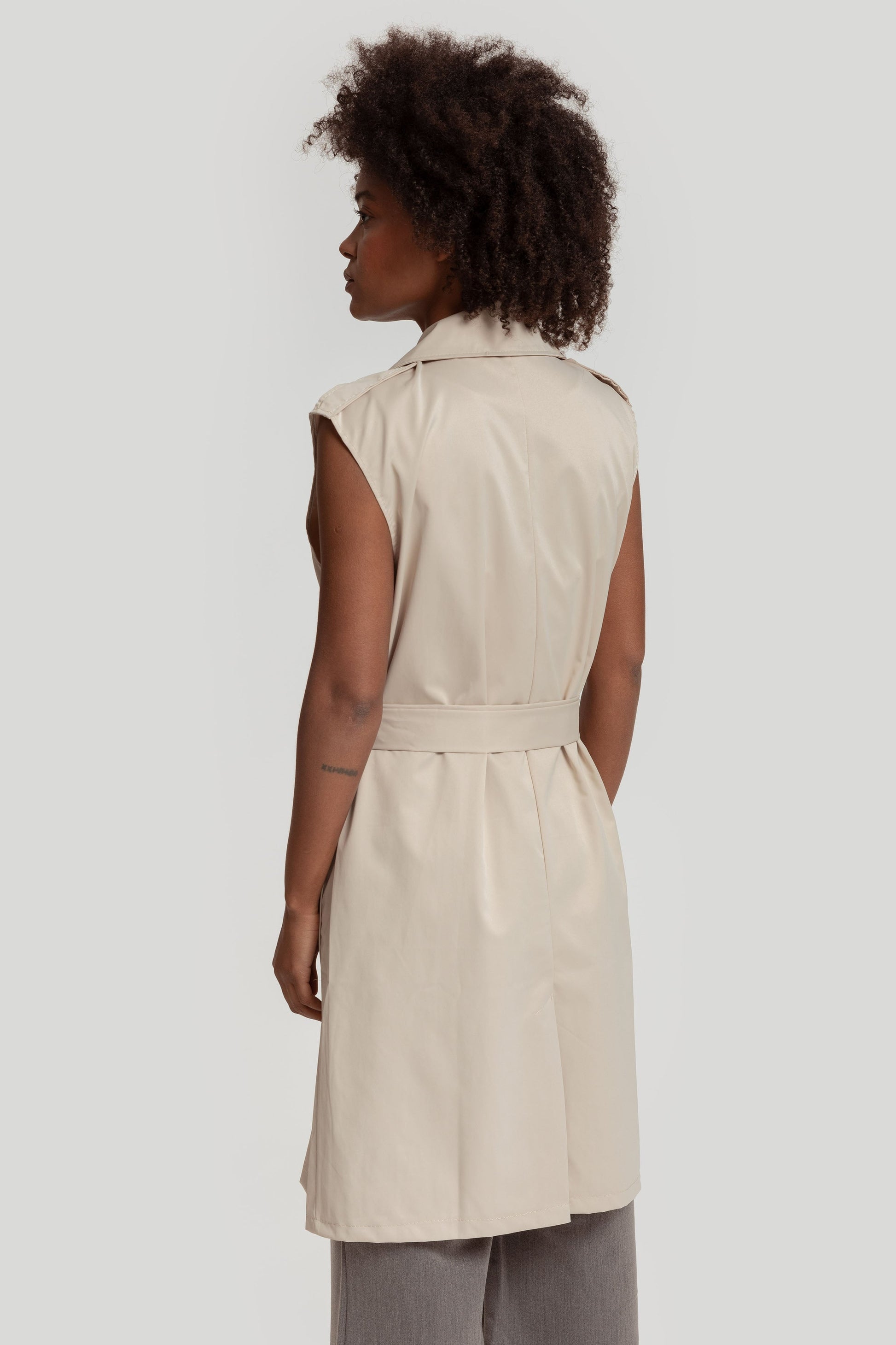 Diseño midi. Diseño cruzado. Diseño recto. Cuello de solapa. Manga sisa. Dos bolsillos de solapa. Trabillas. Cinturón desmontable. No forrado. Talla modelo: S. Altura modelo 1,66 m.