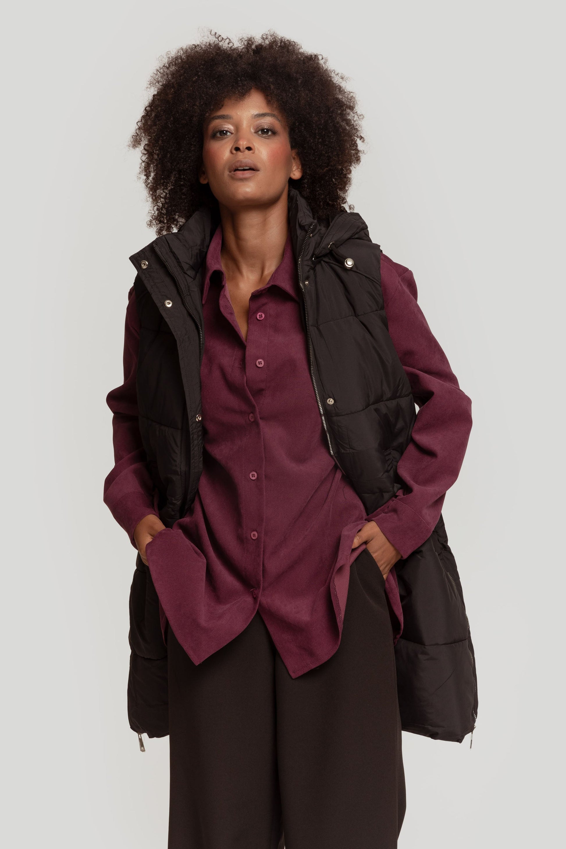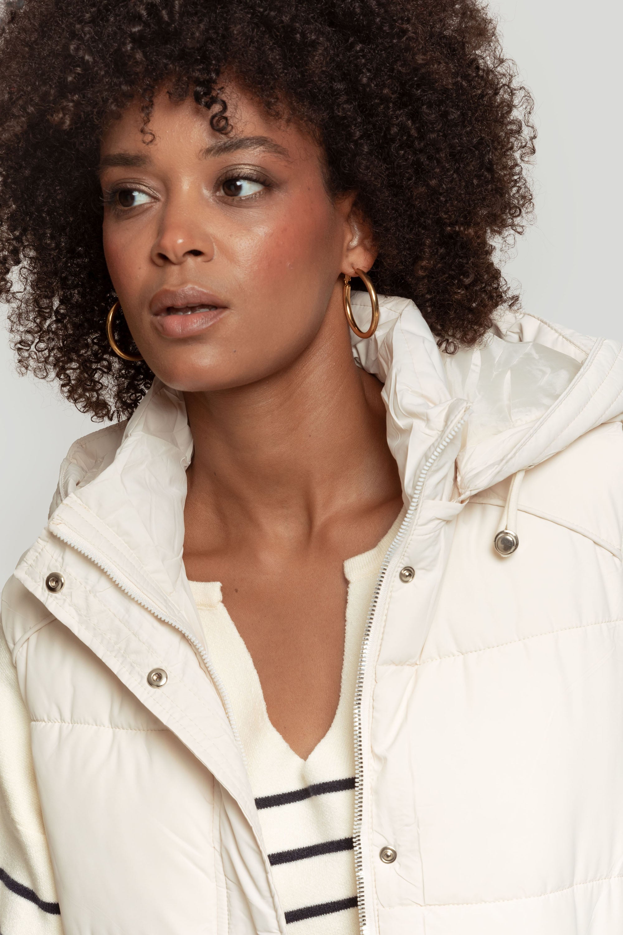 Tejido repelente al agua. Diseño acolchado. colchado. Diseño midi. Cuello alto. Con capucha desmontable. Manga sisa. Bolsillos laterales con cierre de botones. Cierre de cremallera. Cierre de botones a presión. Forrado., Talla modelo: S. Altura modelo: 1,66 m.