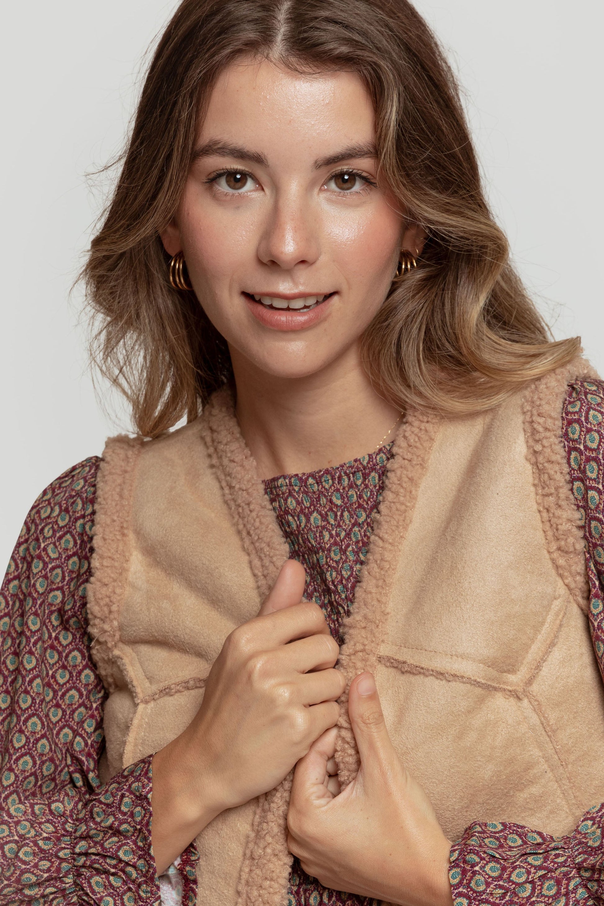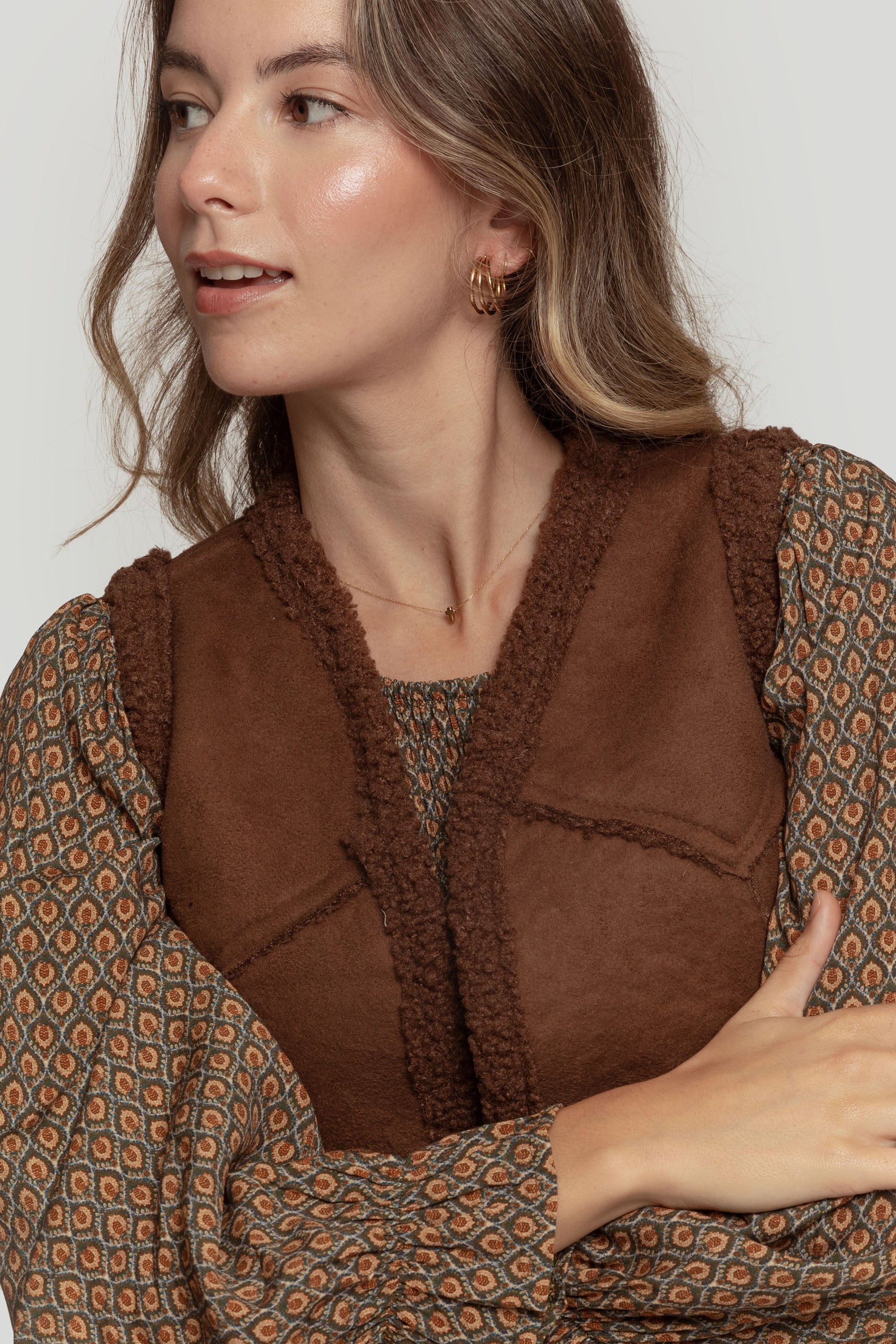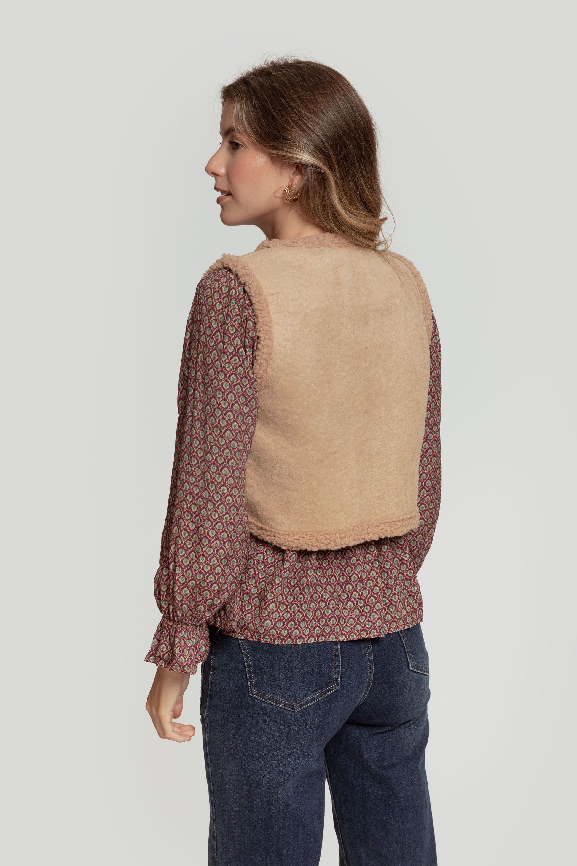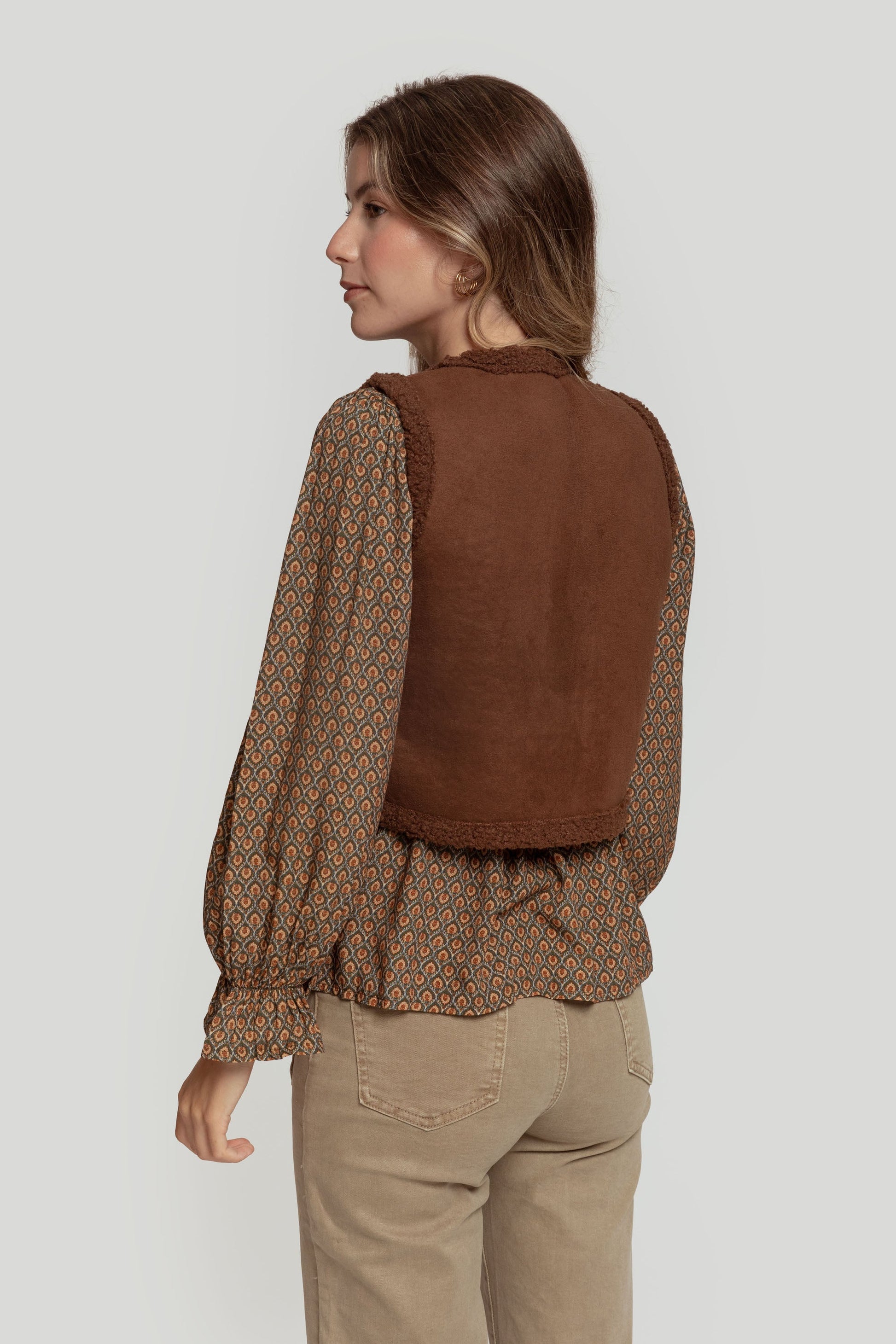 Tejido combinado. Diseño entallado. Diseño corto. Cuello redondo. Manga sisa. Abierto. Forrado de borreguito. Talla modelo: S. Altura modelo: 1,70 m.