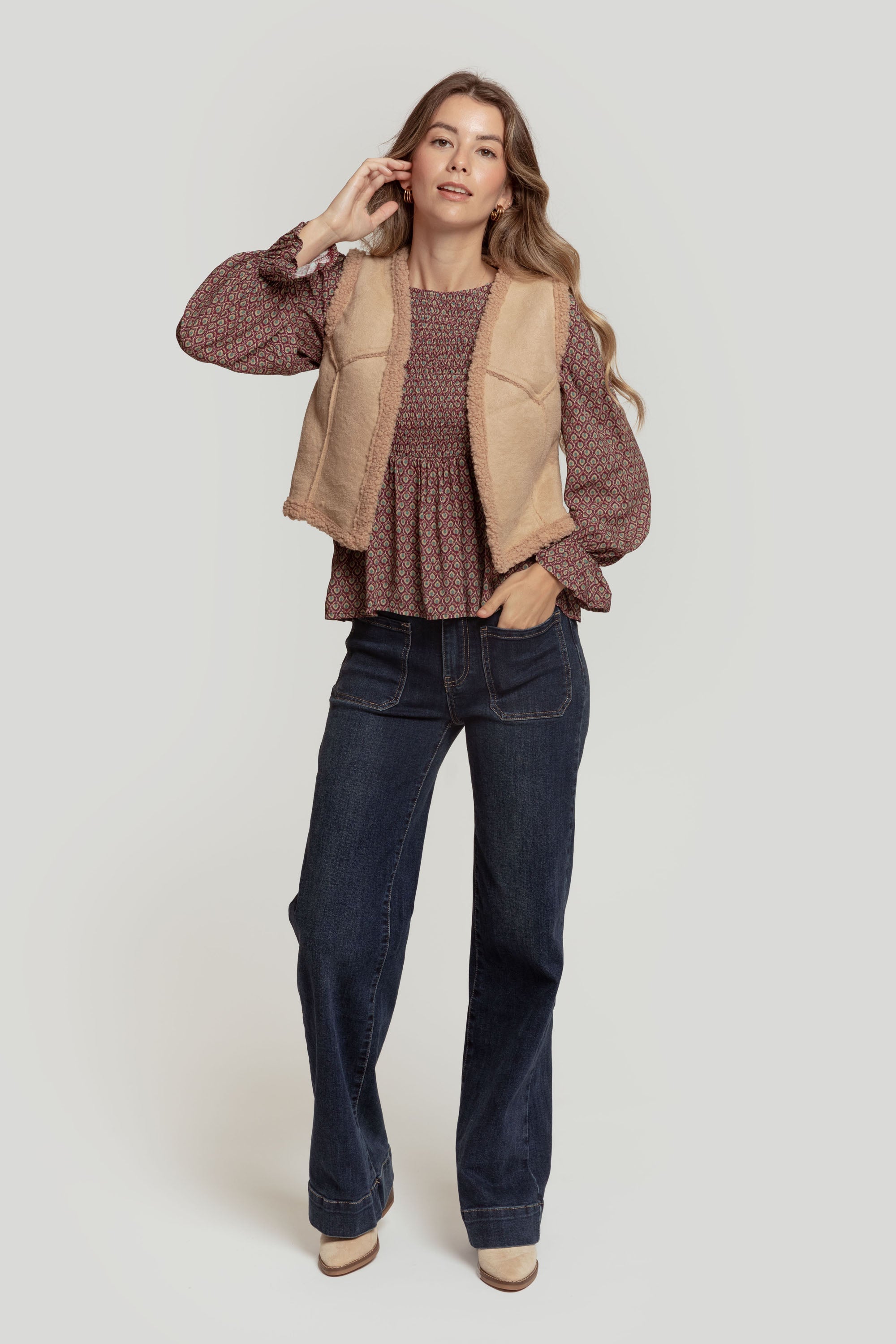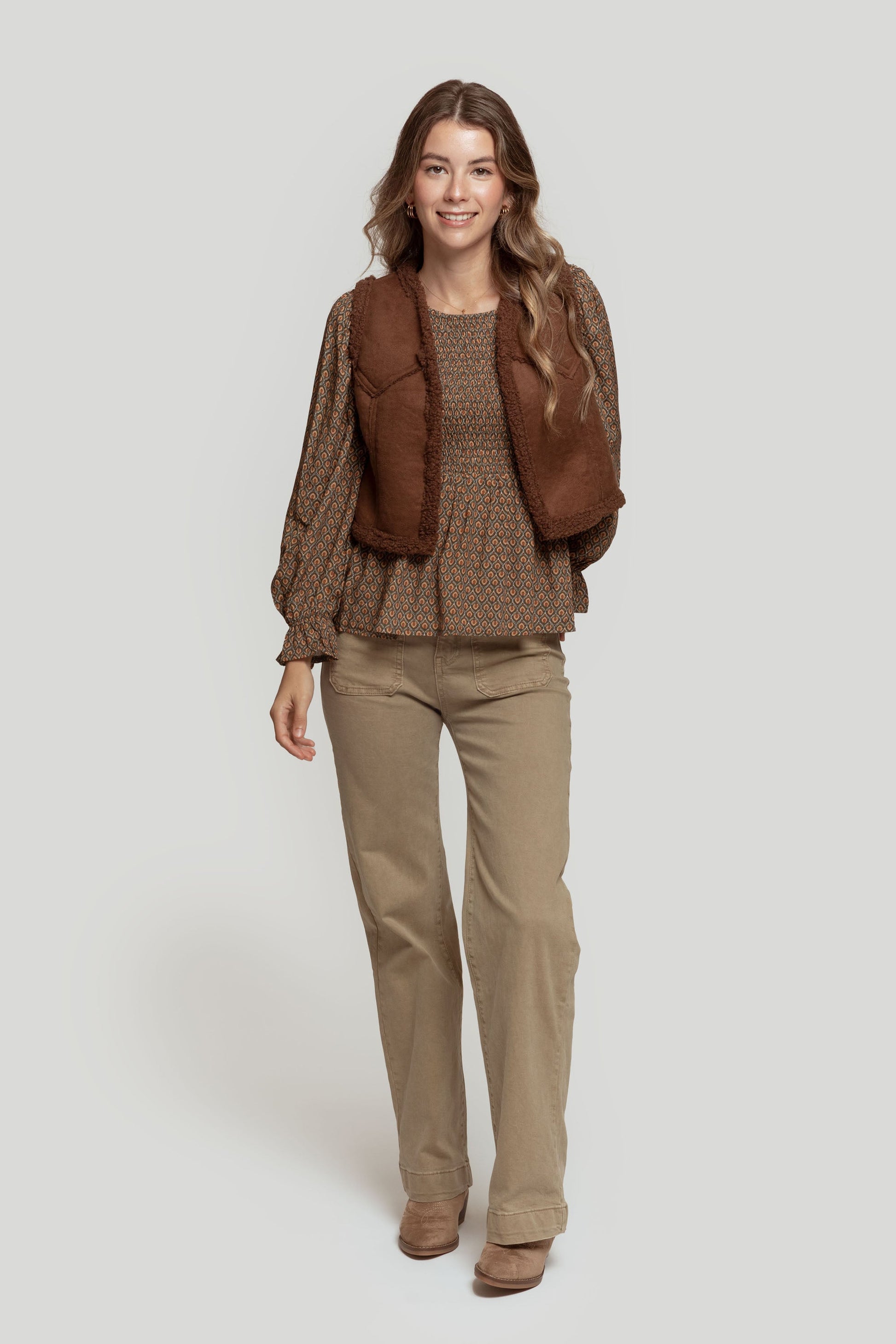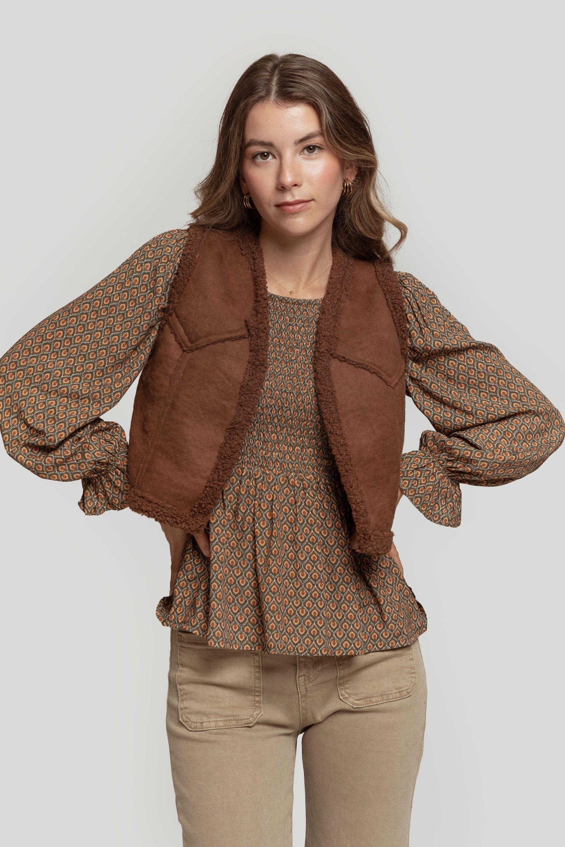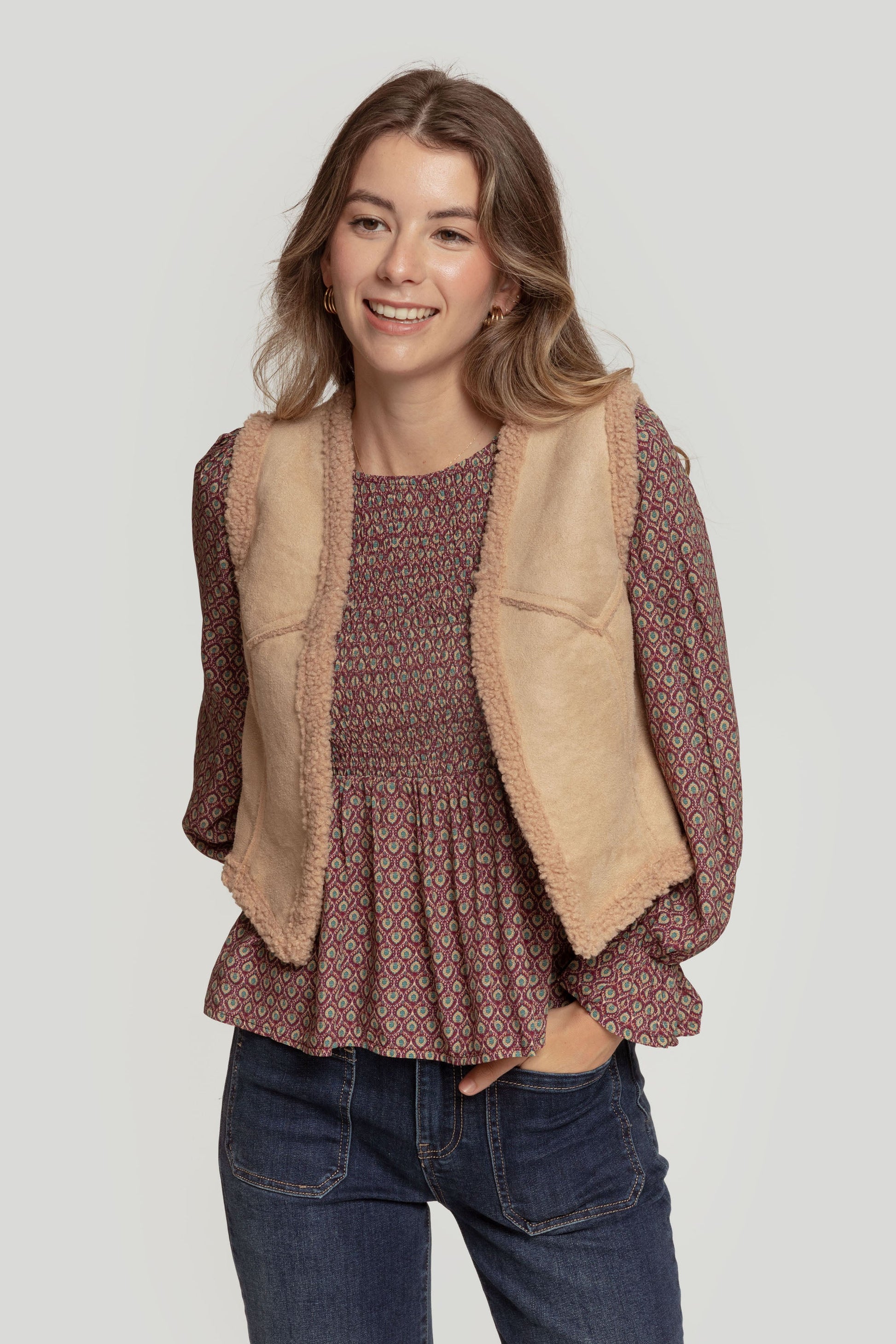 Tejido combinado. Diseño entallado. Diseño corto. Cuello redondo. Manga sisa. Abierto. Forrado de borreguito. Talla modelo: S. Altura modelo: 1,70 m.