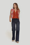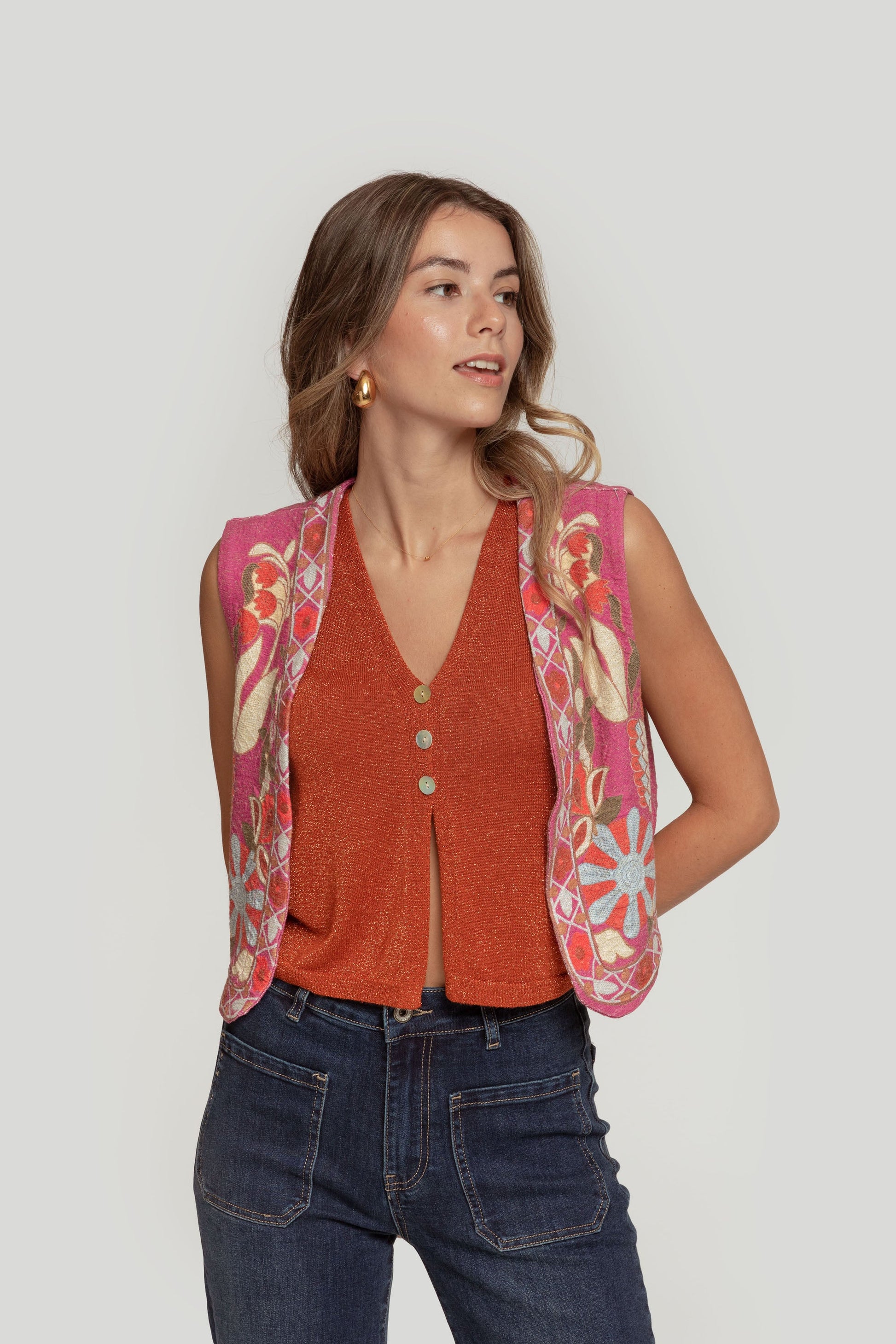 Tejido de algodón. Tejido de acabado brillo. Diseño estampado. Diseño entallado. Diseño corto. Manga sisa. Sin cierre. Talla modelo: S. Altura modelo: 1,70 m.