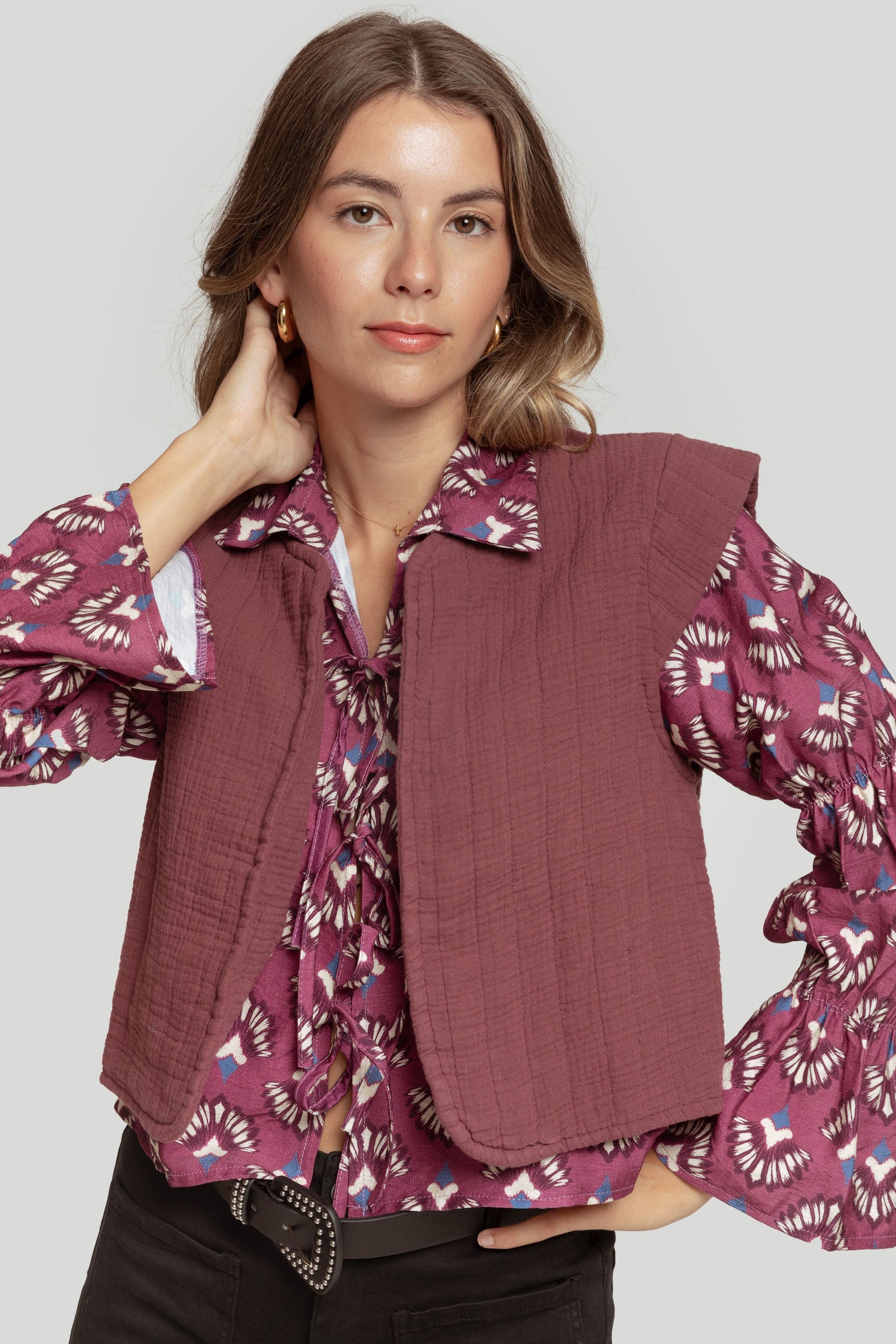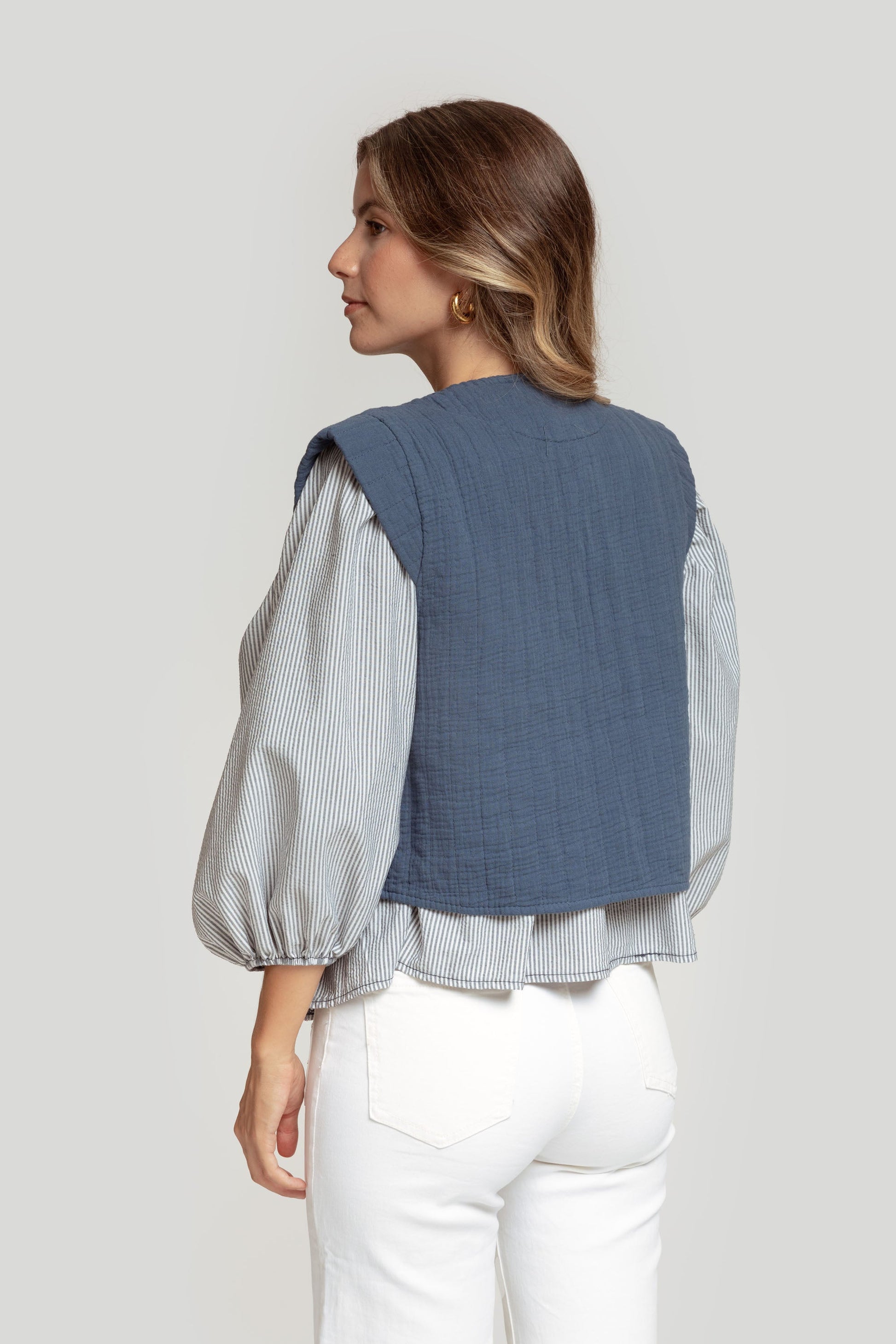 Tejido mezcla de algodón. Diseño entallado. Cuello redondo. Manga sisa. Costuras visibles. Talla modelo: S. Altura modelo: 1,70 m.