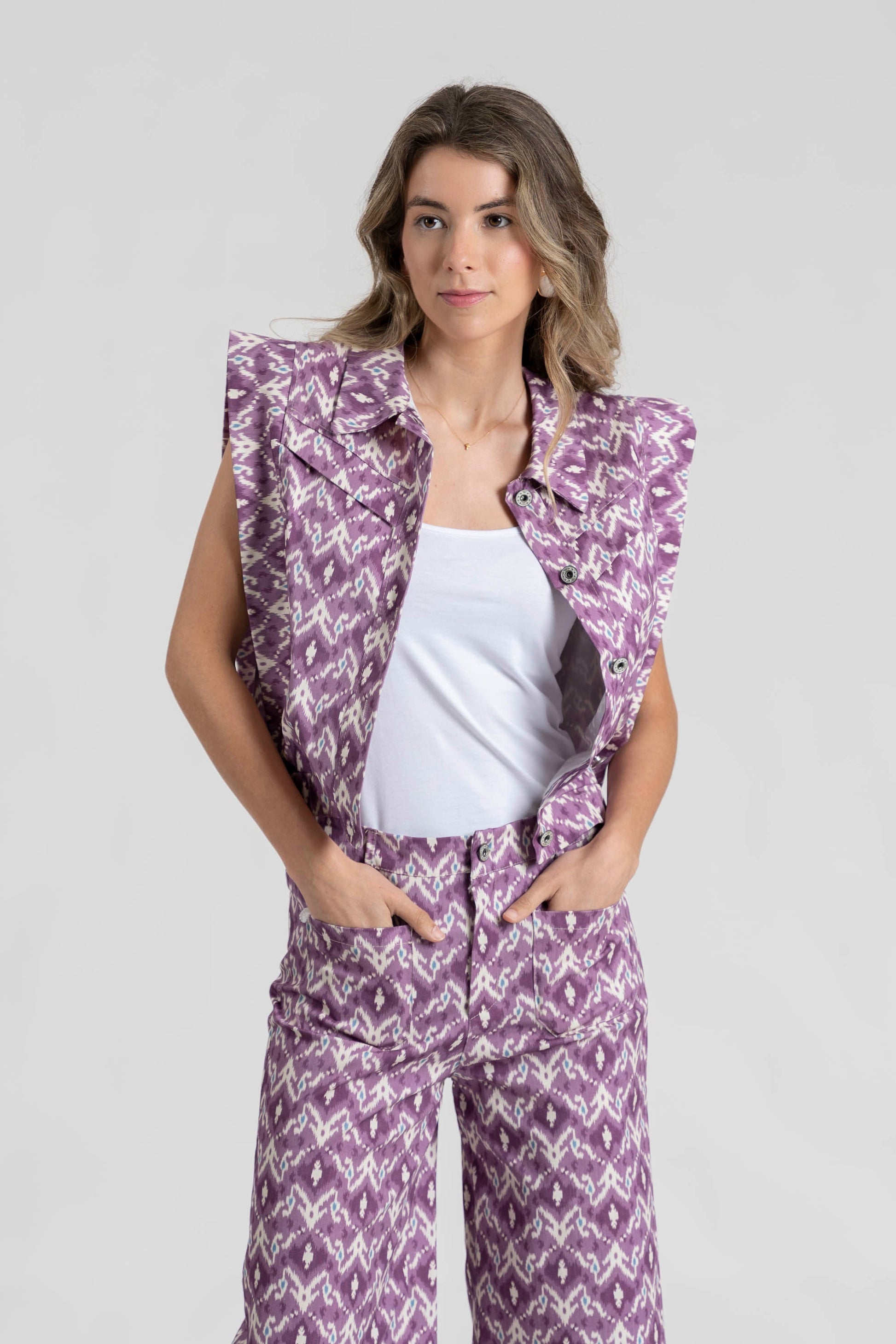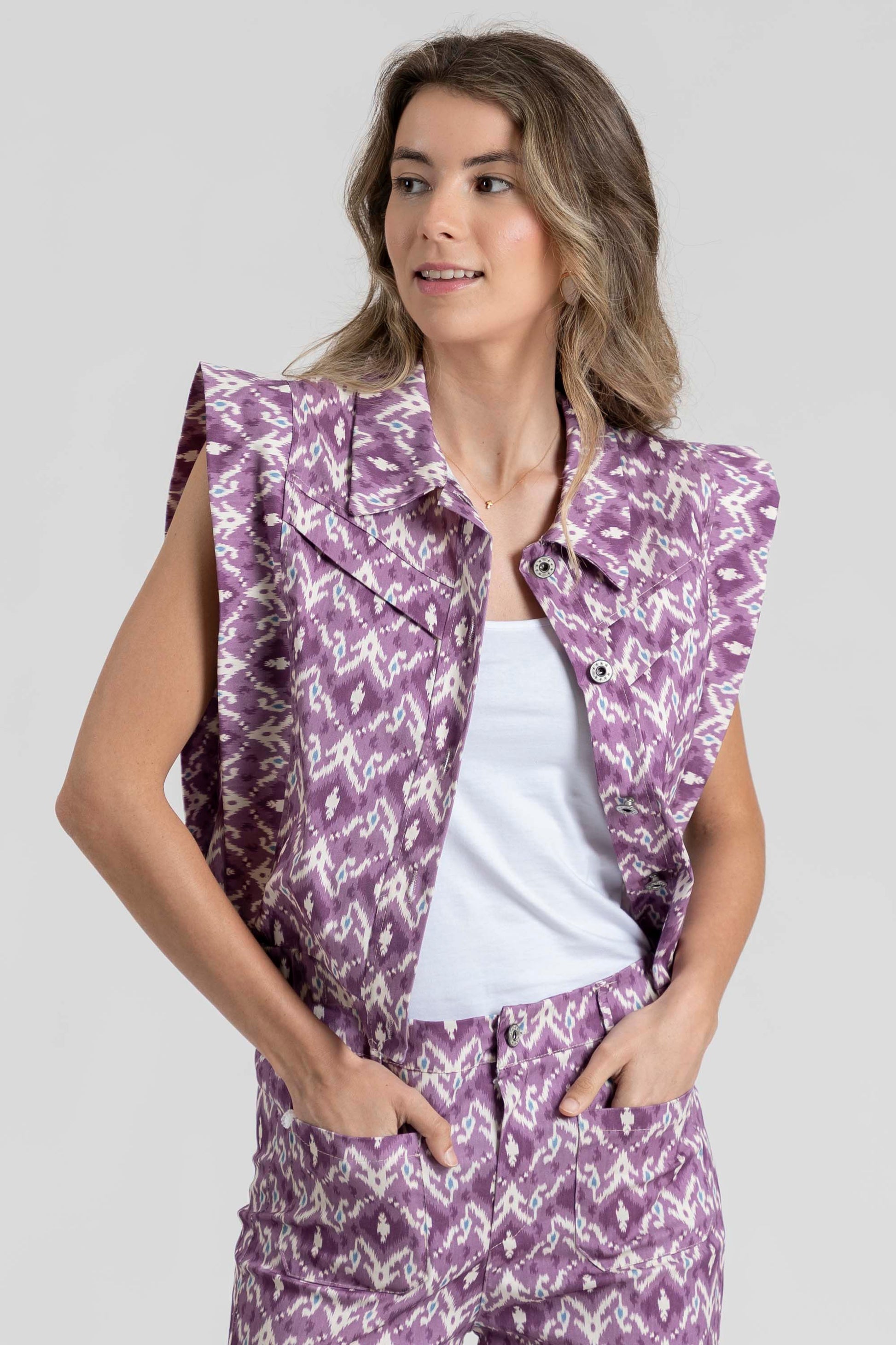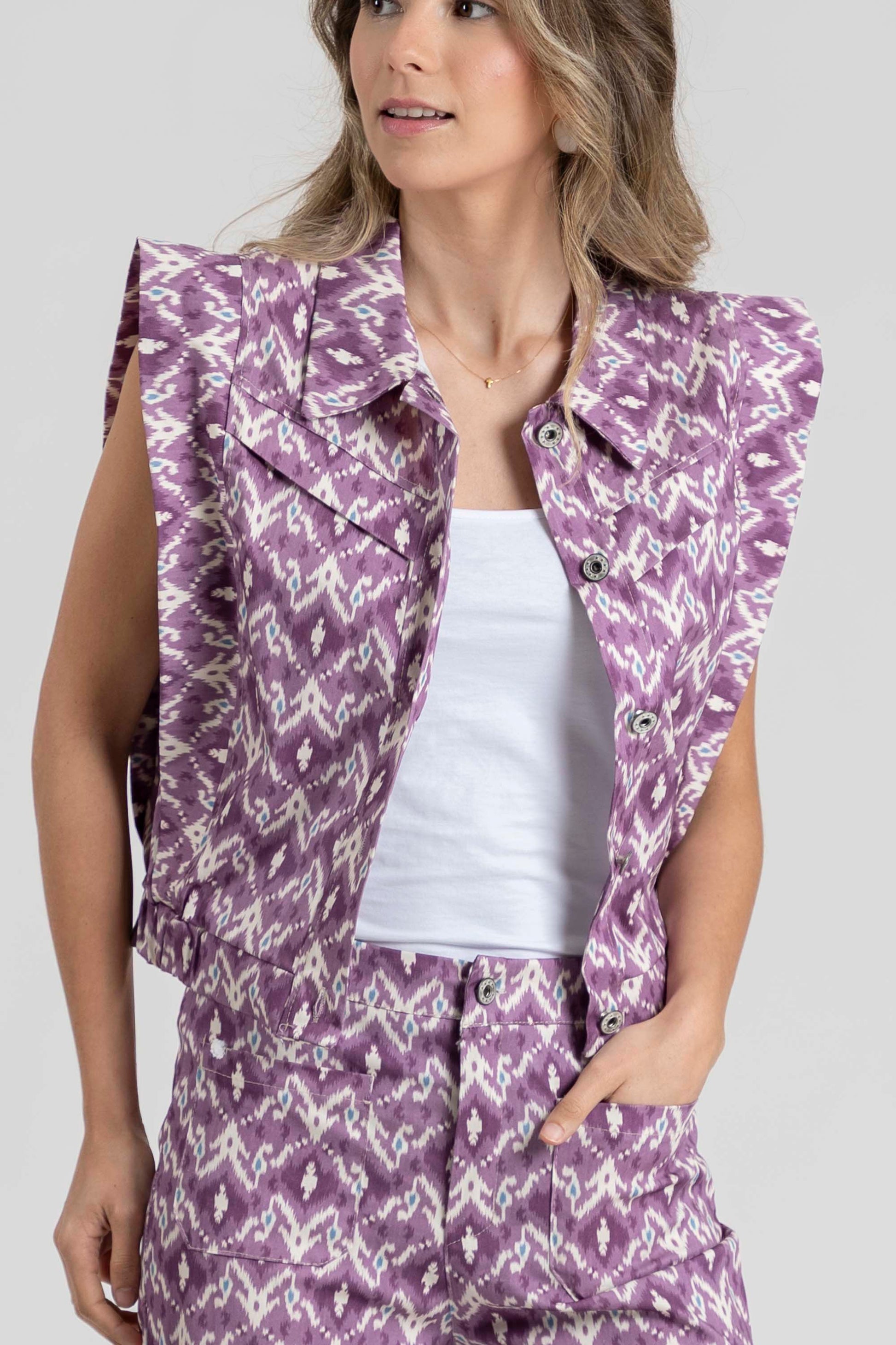 Tejido mezcla de algodón. Tejido rígido. Diseño estampado. Diseño recto. Cuello solapa. Manga sisa. Hombros estructurados. Detalle volantes. Cierre de botones metálicos. Bajo elástico. Talla modelo: S. Altura modelo: 1.70 m.