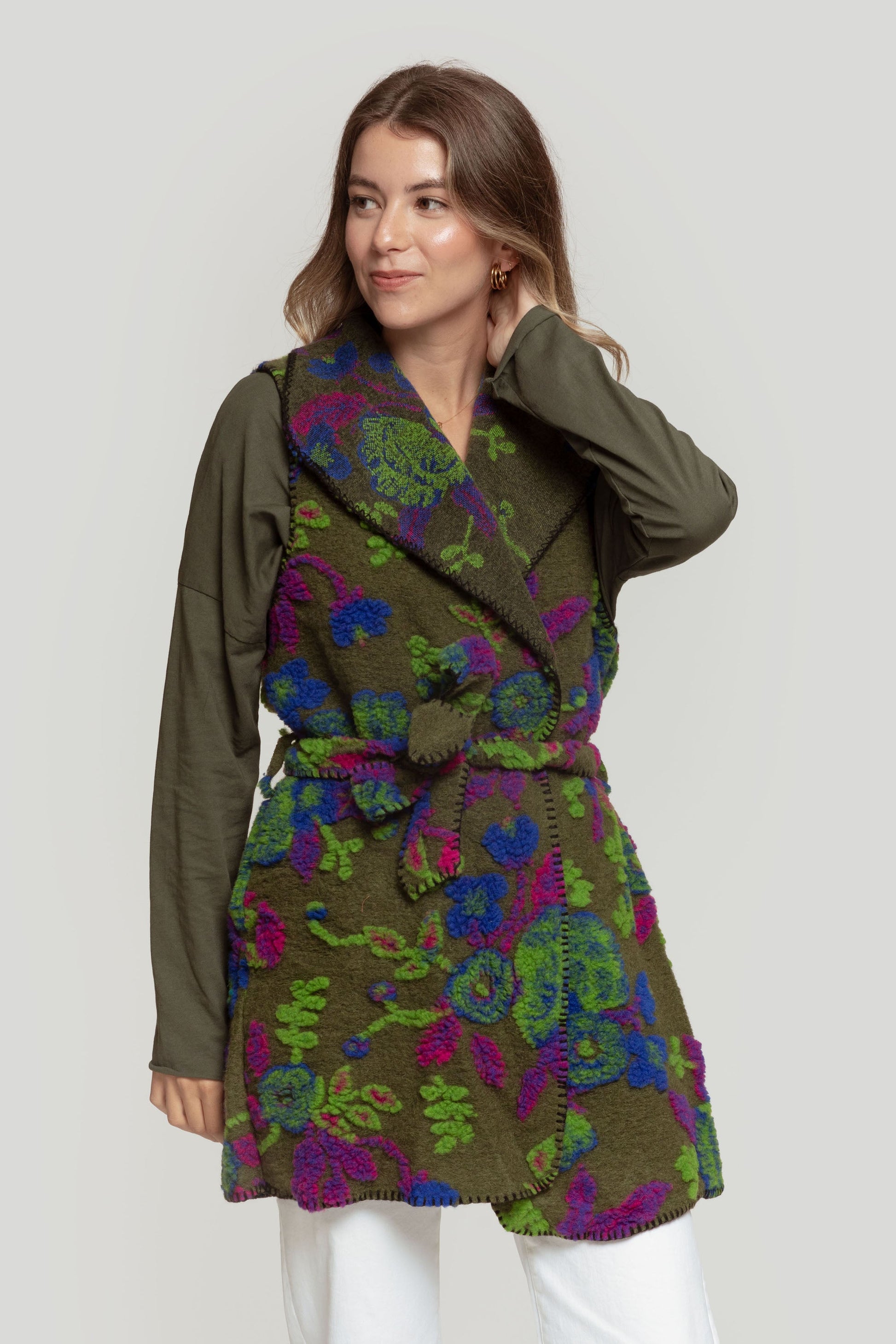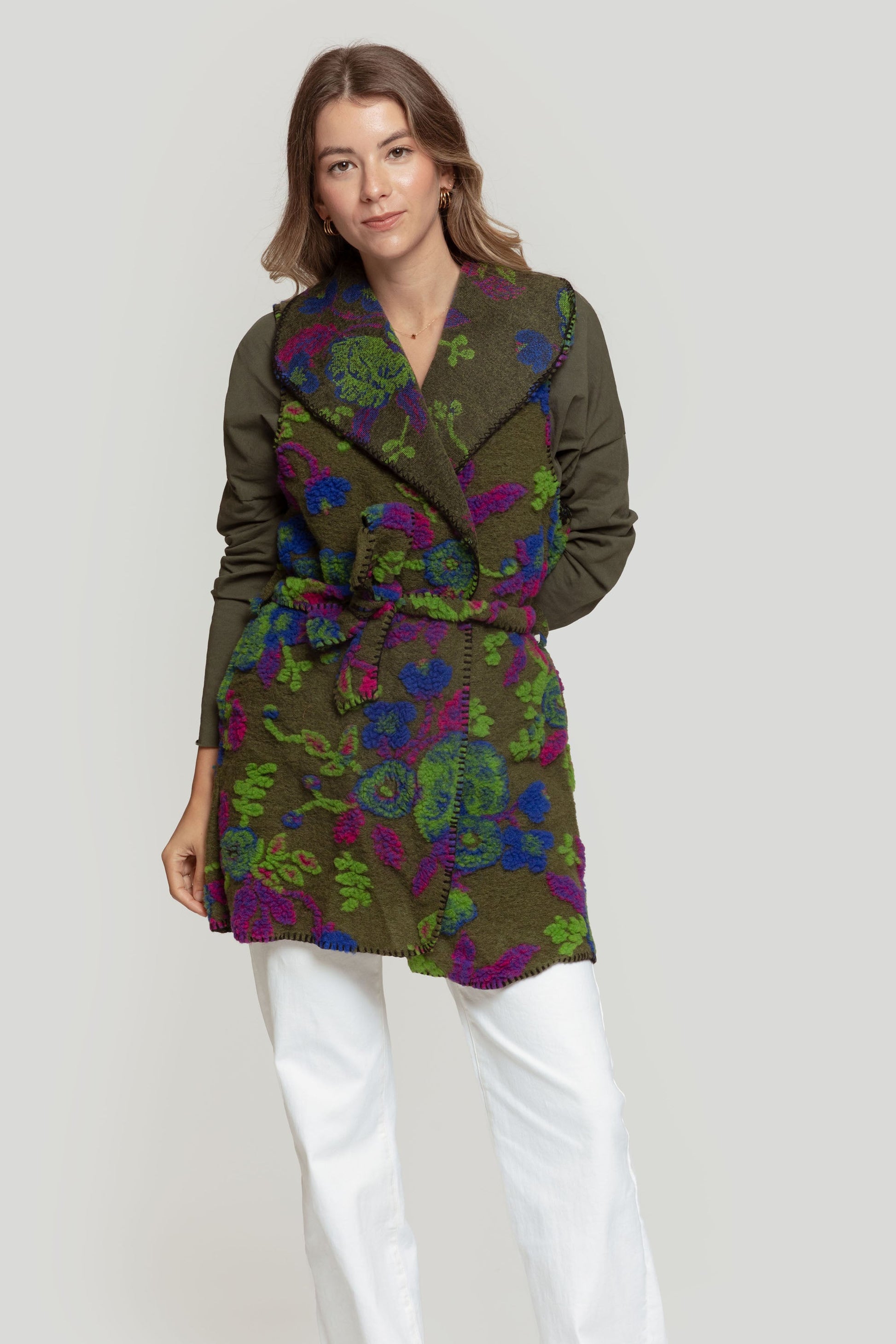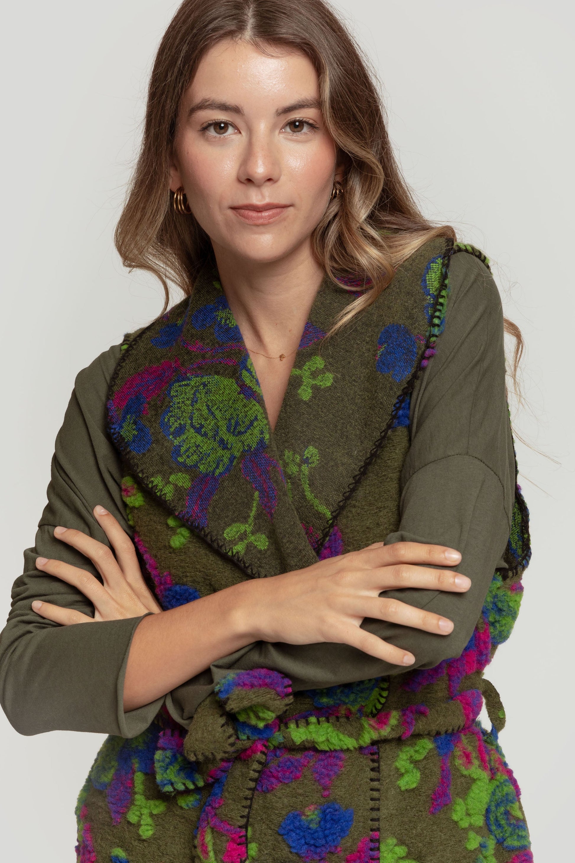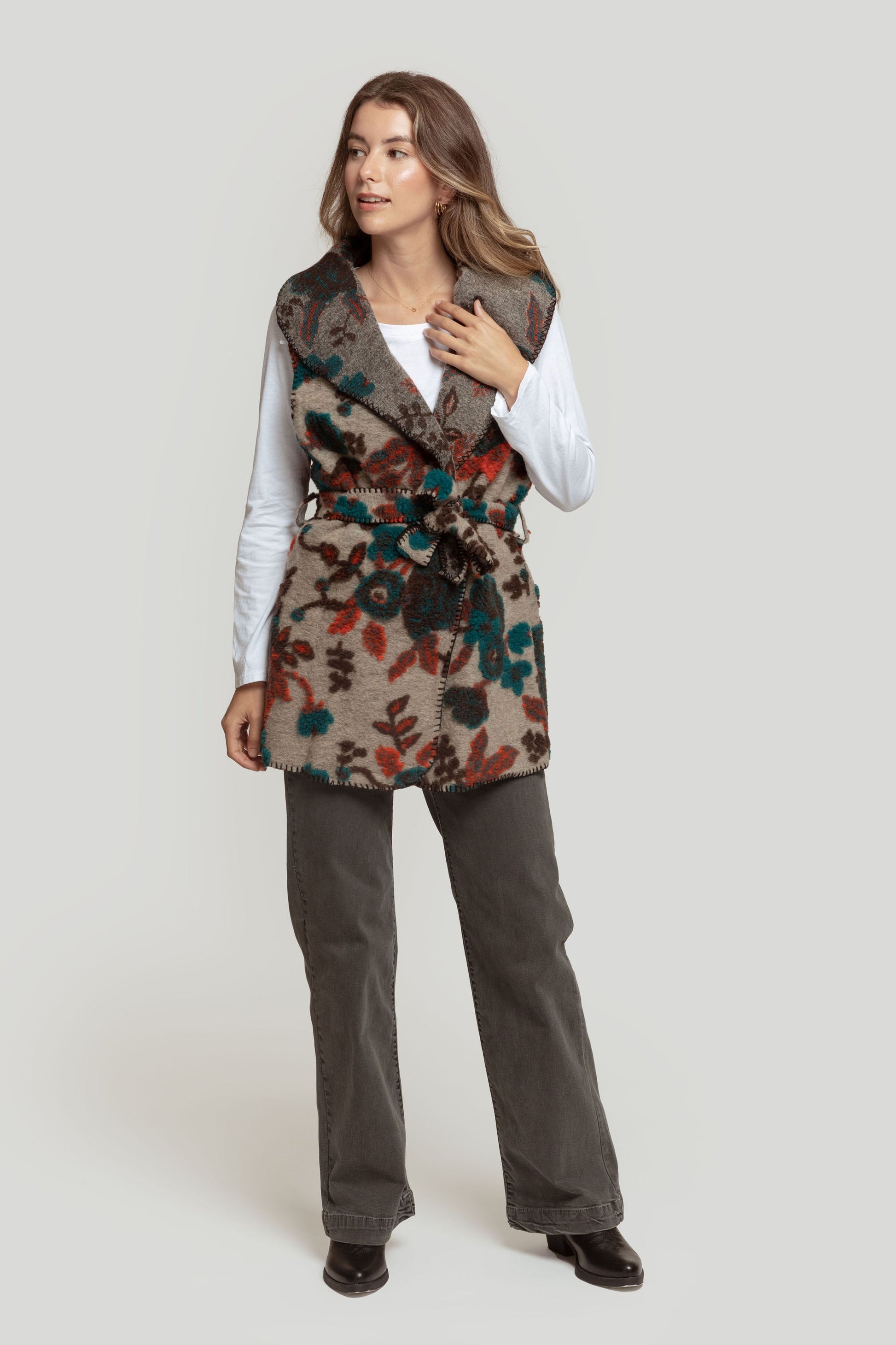 Tejido mezcla lana. Diseño estructurado. Diseño estampado. Diseño recto. Diseño cruzado. Cuello solapa. Sin mangas. Cinturón a contraste. No forrado. Talla única. Altura modelo 1,70 m.