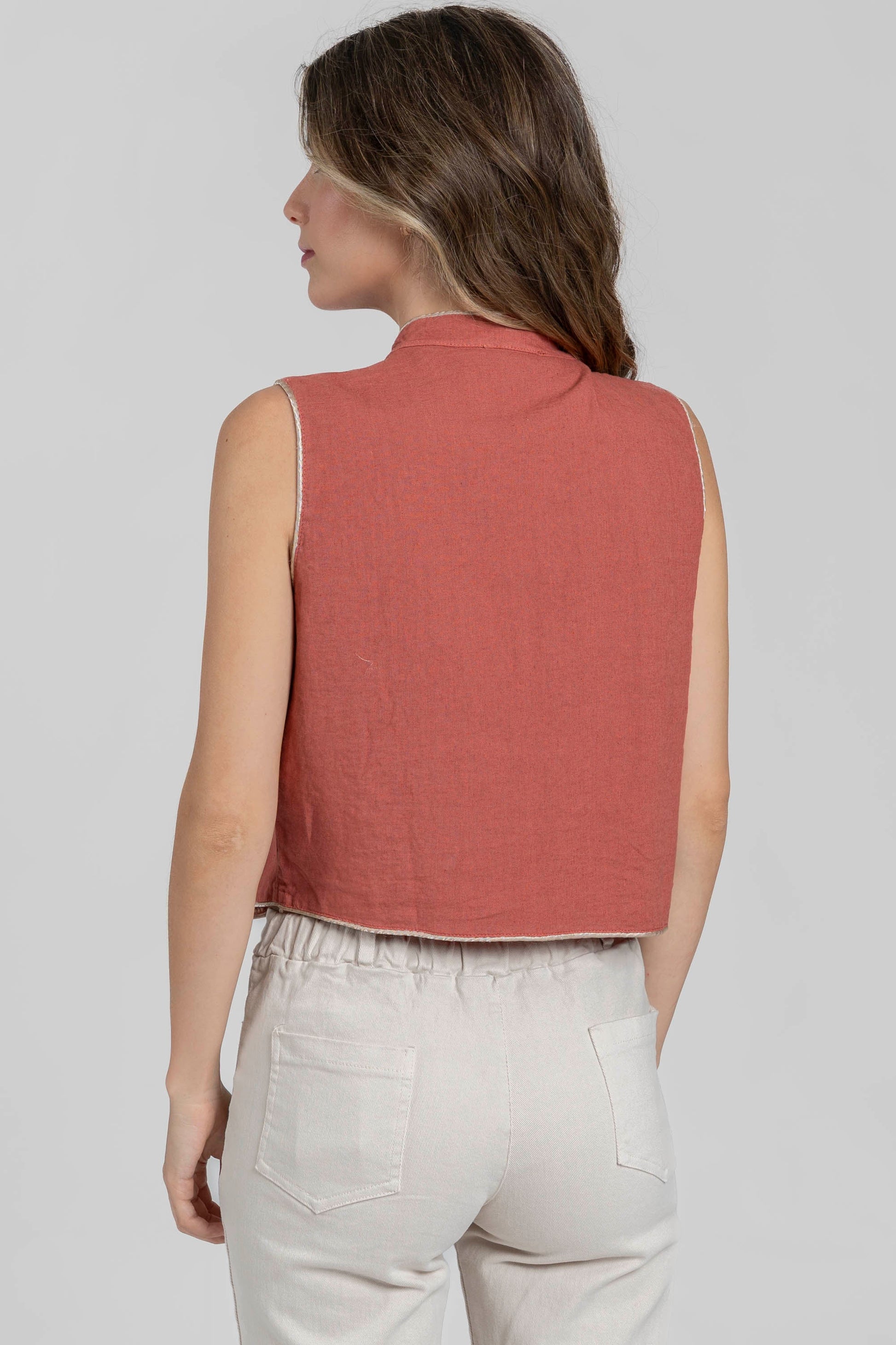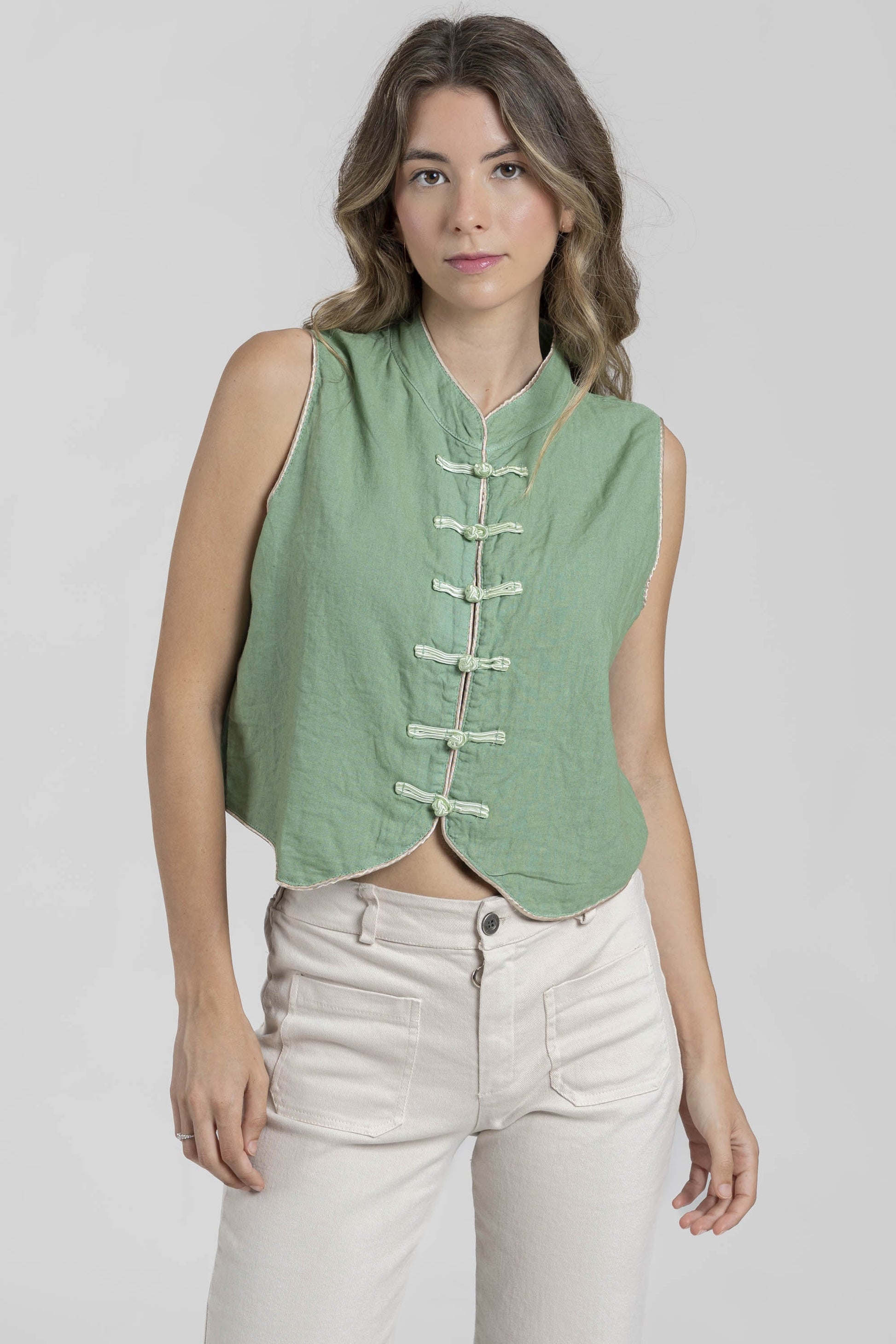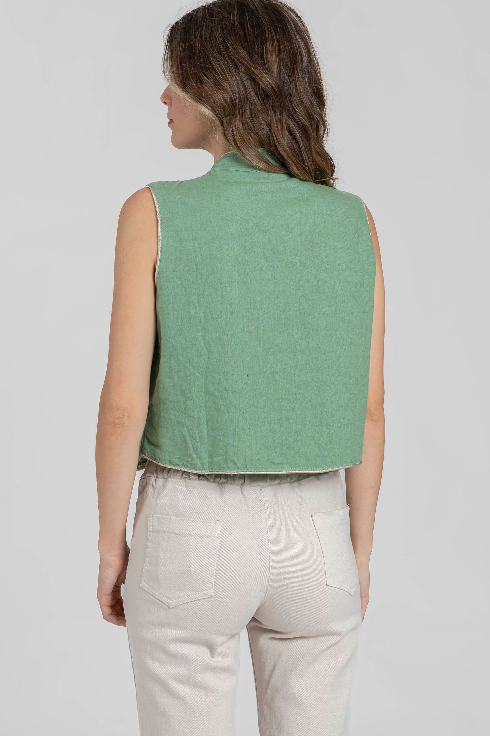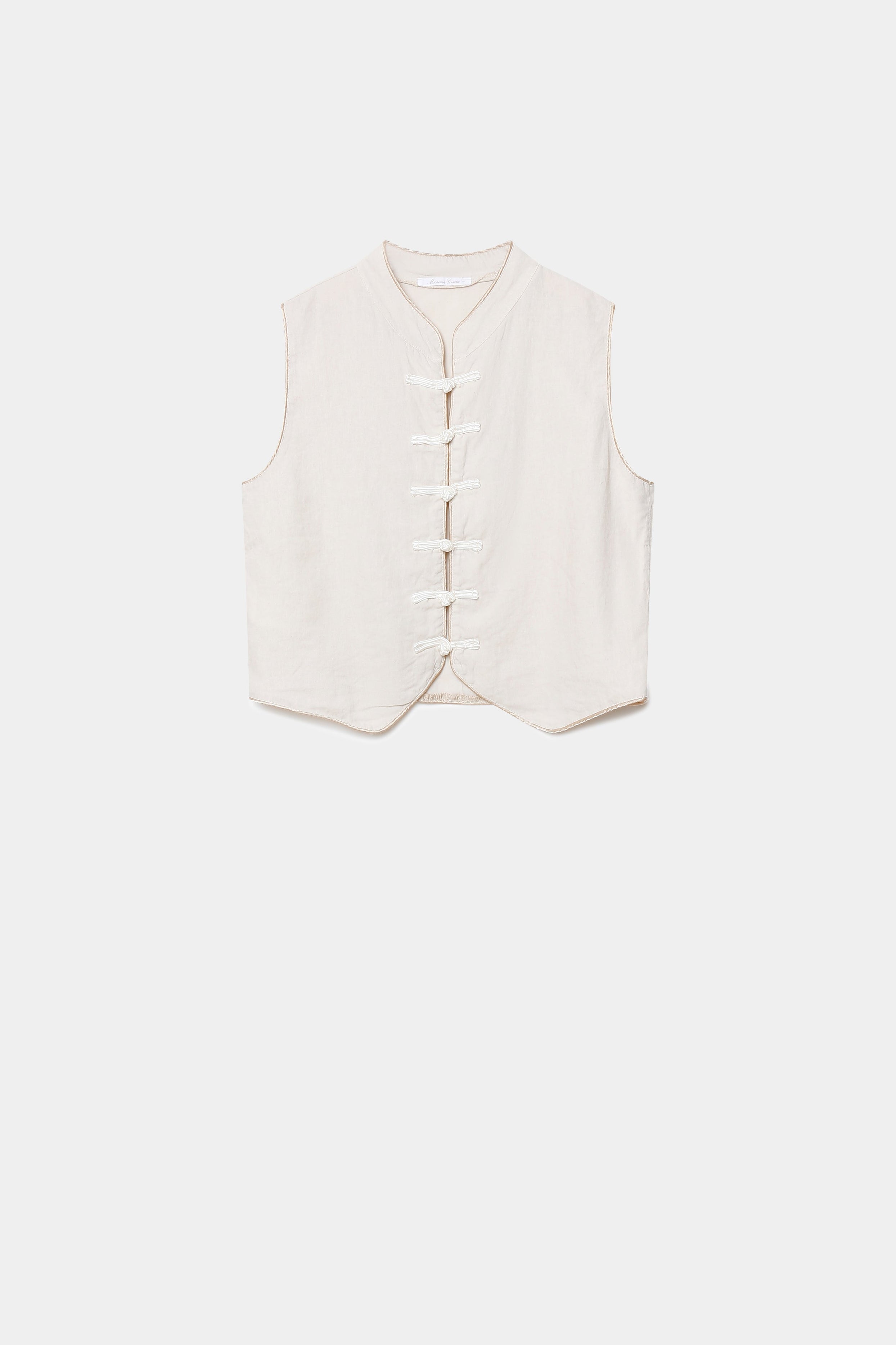 Tejido mezcla lino. Manga sisa. Cierre botones. Talla S. Altura modelo: 1.70 m