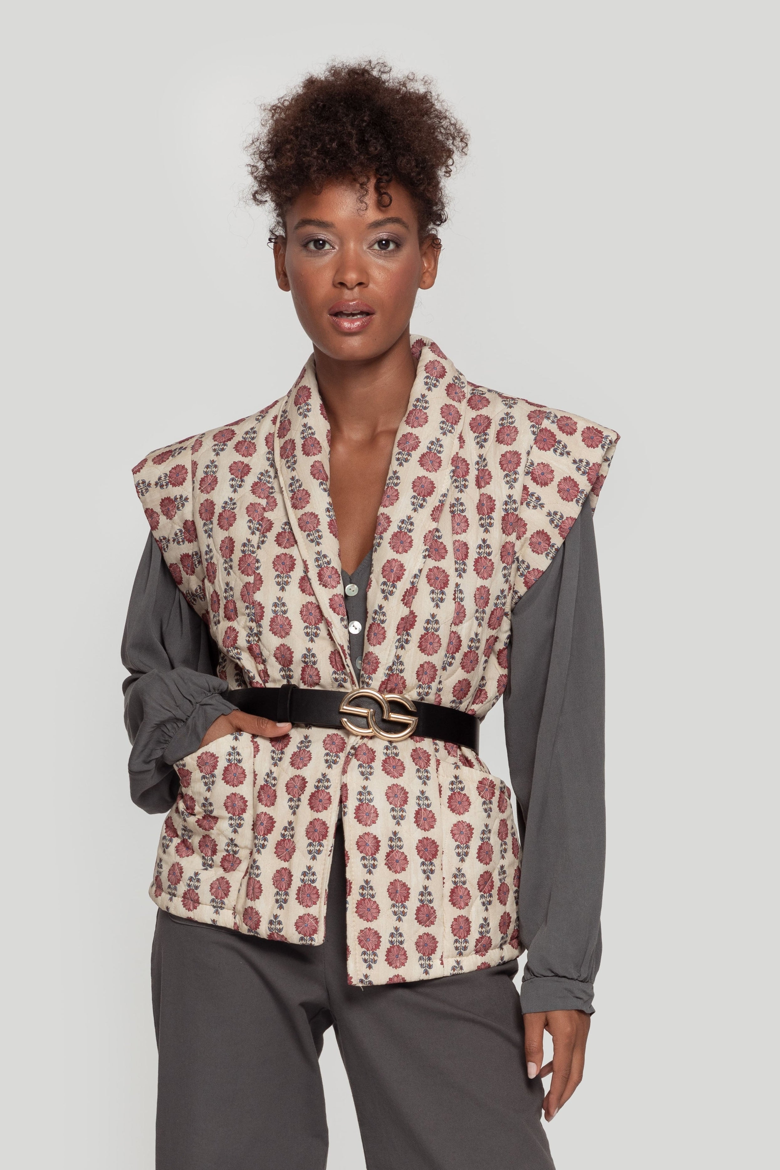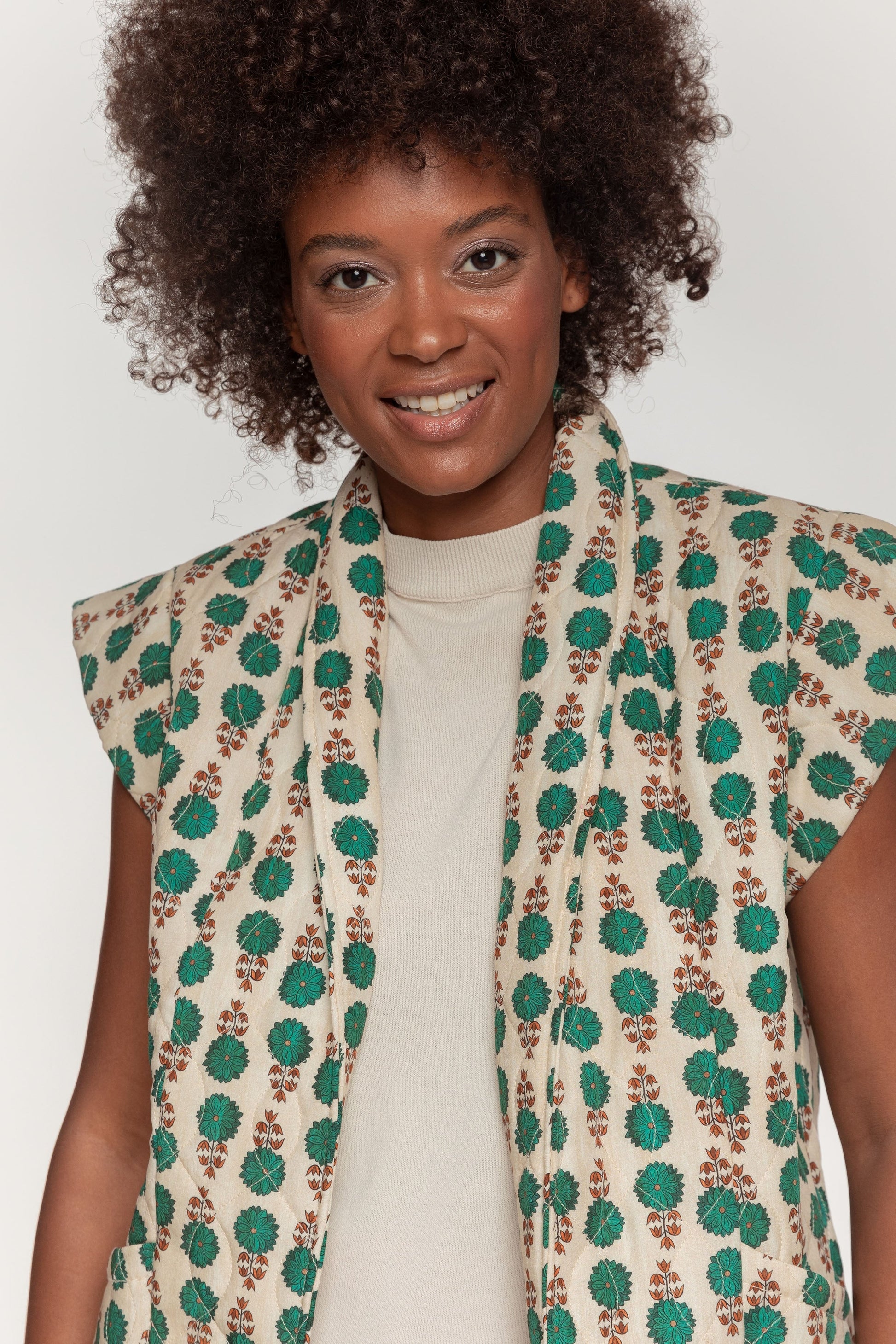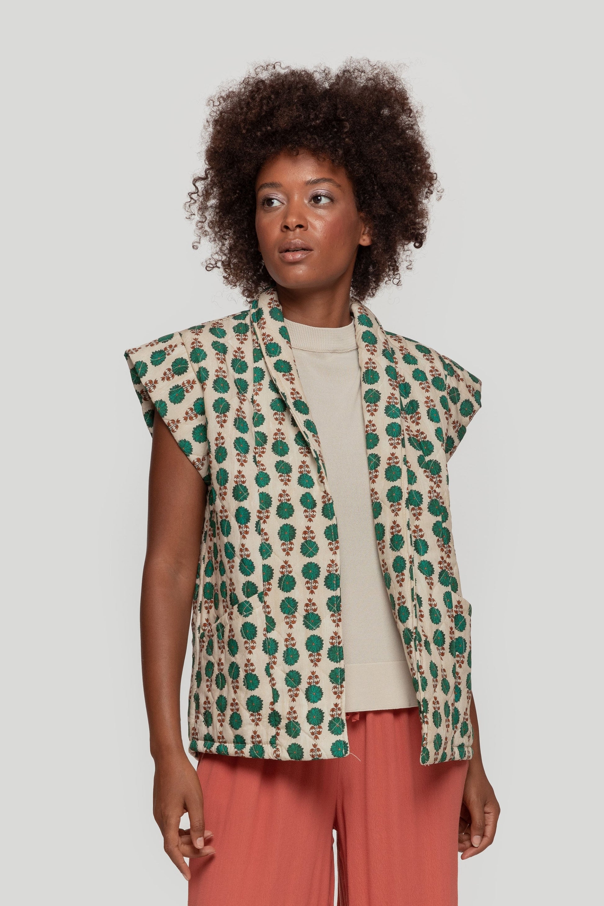 Tejido acolchado. Diseño estampado. Diseño entallado. Cuello solapas. Sin mangas. Abierto. Forrado. Talla modelo: S. Altura modelo: 1,70 m.