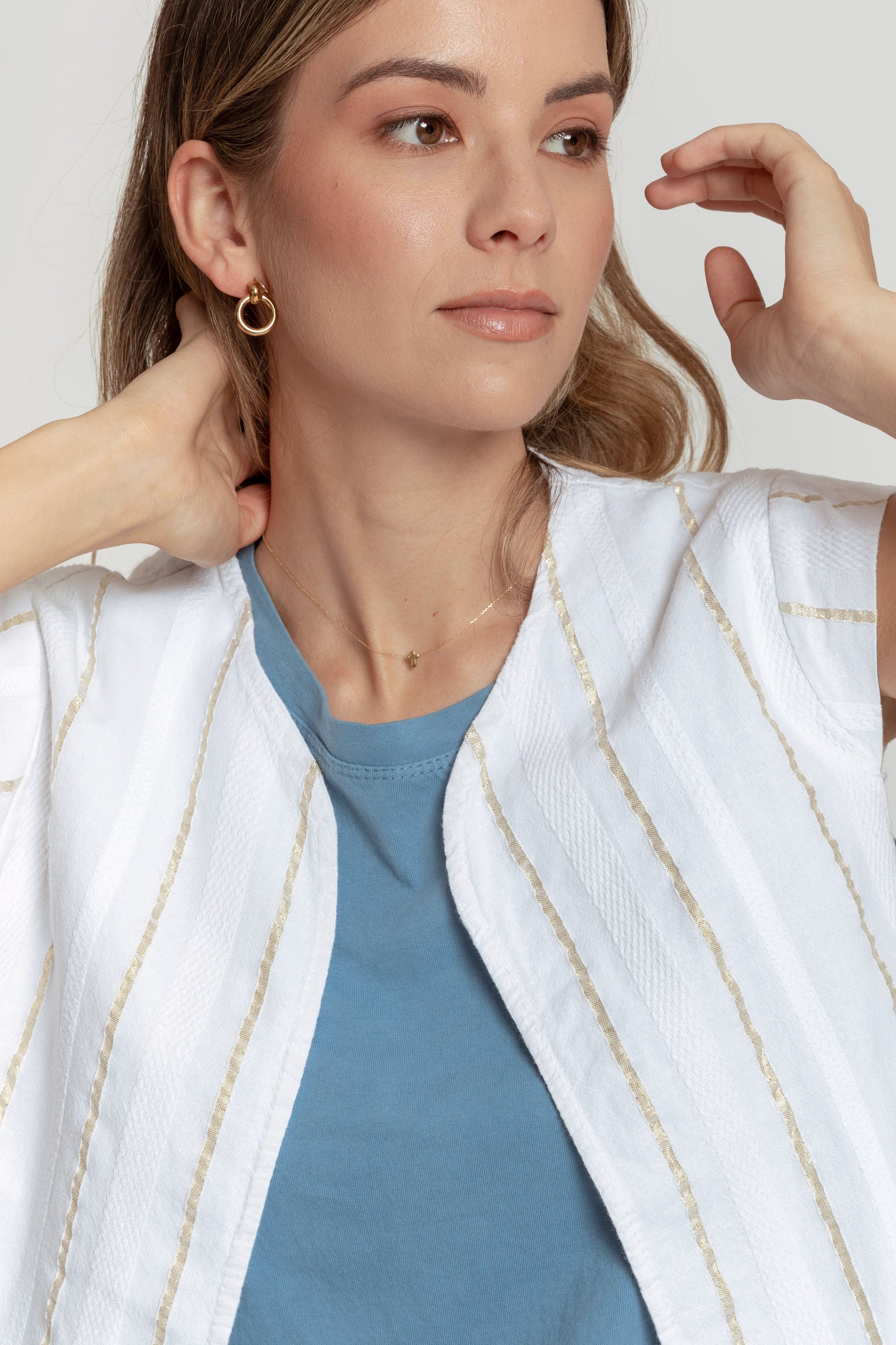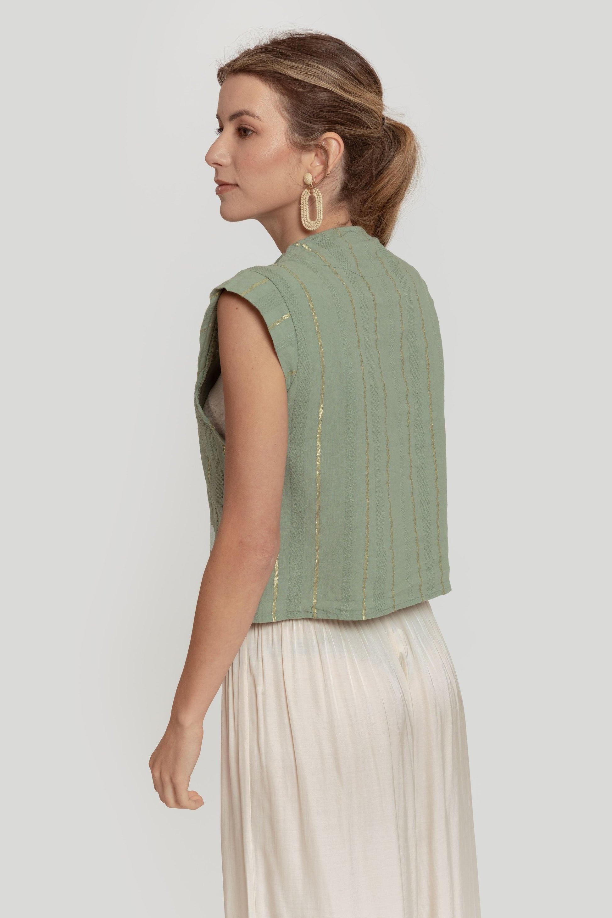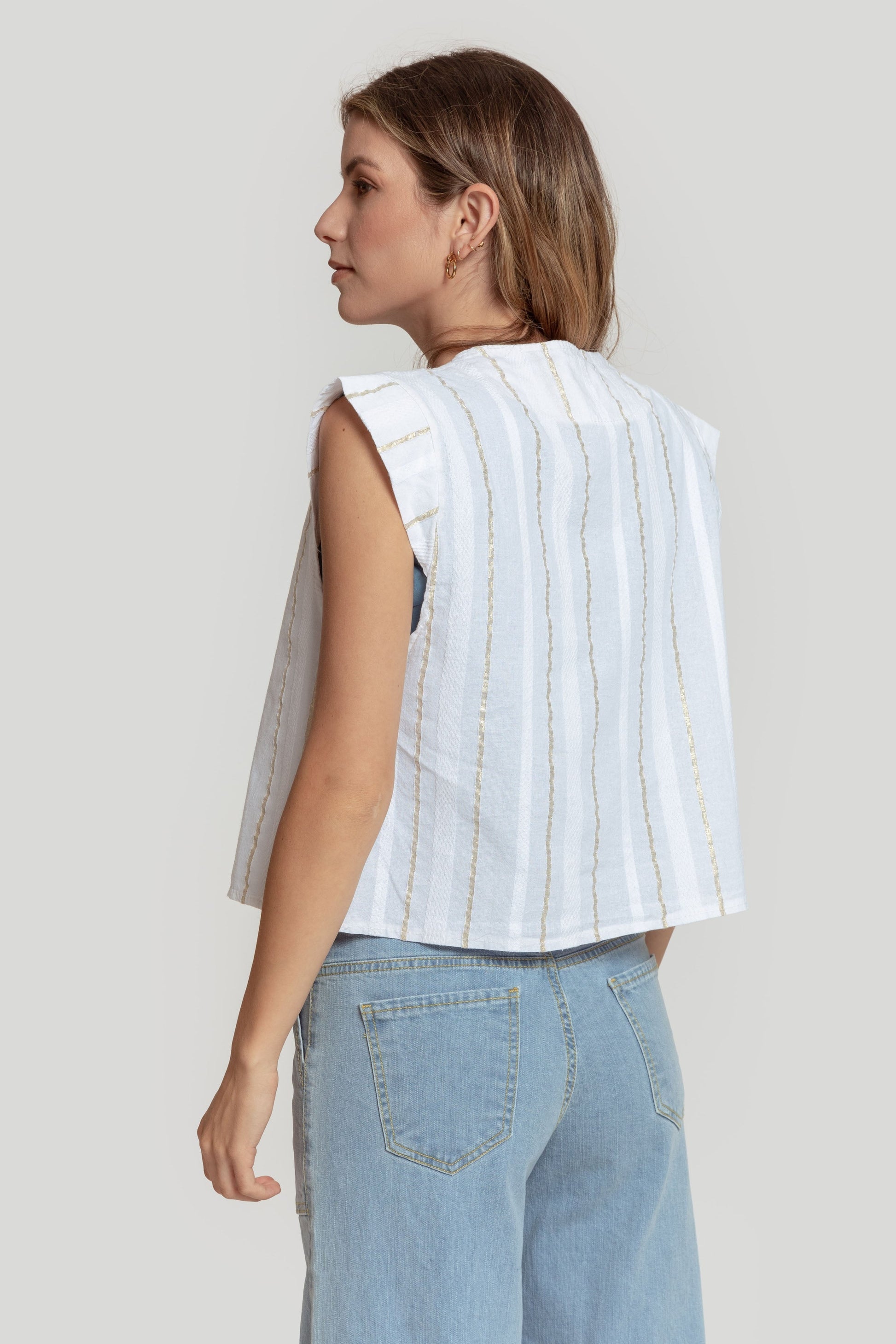Tejido mezcla de algodón. Diseño estampado. Diseño recto. Cuello redondo. Manga sisa. Trama brillante. Talla modelo: S. Altura modelo 1,70 m.