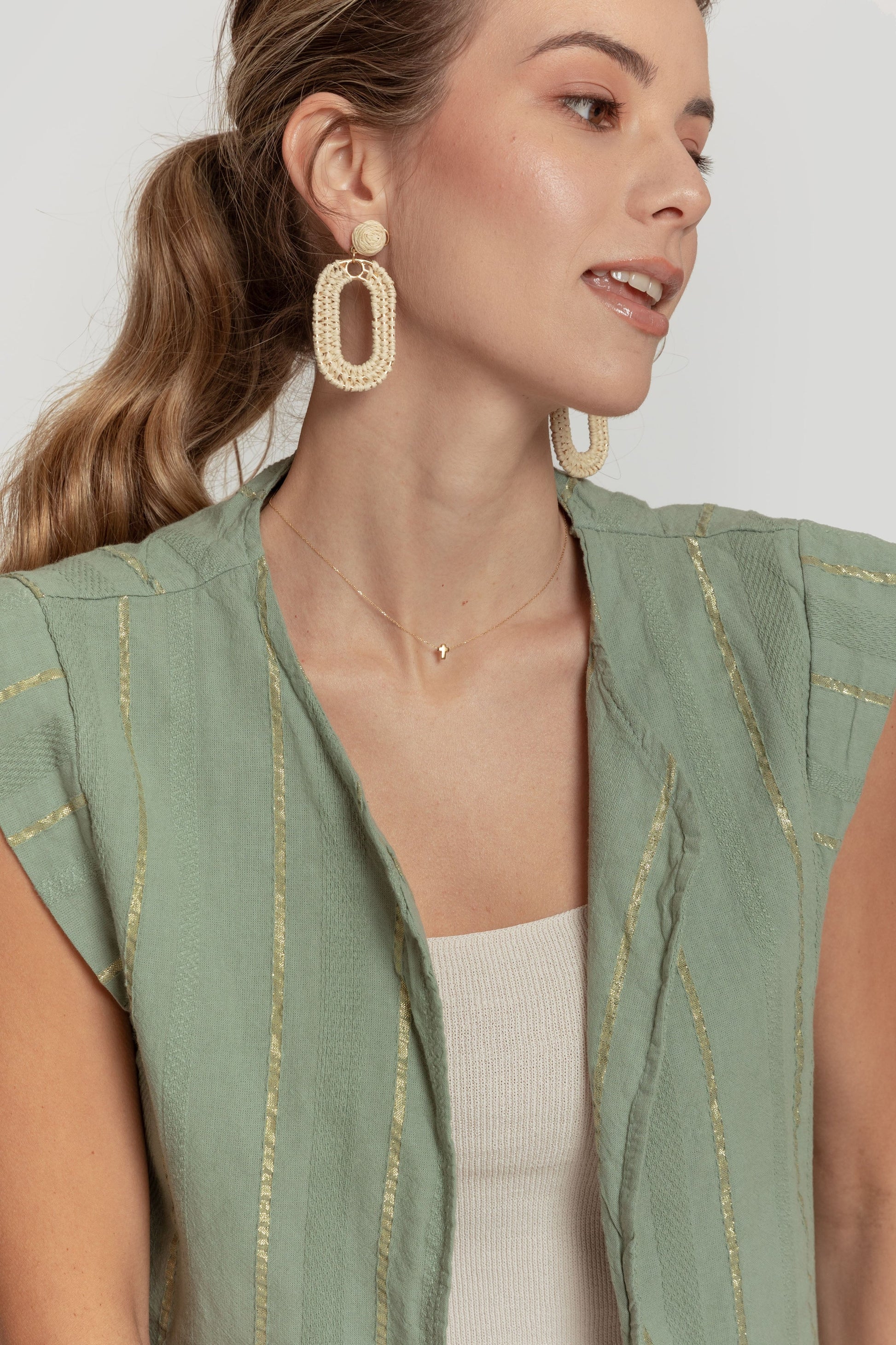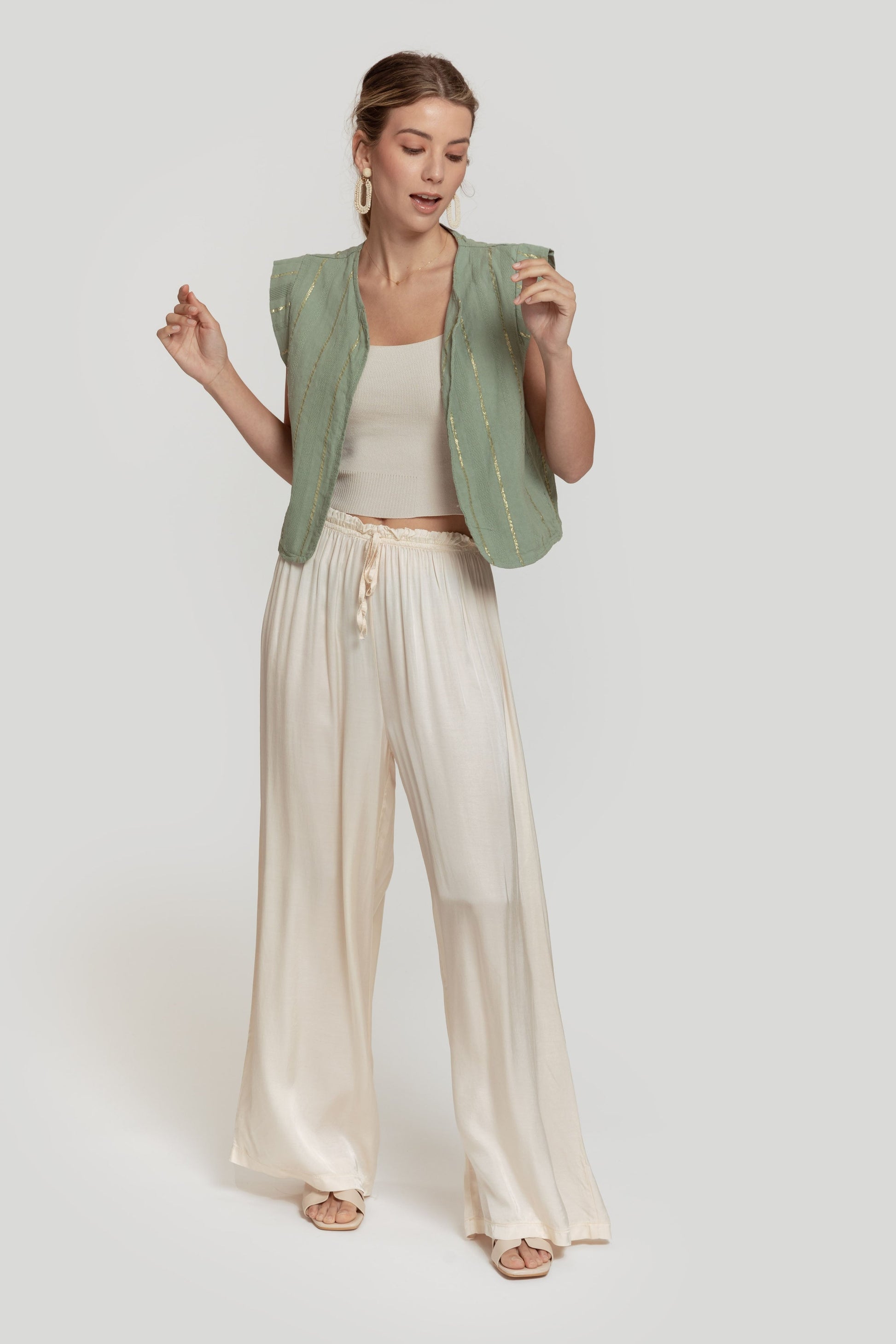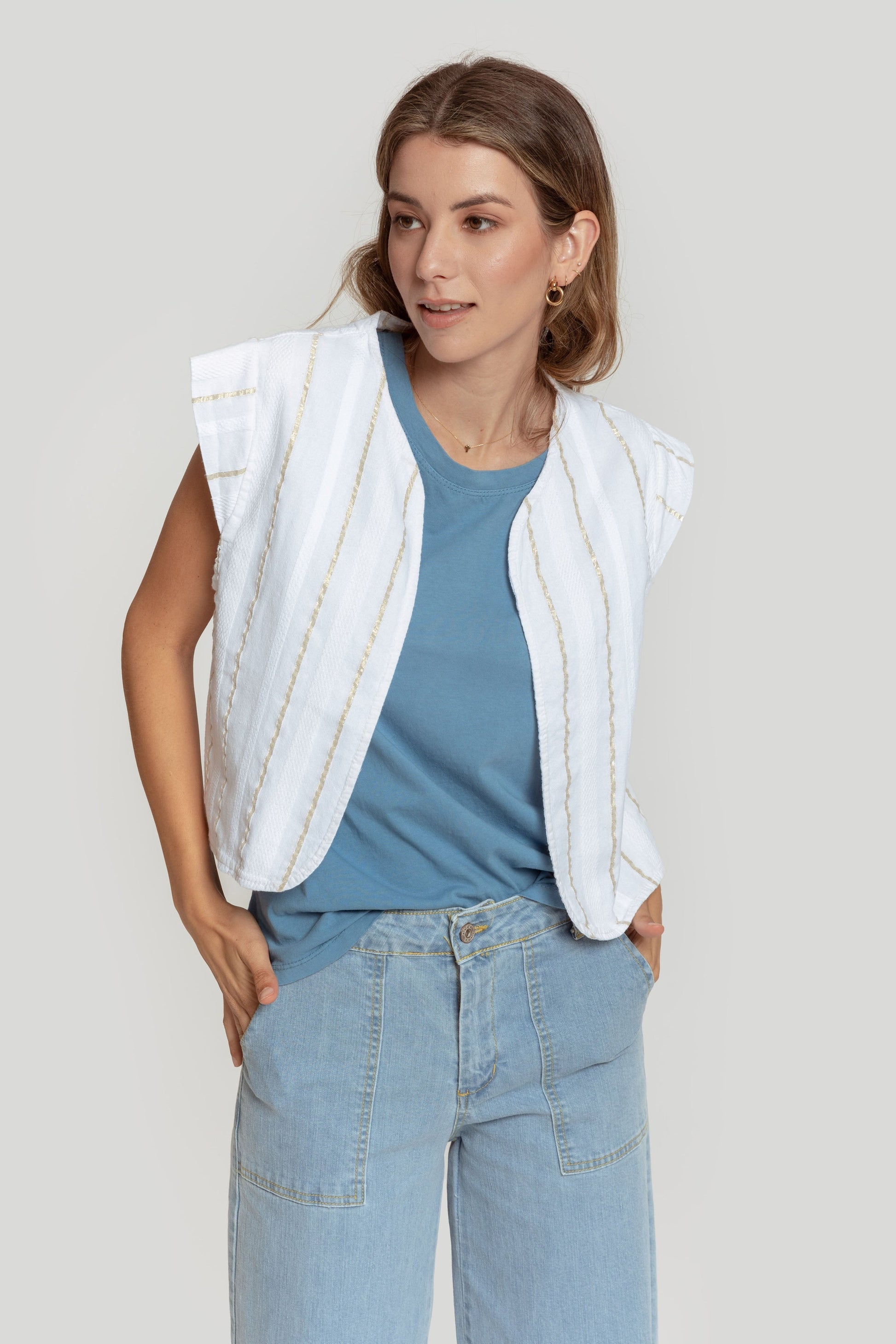 Tejido mezcla de algodón. Diseño estampado. Diseño recto. Cuello redondo. Manga sisa. Trama brillante. Talla modelo: S. Altura modelo 1,70 m.