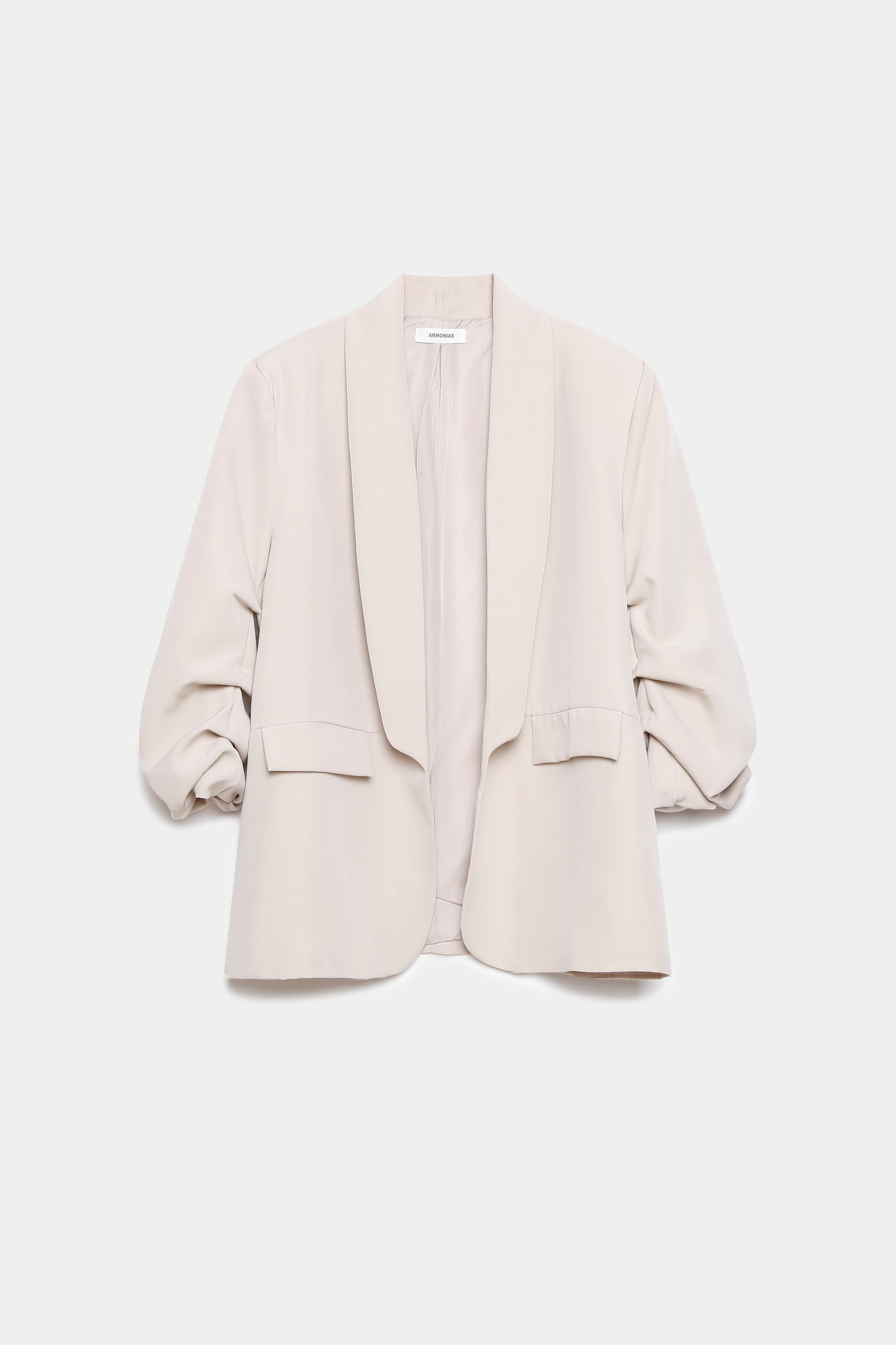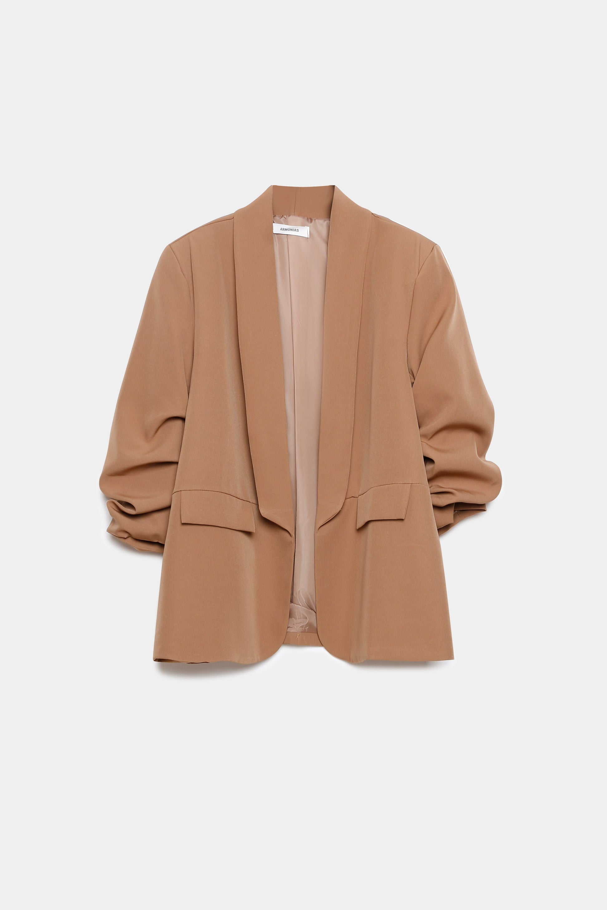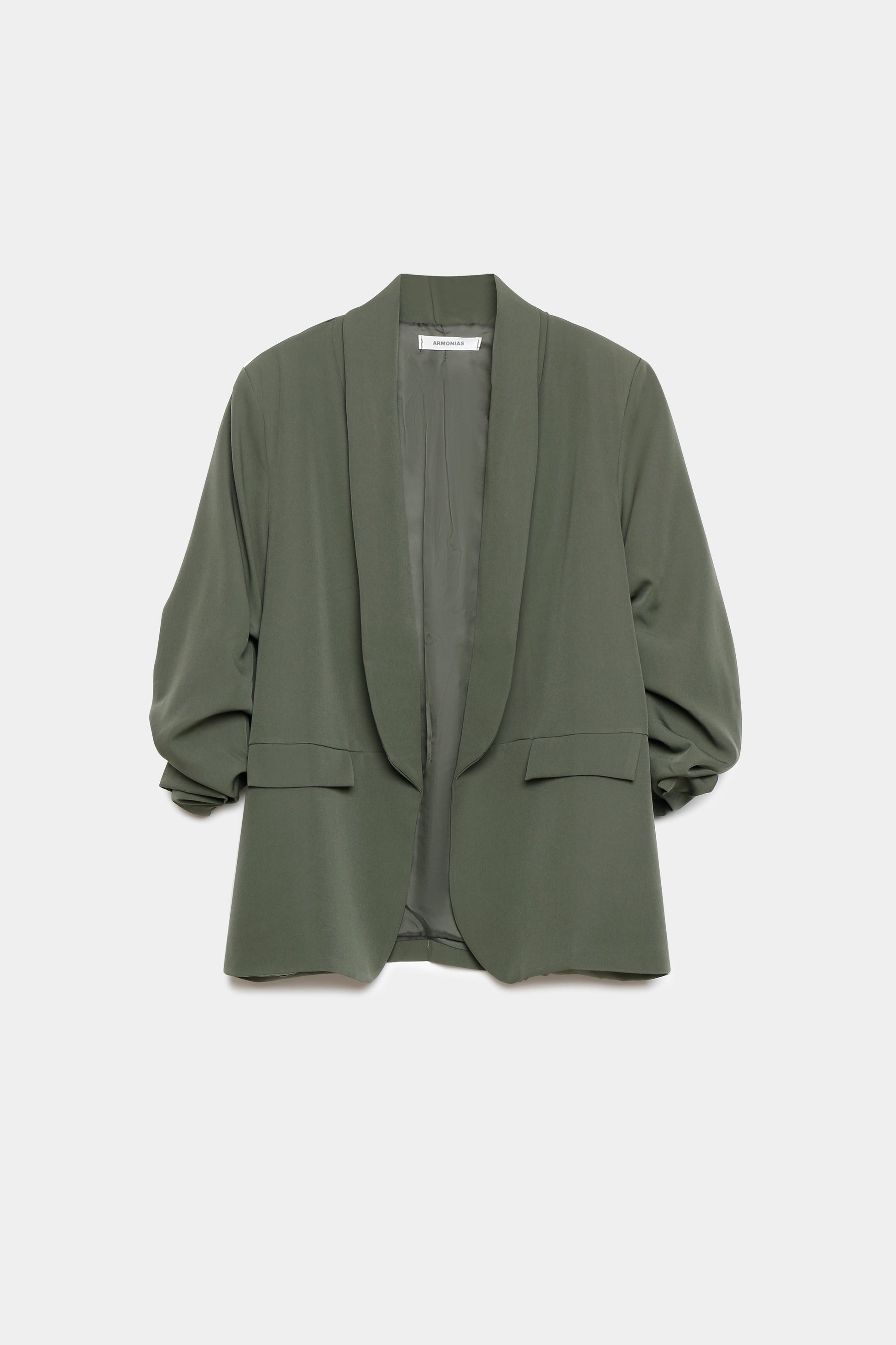 Tallaje grande. Tejido fluido. Estilo blazer. Diseño recto. Cuello solapa. Manga larga. Manga fruncida. Hombros estructurados. Hombreras. Sin cierre. Mueca decorativa. Forro interior.