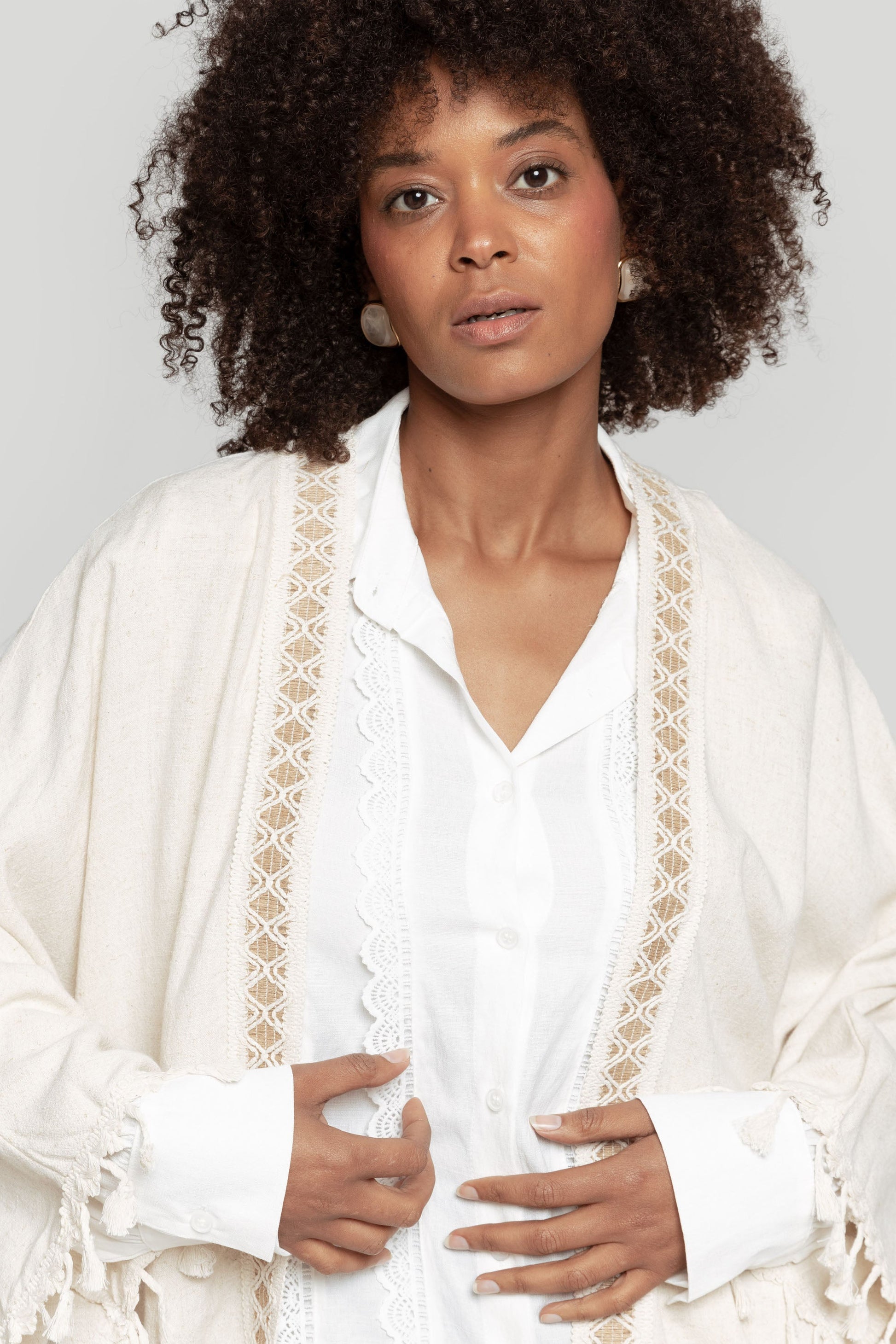 Tejido mezcla de lino. Diseño fluido. Manga corta. Abierto. Detalles a contraste. Bajo pompones. Talla modelo: M. Altura modelo: 1,66 m.