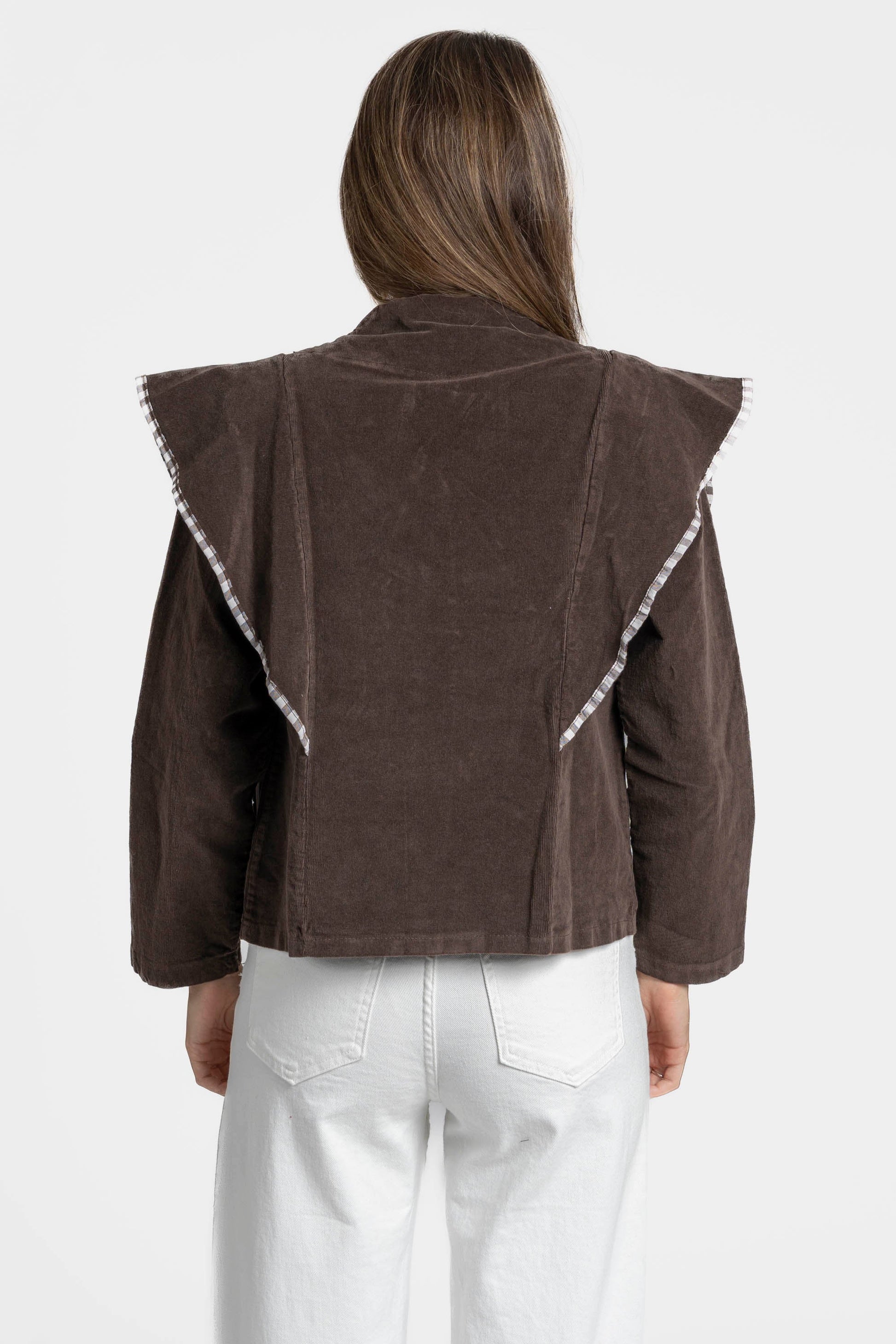 Tejido de pana. Escote pico. Manga larga. Bolsillos delanteros. Cierre de botones.