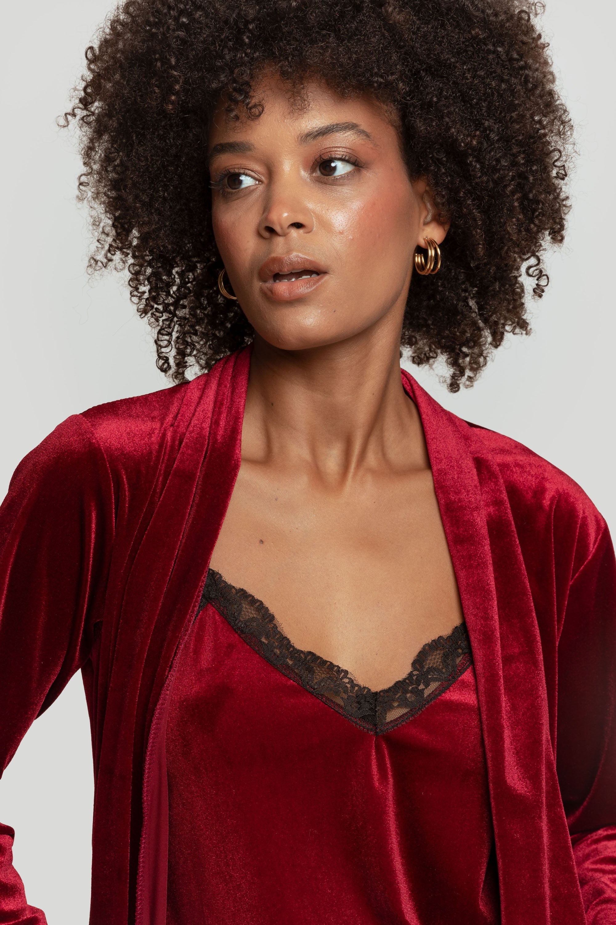 Tejido terciopelo. Diseño recto. Diseño largo. Cuello solapa. Manga larga. Aberturas laterales. Sin cierre. Talla única. Altura modelo 1,66 m.