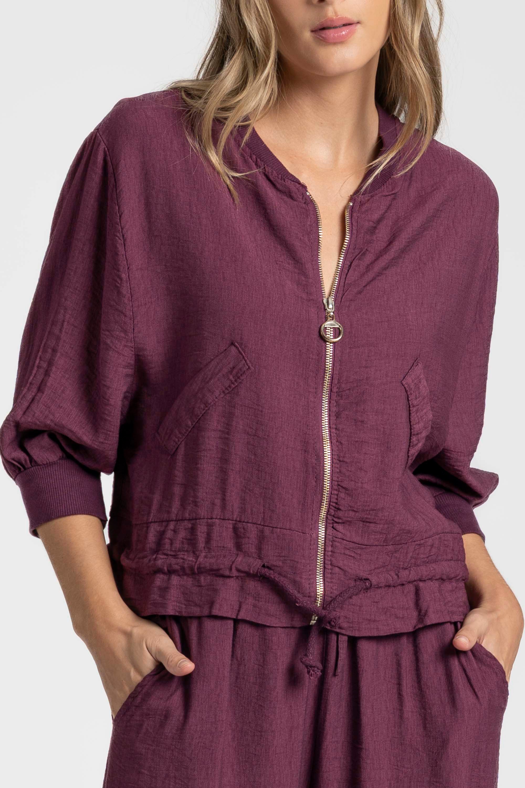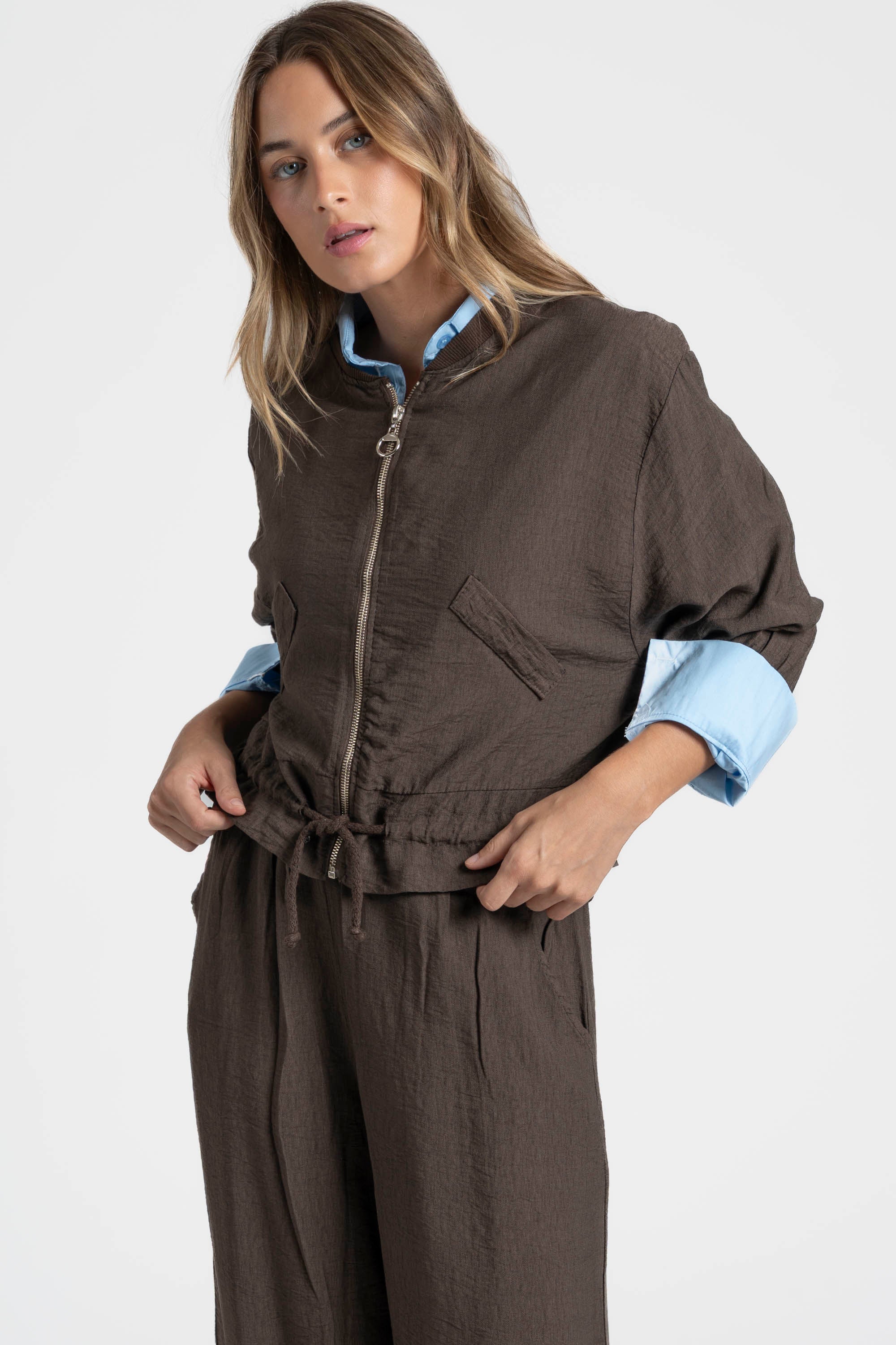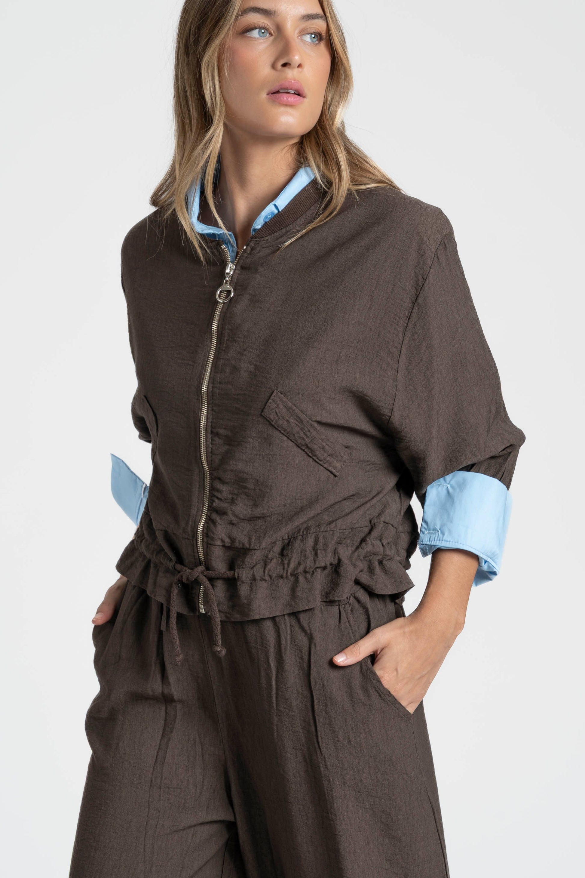 Tejido fluido. Cuello redondo. Manga 3/4. Cierre de cremallera. Ajustable con cordones. Bolsillos decorativos. Pantalón de tiro alto. Bolsillos laterales. Pernera ancha.