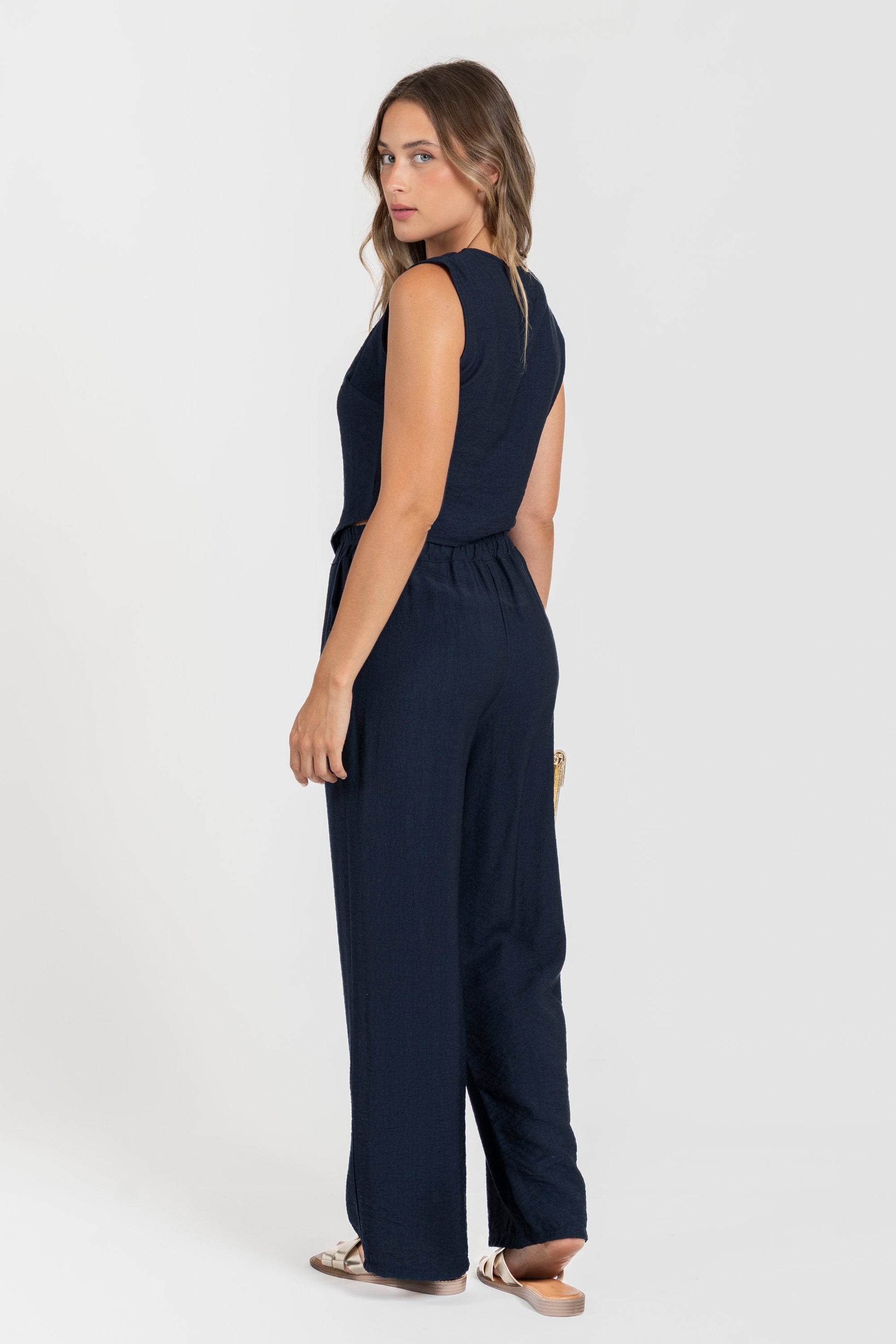 Conjunto de chaleco y pantalón. Chaleco cuello pico. Manga sisa. Cierre botones. Pantalón fluido. Cintura alta. Bolsillos laterales. Disponible en varios colores.