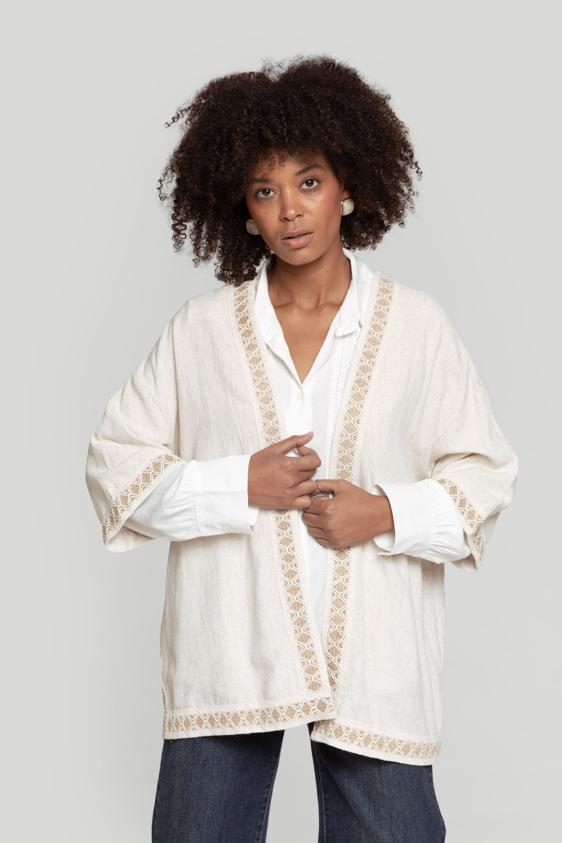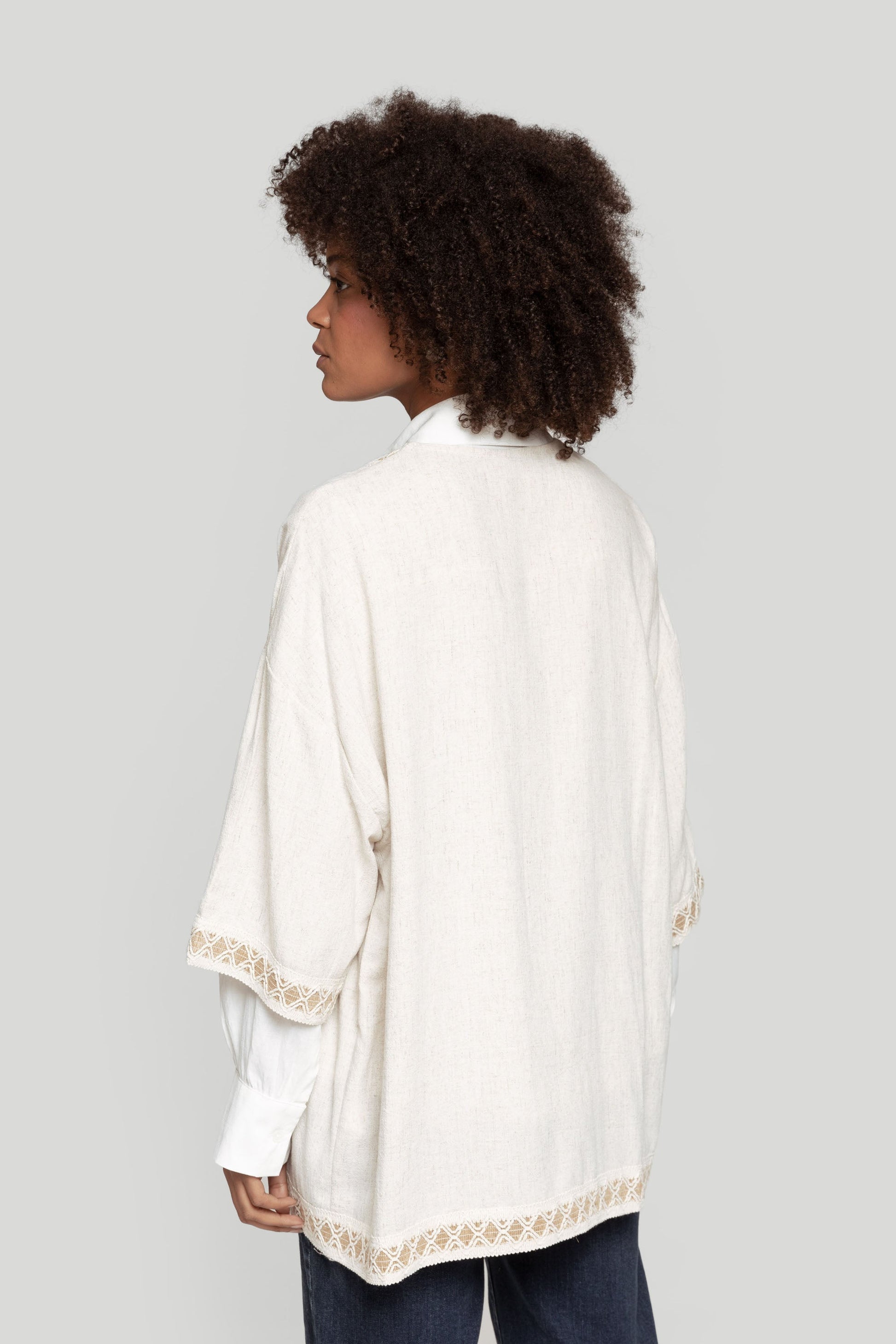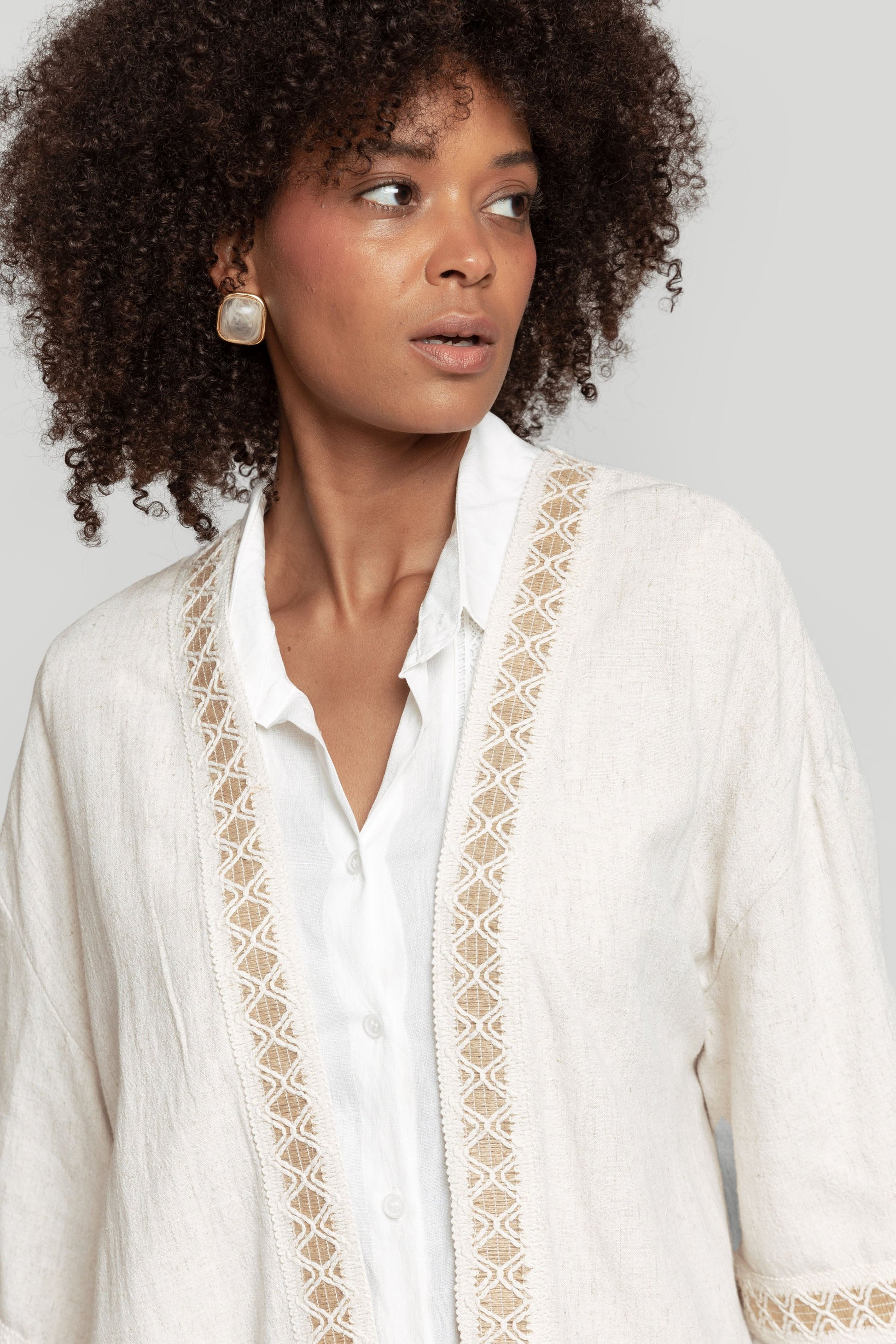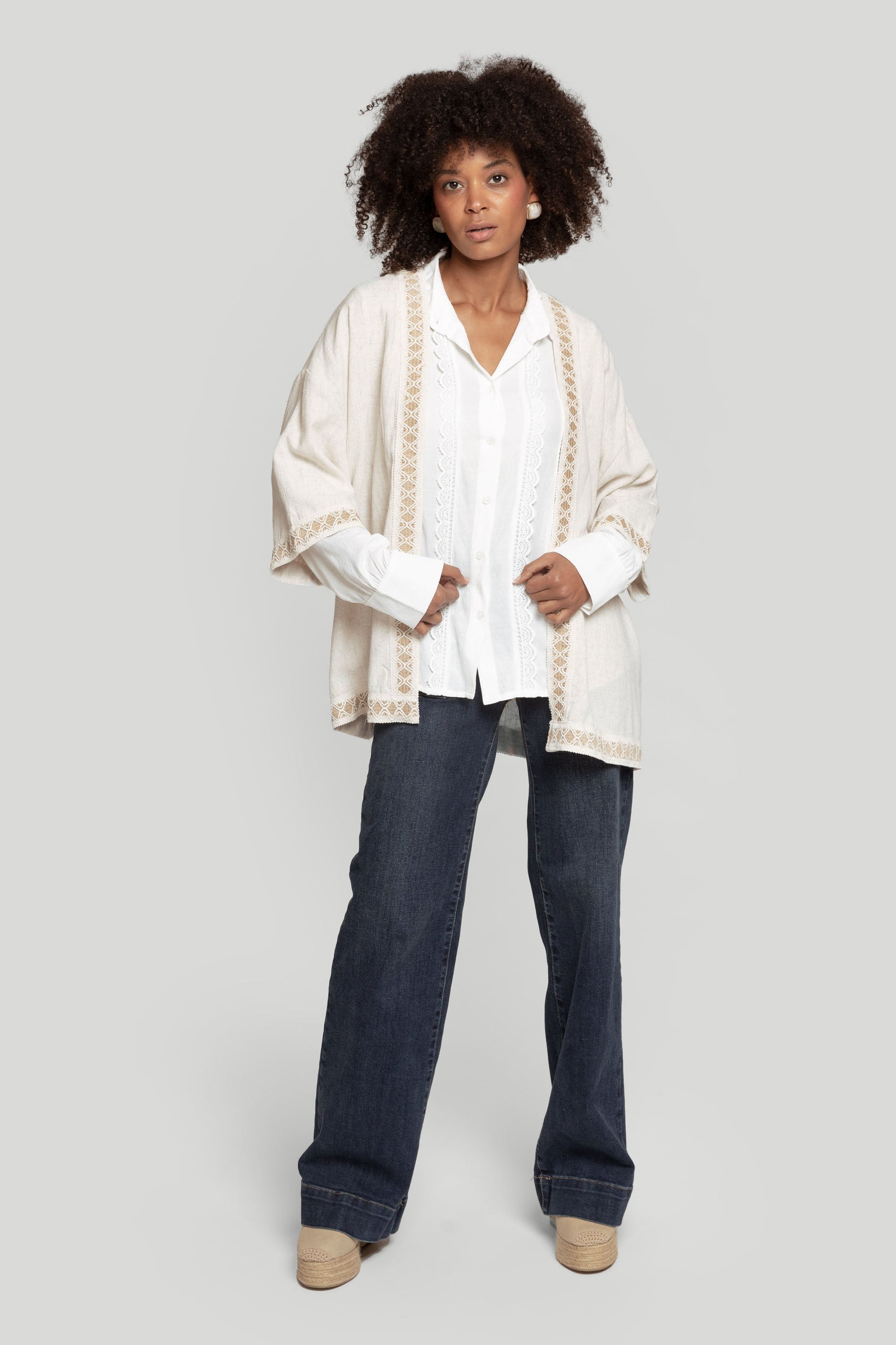 Tejido mezcla de lino. Diseño fluido. Manga corta. Abierto. Detalles crochet. Talla modelo: S. Altura modelo: 1,66 m.