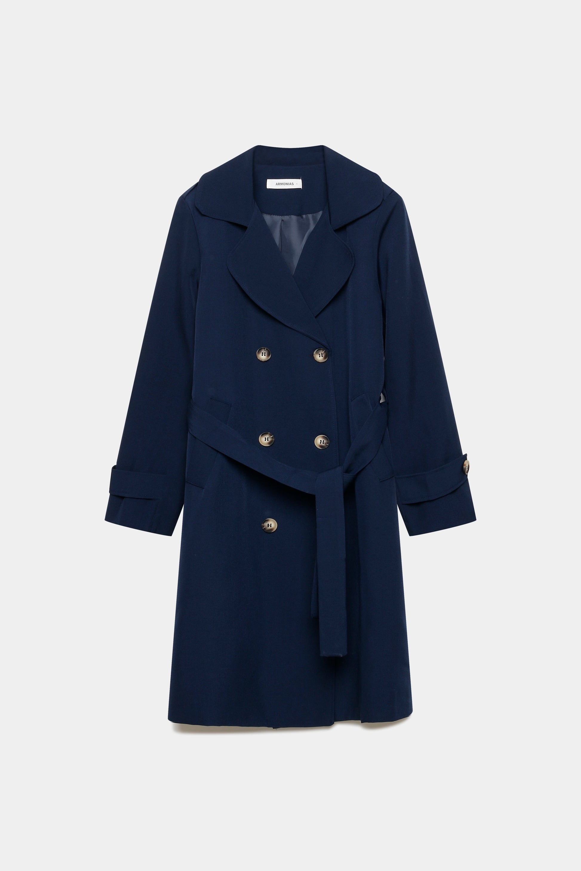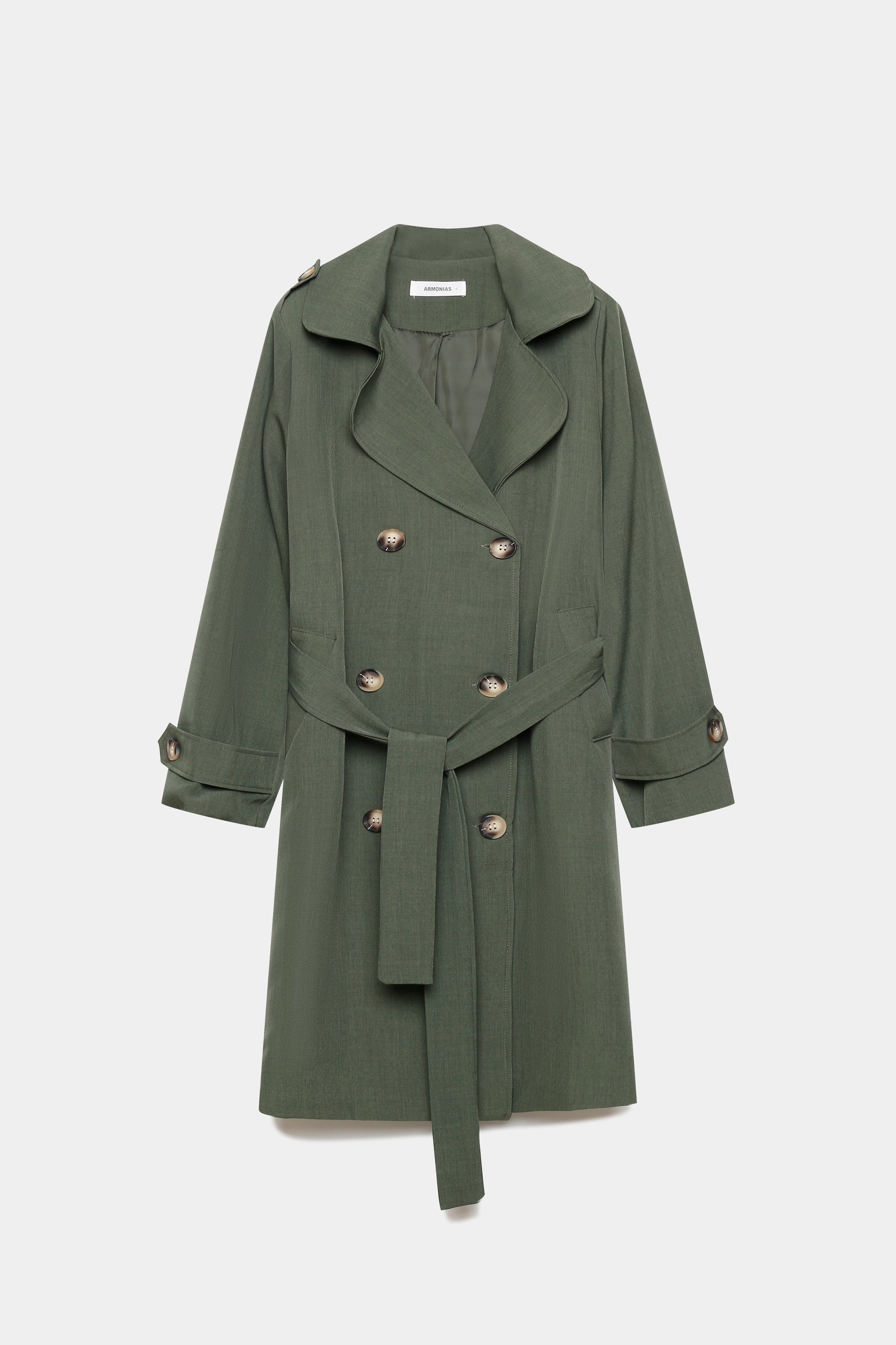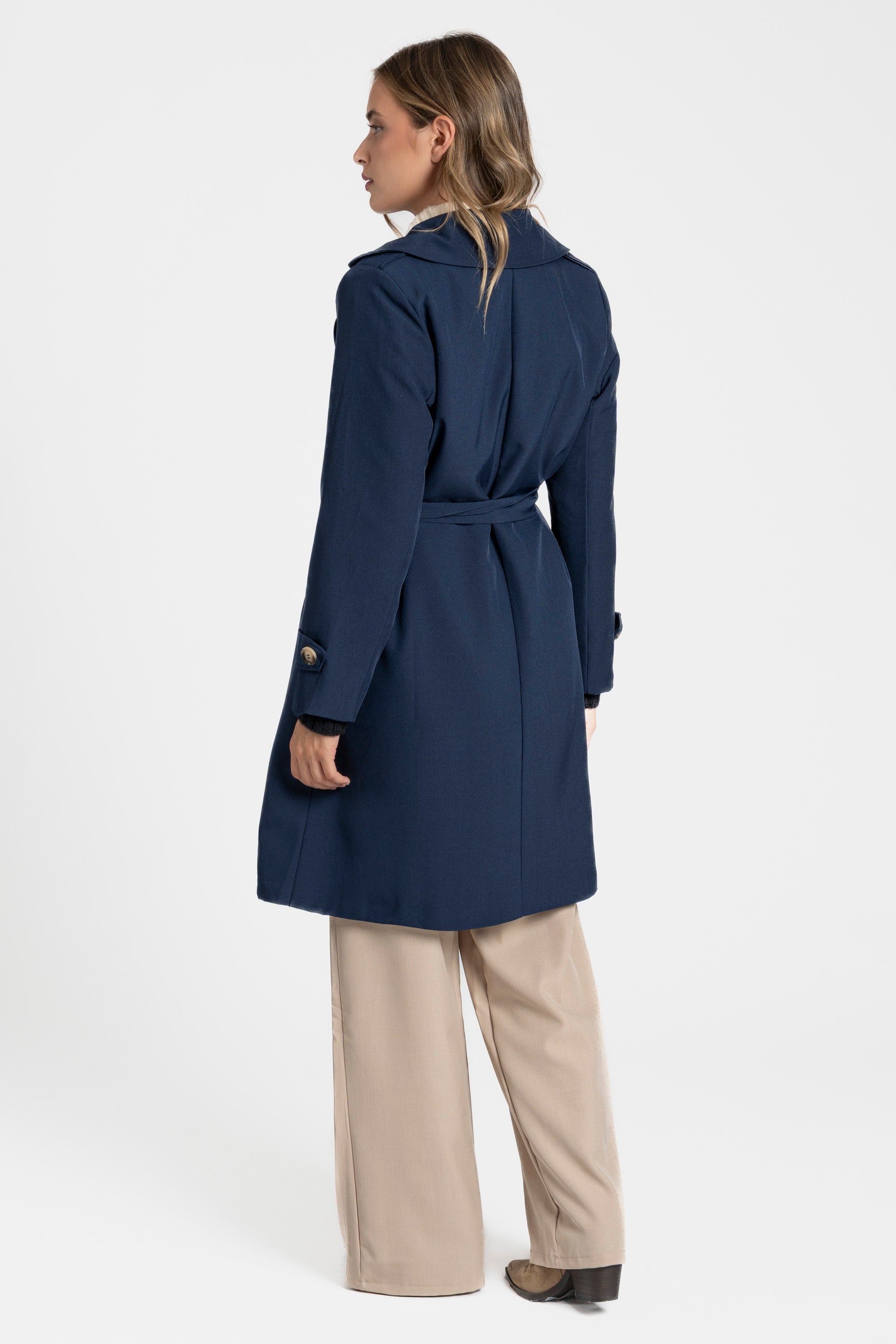 Trench de cuello solapa y manga larga. Bolsillos delanteros. Cierre frontal cruzado con botones y cinturón del mismo tejido.