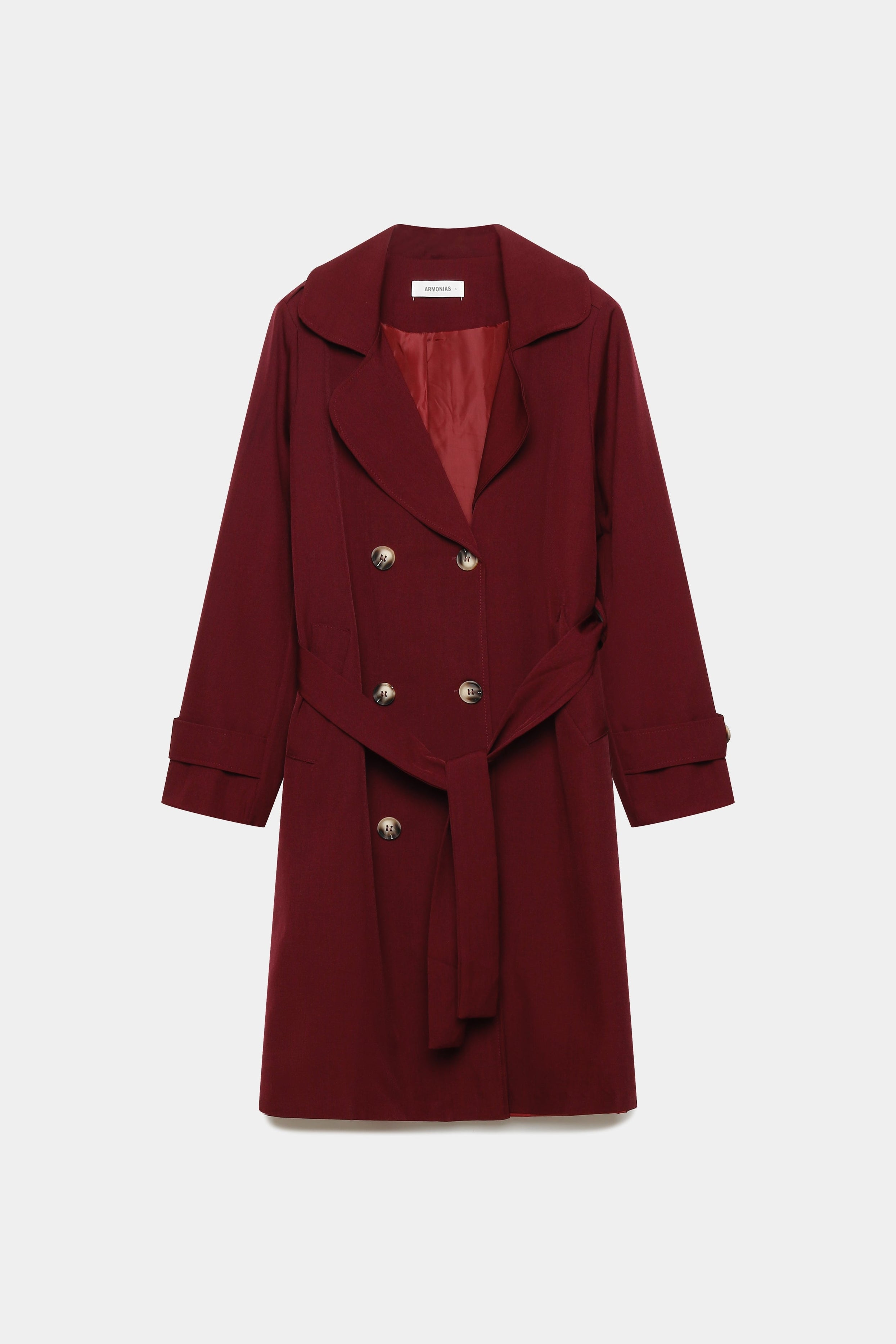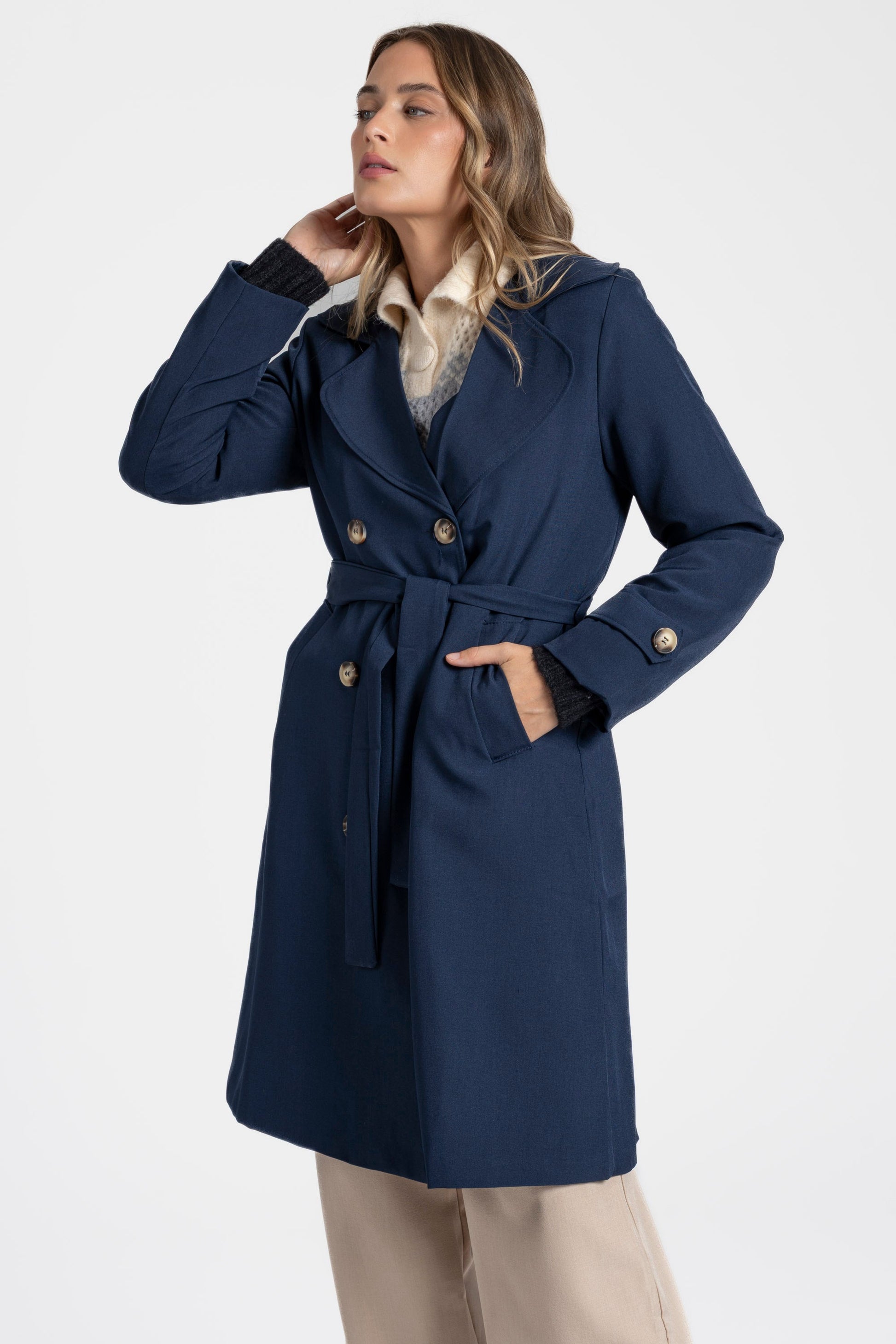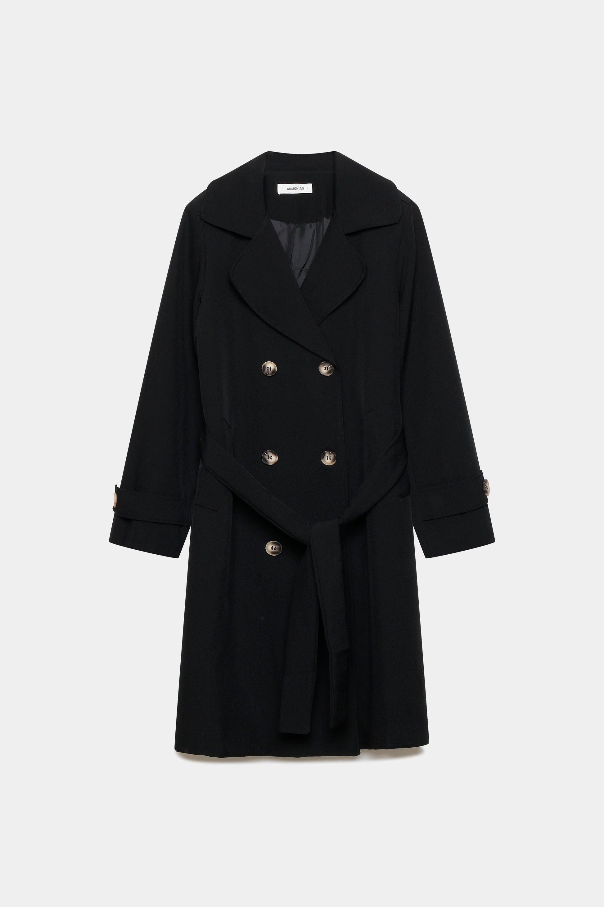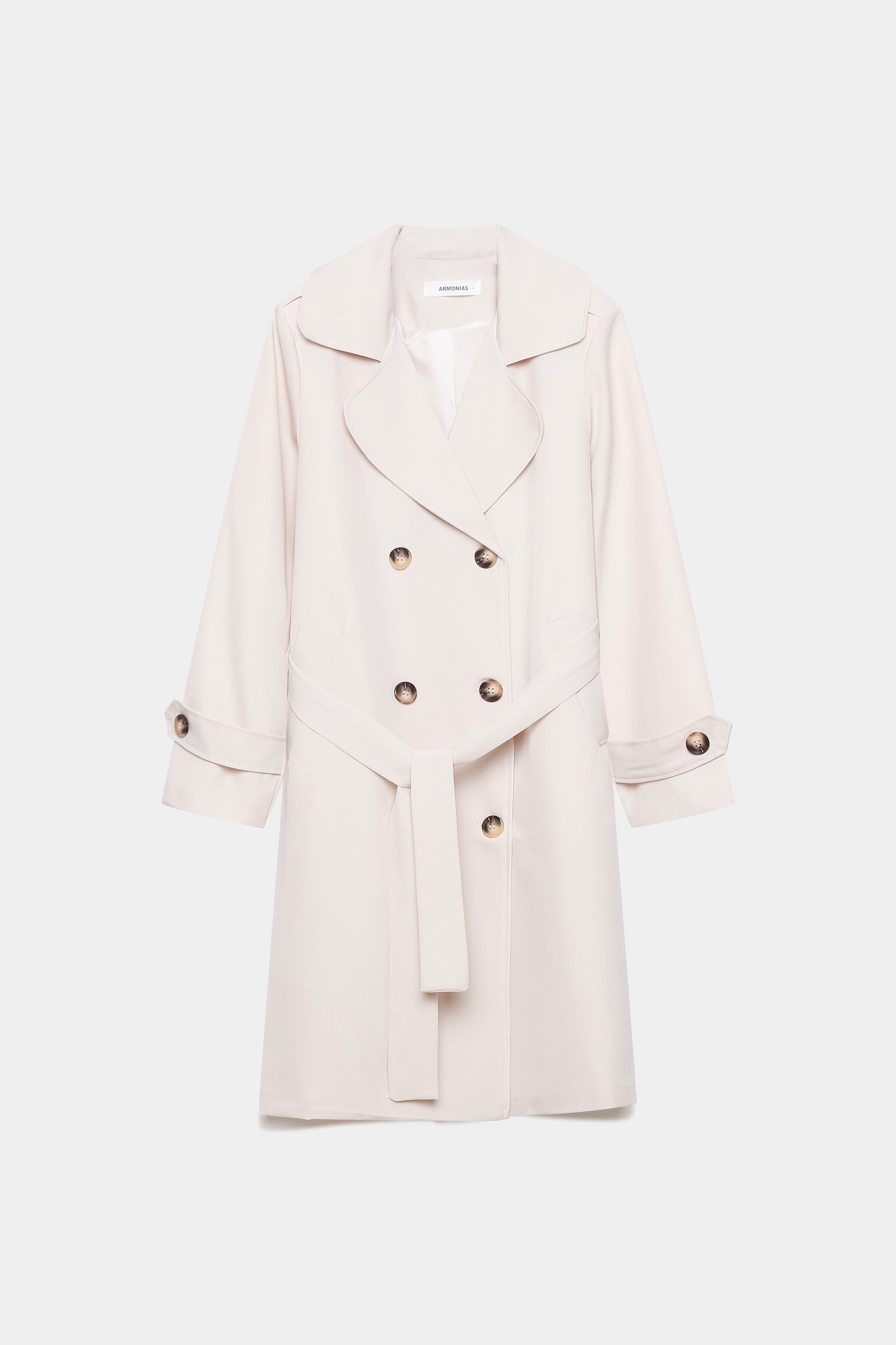 Trench de cuello solapa y manga larga. Bolsillos delanteros. Cierre frontal cruzado con botones y cinturón del mismo tejido.
