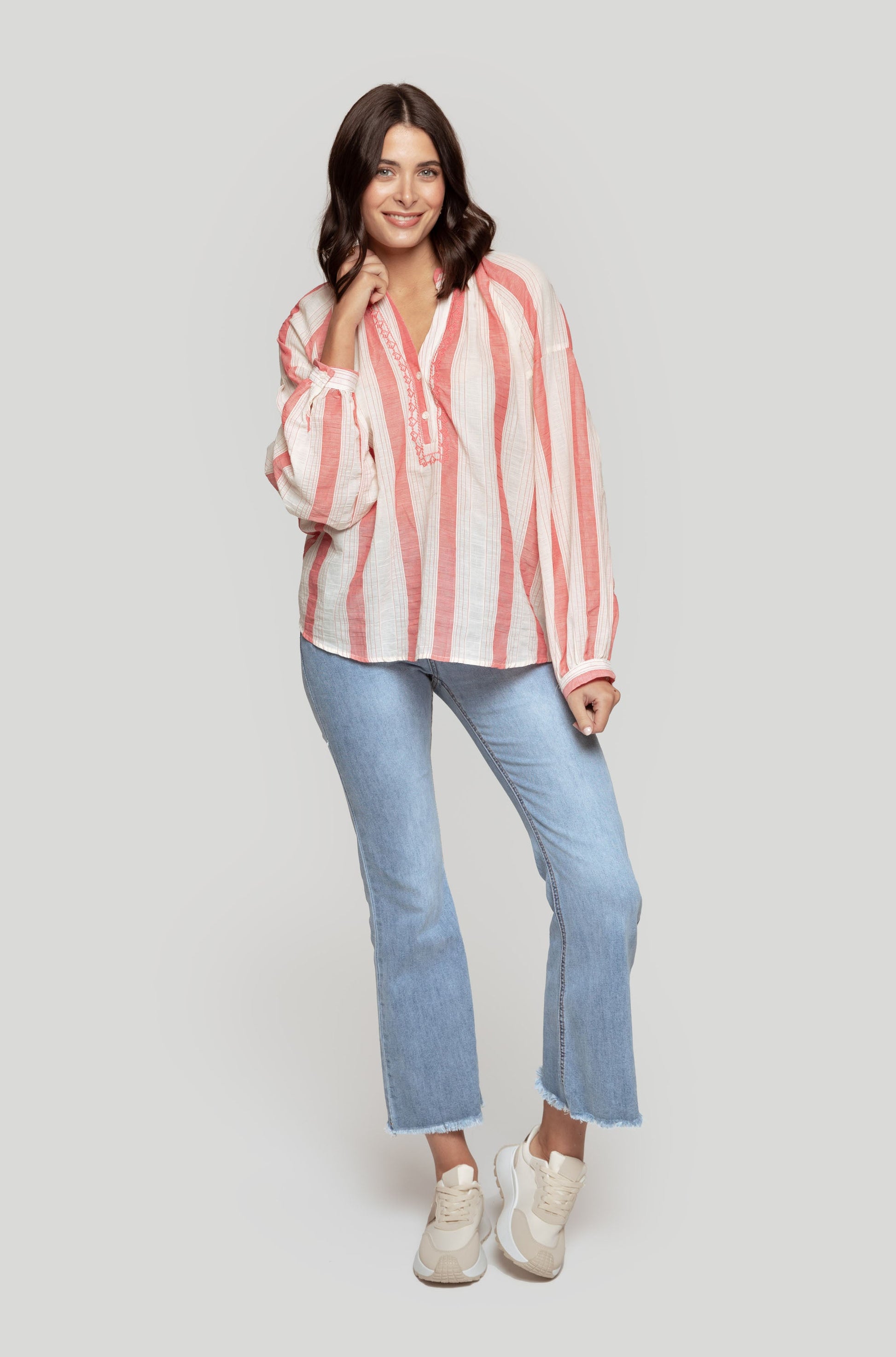 Tejido mezcla de algodón. Diseño holgado. Diseño flare. Diseño recto. Talle alto. Cinco bolsillos. Cierre de cremallera y botón. Trabillas. Bajo sin rematar. Talla modelo: 36. Altura modelo 1,75 m.